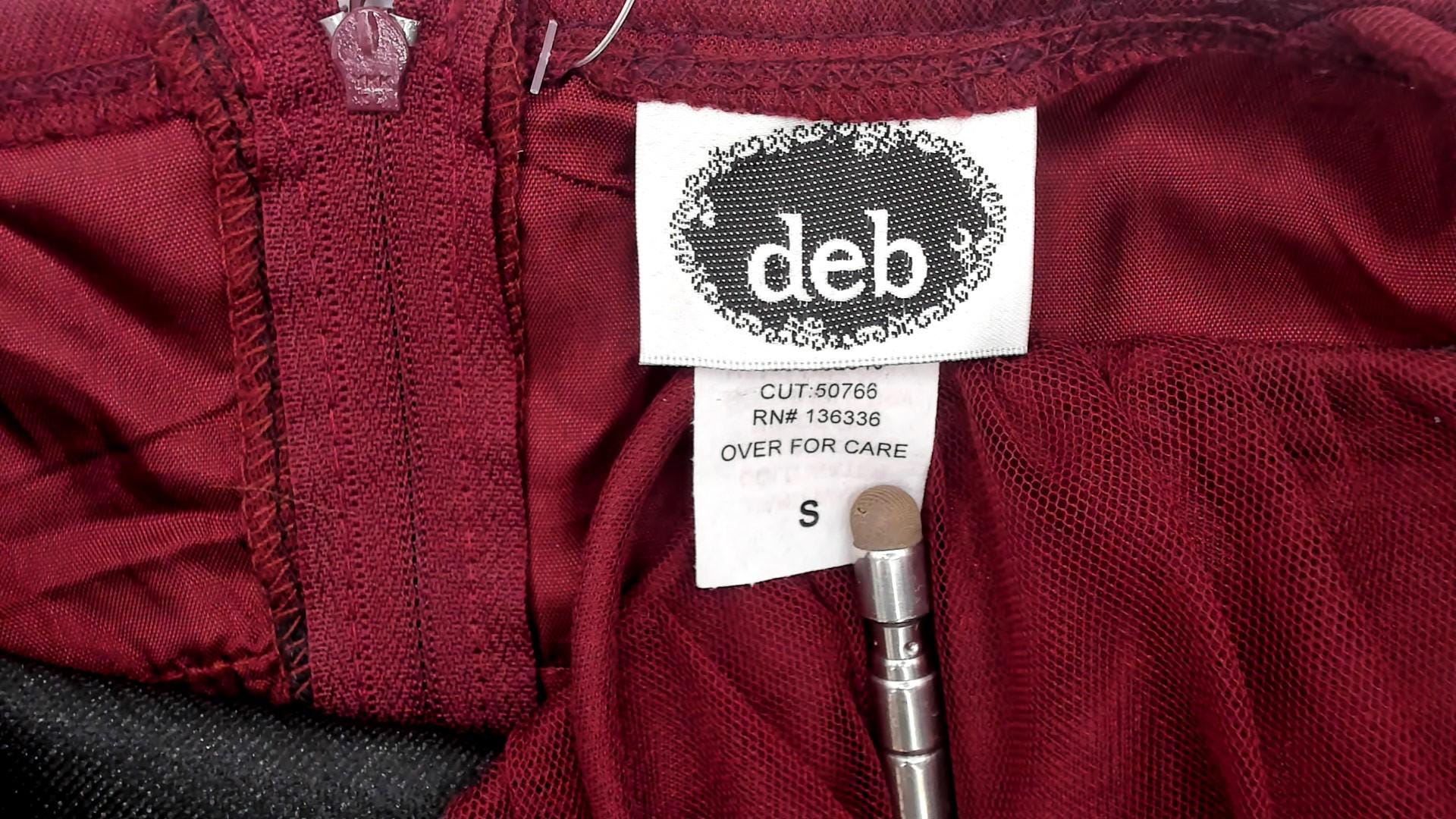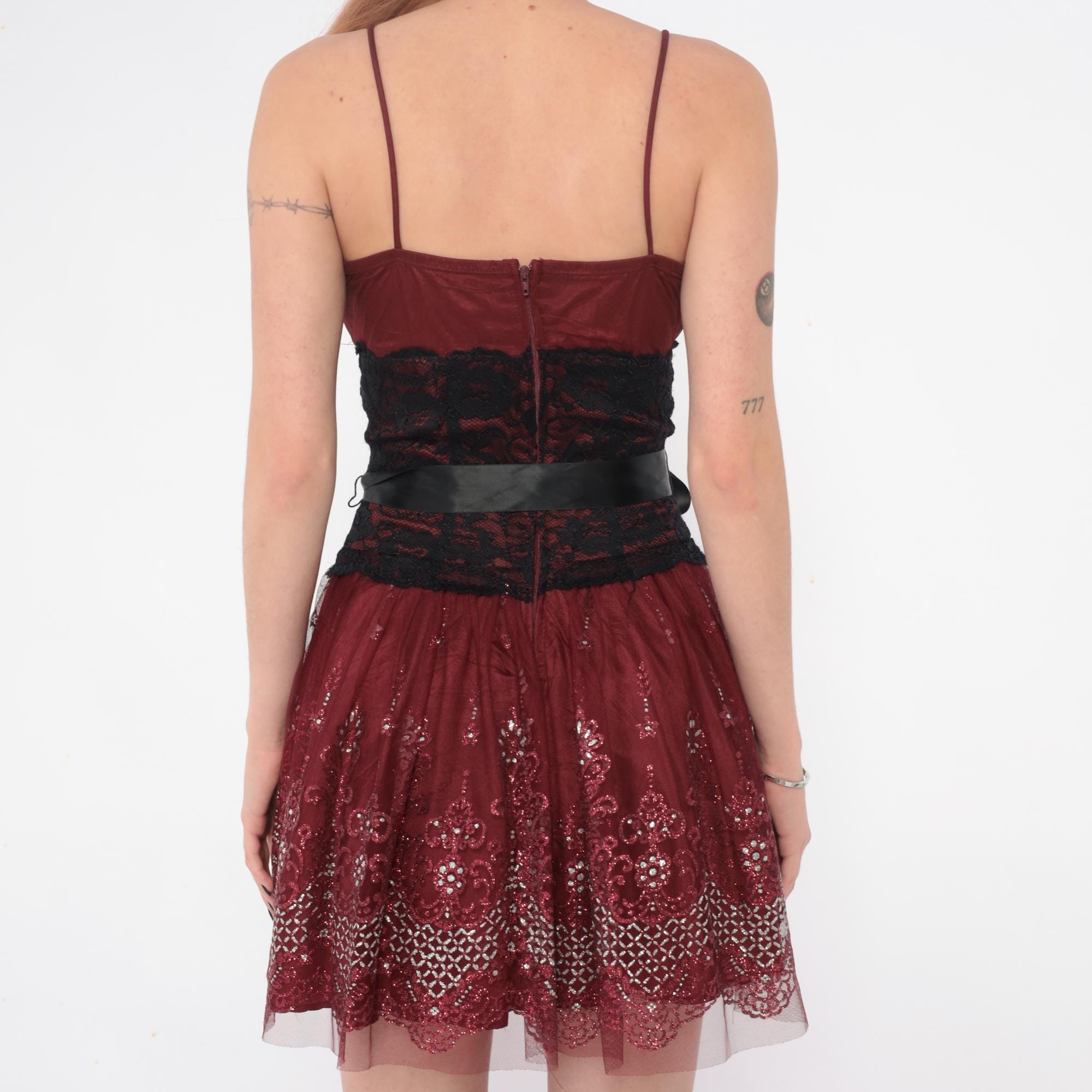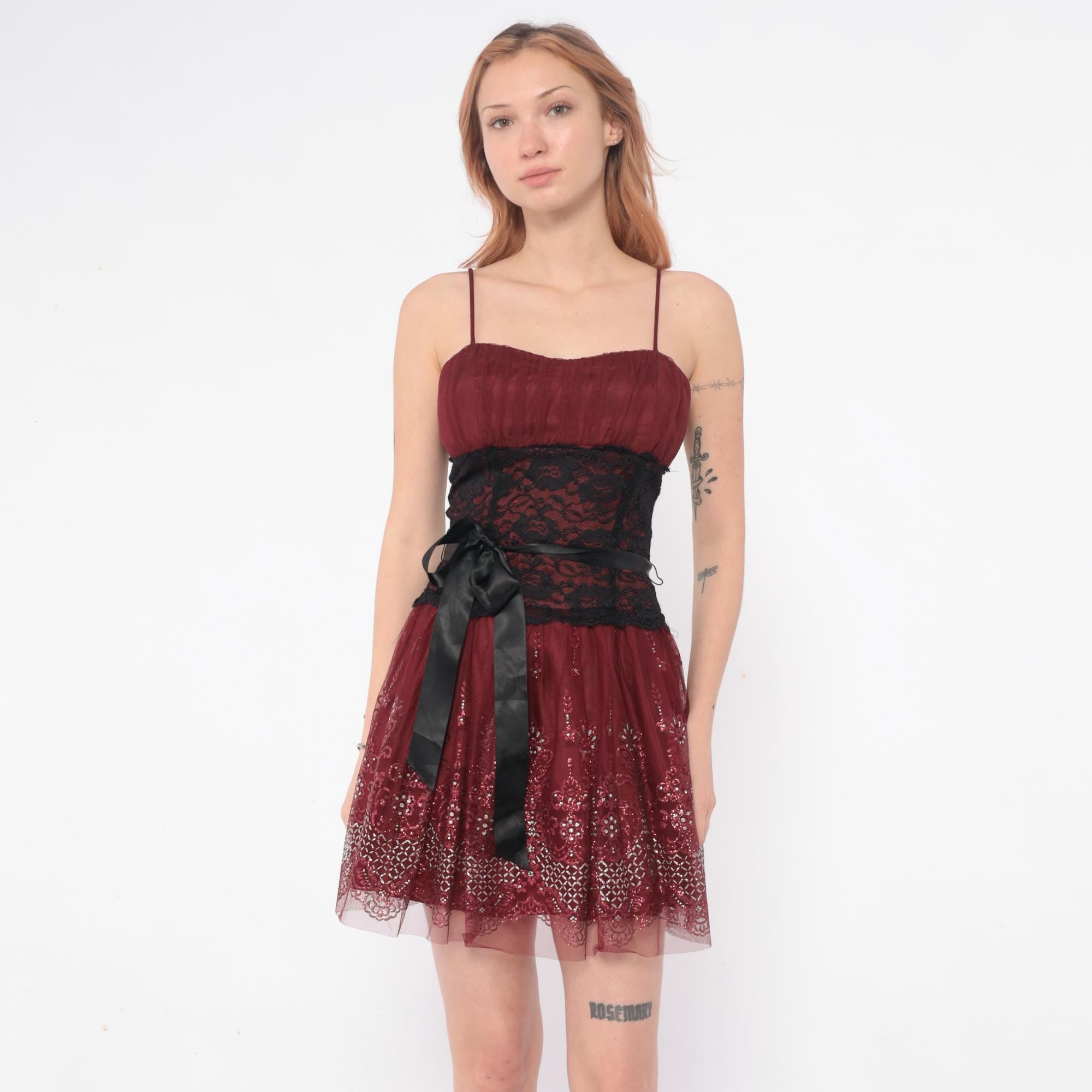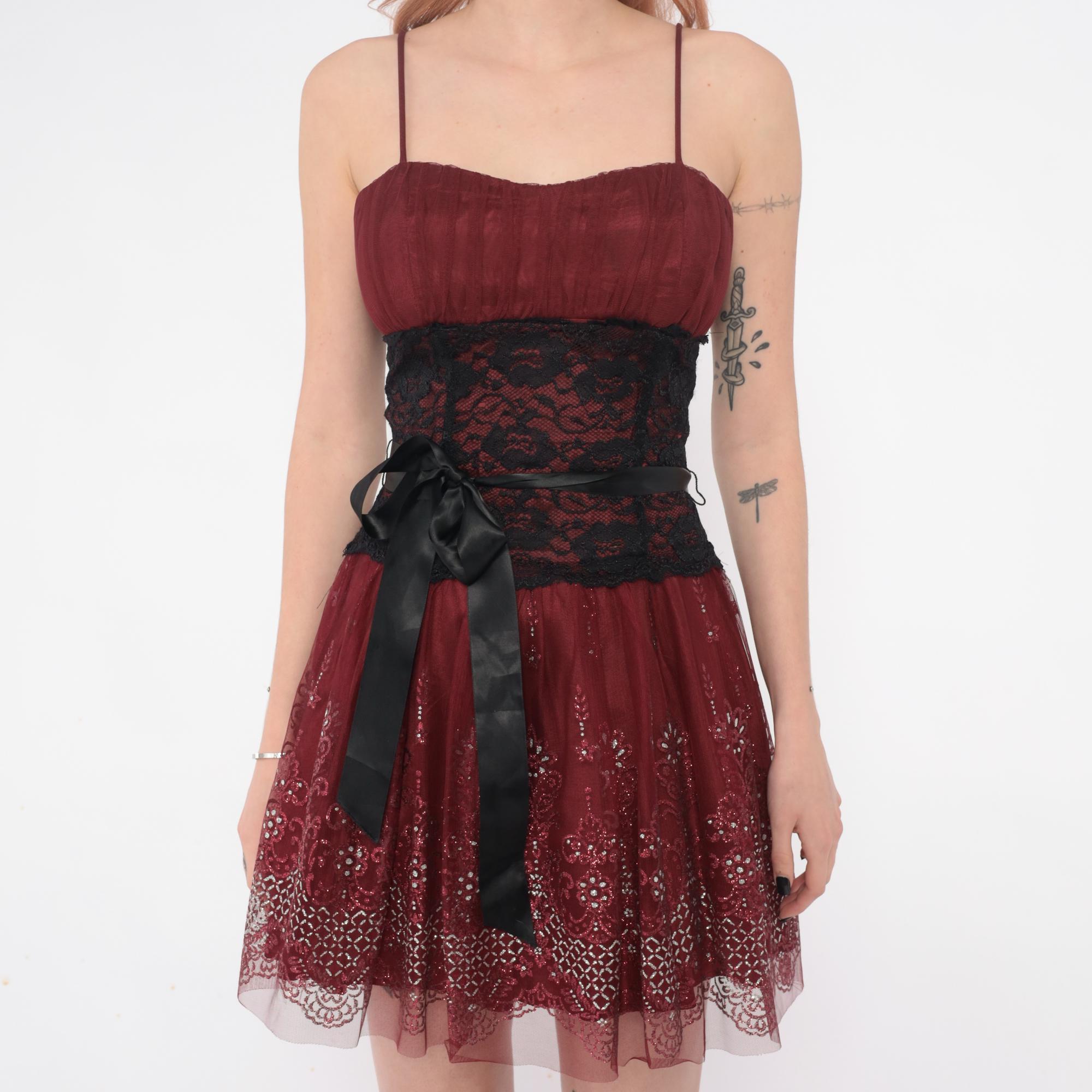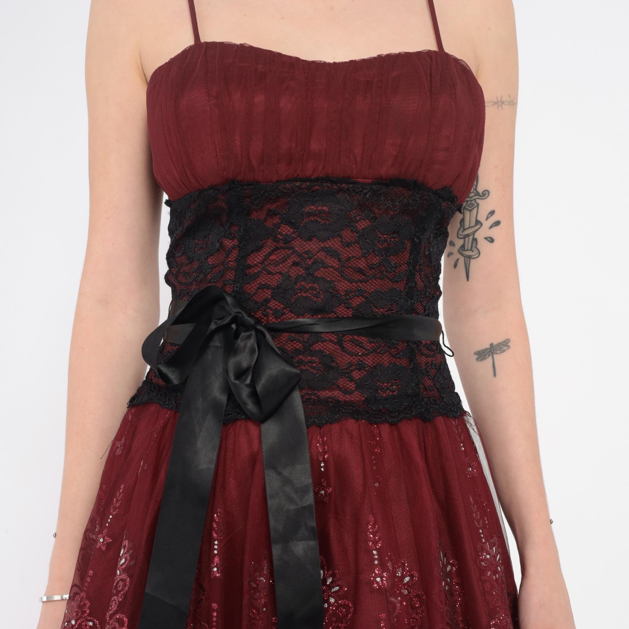 Y2K burgundy mini dress with spaghetti straps and fitted bodice. Black lace overlay at waist with black satin ribbon belt that ties at side. Wine-colored skirt with silver rhinestone and glitter embellishment in scrollwork pattern, scalloped hem with embellished border, tulle underlayer.