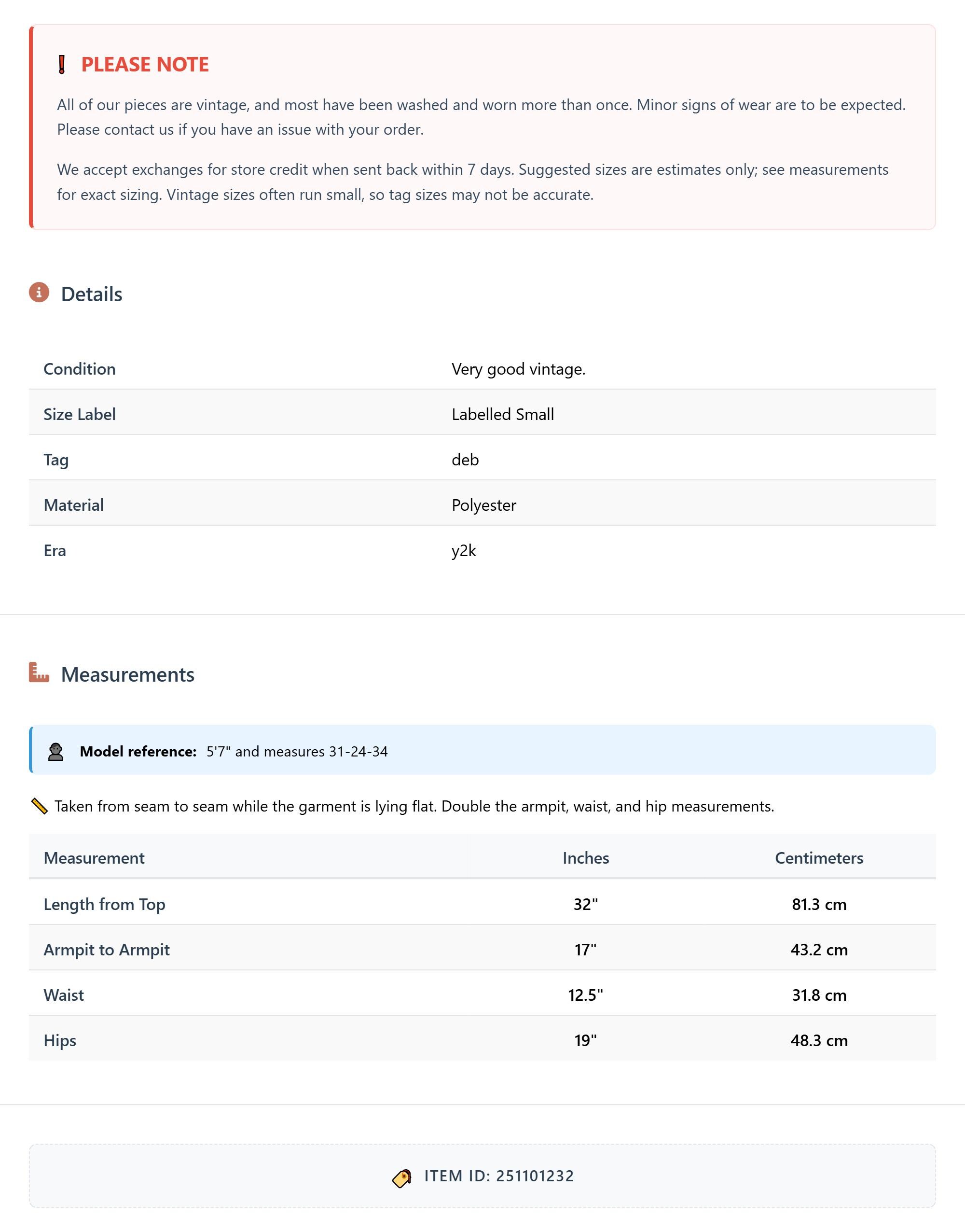 All of our pieces are vintage, and most have been washed and worn more than once. Minor signs of wear are to be expected. Please contact us if you have an issue with your order. We accept exchanges for store credit when sent back within 7 days.