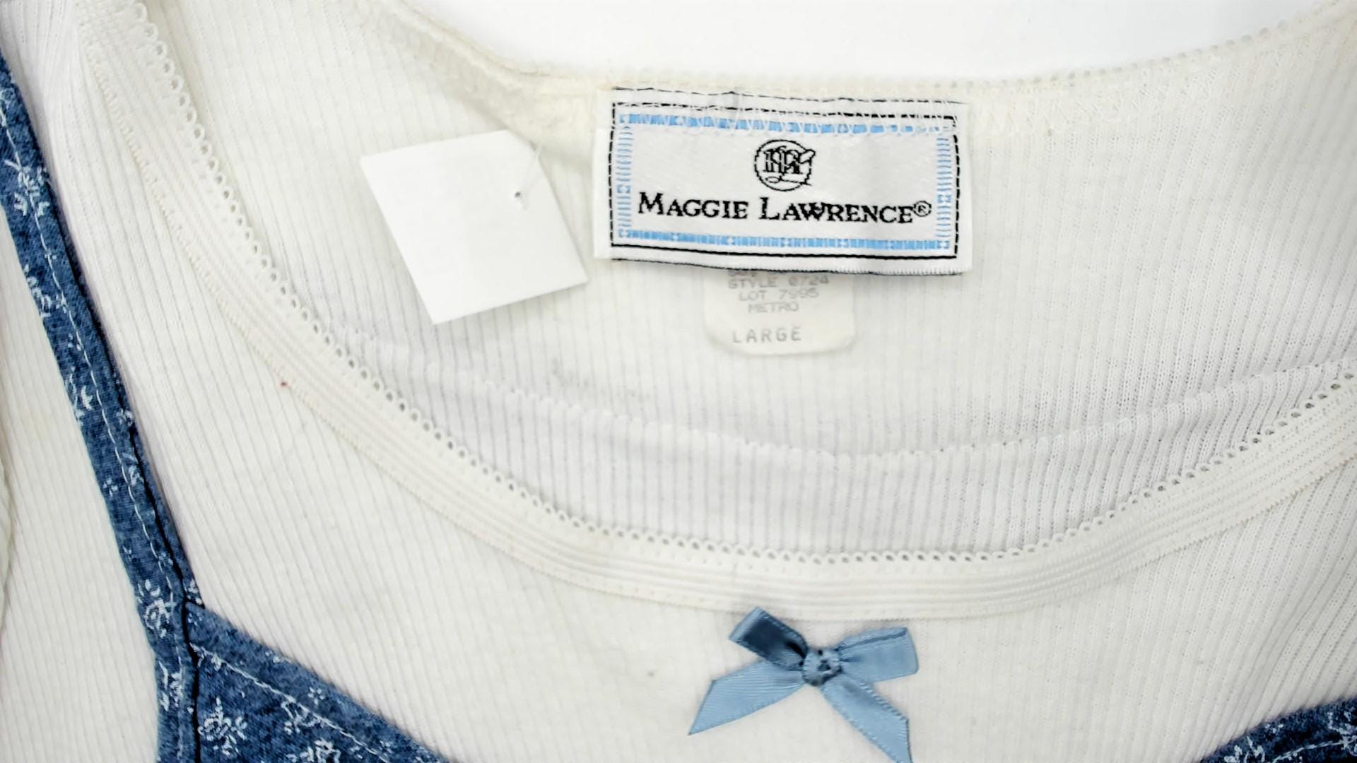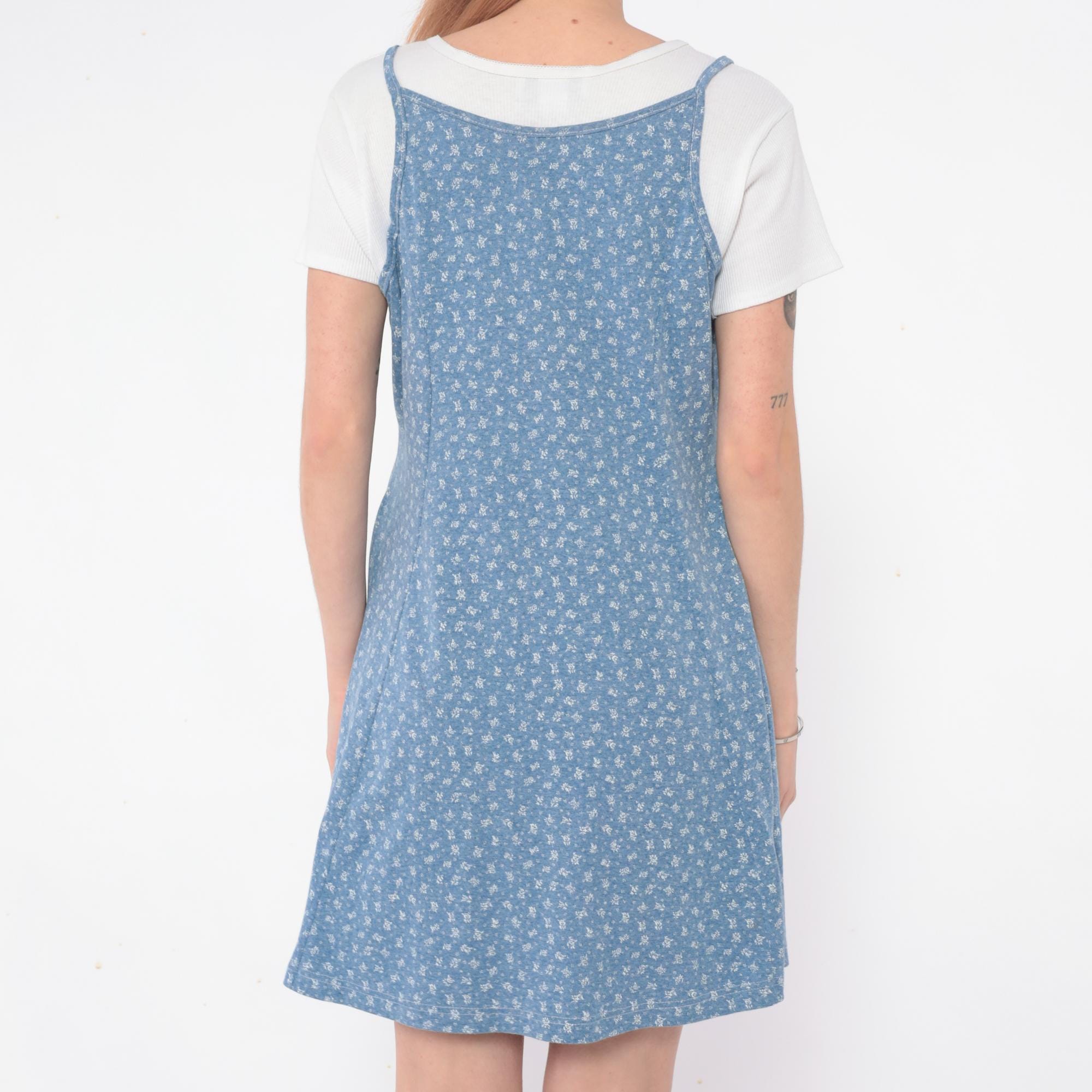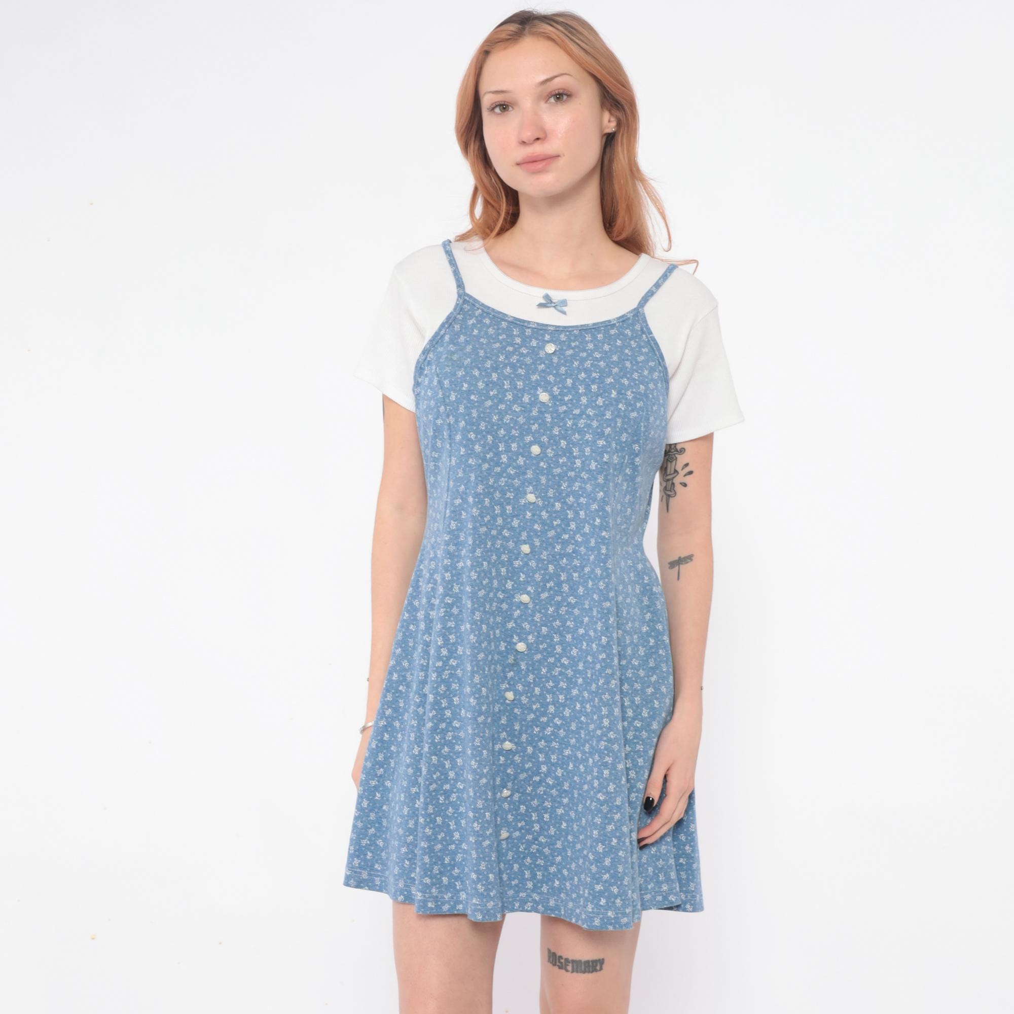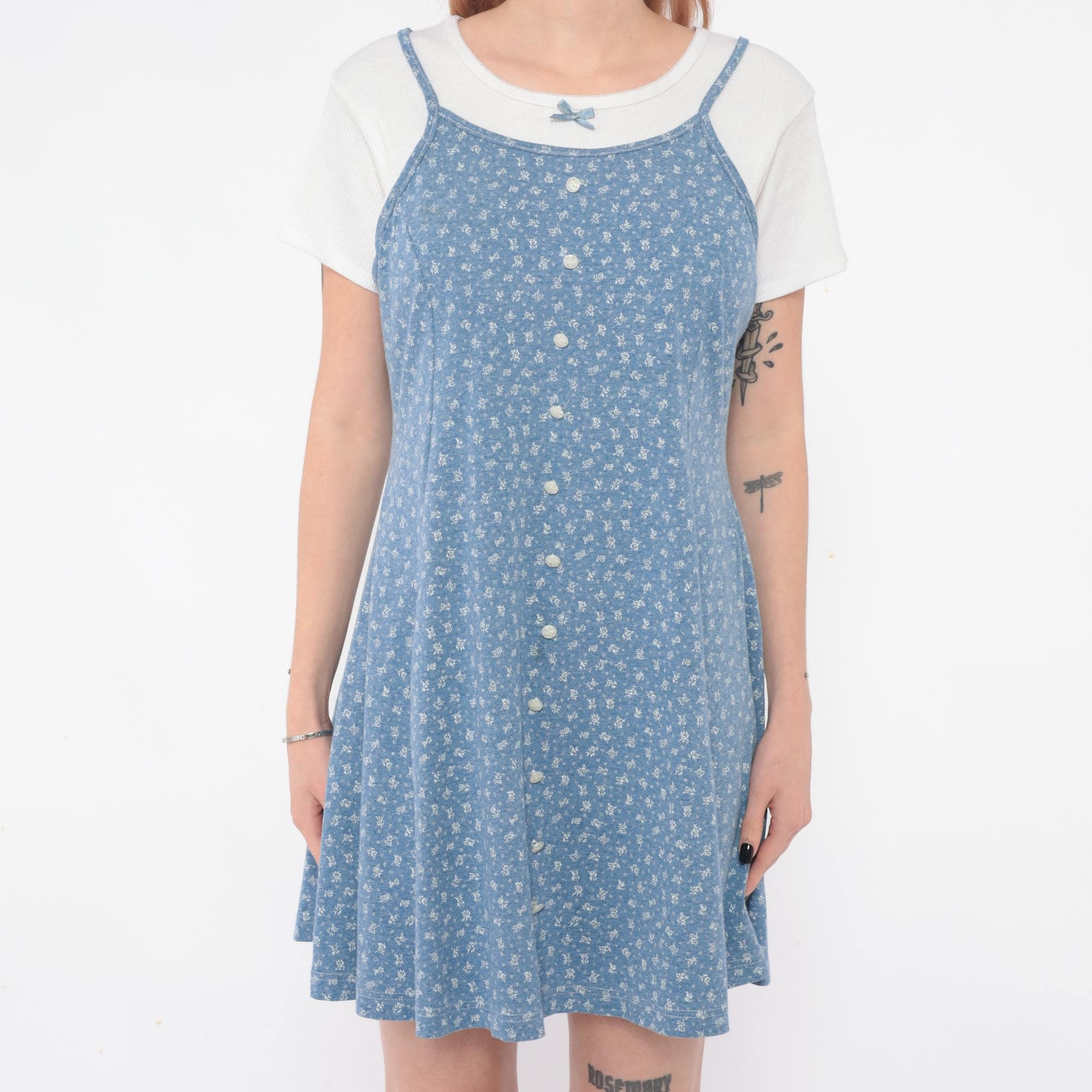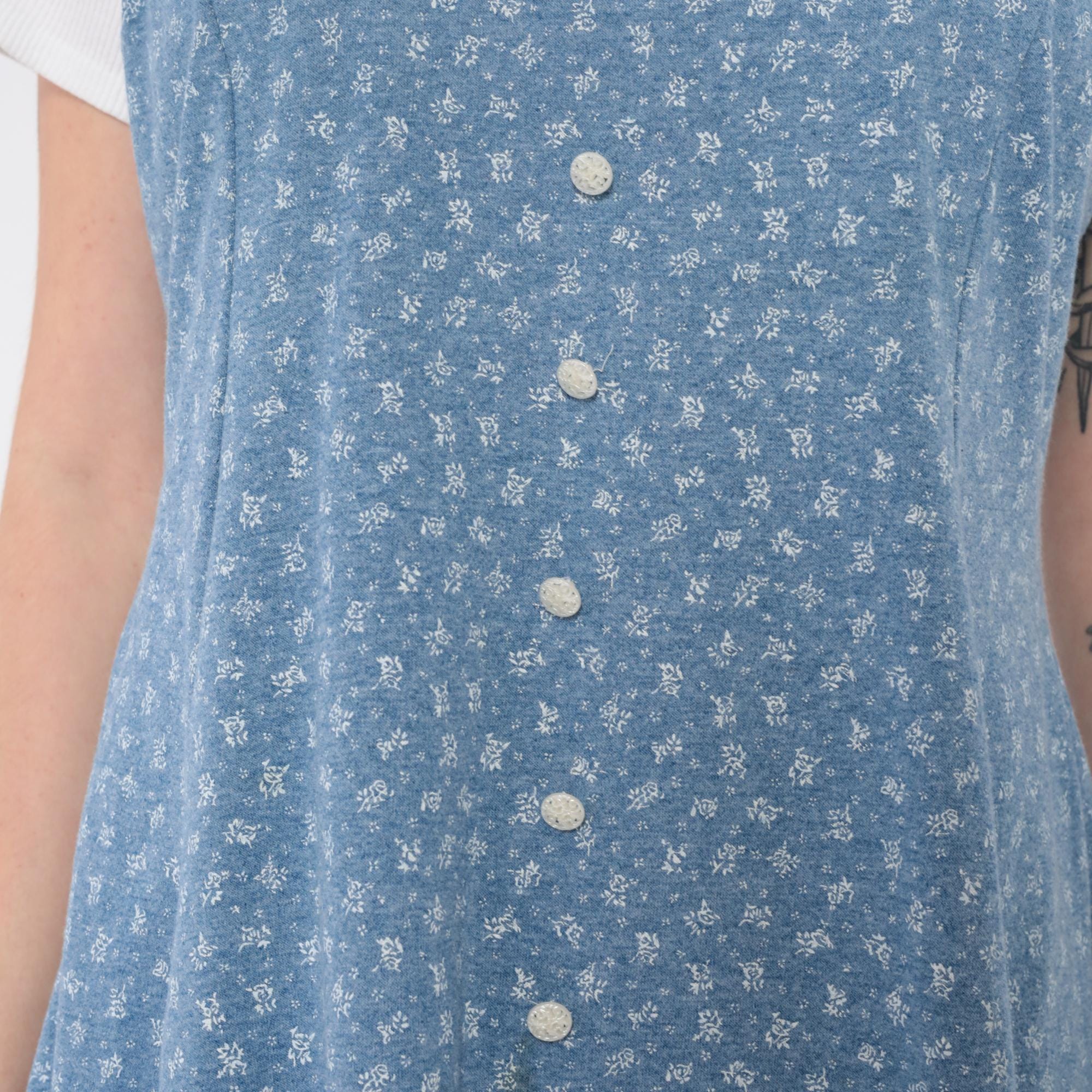 90s blue floral dress from maggie lawrence with spaghetti straps and faux button front . Small white and cream flowers across the fabric, small bow detail at neckline between straps.