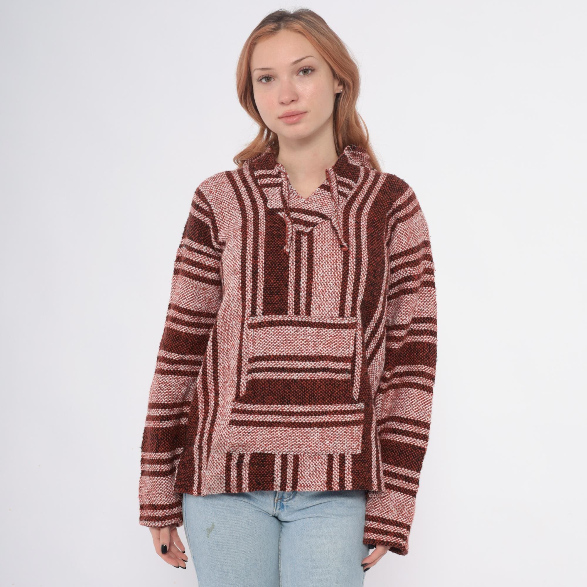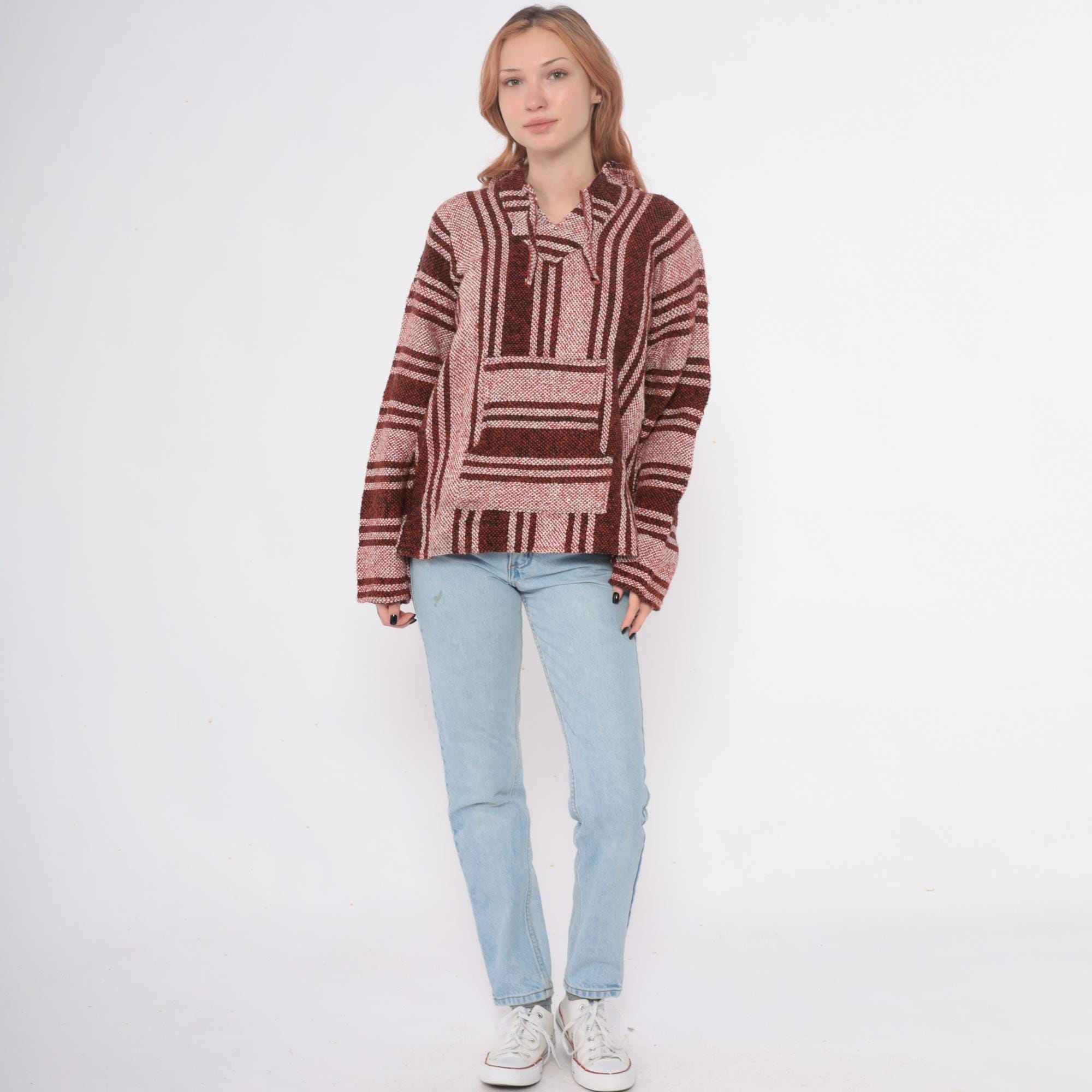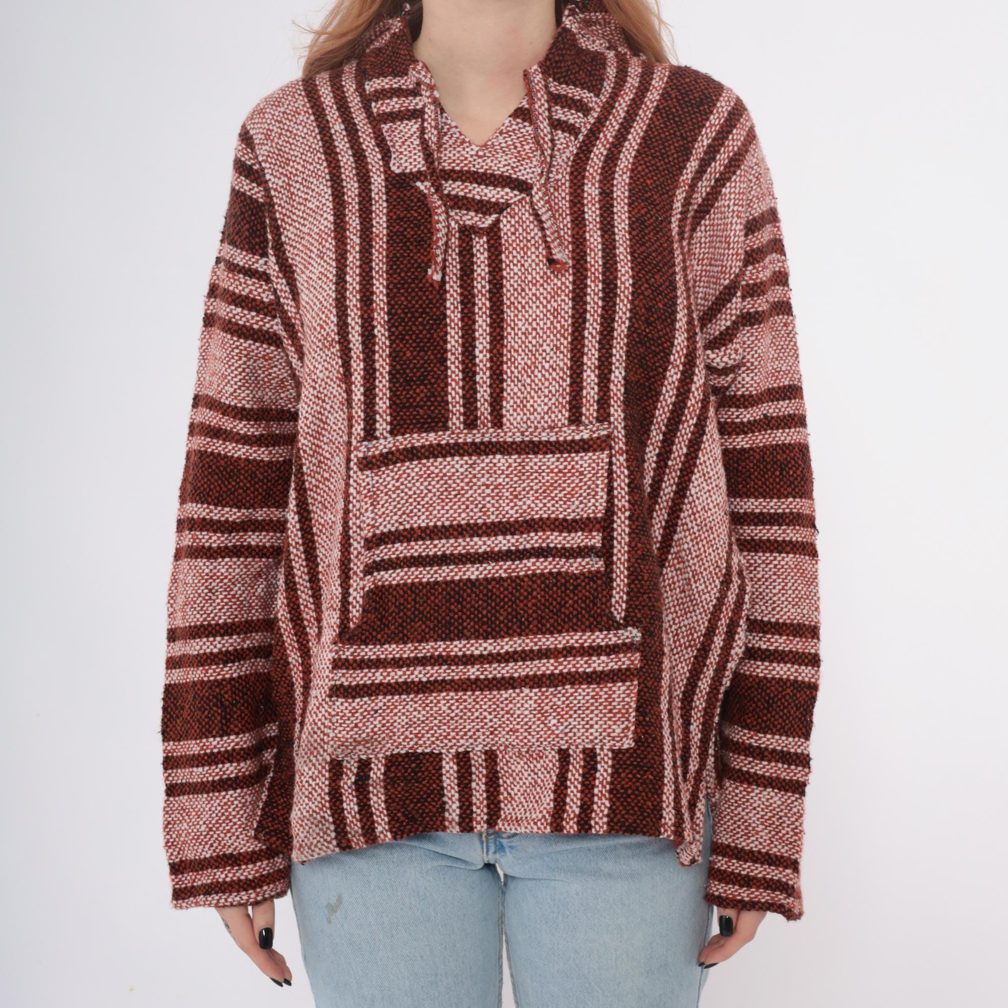 Y2K brown and tan striped baja hoodie in woven acrylic. Horizontal stripe pattern alternating between brown and beige bands across the body and sleeves. Hooded pullover style with drawstring closure, front kangaroo pocket.