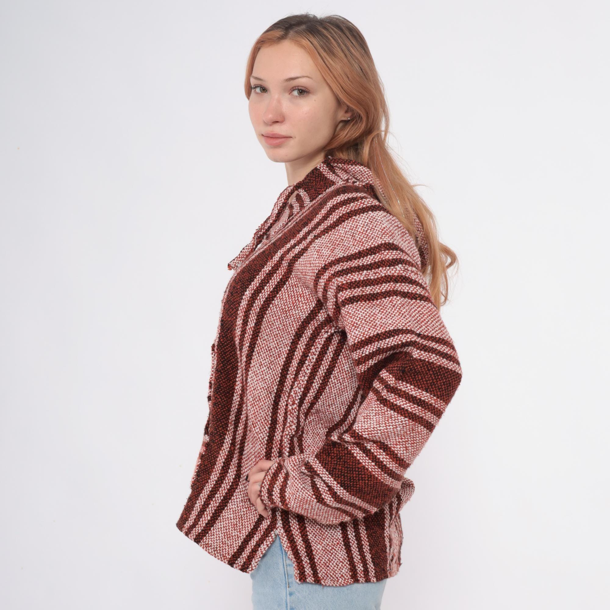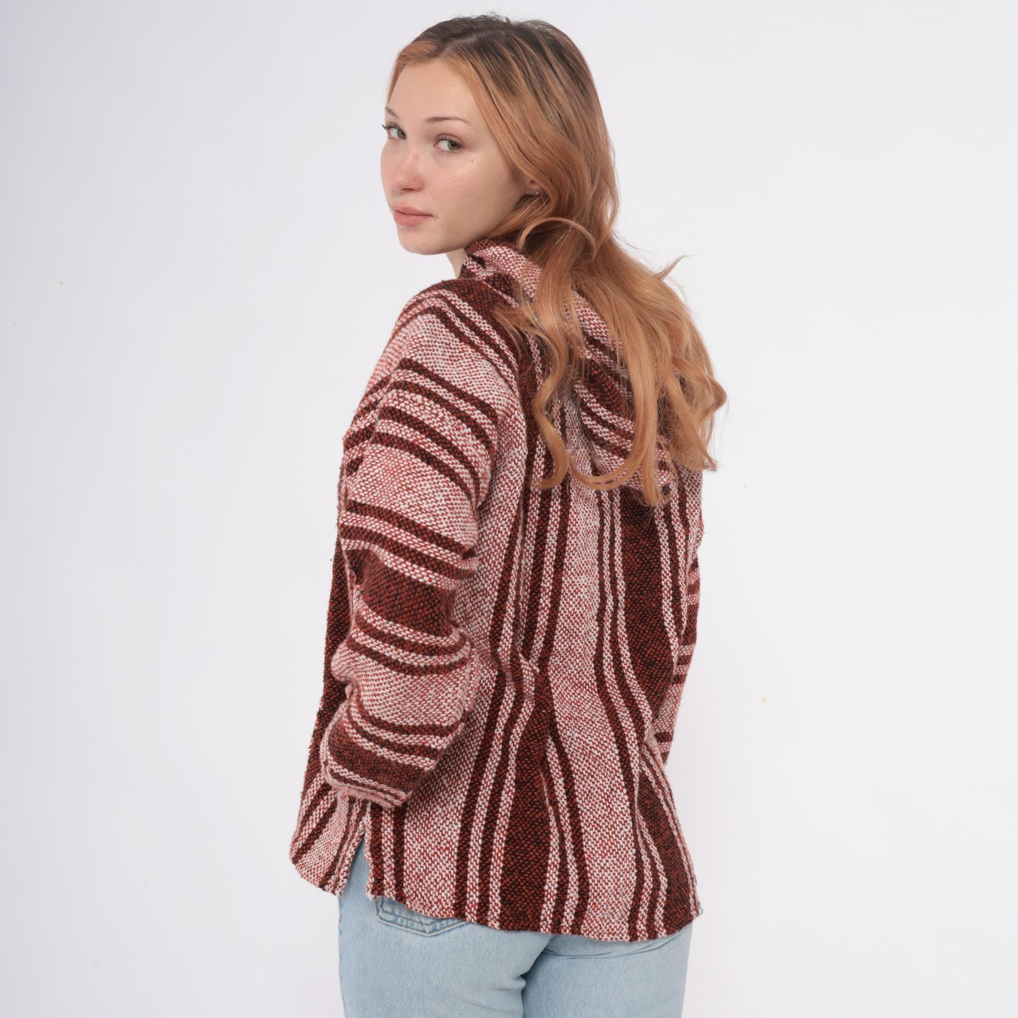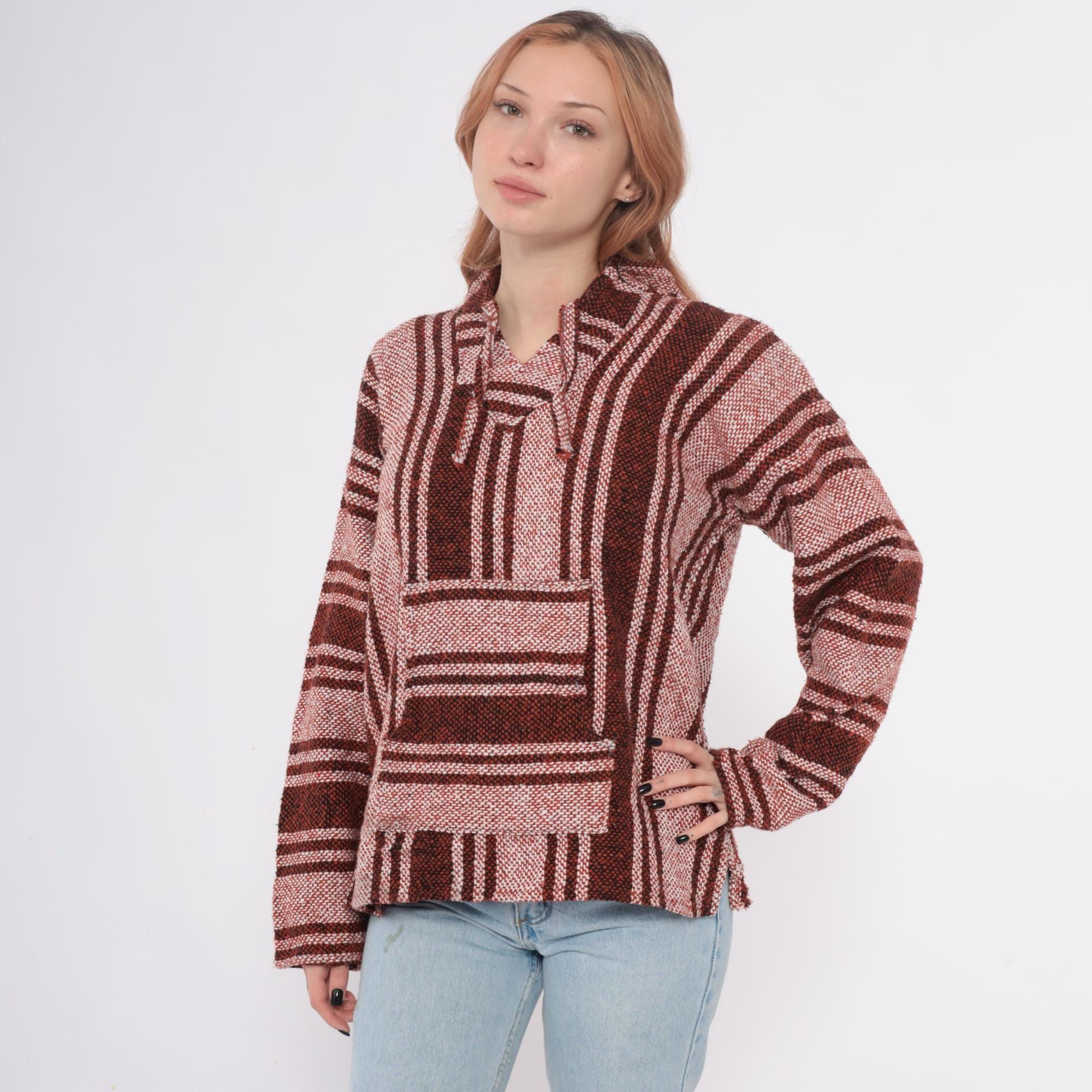 Y2K brown and tan striped baja hoodie in woven acrylic. Horizontal stripe pattern alternating between brown and beige bands across the body and sleeves. Hooded pullover style with drawstring closure, front kangaroo pocket.