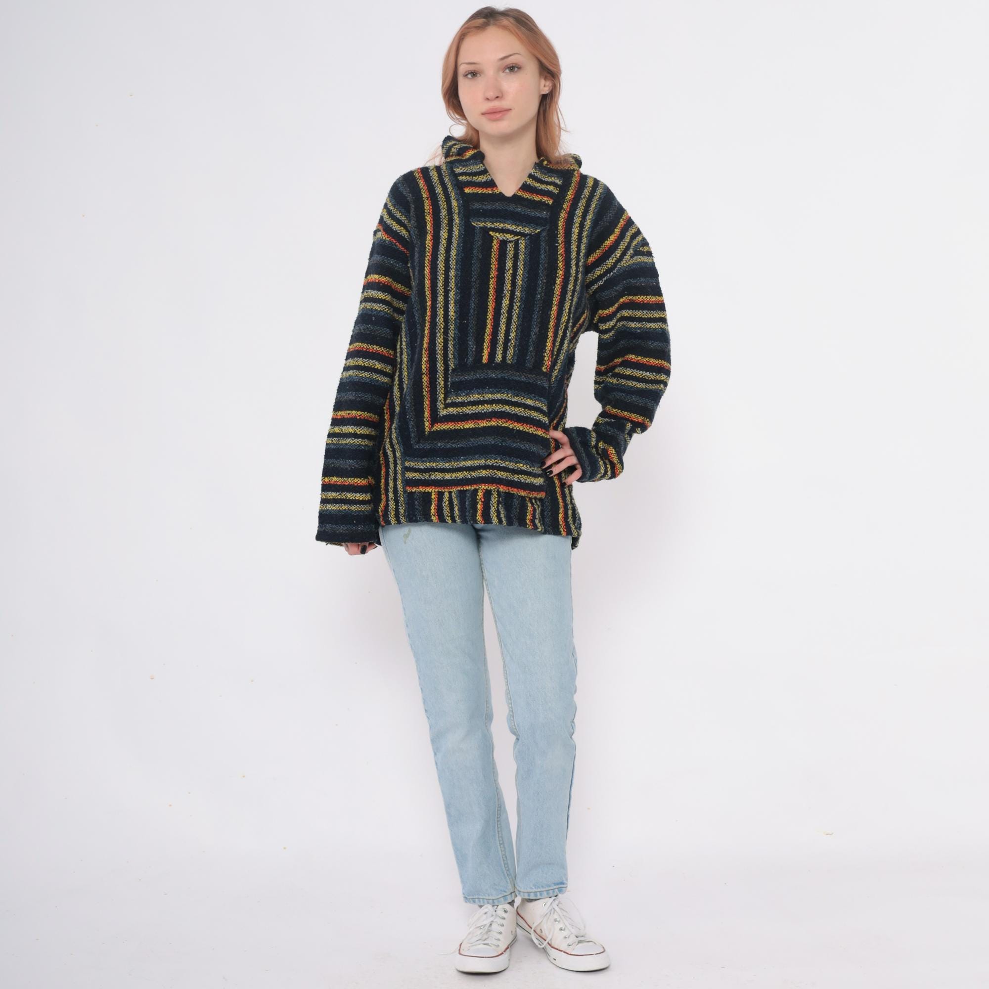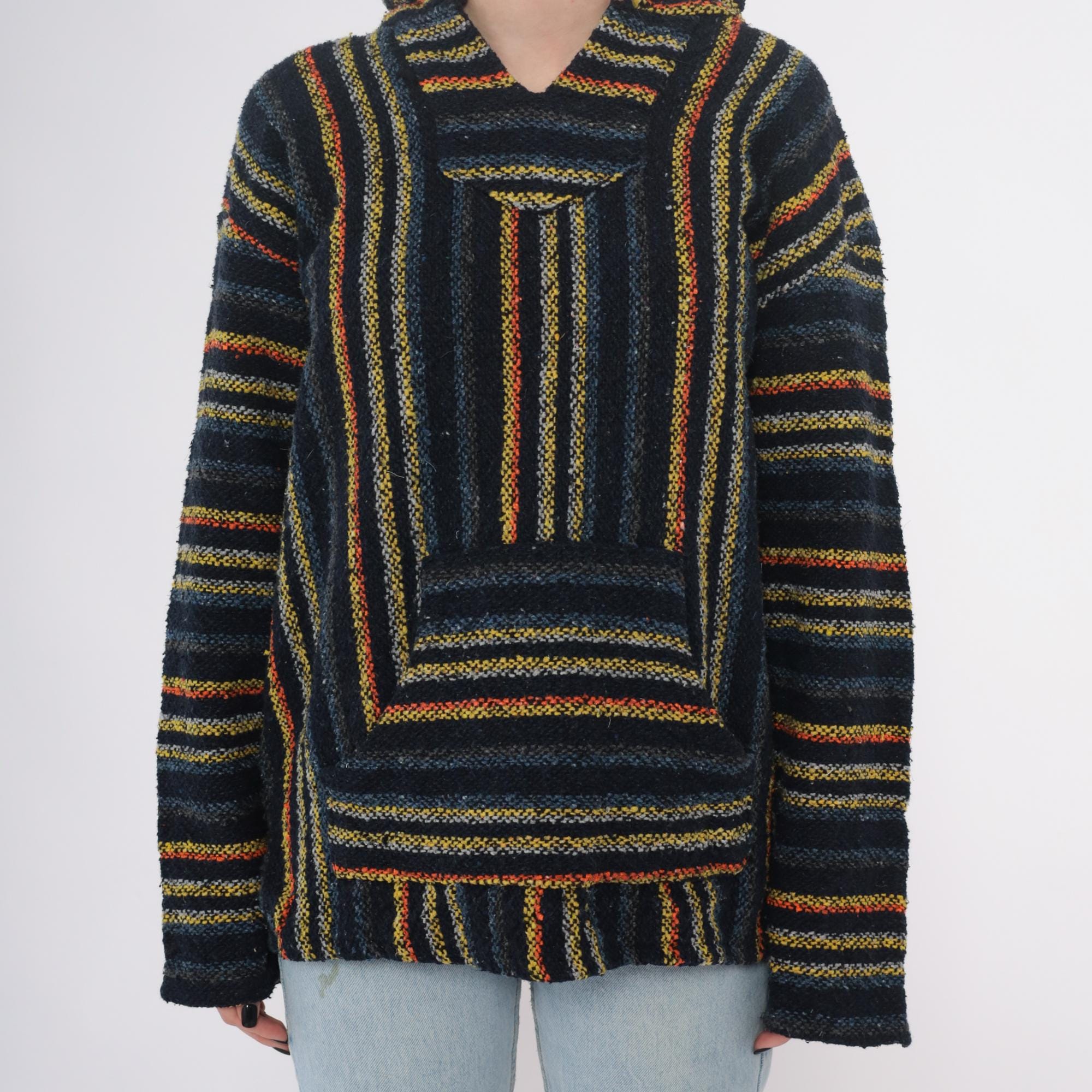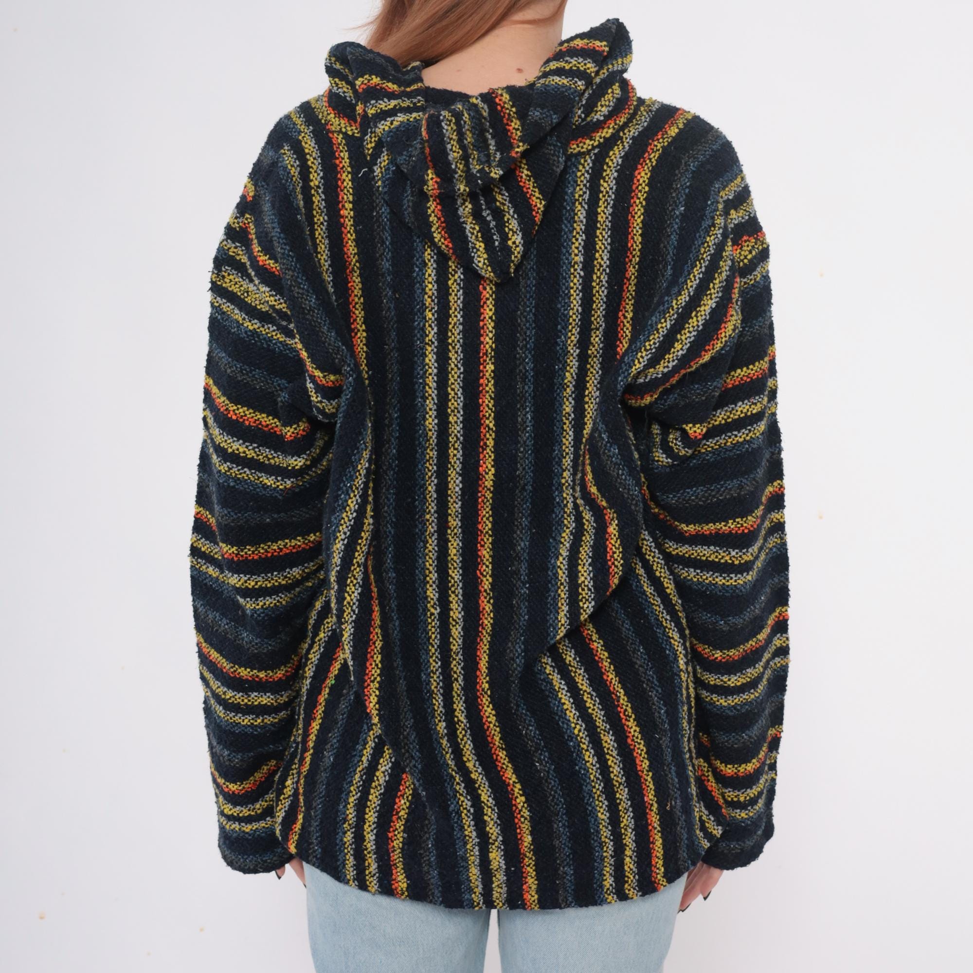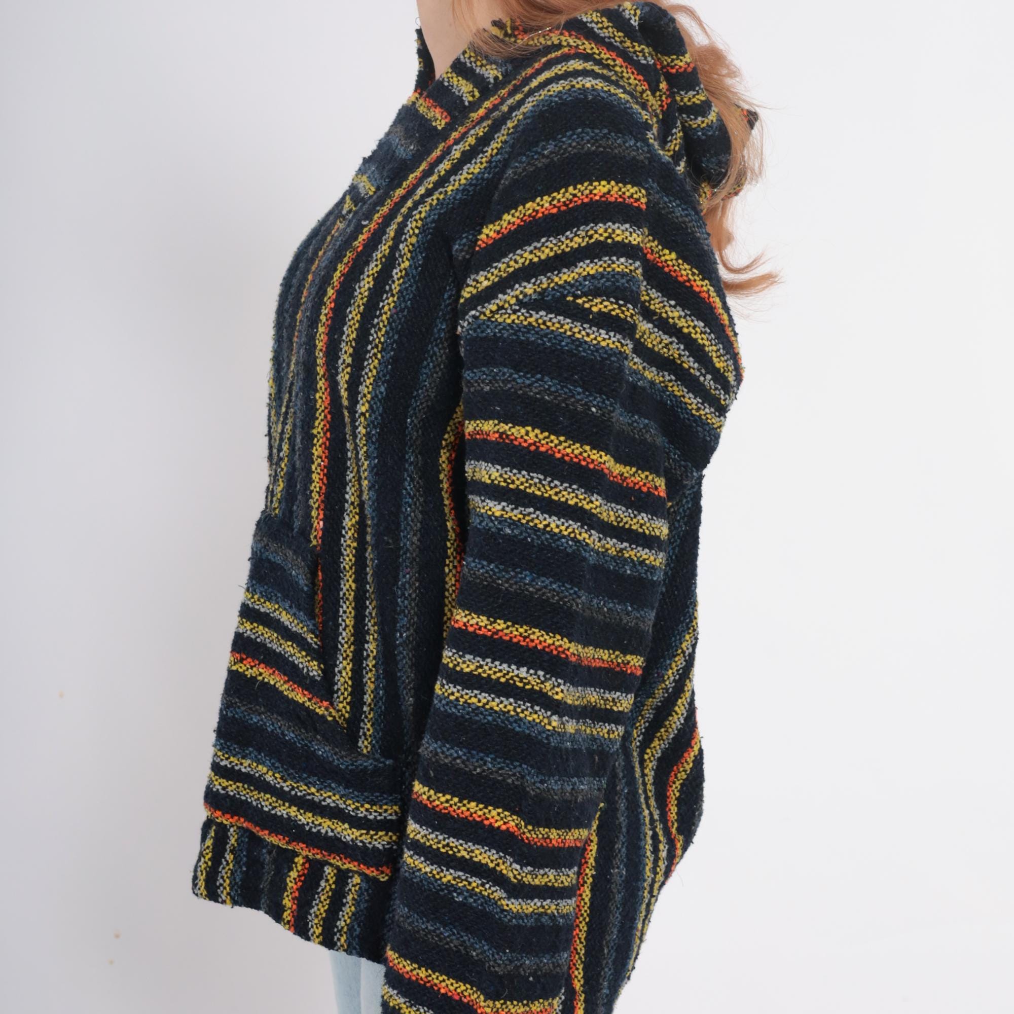 90s black striped hooded pullover from iguana jack with horizontal stripes in yellow, orange, red, and gray throughout. Hooded neckline with front kangaroo pocket and long sleeves in woven basket weave construction.