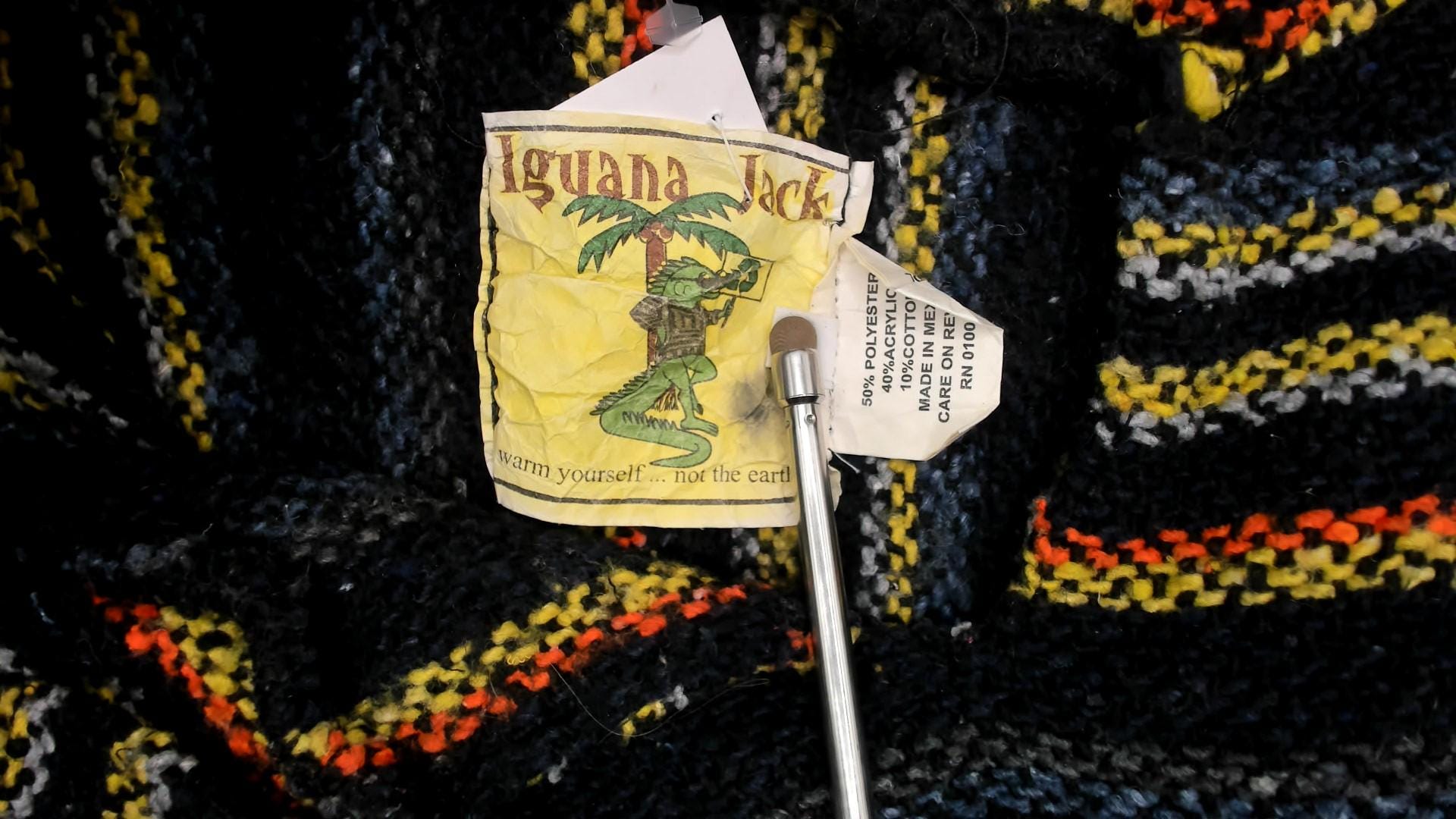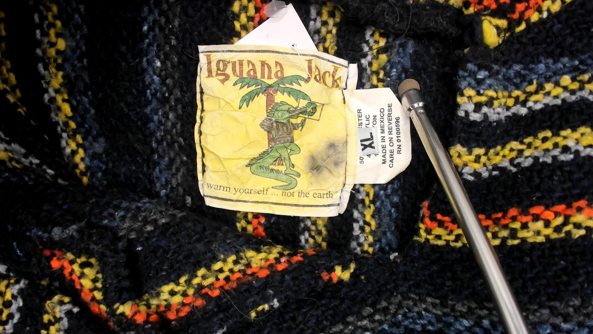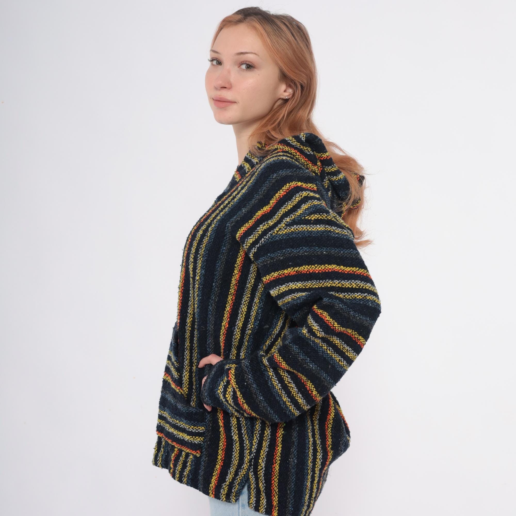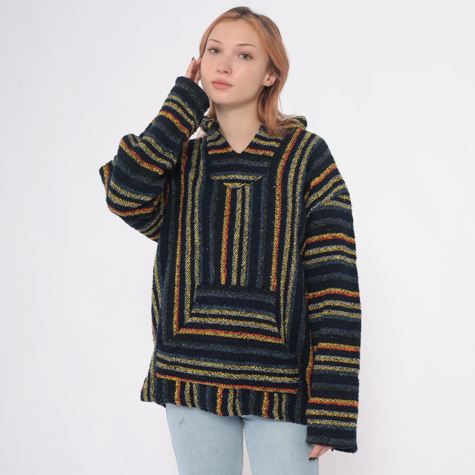90s black striped hooded pullover from iguana jack with horizontal stripes in yellow, orange, red, and gray throughout. Hooded neckline with front kangaroo pocket and long sleeves in woven basket weave construction.