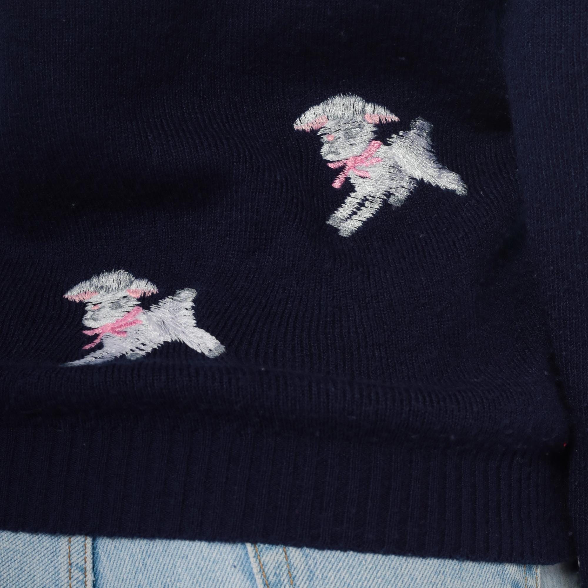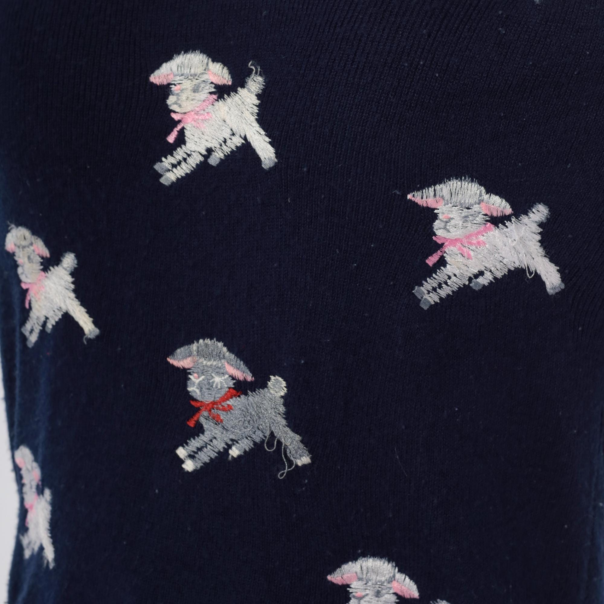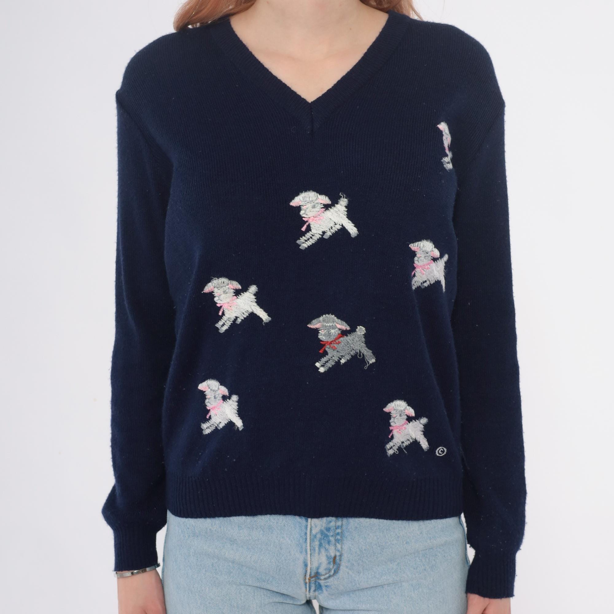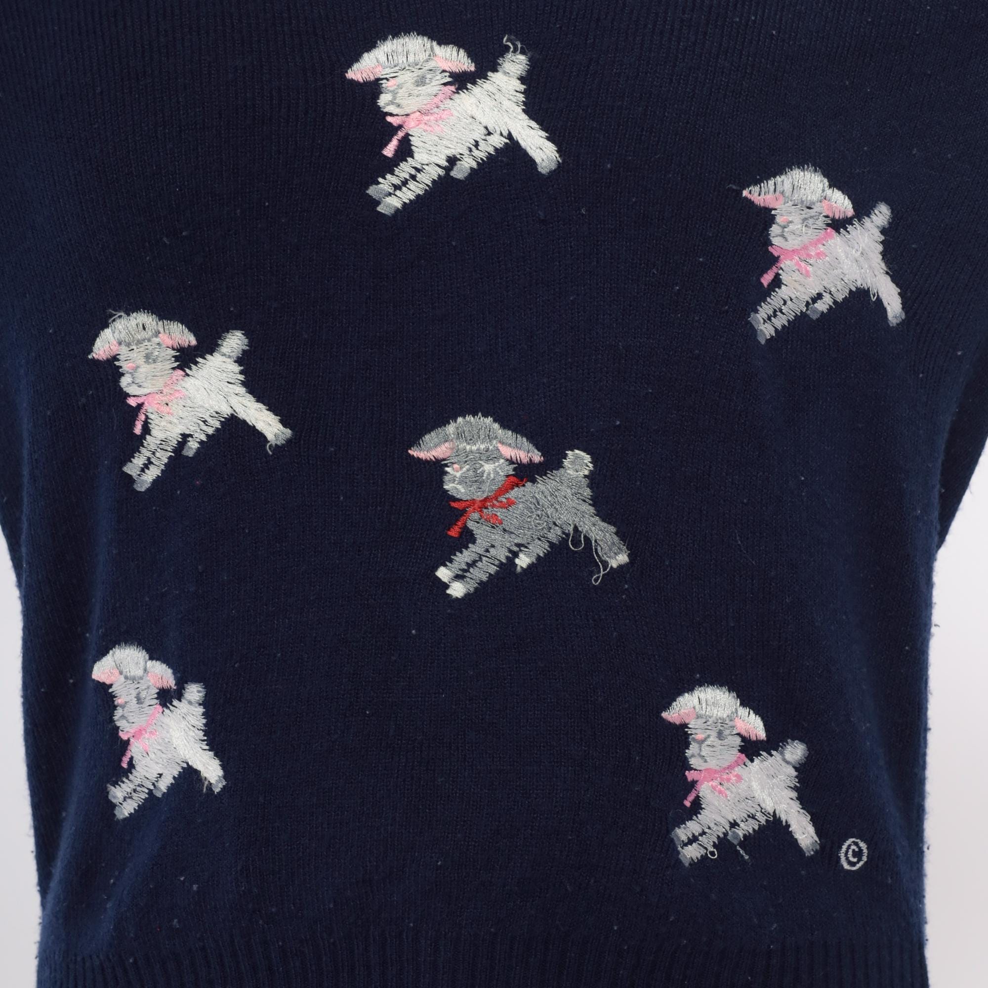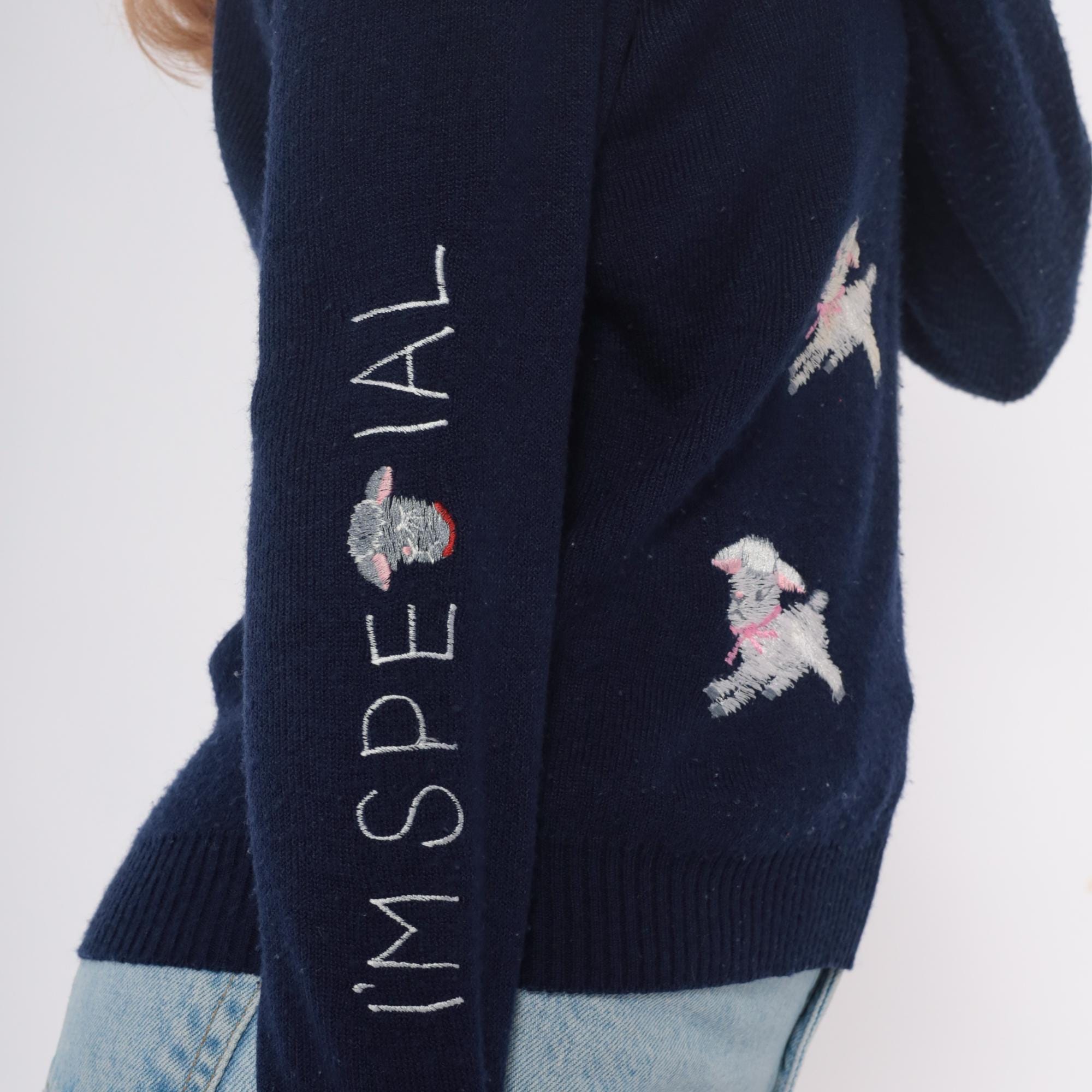 Navy blue 70s v-neck sweater from shirlee designs with embroidered white lamb designs across the front and back, each lamb wearing pink or red bows and collars. "I'M SPECIAL" embroidered vertically down the left sleeve in white lettering.