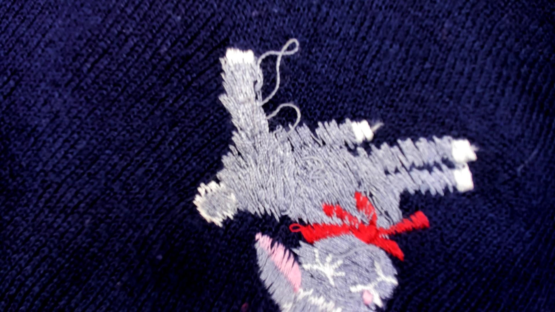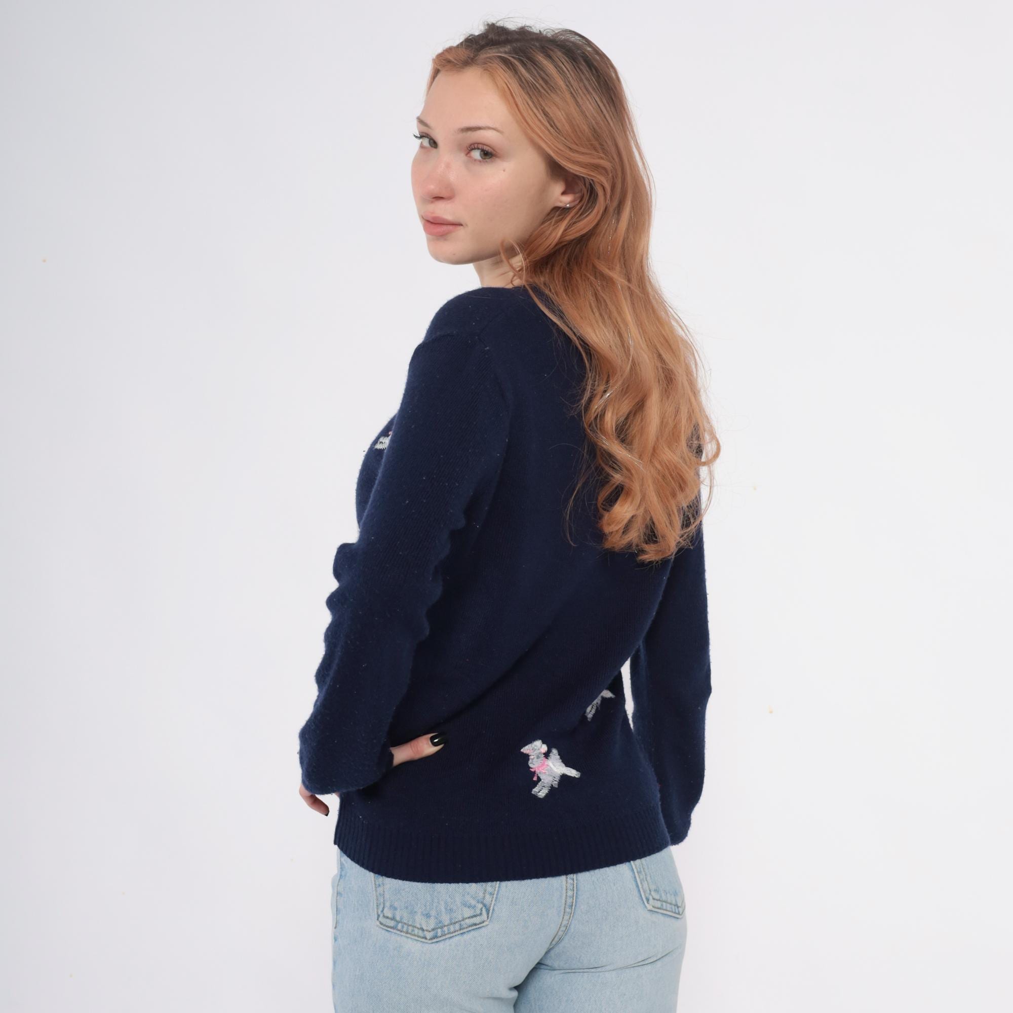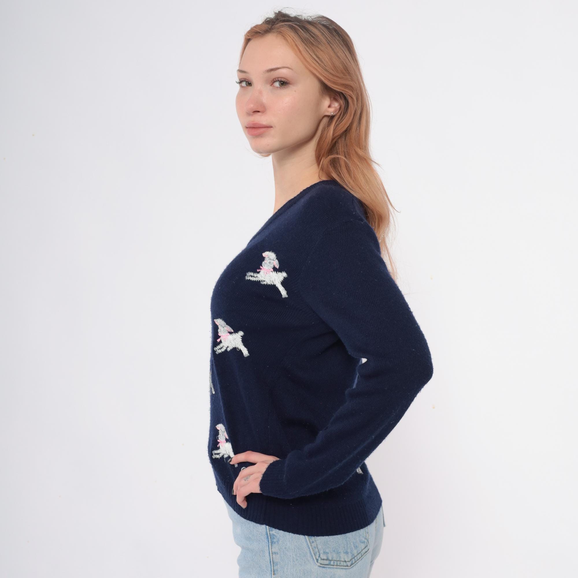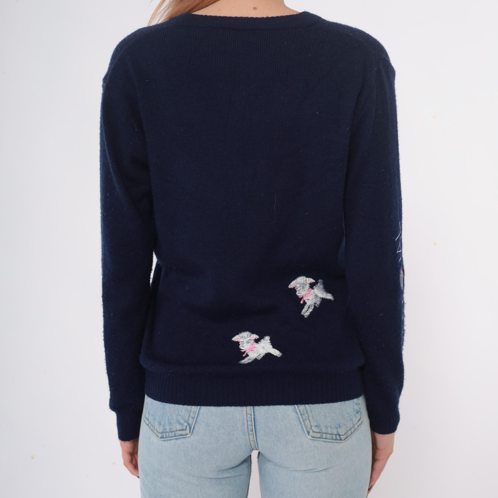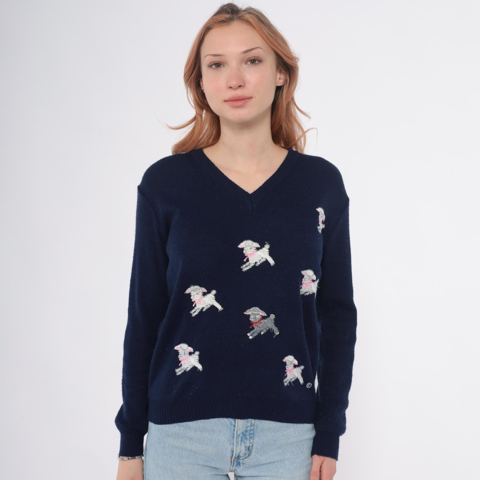 Navy blue 70s v-neck sweater from shirlee designs with embroidered white lamb designs across the front and back, each lamb wearing pink or red bows and collars. "I'M SPECIAL" embroidered vertically down the left sleeve in white lettering.