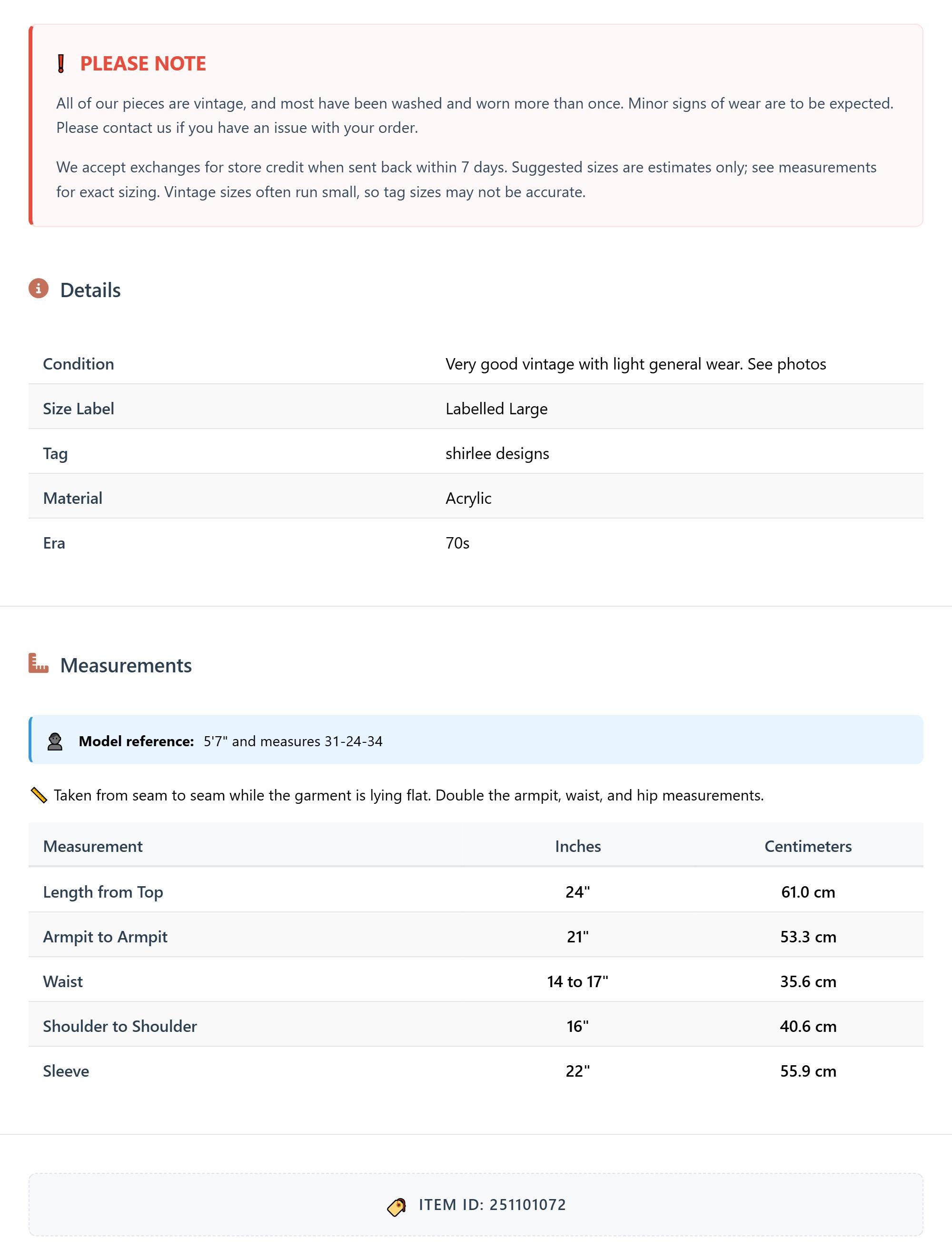 All of our pieces are vintage, and most have been washed and worn more than once. Minor signs of wear are to be expected. Please contact us if you have an issue with your order. We accept exchanges for store credit when sent back within 7 days.