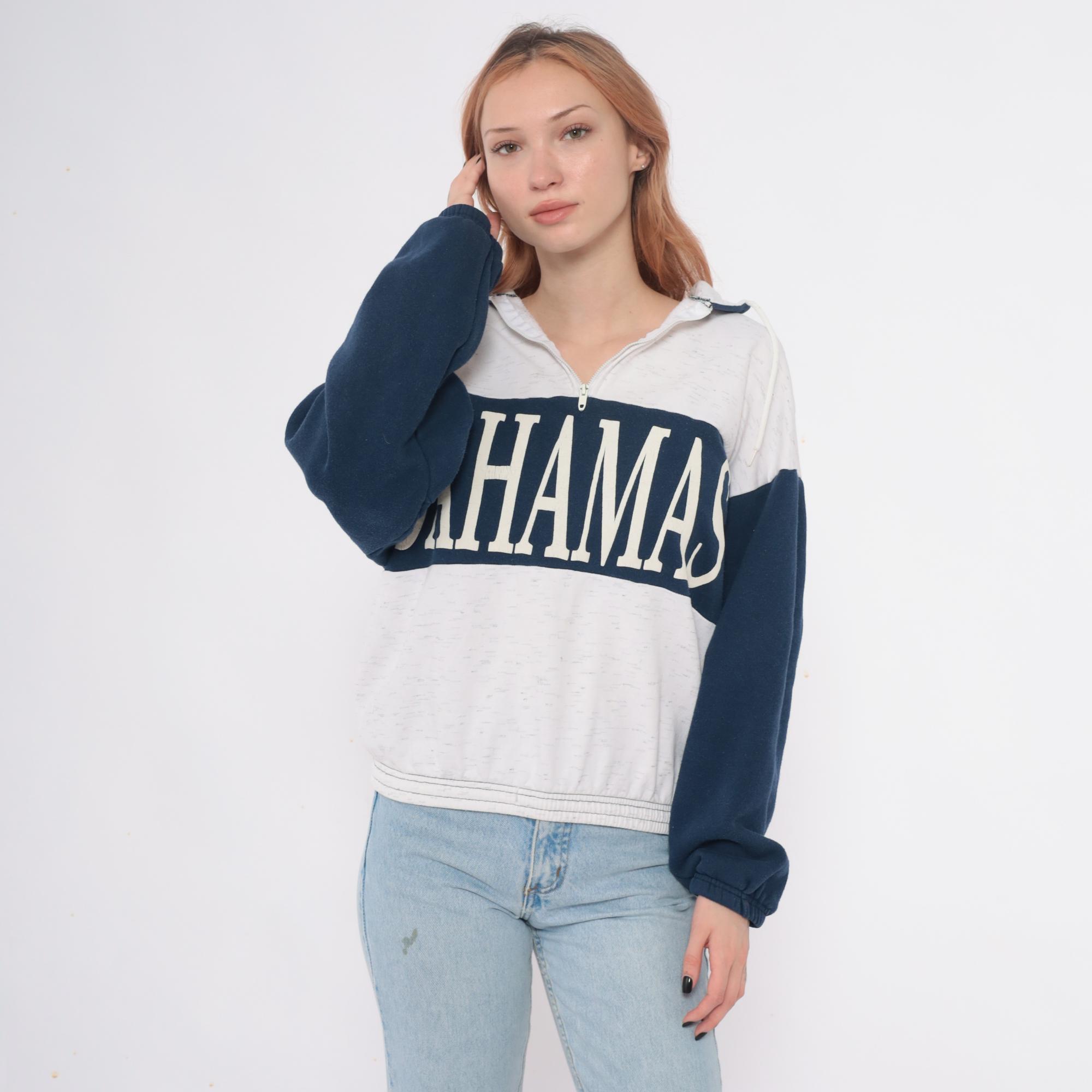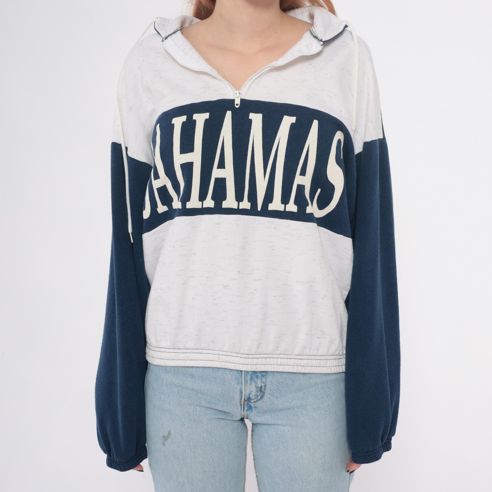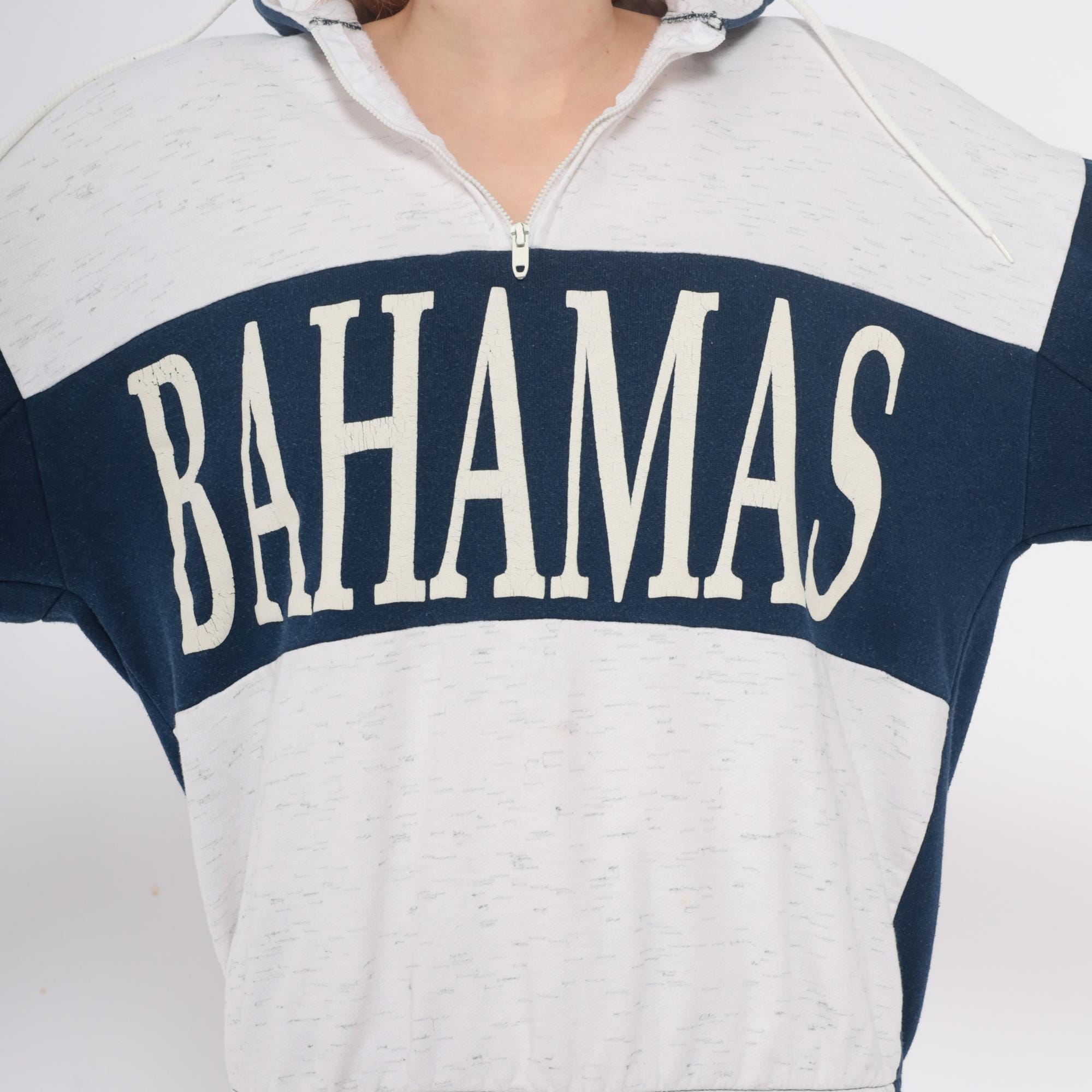 80s hooded sweatshirt with Bahamas graphic in white lettering across navy blue chest panel. Color blocked design with cream body, navy blue sleeves and chest stripe, partial front zipper closure. Hood with drawstrings, ribbed cuffs and hem.