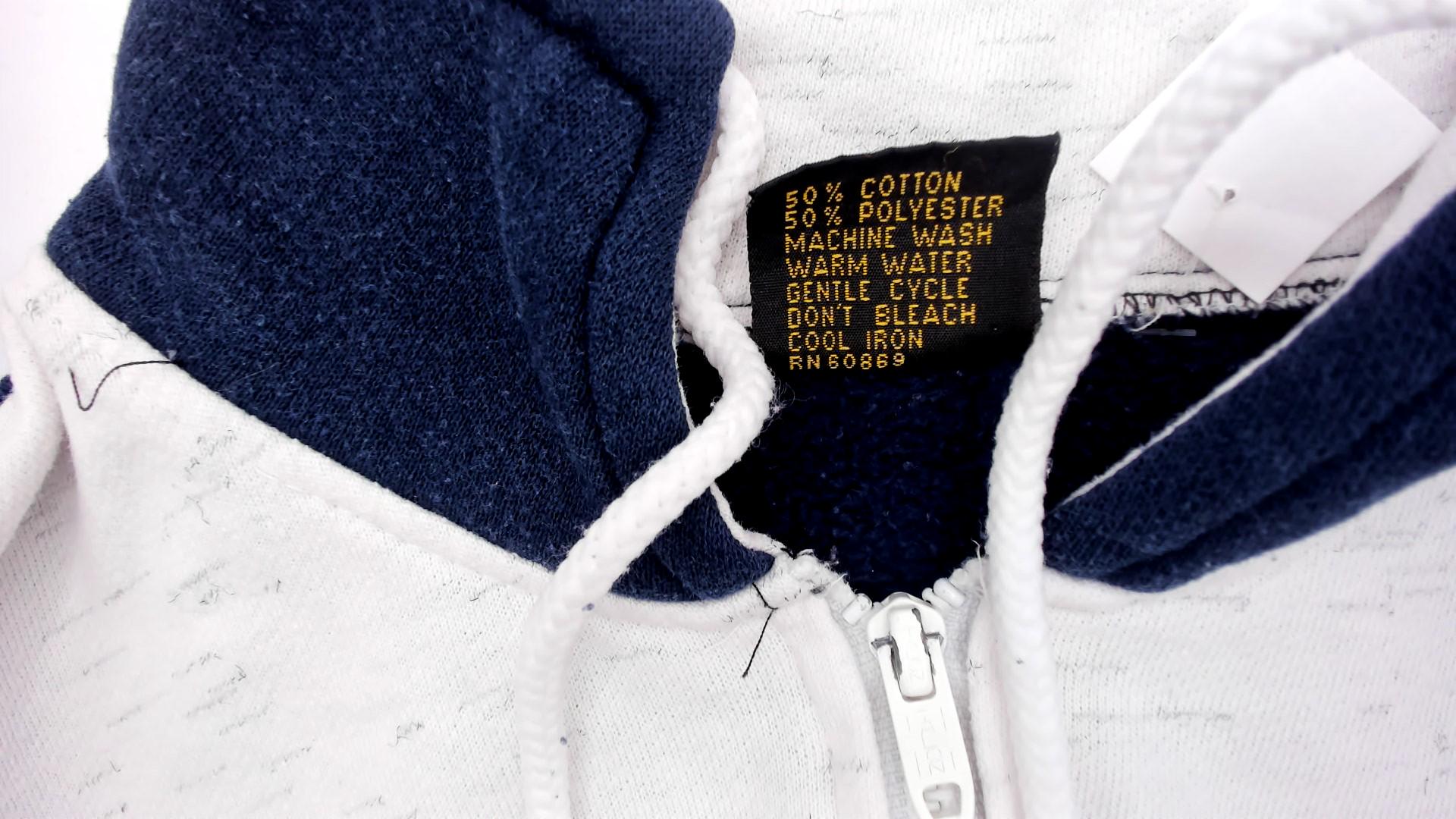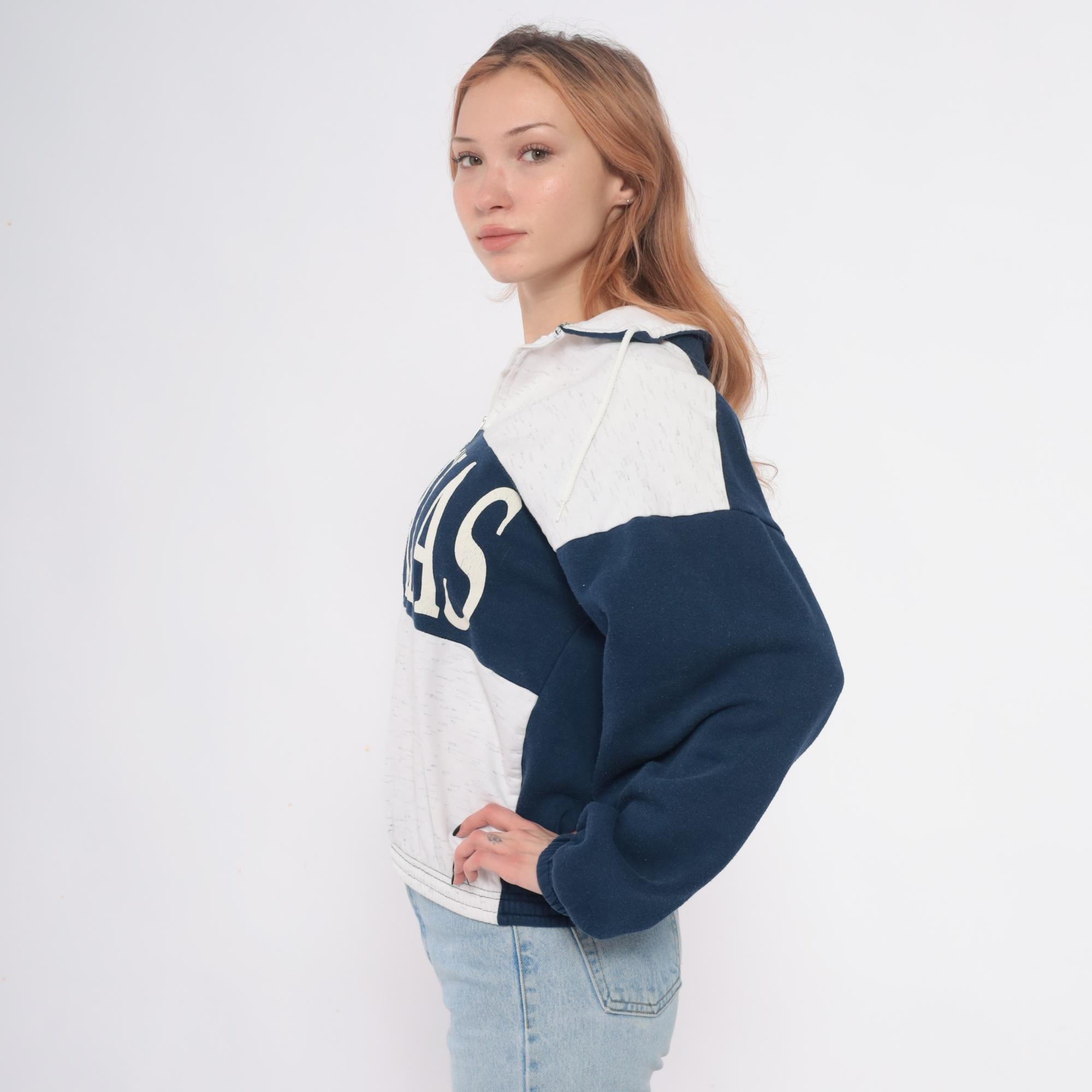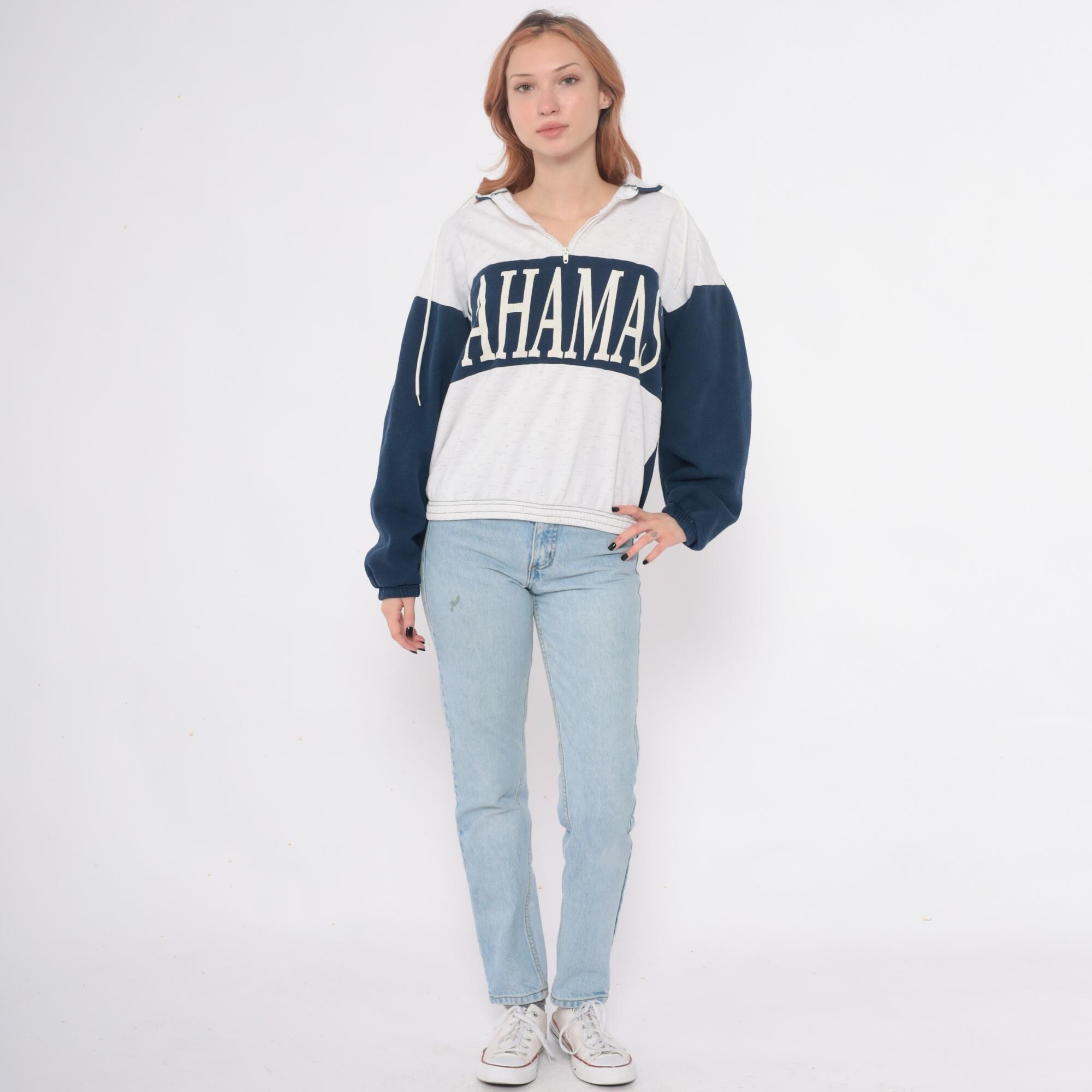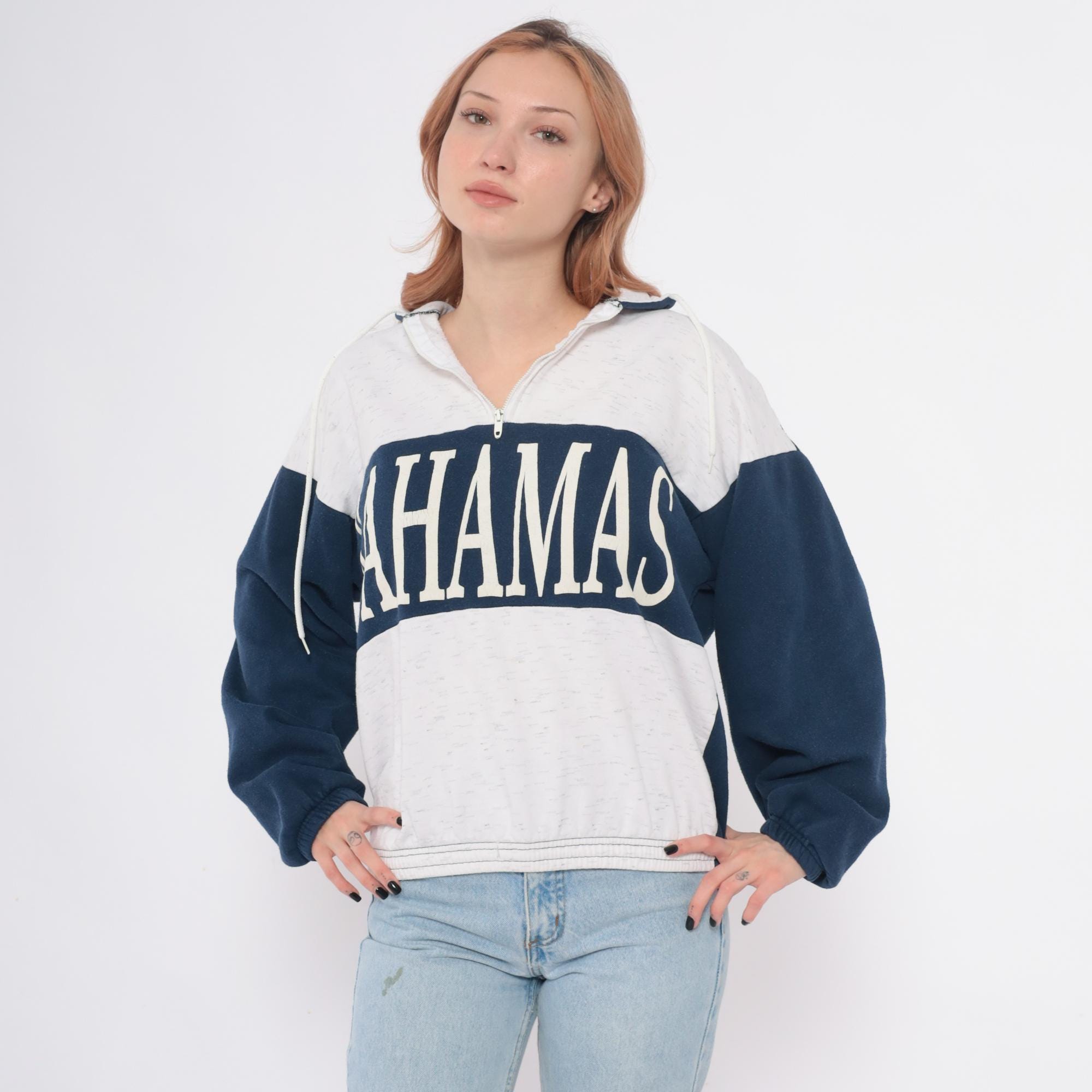 80s hooded sweatshirt with Bahamas graphic in white lettering across navy blue chest panel. Color blocked design with cream body, navy blue sleeves and chest stripe, partial front zipper closure. Hood with drawstrings, ribbed cuffs and hem.