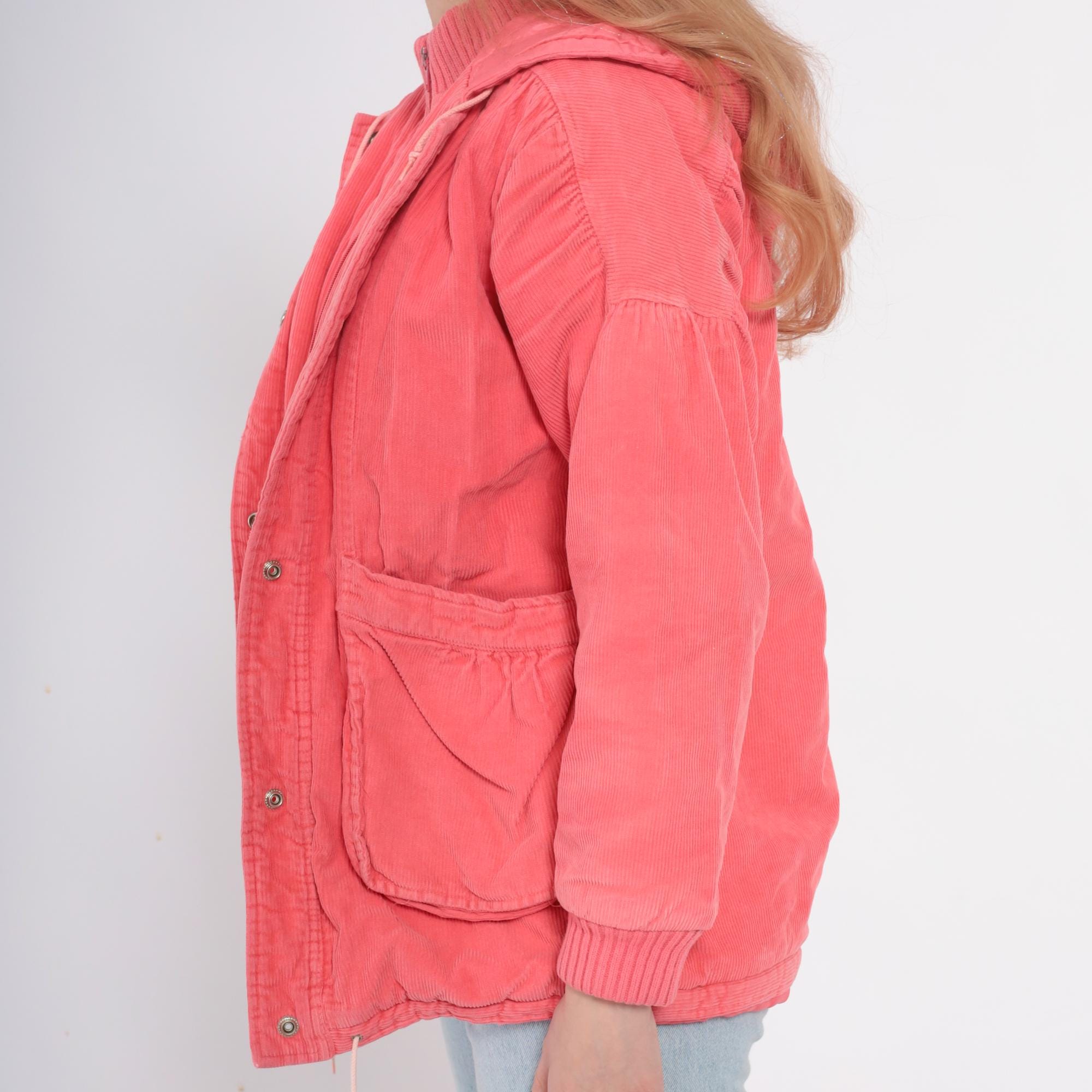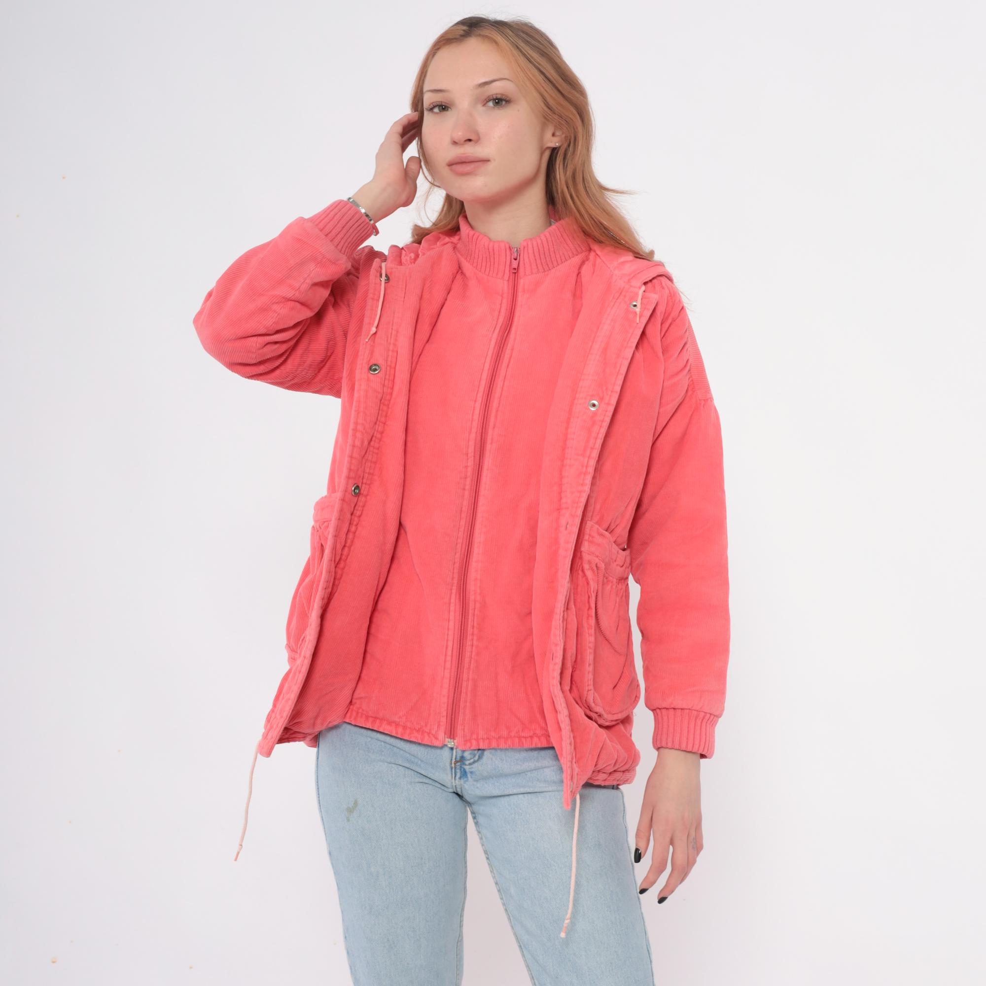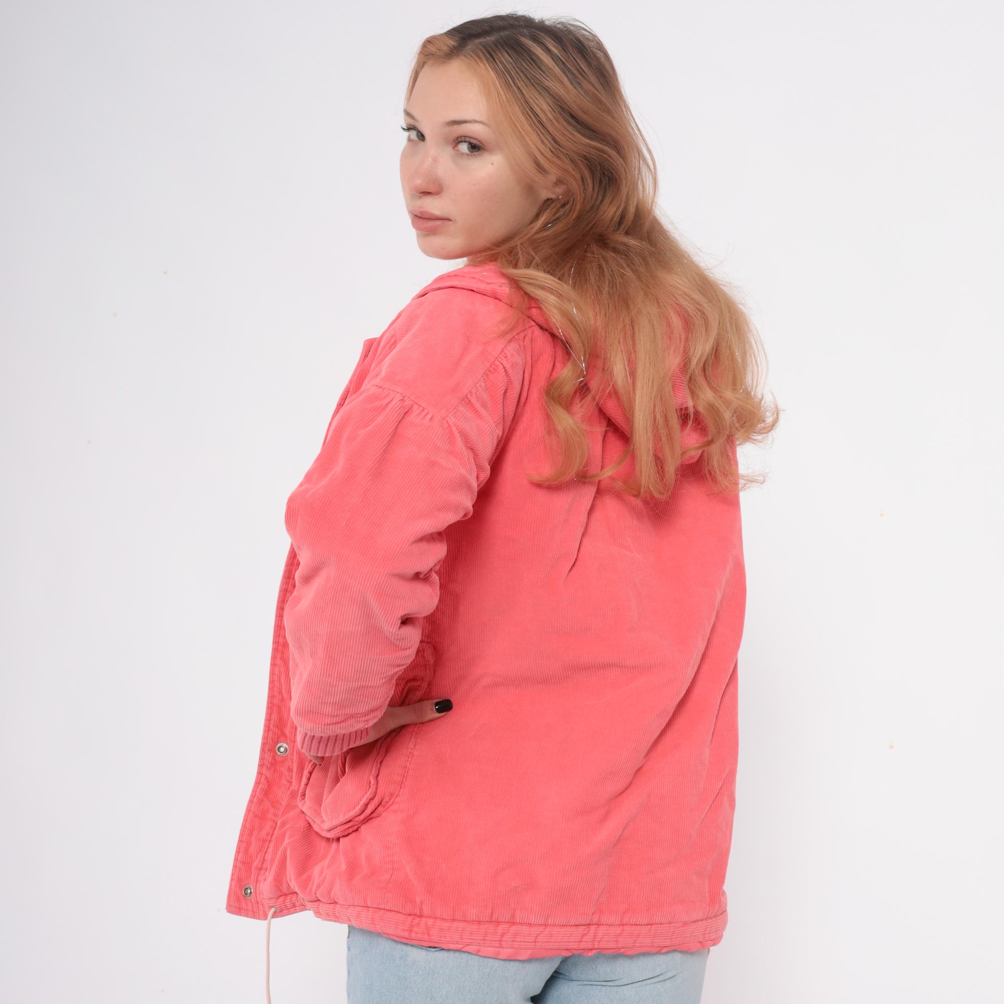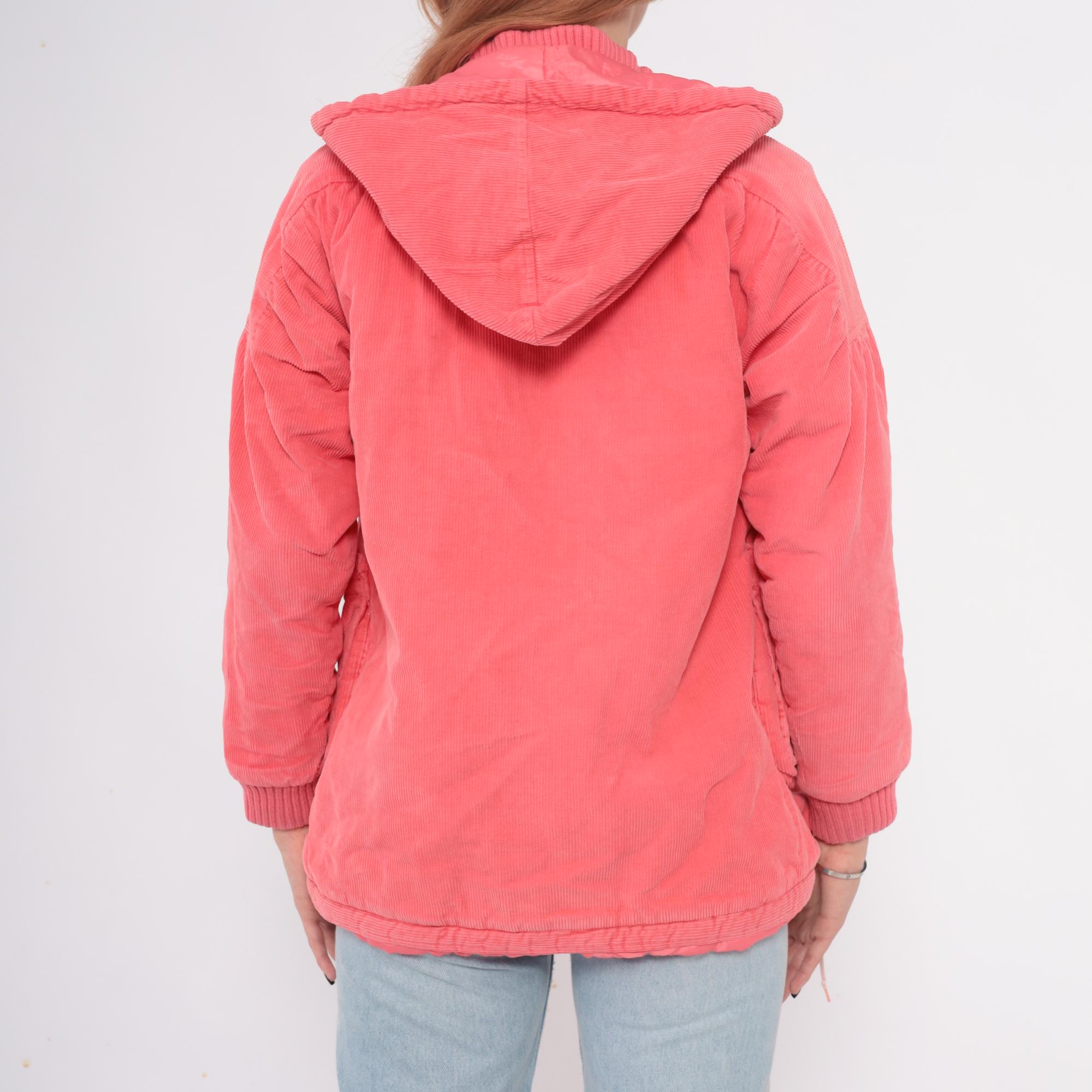 80s coral pink hooded jacket in wide wale corduroy with full zip front closure and drawstring hood. Two front patch pockets with gathered detail, ribbed knit cuffs and waistband.
