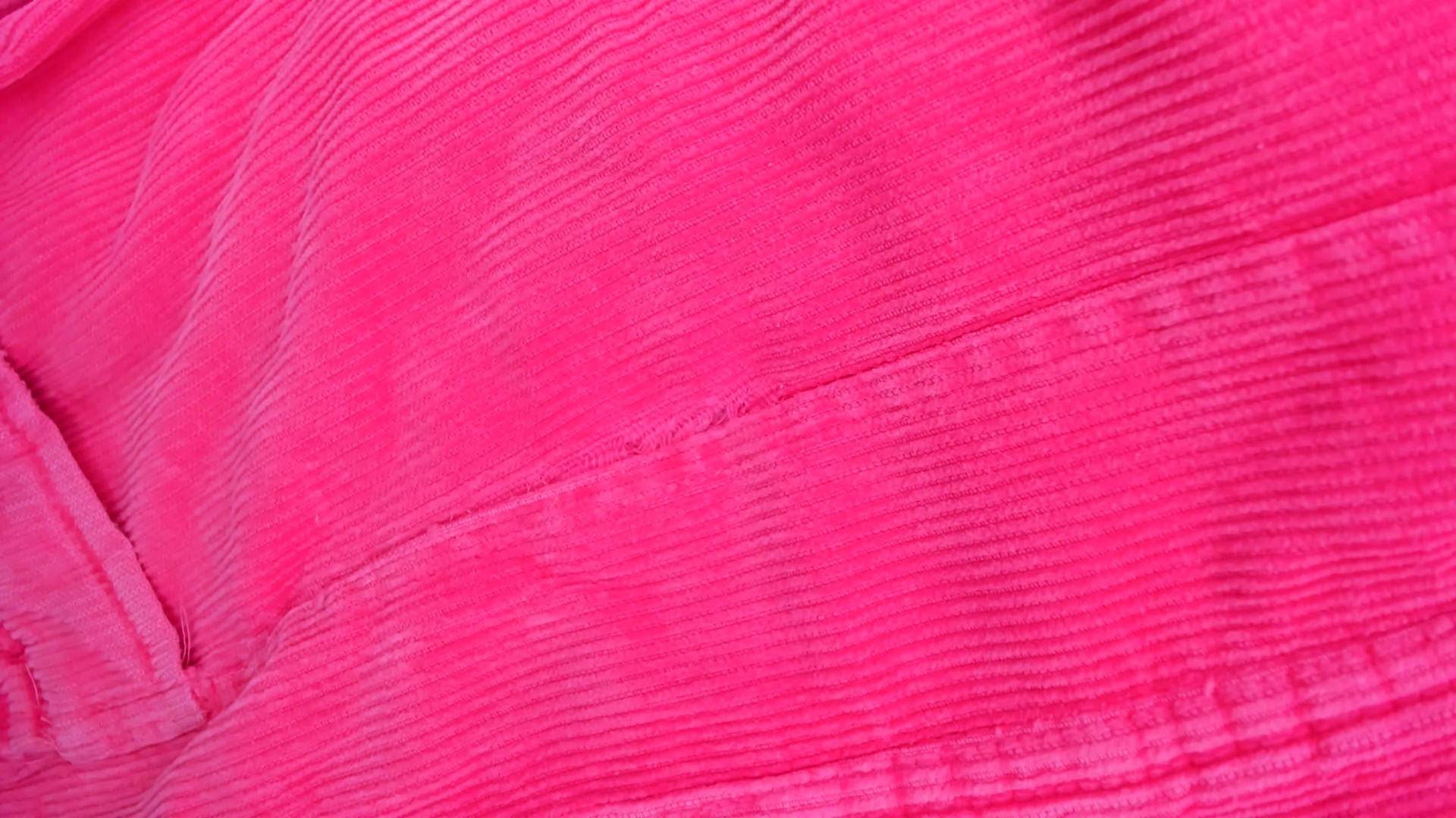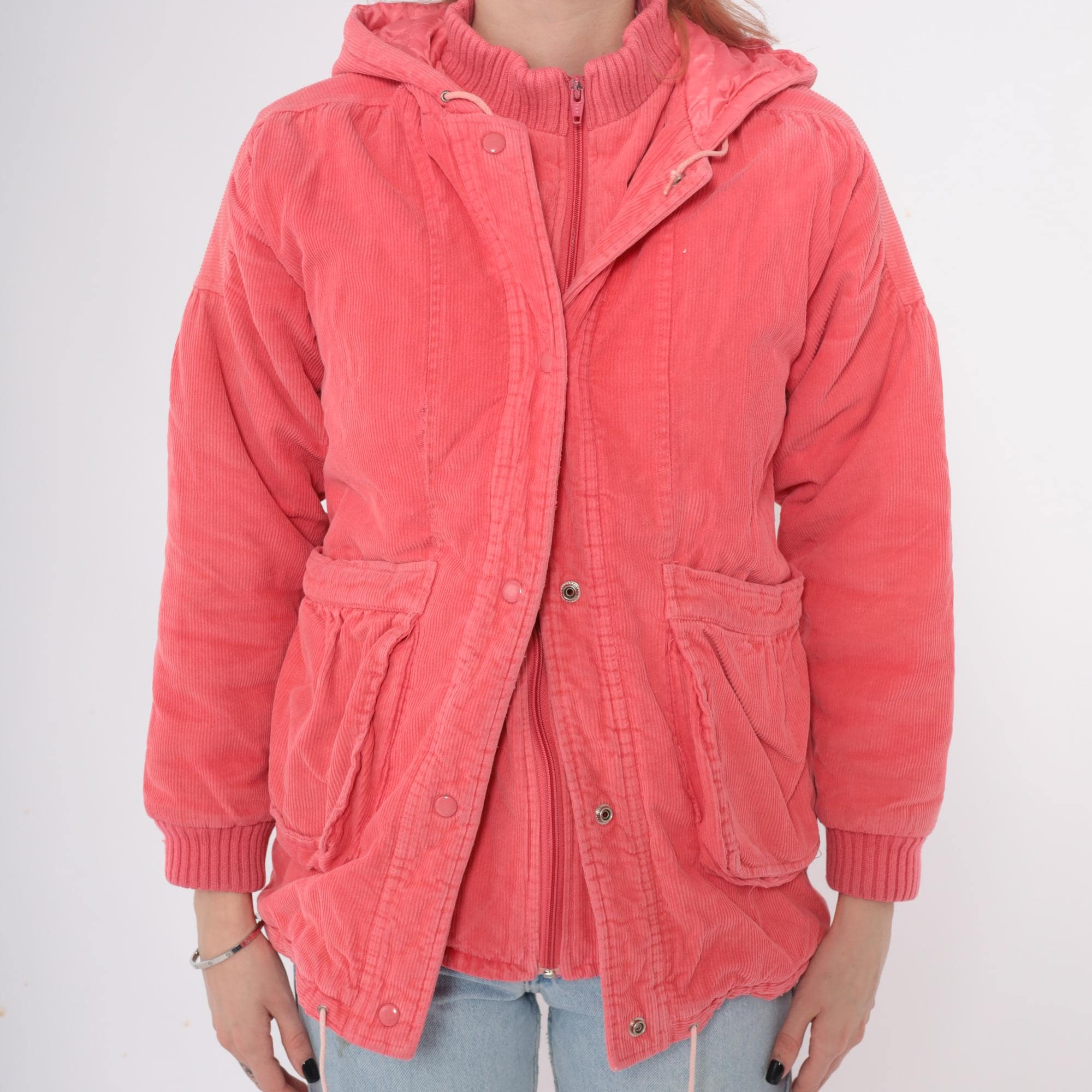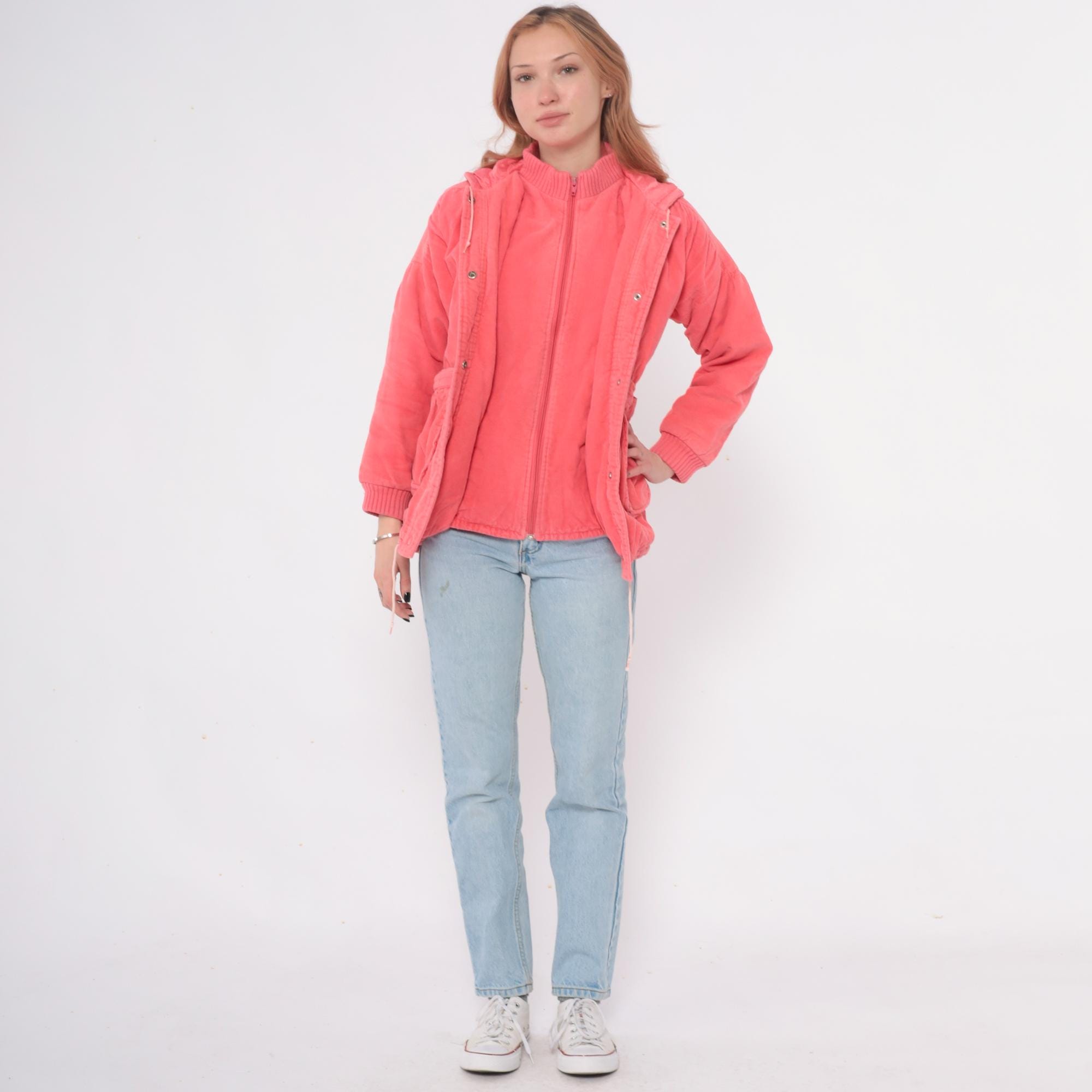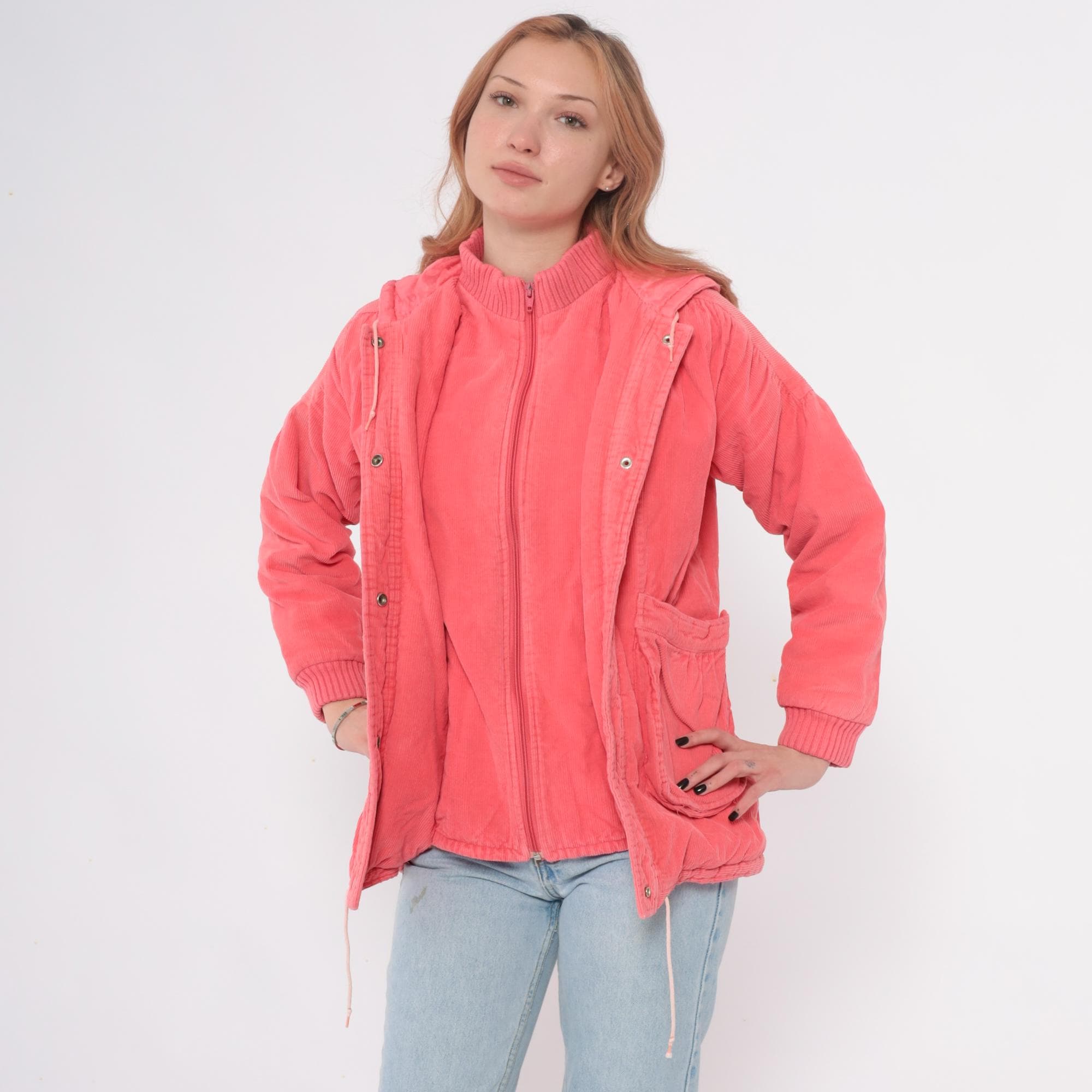 80s coral pink hooded jacket in wide wale corduroy with full zip front closure and drawstring hood. Two front patch pockets with gathered detail, ribbed knit cuffs and waistband.