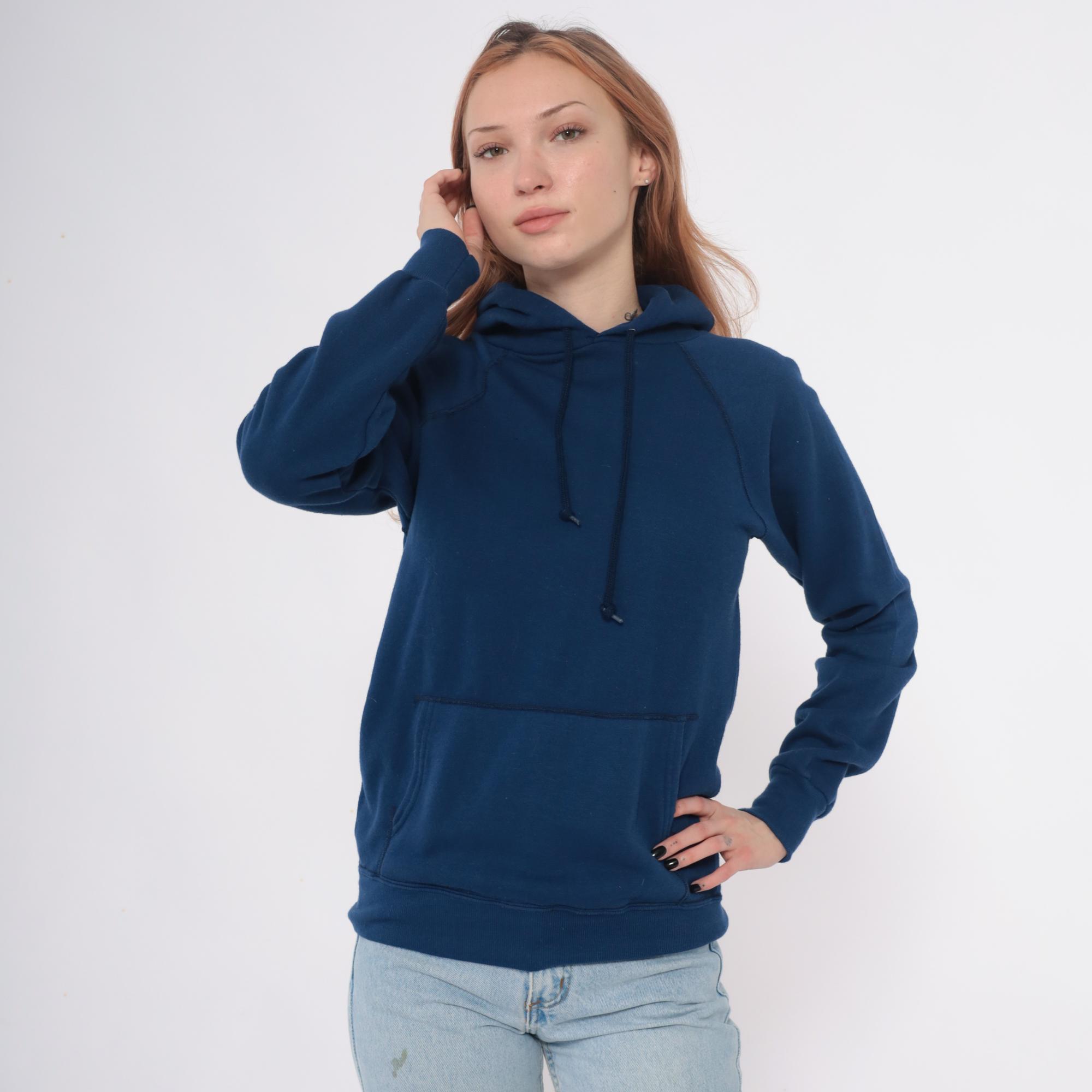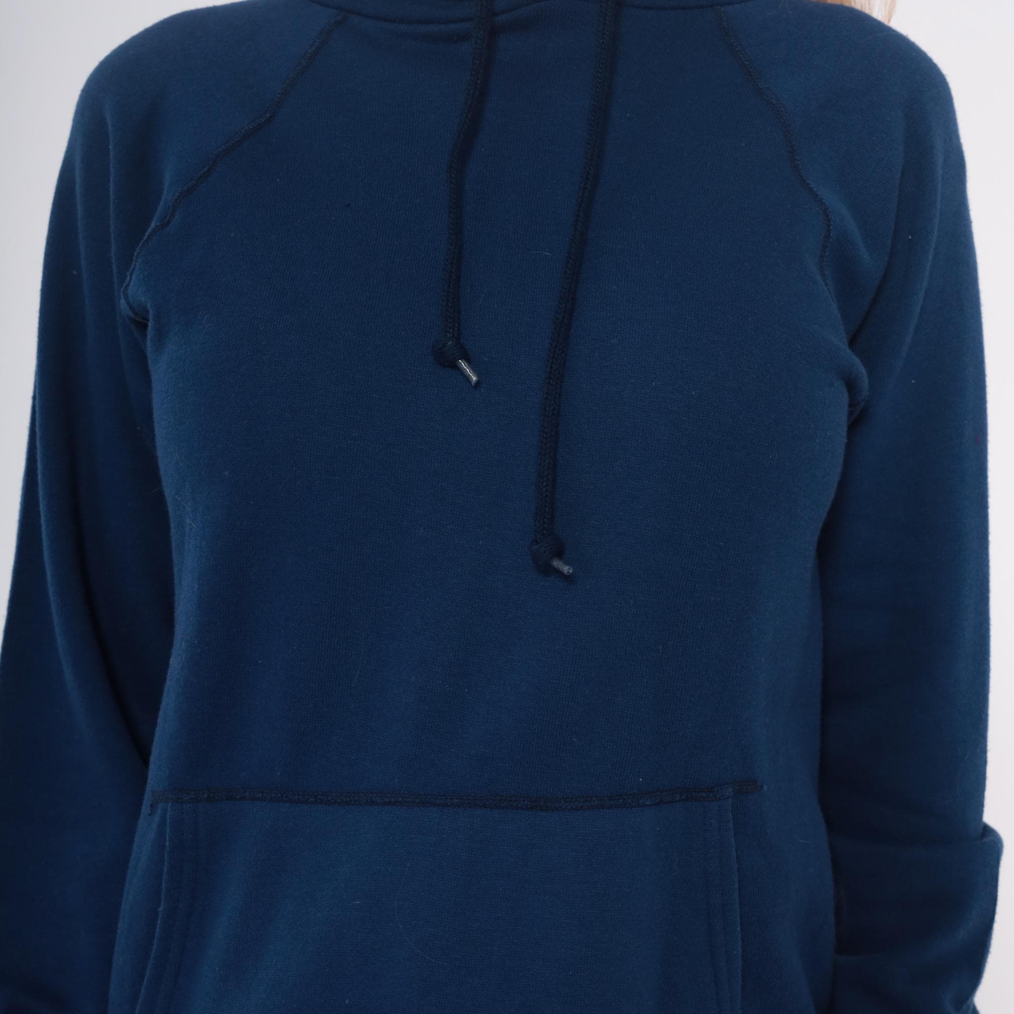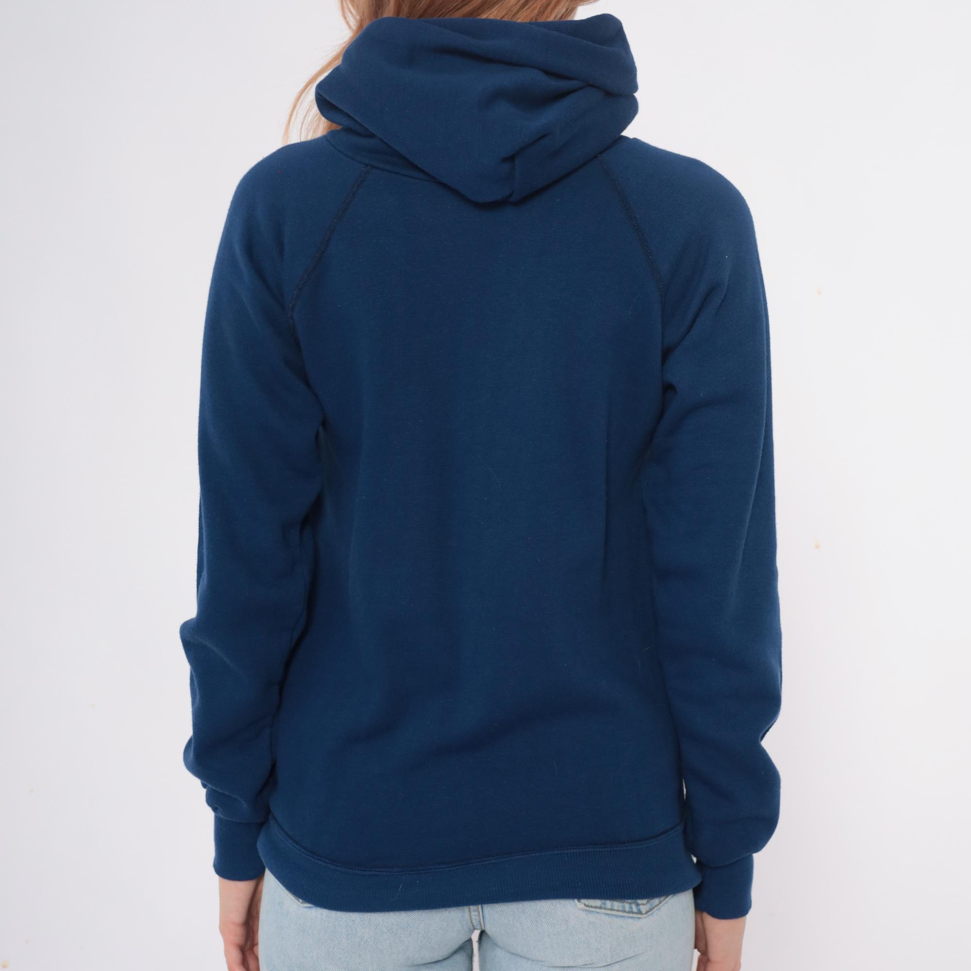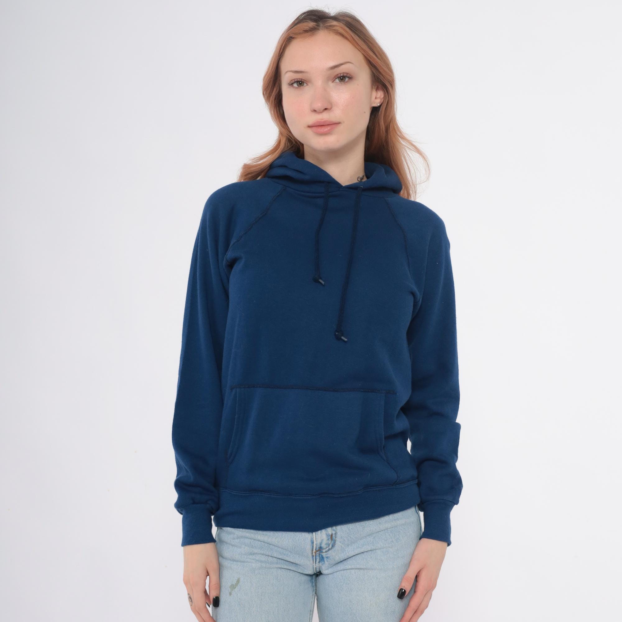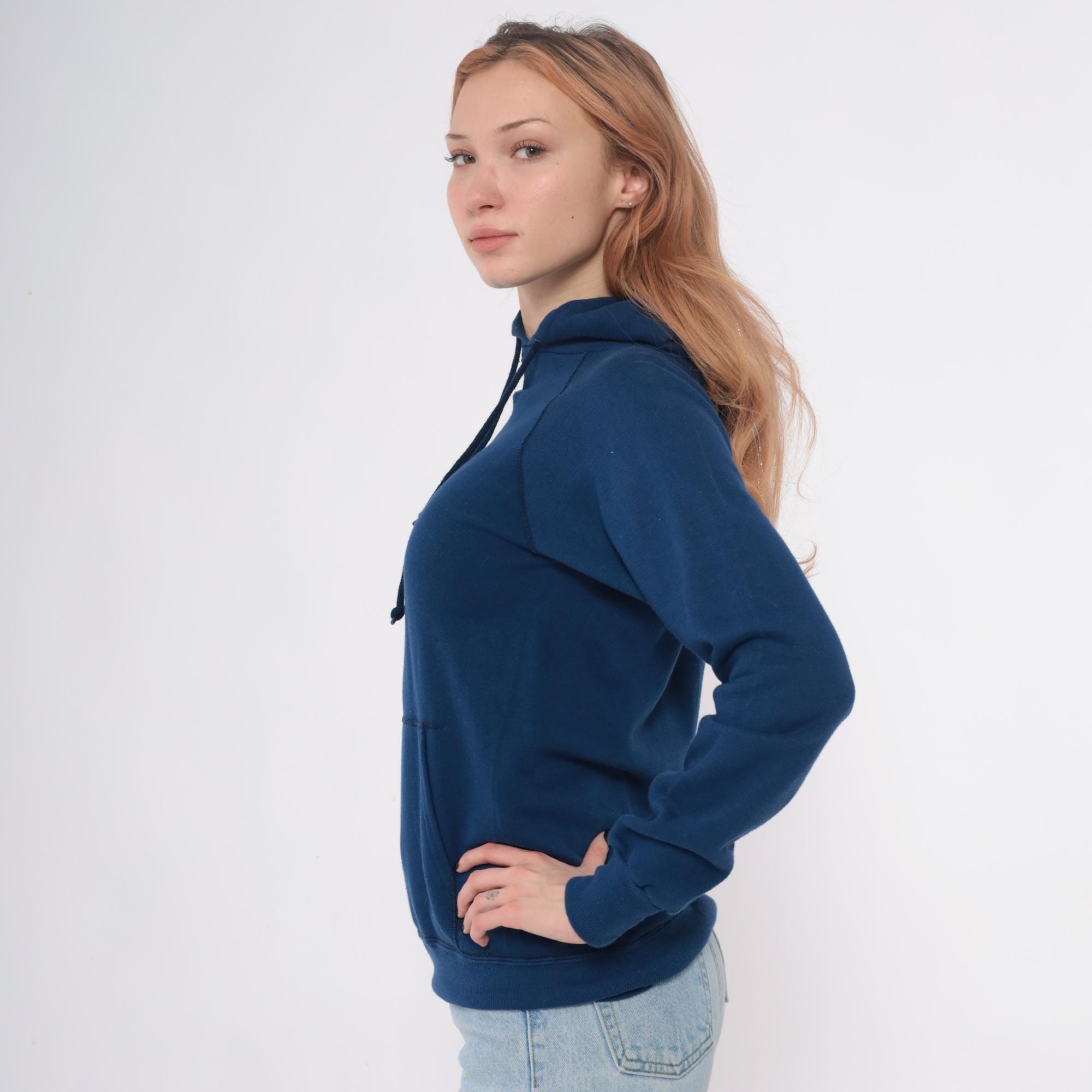 80s navy blue hooded sweatshirt with raglan sleeves and kangaroo front pocket. Drawstring hood, ribbed cuffs and hem.