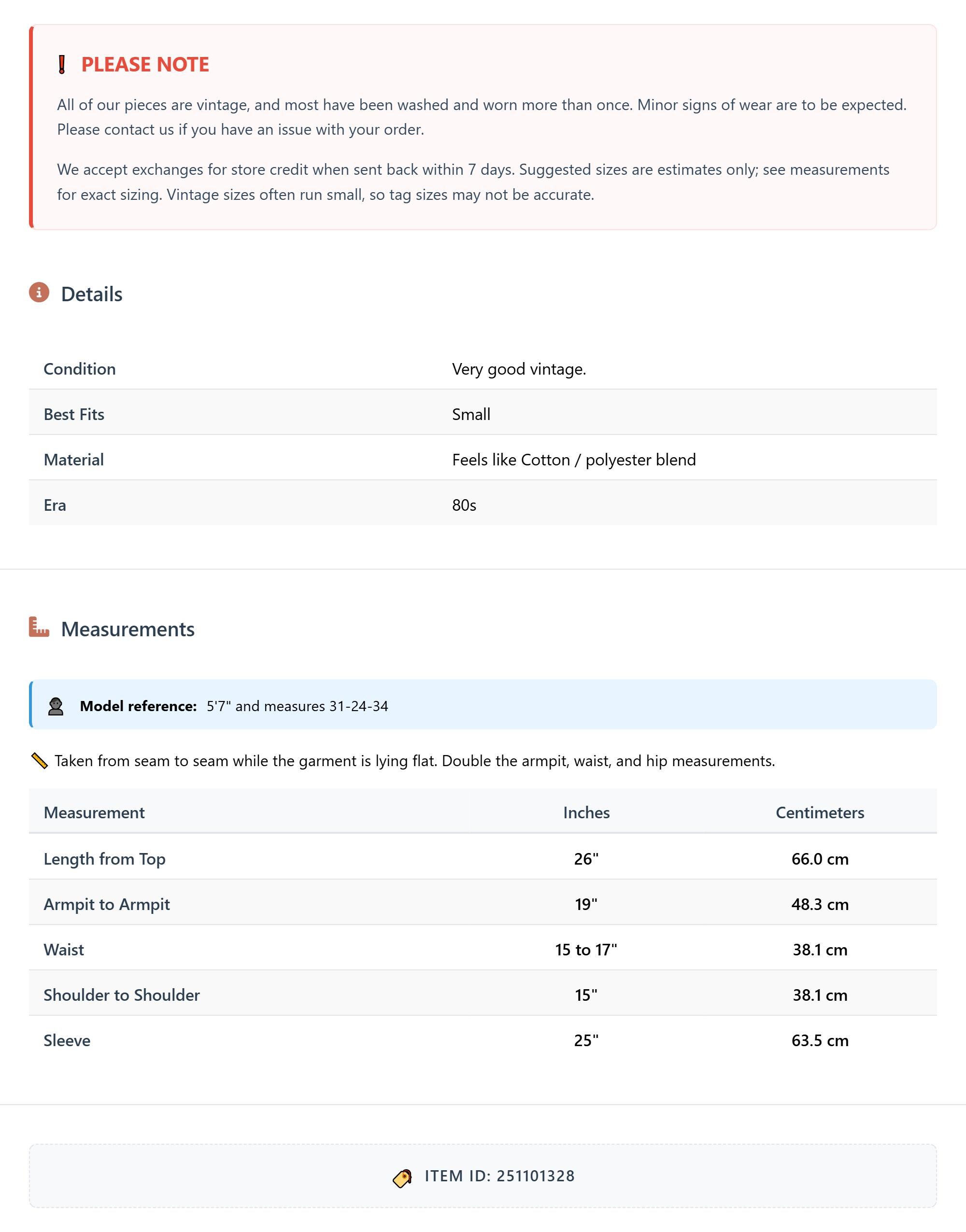 Suggested sizes are estimates only; see measurements for exact sizing. Vintage sizes often run small, so tag sizes may not be accurate.