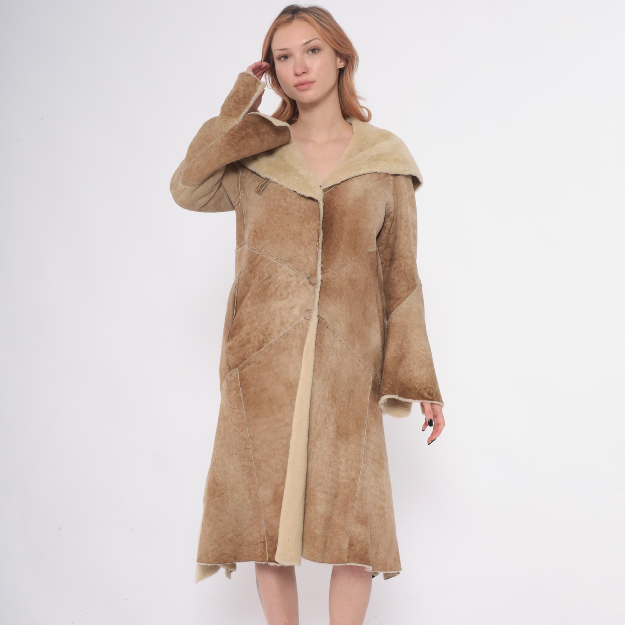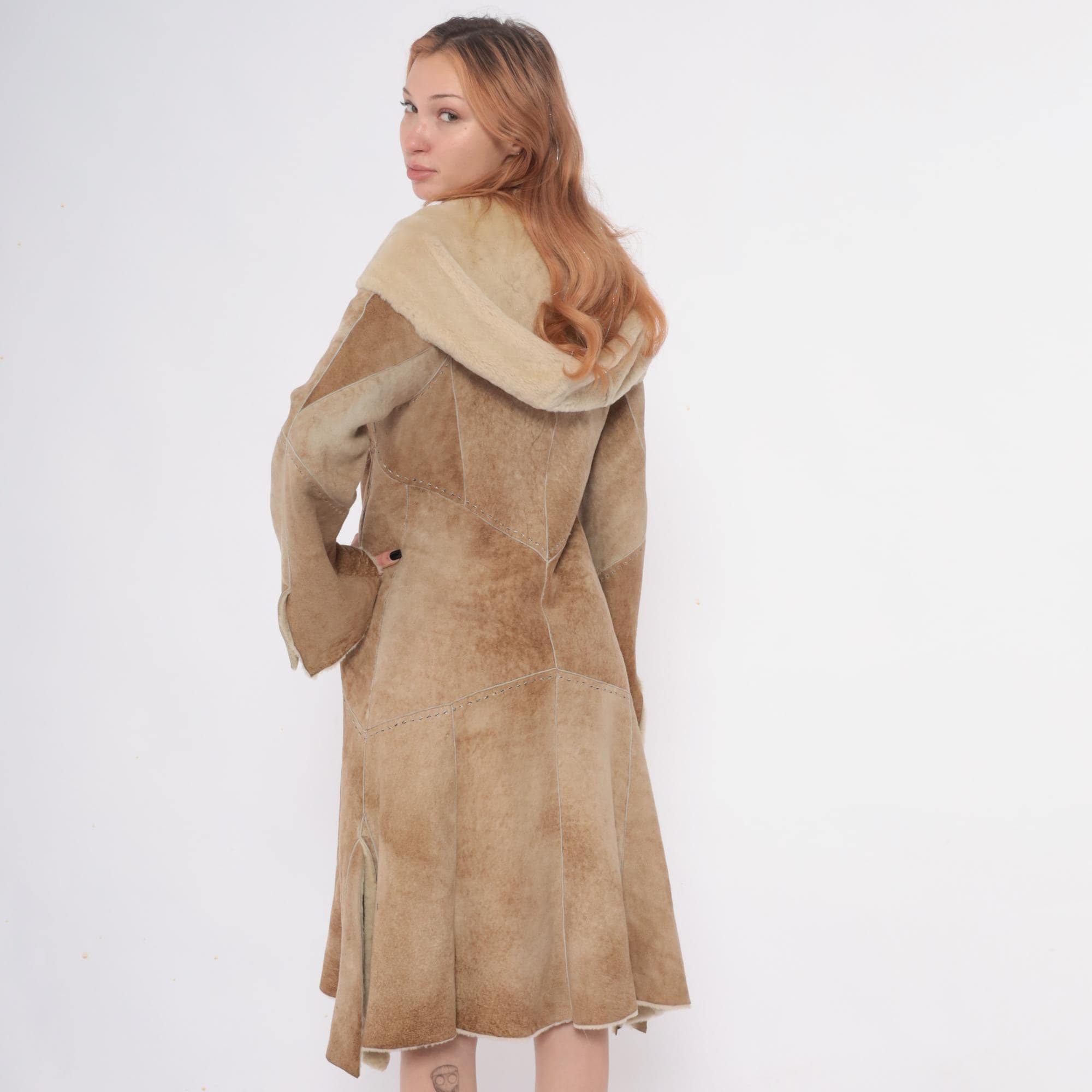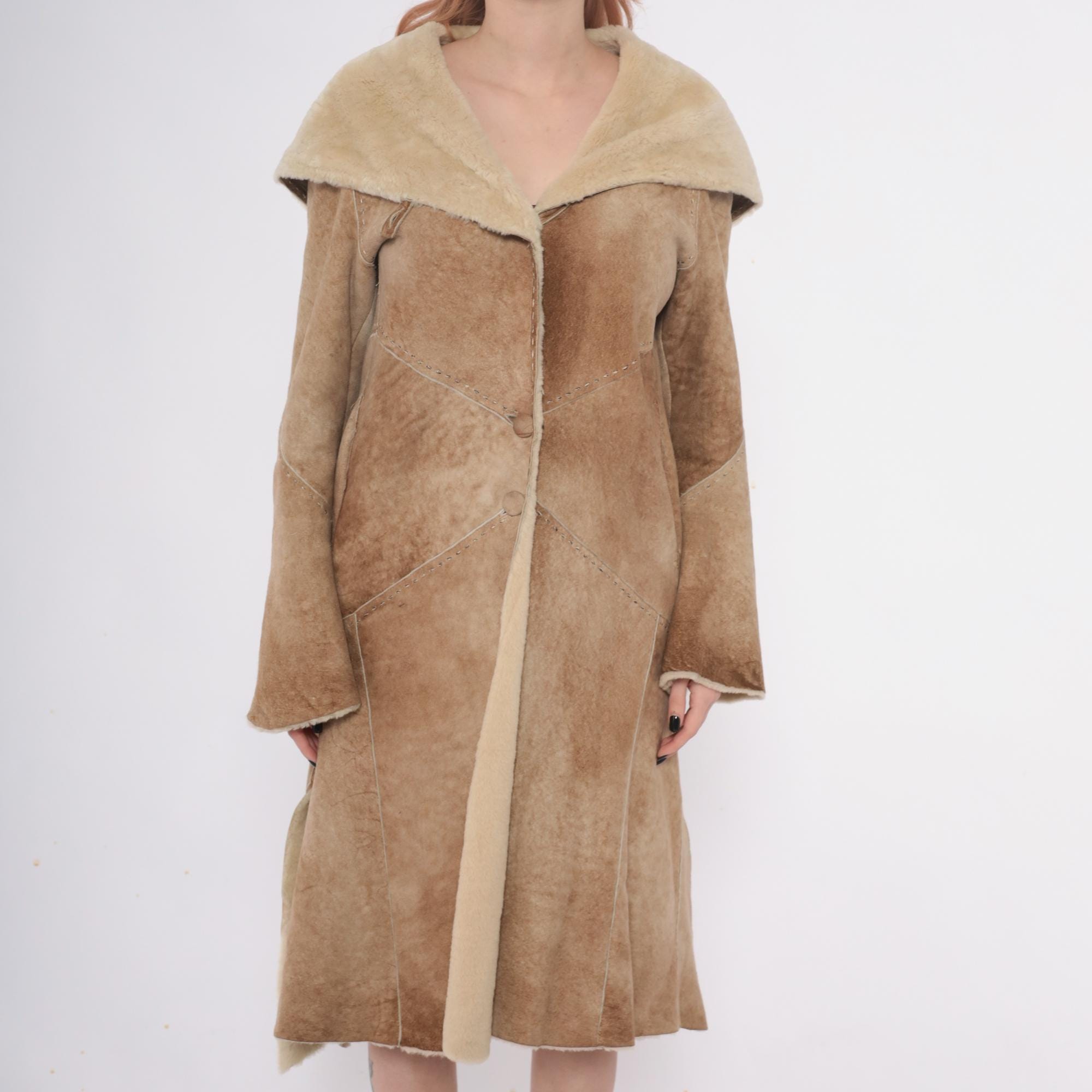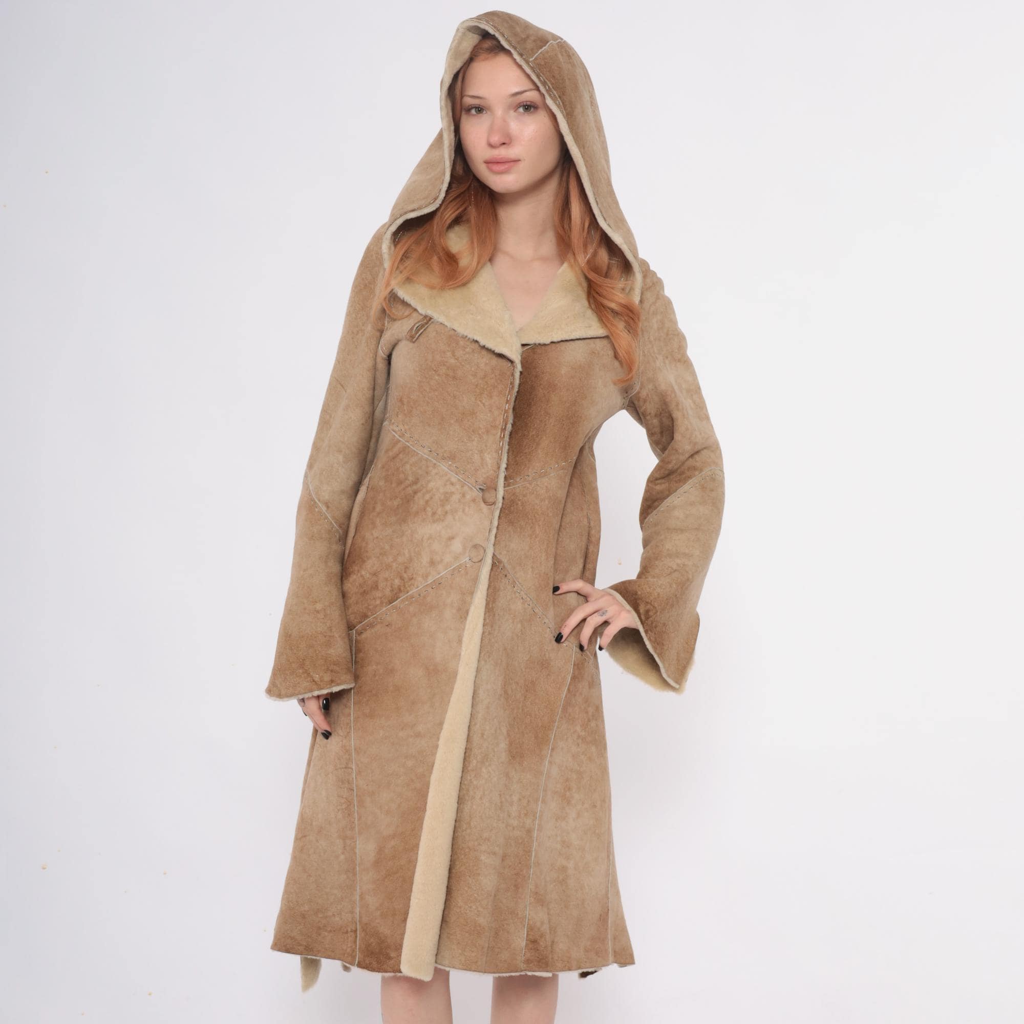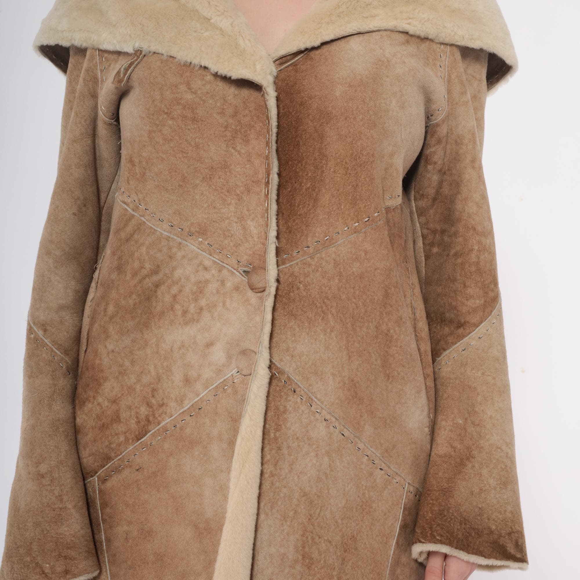 90s camel hooded coat from denimaxx couture with oversized hood and shearling trim throughout. Front hook closure, long sleeves with wide cuffs, pieced construction with visible seam detailing. Suede exterior with cream shearling lining at hood, cuffs, and edges.
