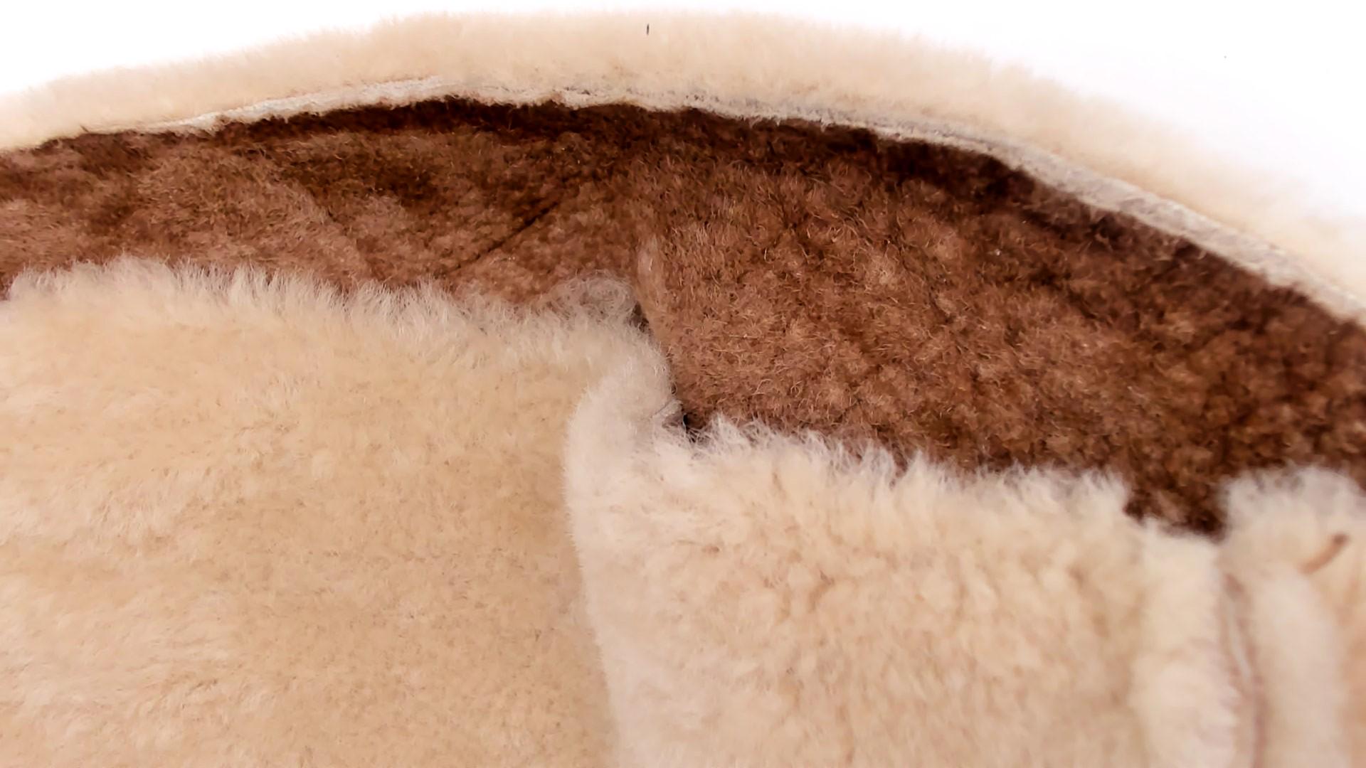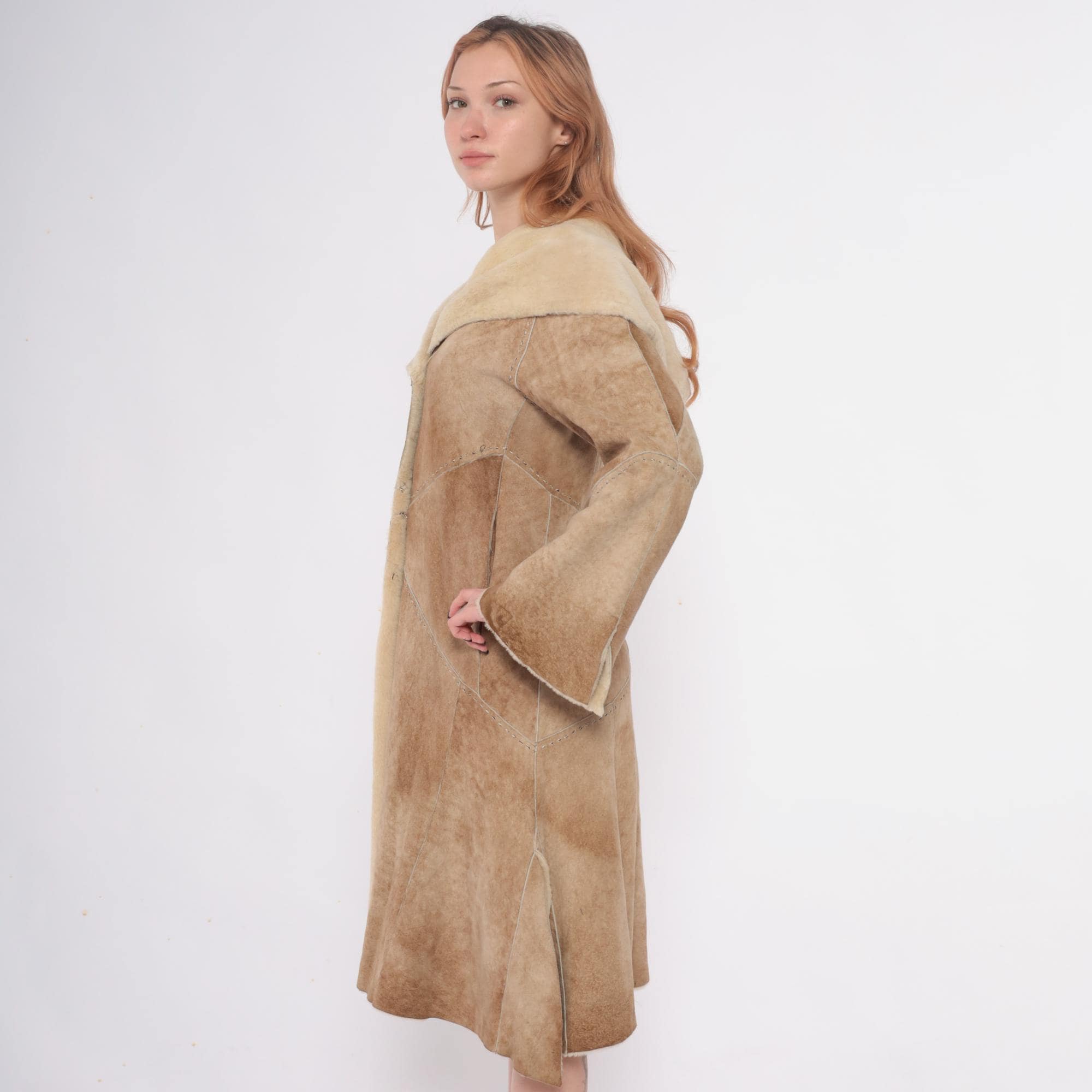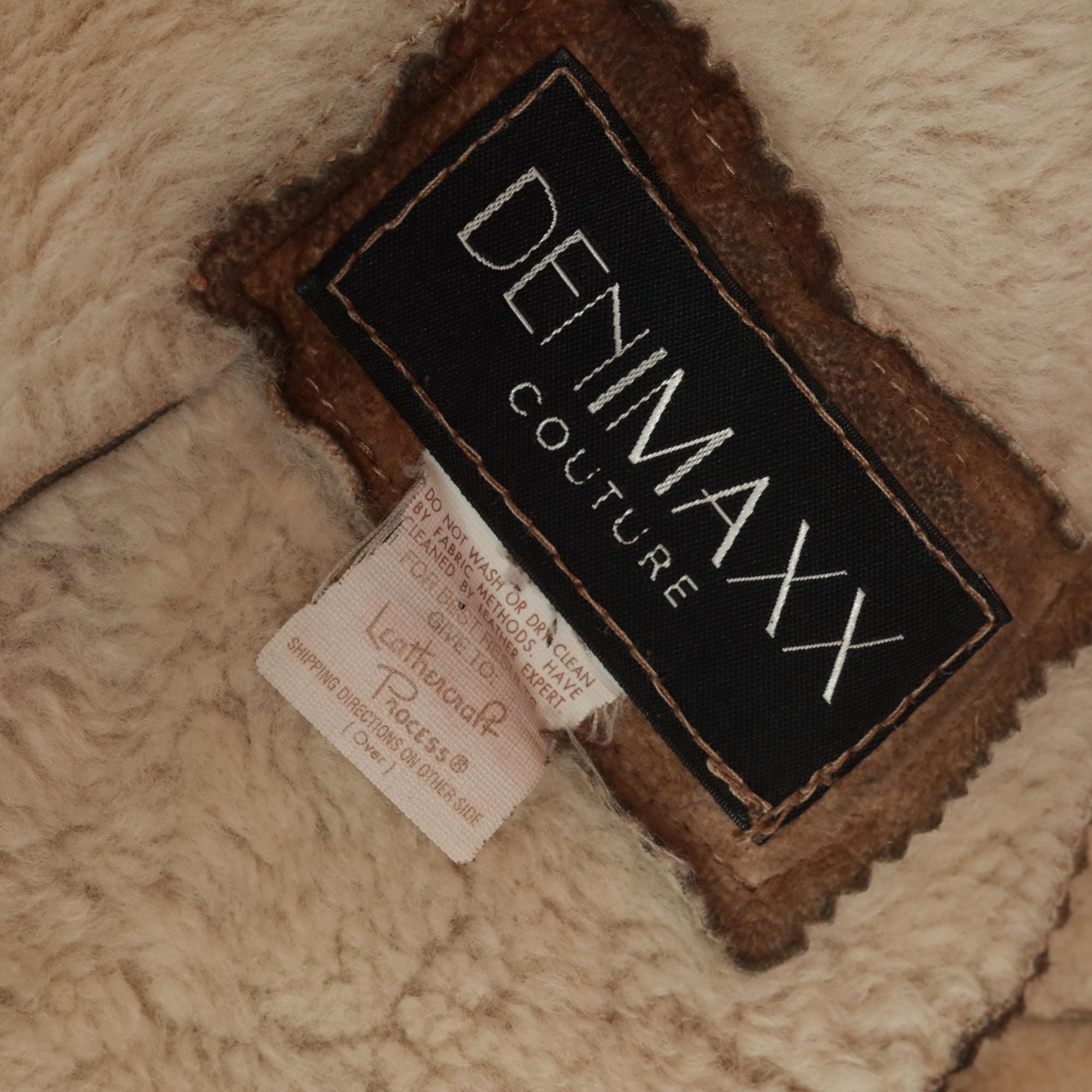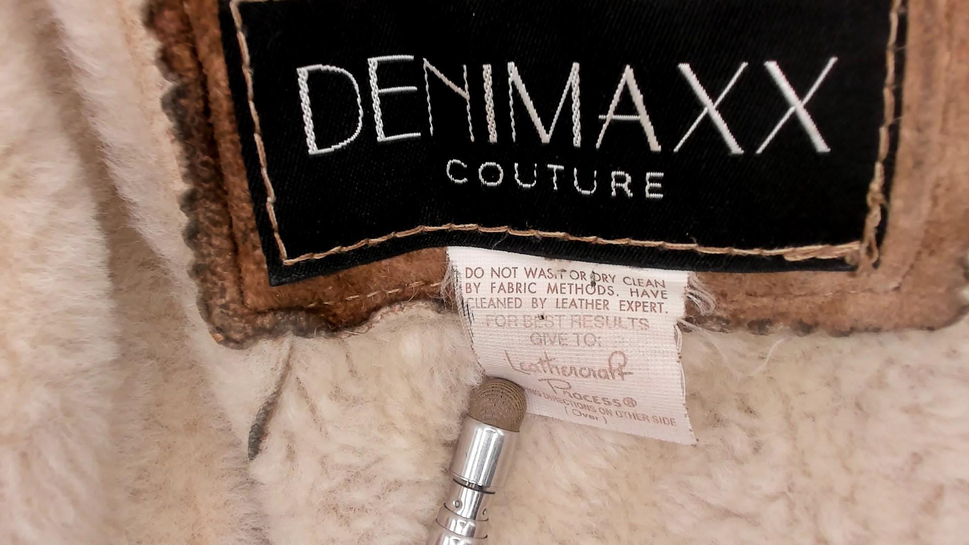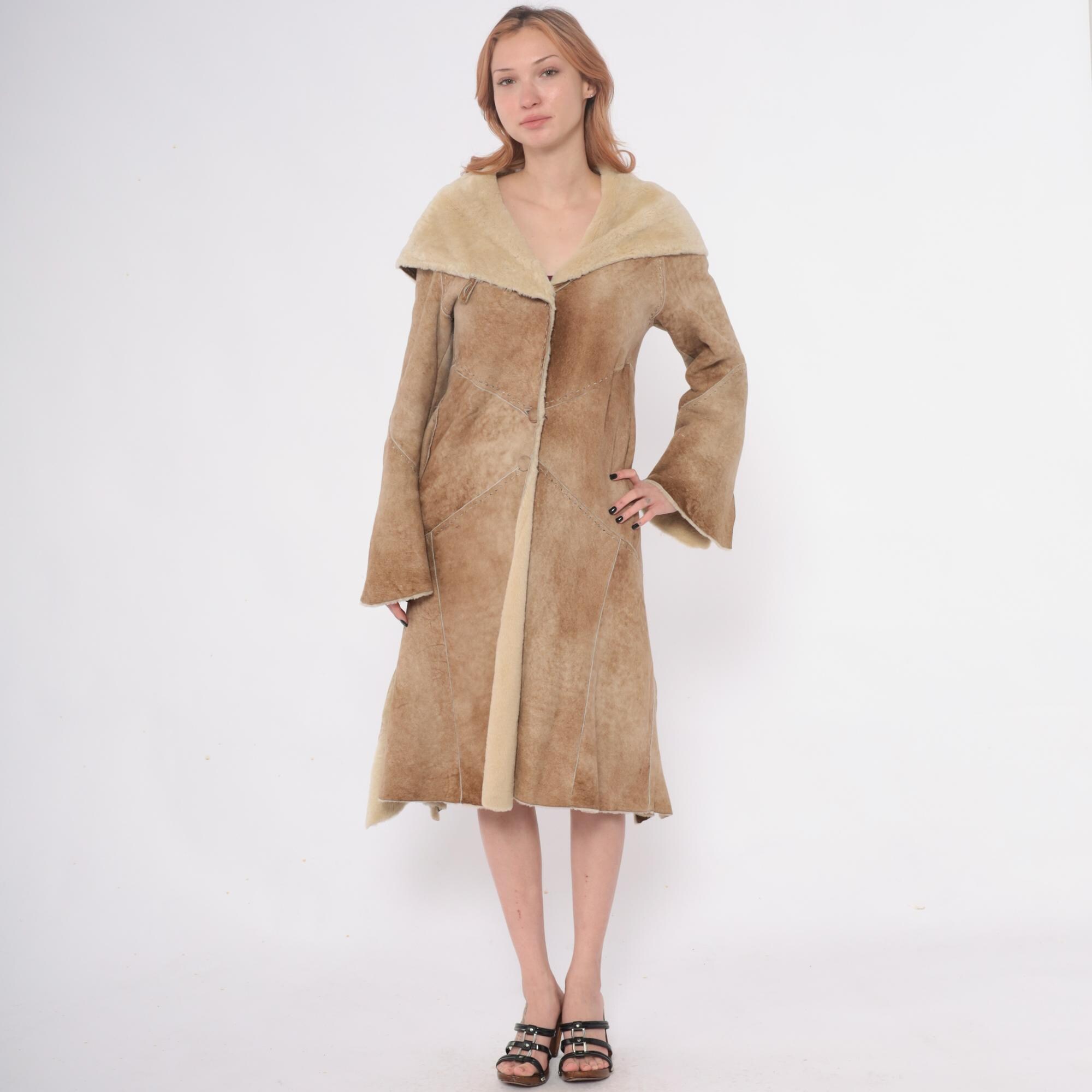 90s camel hooded coat from denimaxx couture with oversized hood and shearling trim throughout. Front hook closure, long sleeves with wide cuffs, pieced construction with visible seam detailing. Suede exterior with cream shearling lining at hood, cuffs, and edges.