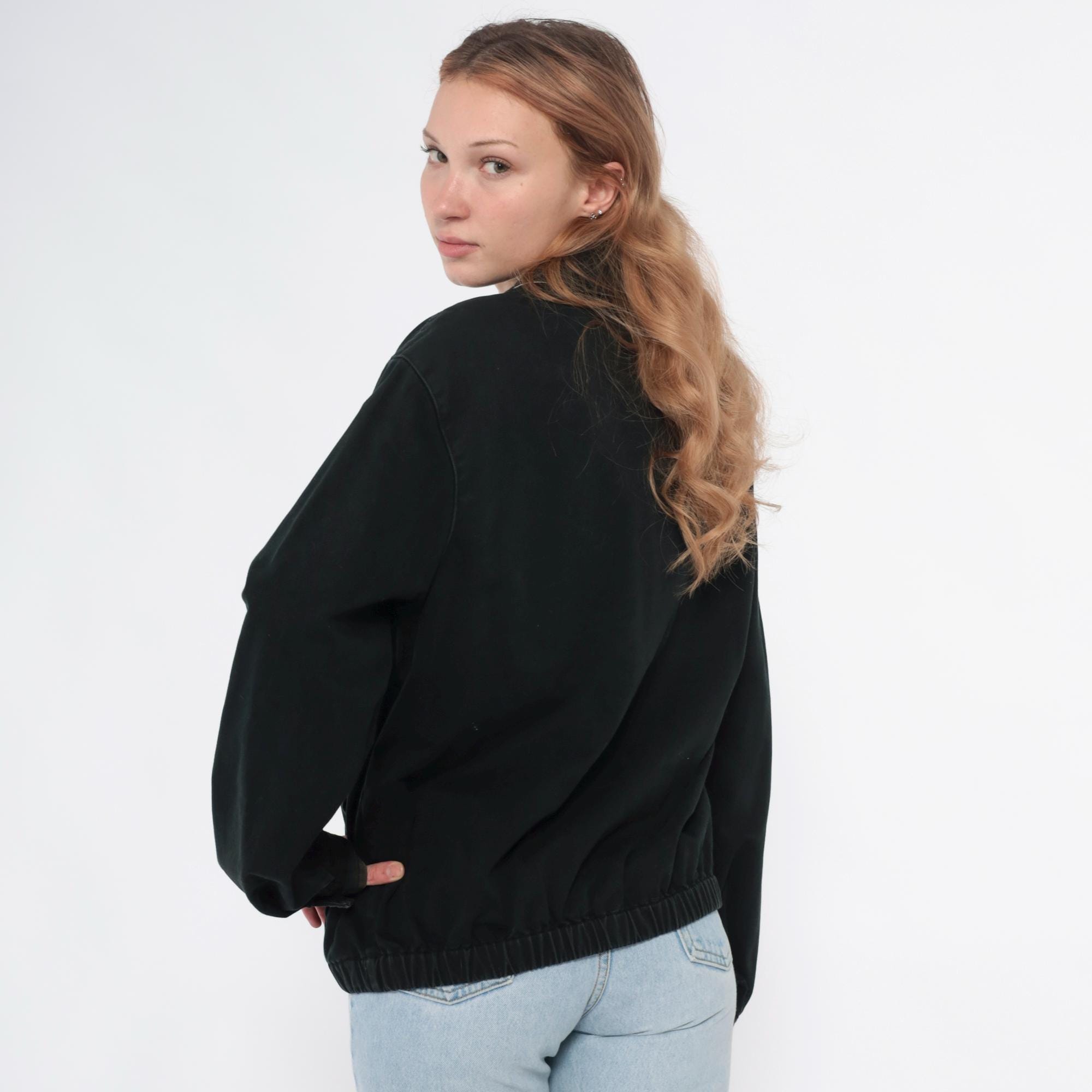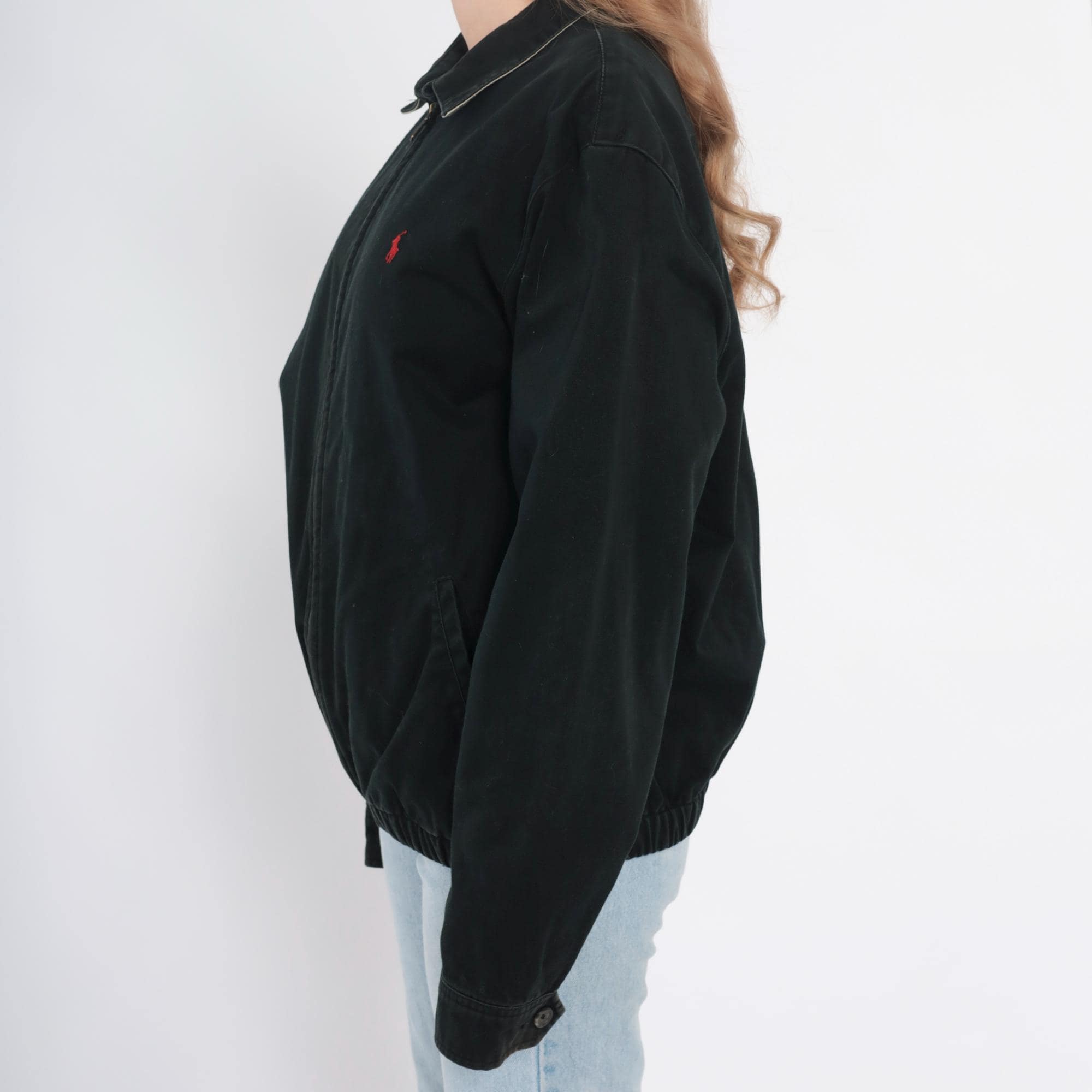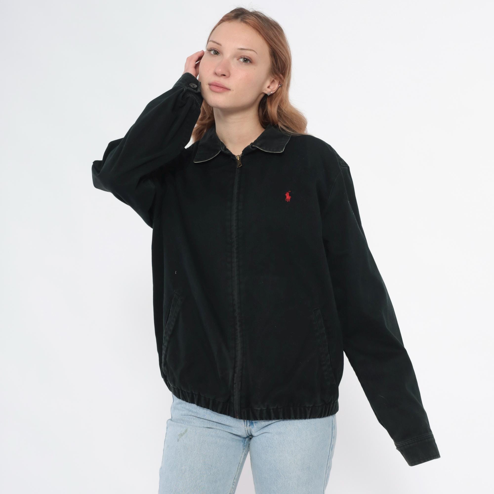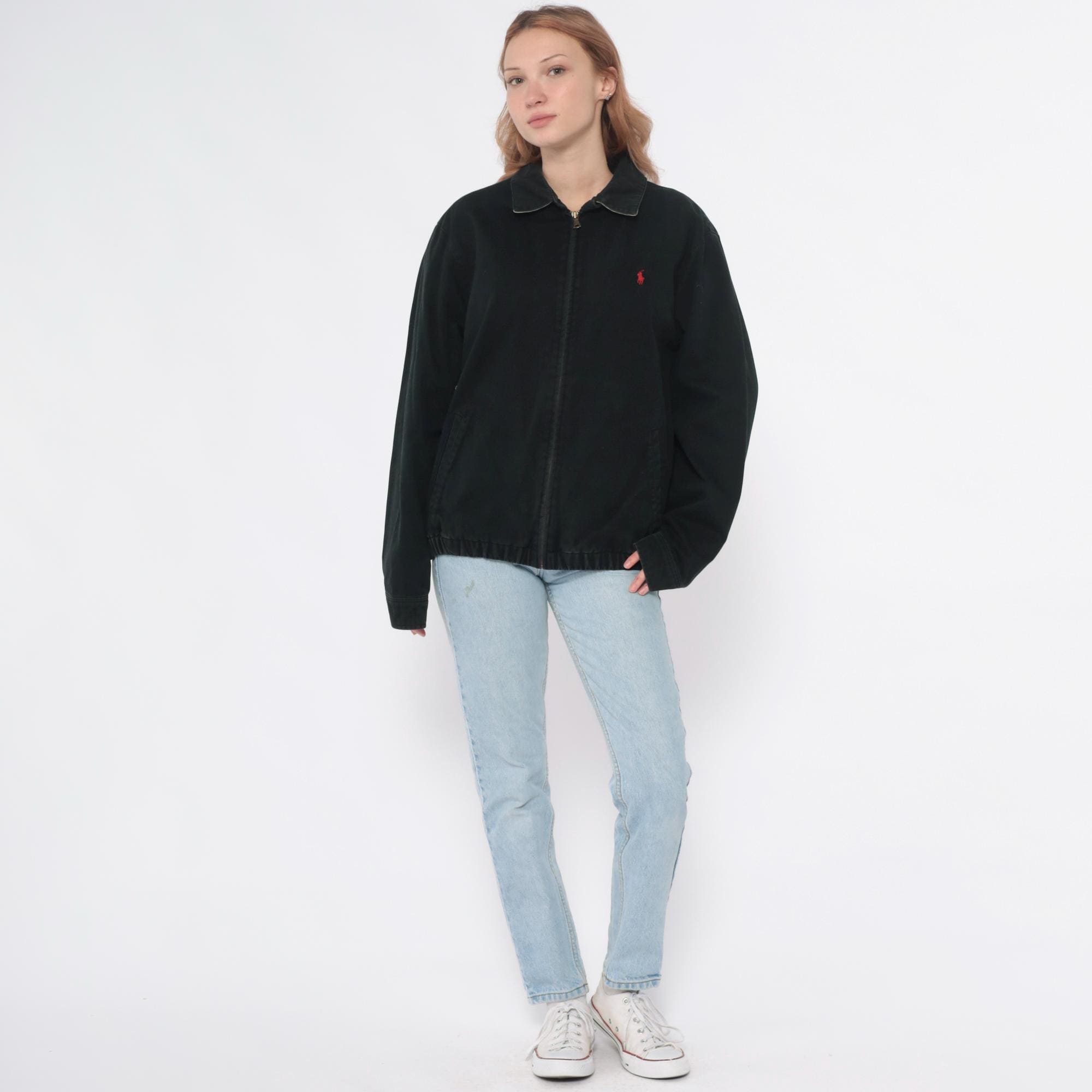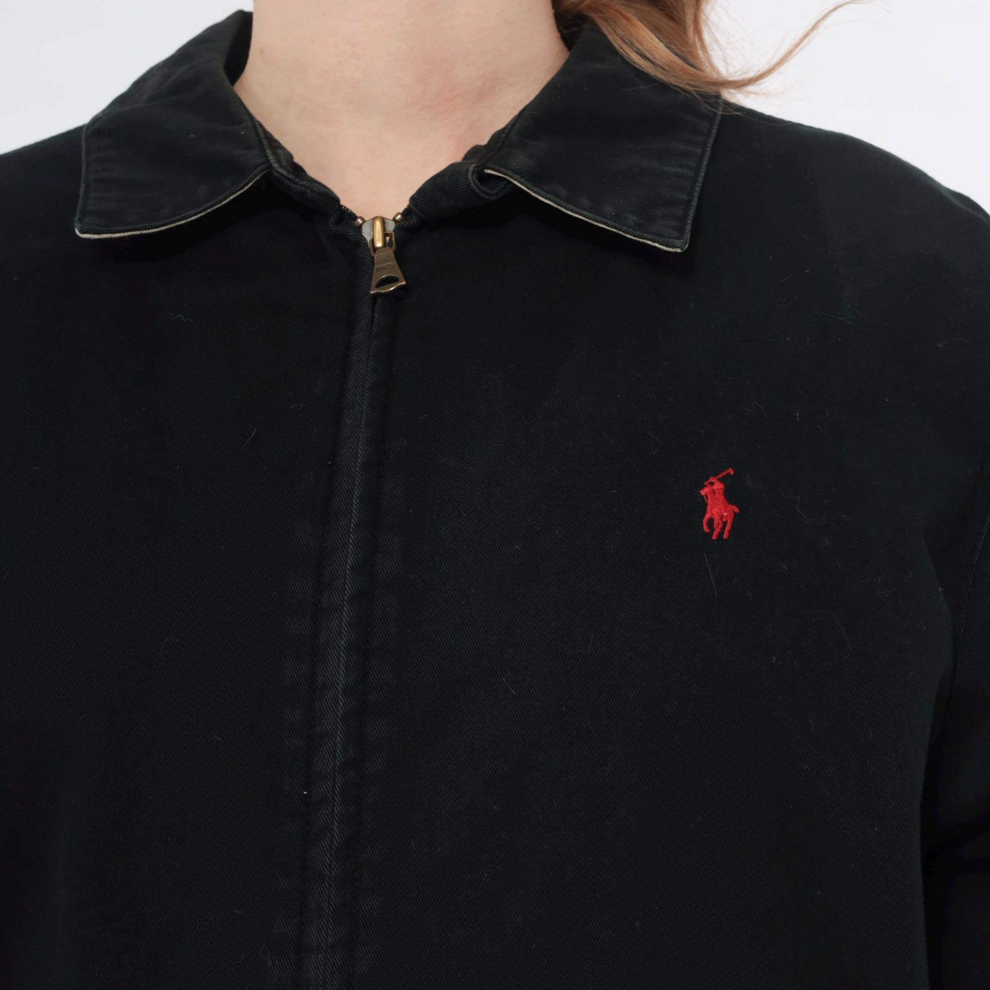 90s black cotton jacket from Polo by Ralph Lauren with full front zipper closure and polo collar. Red embroidered polo player logo on left chest, long sleeves with ribbed cuffs, elastic hem at waist.