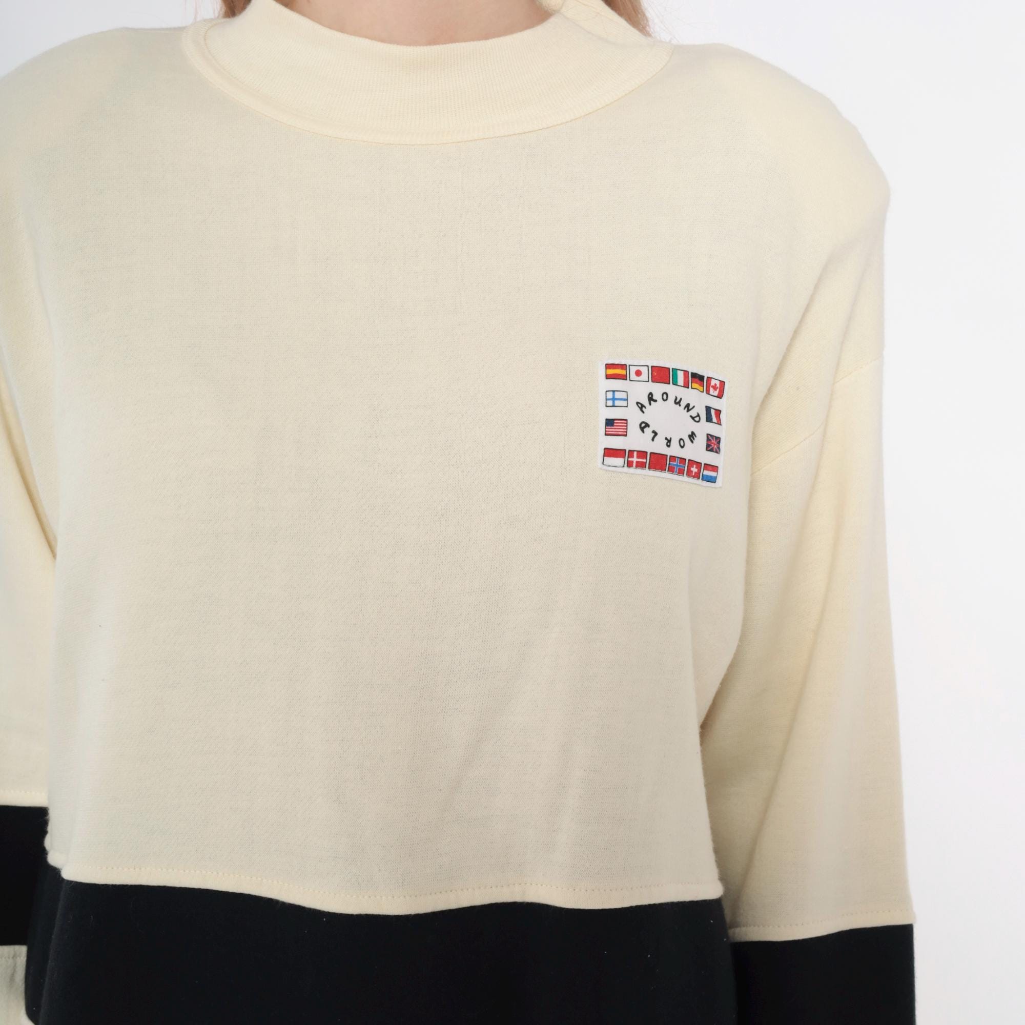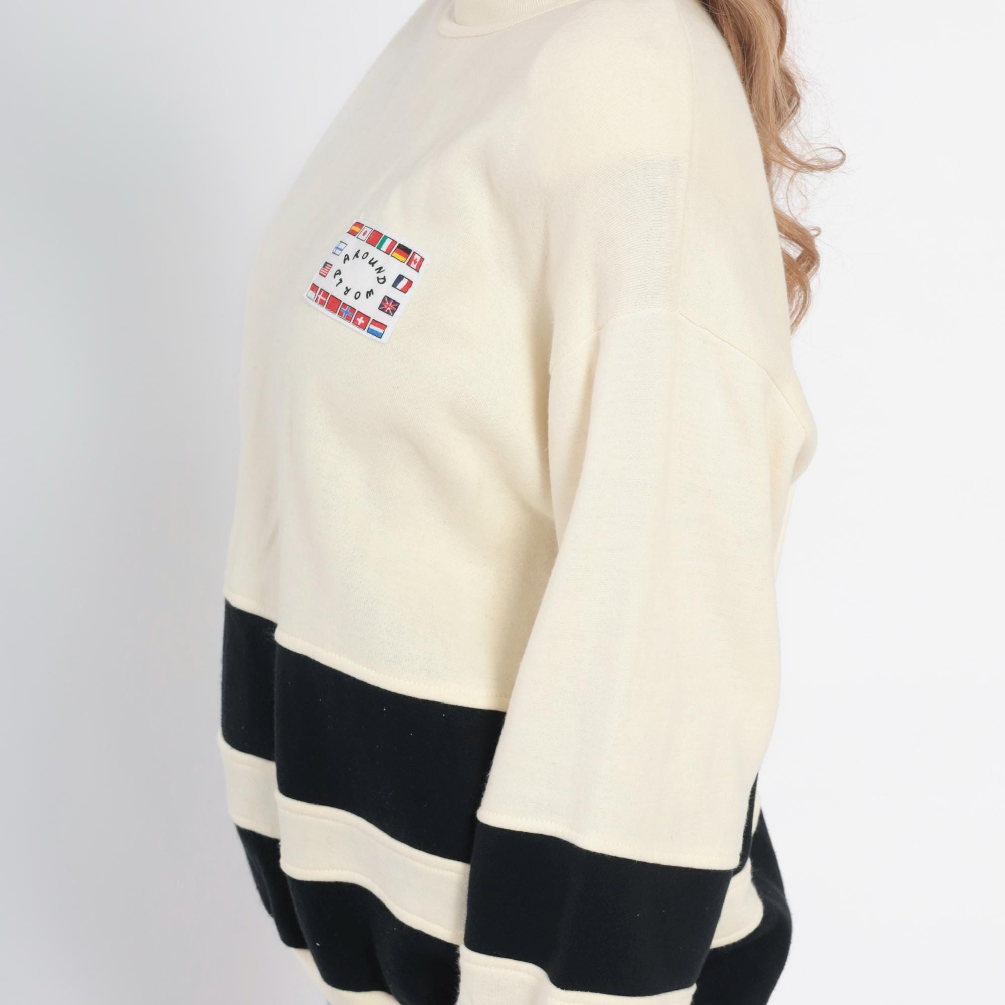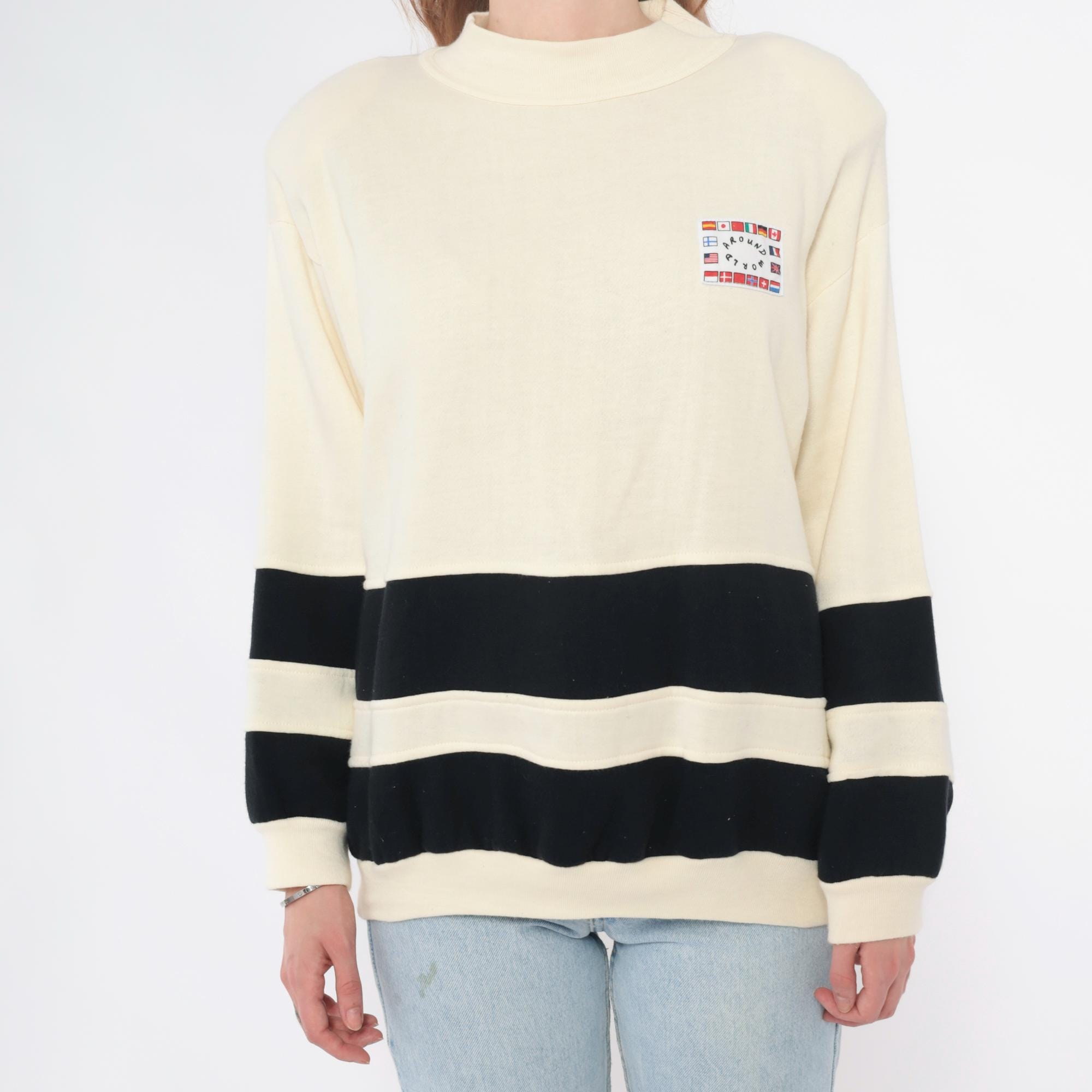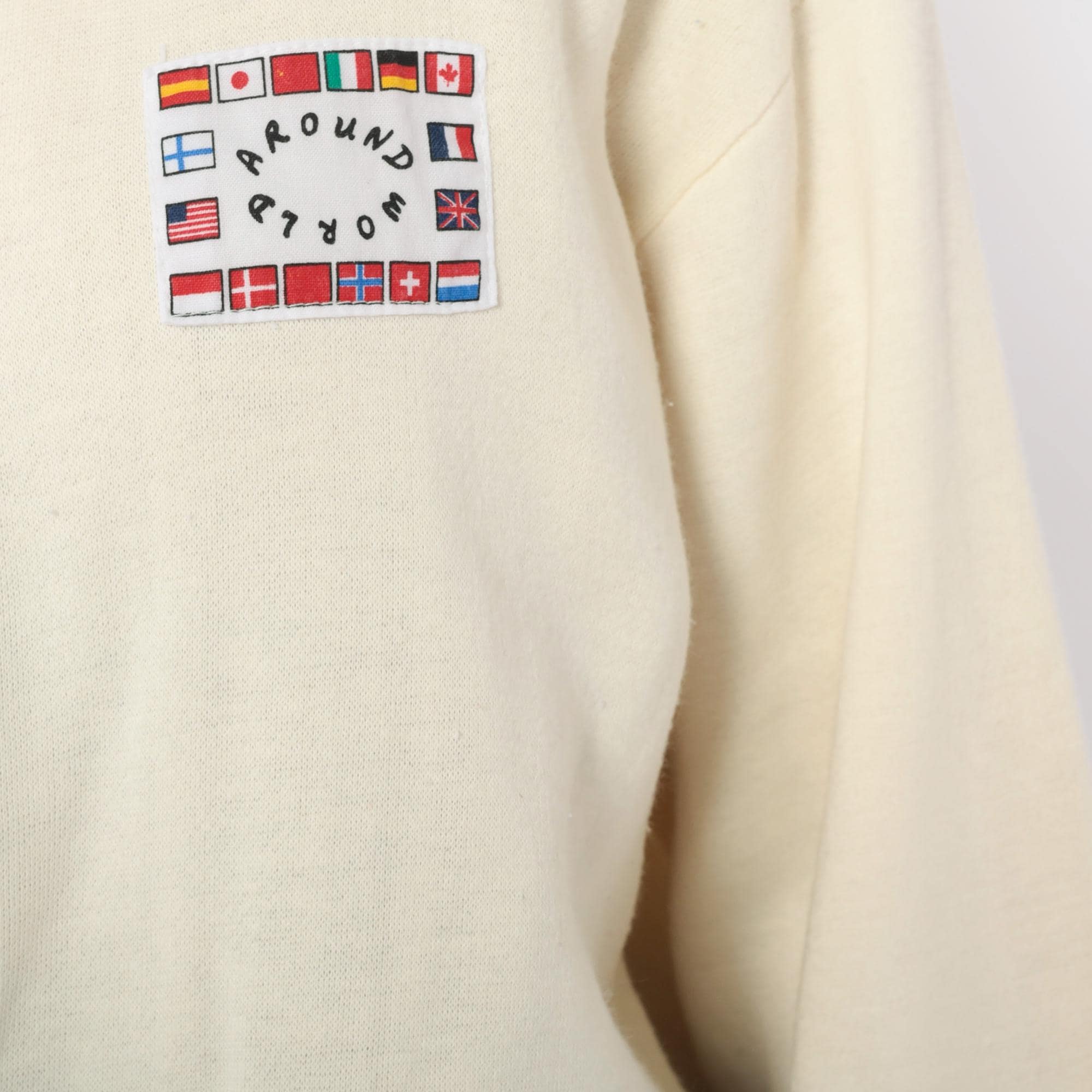 90s cream sweater from wye oaks with chest patch featuring international flags surrounding "AROUND THE WORLD" text. Long sleeves with ribbed cuffs, crew neckline, ribbed hem. Two black horizontal stripes at bottom portion of body.