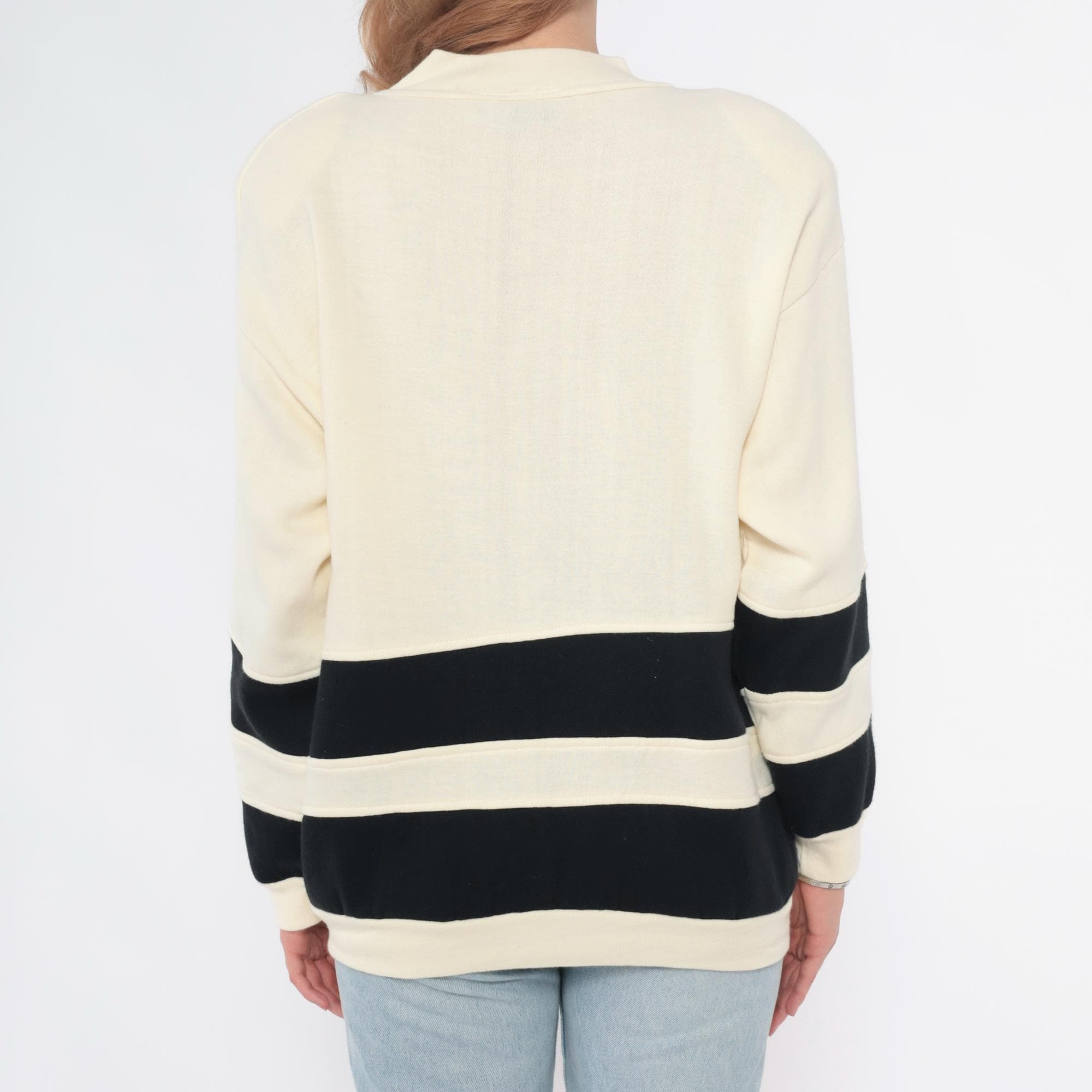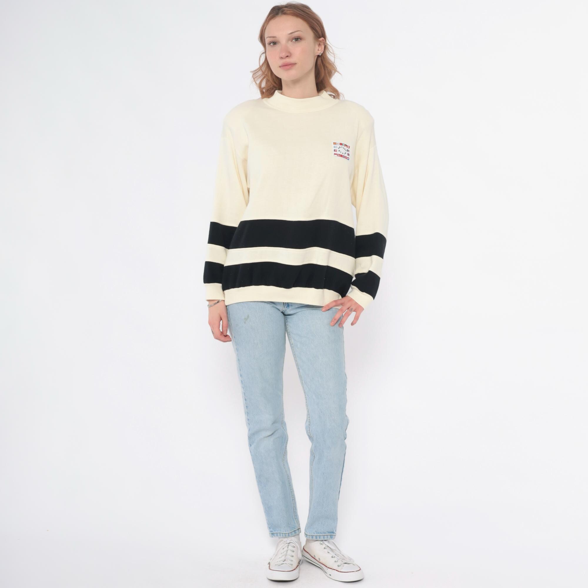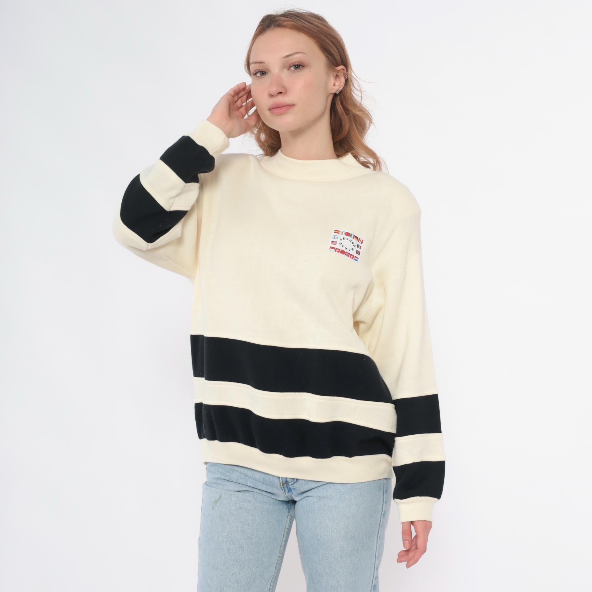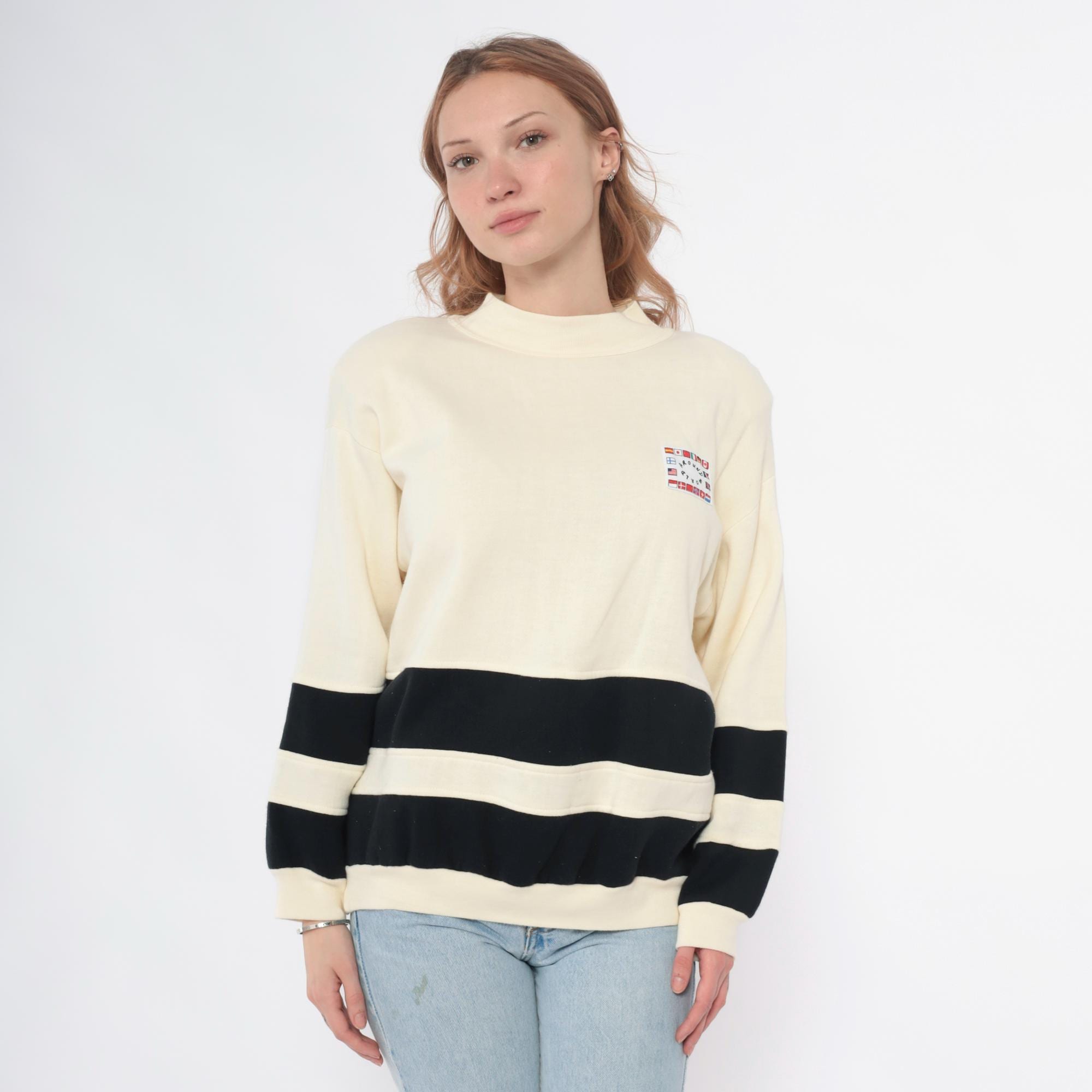 90s cream sweater from wye oaks with chest patch featuring international flags surrounding "AROUND THE WORLD" text. Long sleeves with ribbed cuffs, crew neckline, ribbed hem. Two black horizontal stripes at bottom portion of body.