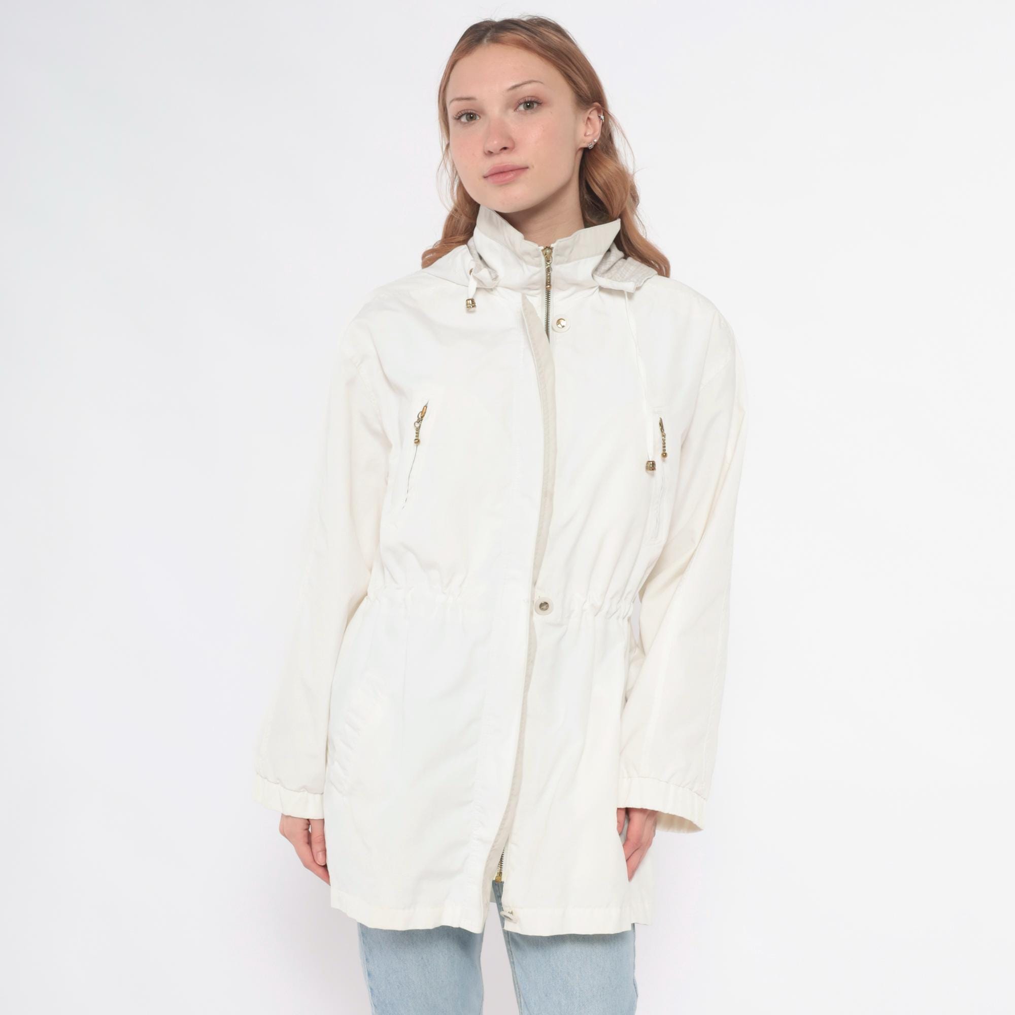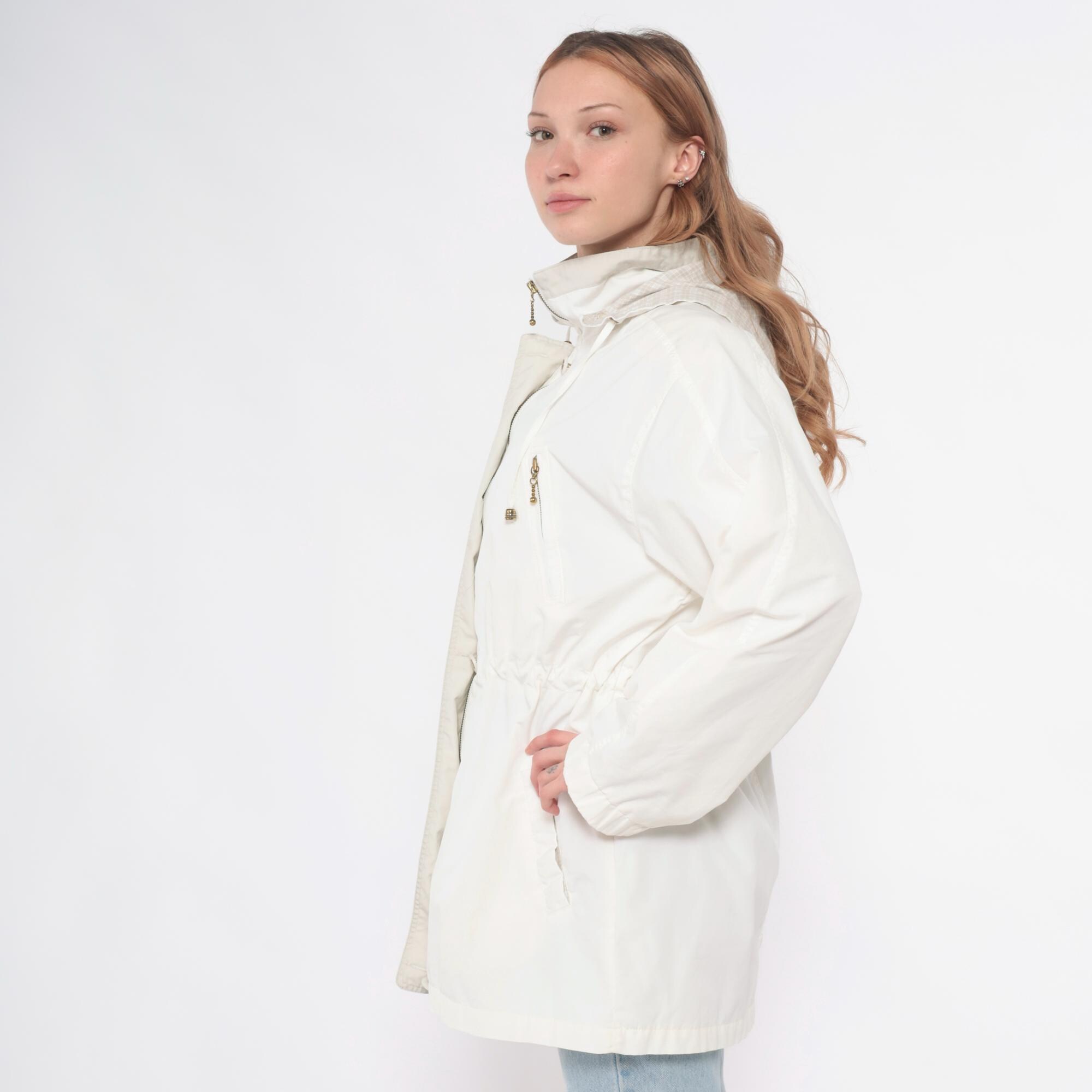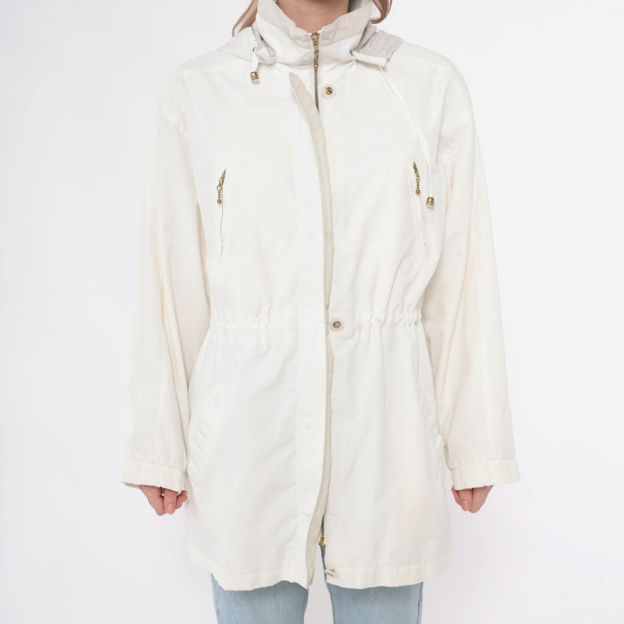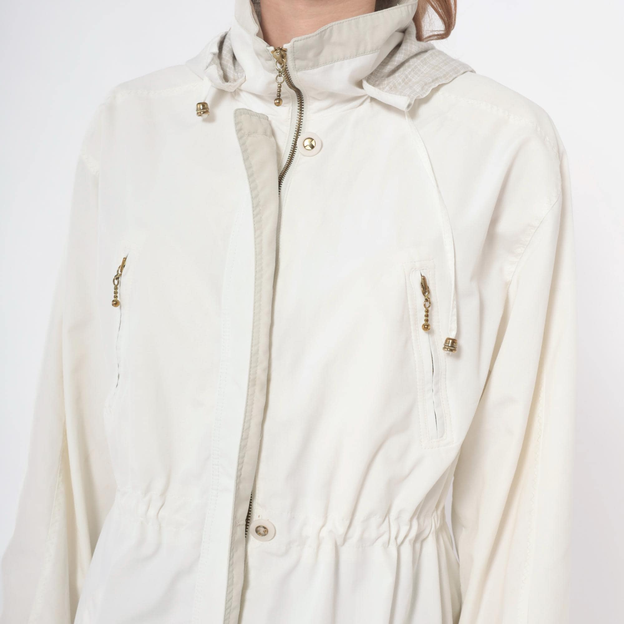 90s cream windbreaker jacket from cs essentials with drawstring hood, full-length front zipper, and snap button placket. Zippered chest pockets with gold-toned hardware, long sleeves, elastic cinched waist.