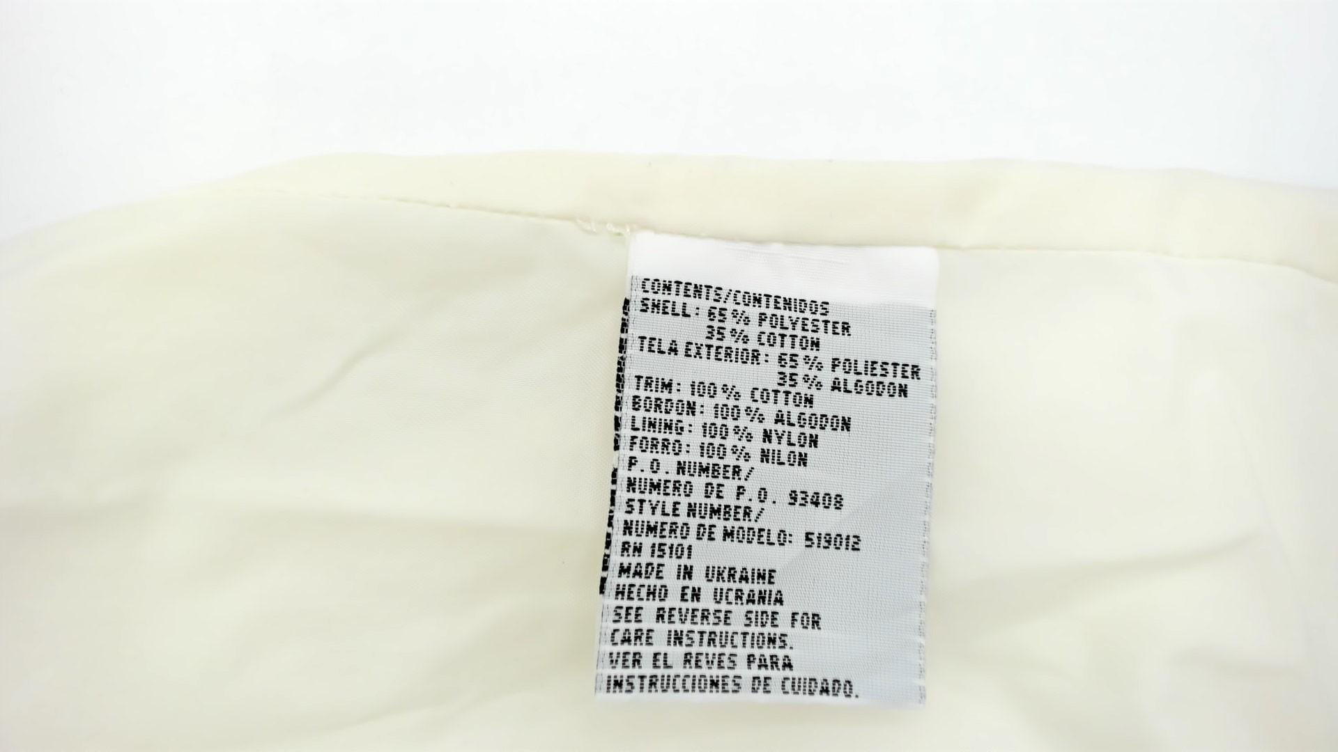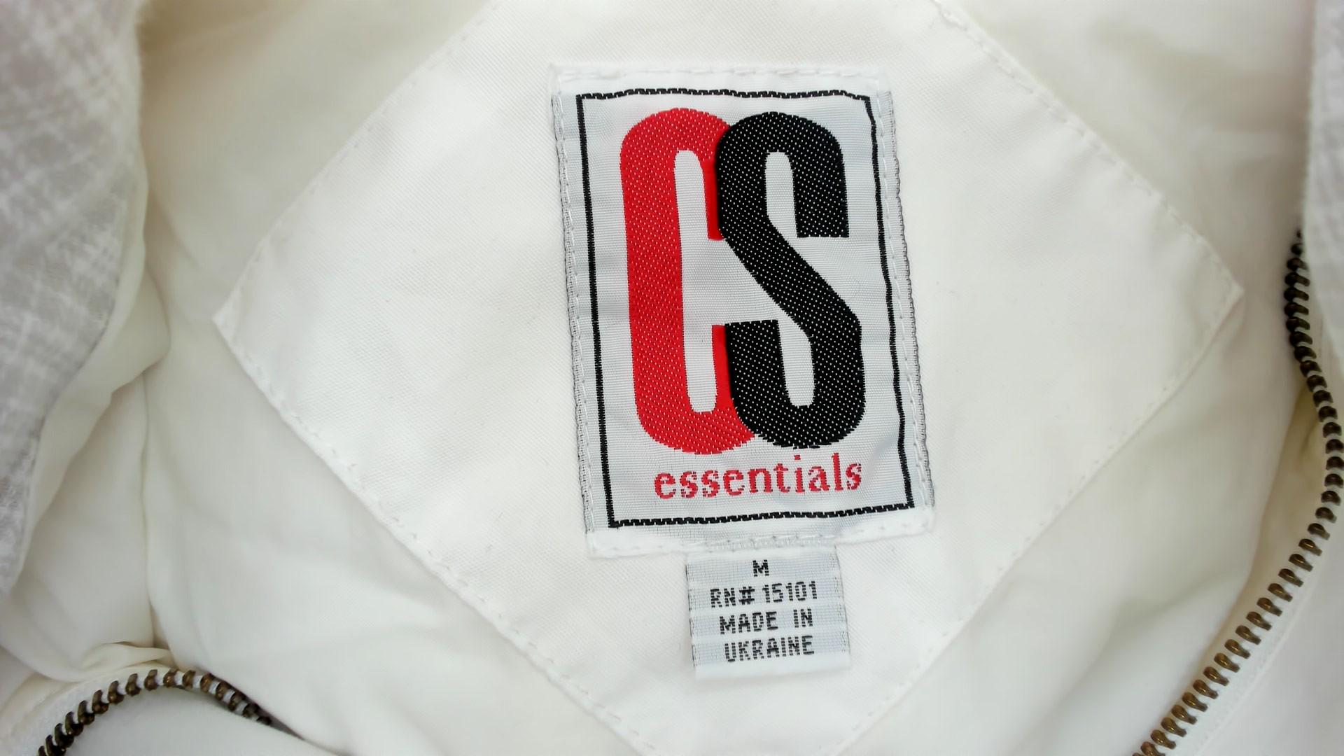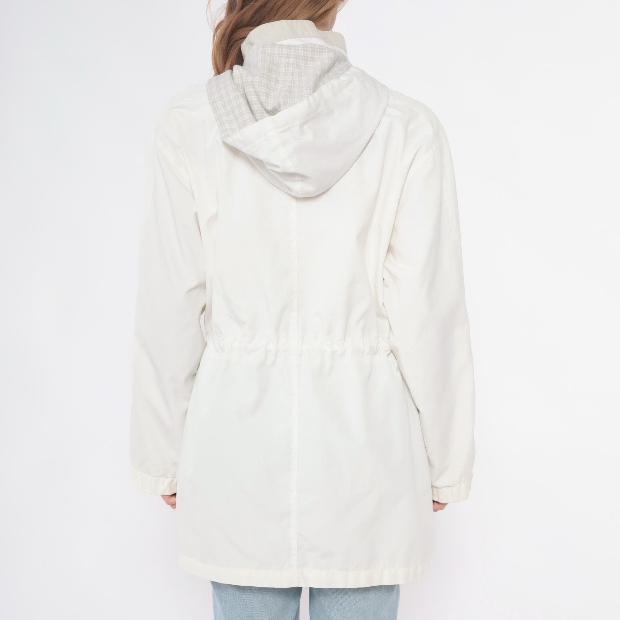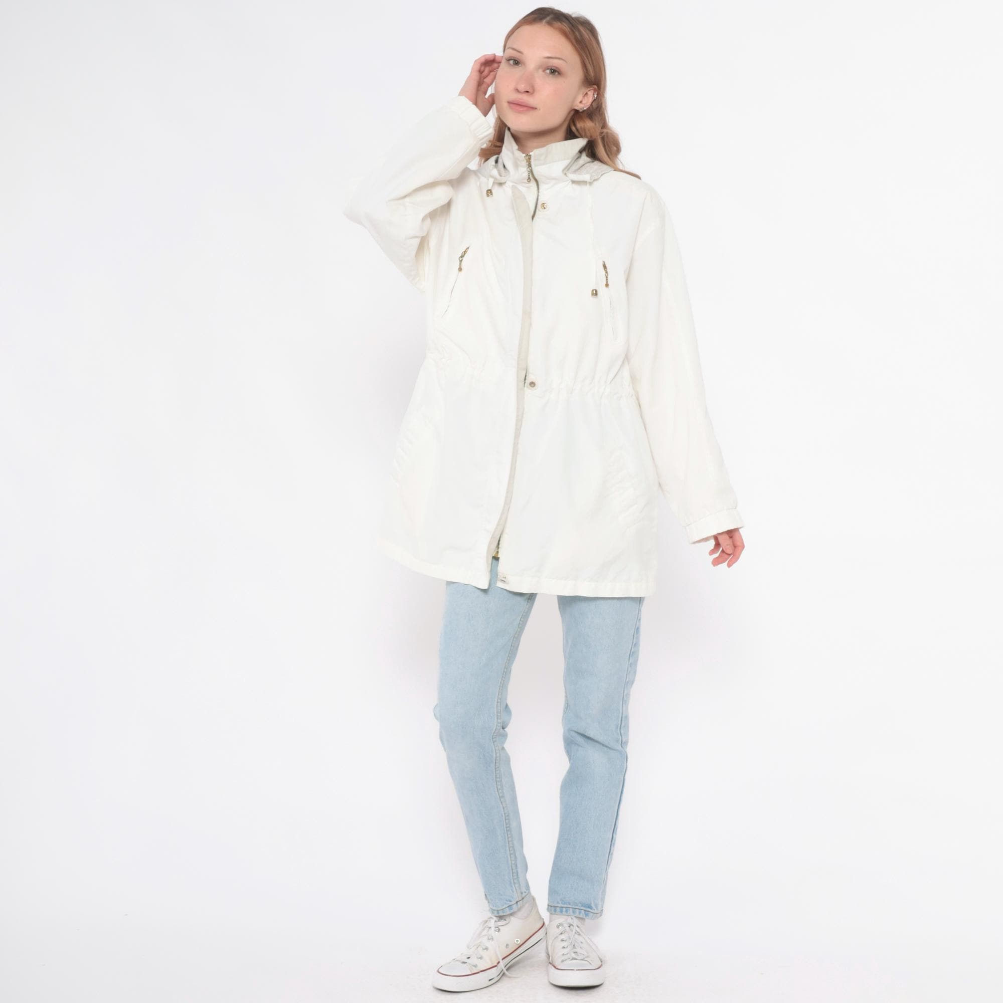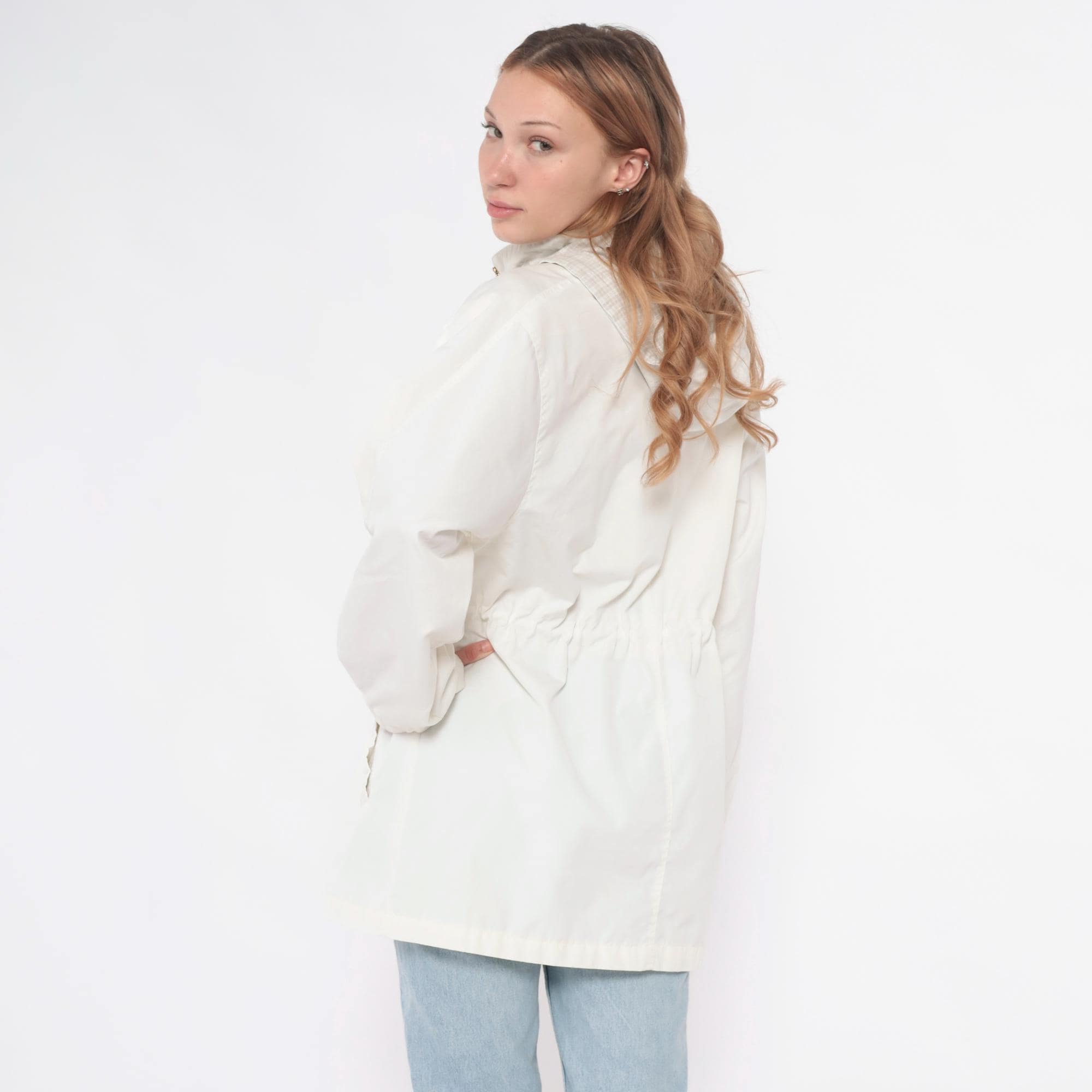 90s cream windbreaker jacket from cs essentials with drawstring hood, full-length front zipper, and snap button placket. Zippered chest pockets with gold-toned hardware, long sleeves, elastic cinched waist.