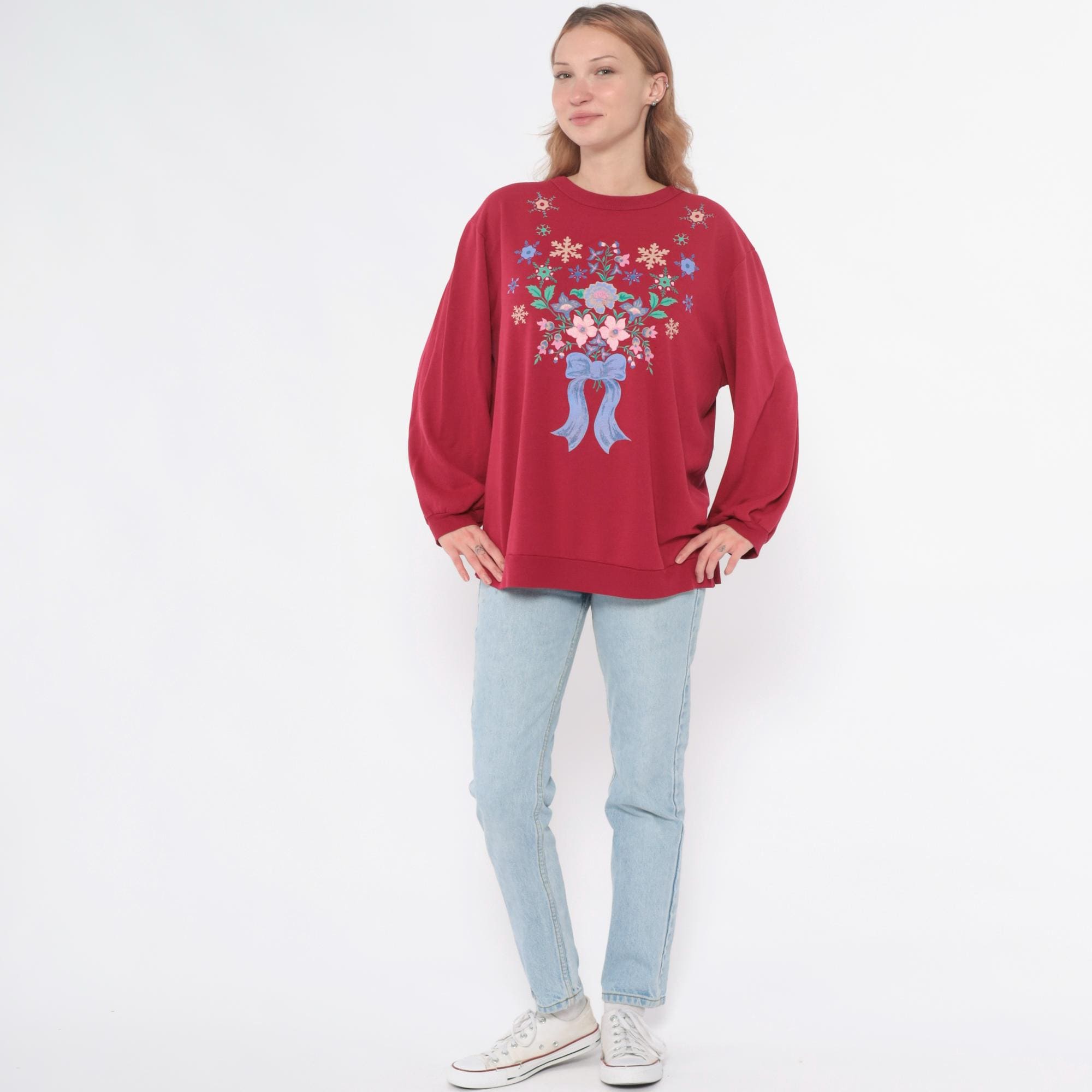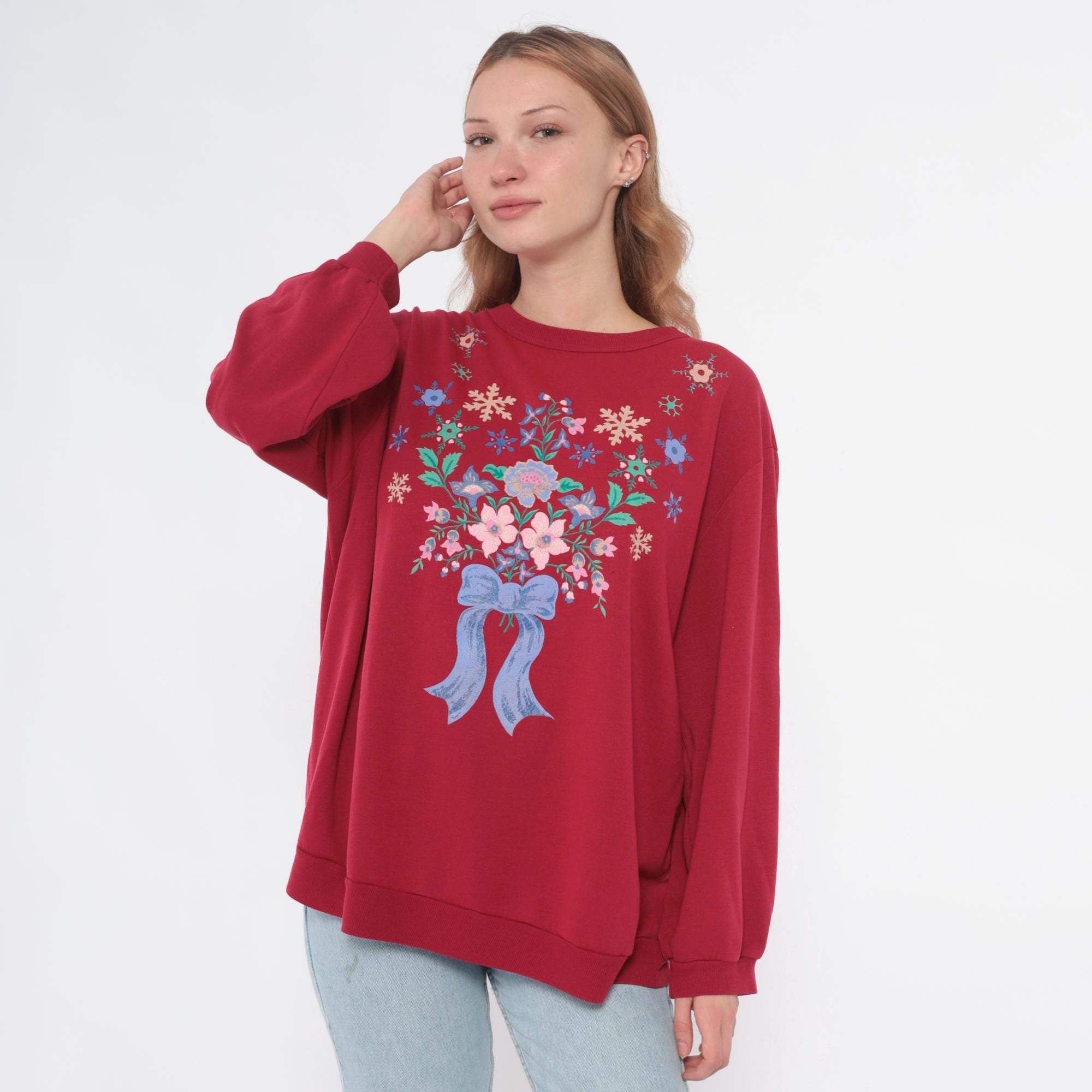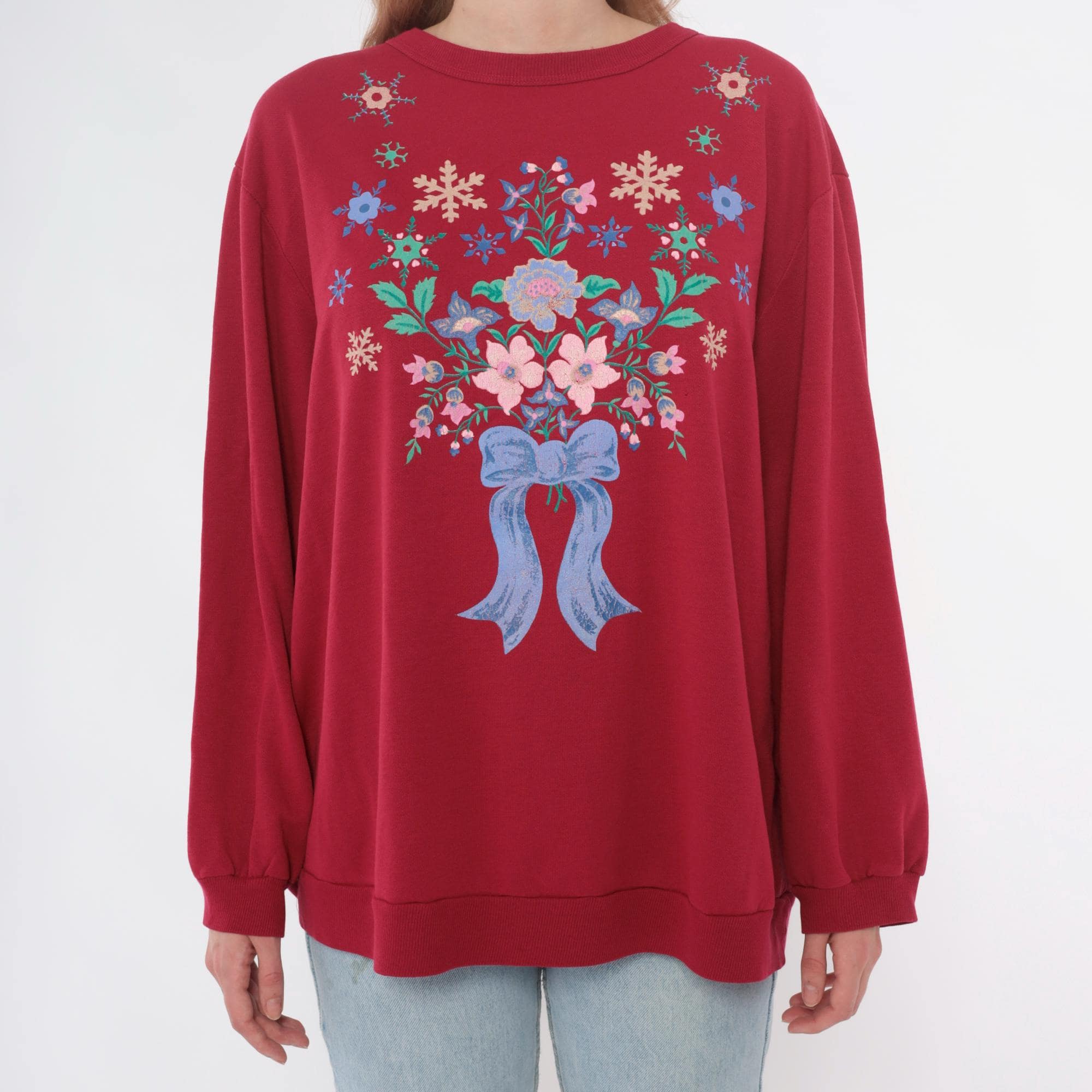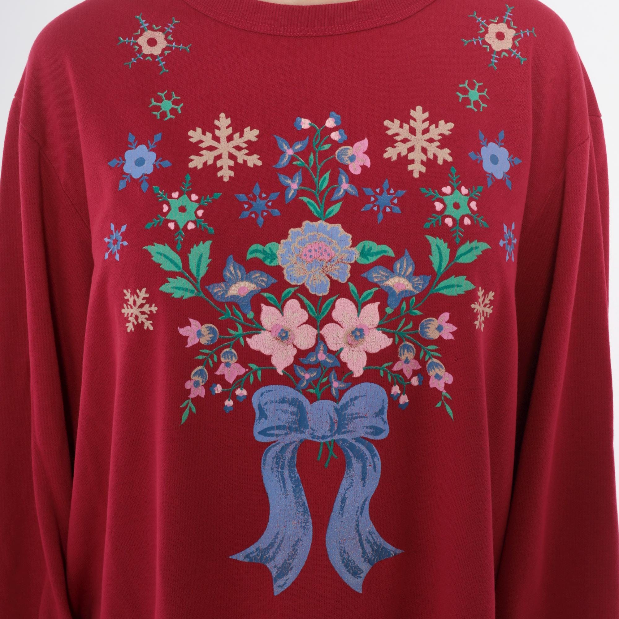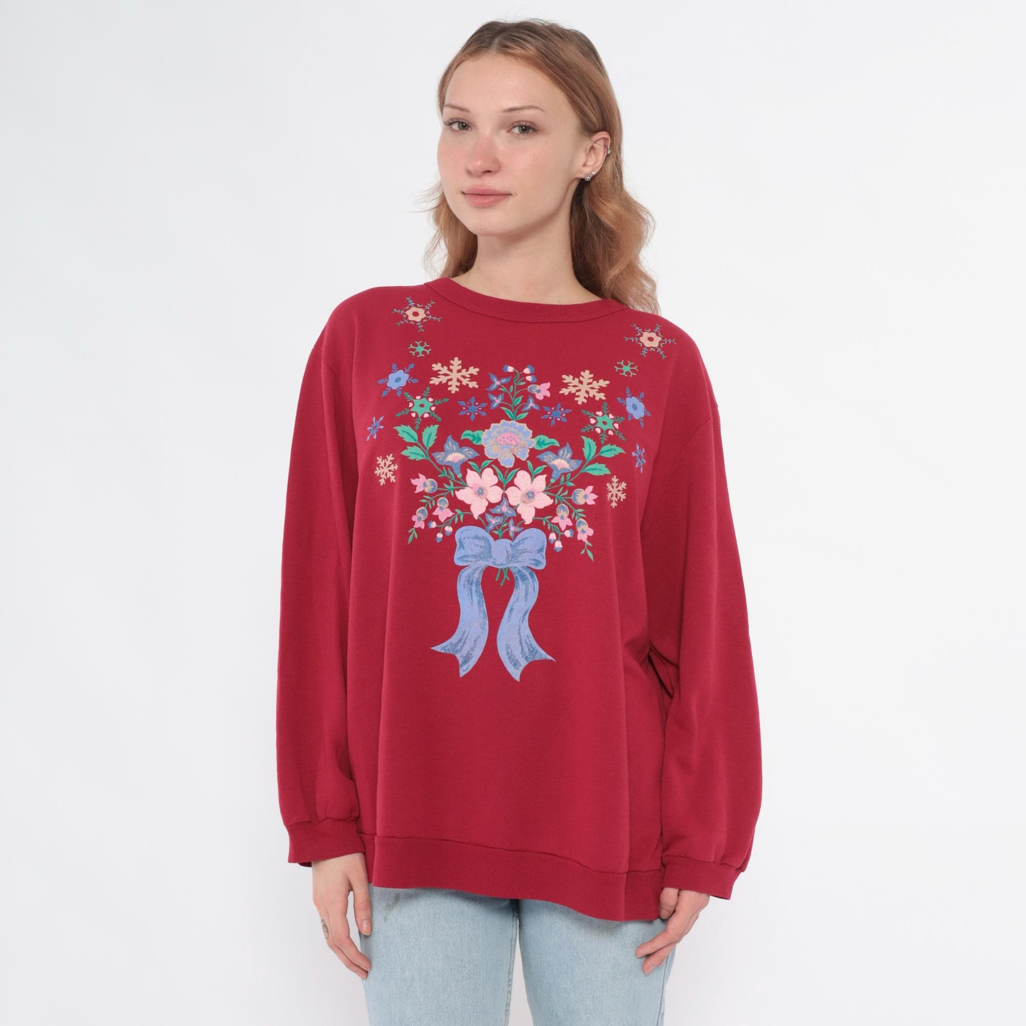 90s hot pink sweatshirt with embroidered floral and snowflake design across the back. Pink, blue, and cream flowers arranged in bouquet with blue ribbon bow detail, surrounded by colorful snowflakes in cream, blue, and green. Crew neck, long sleeves with ribbed cuffs and hem.