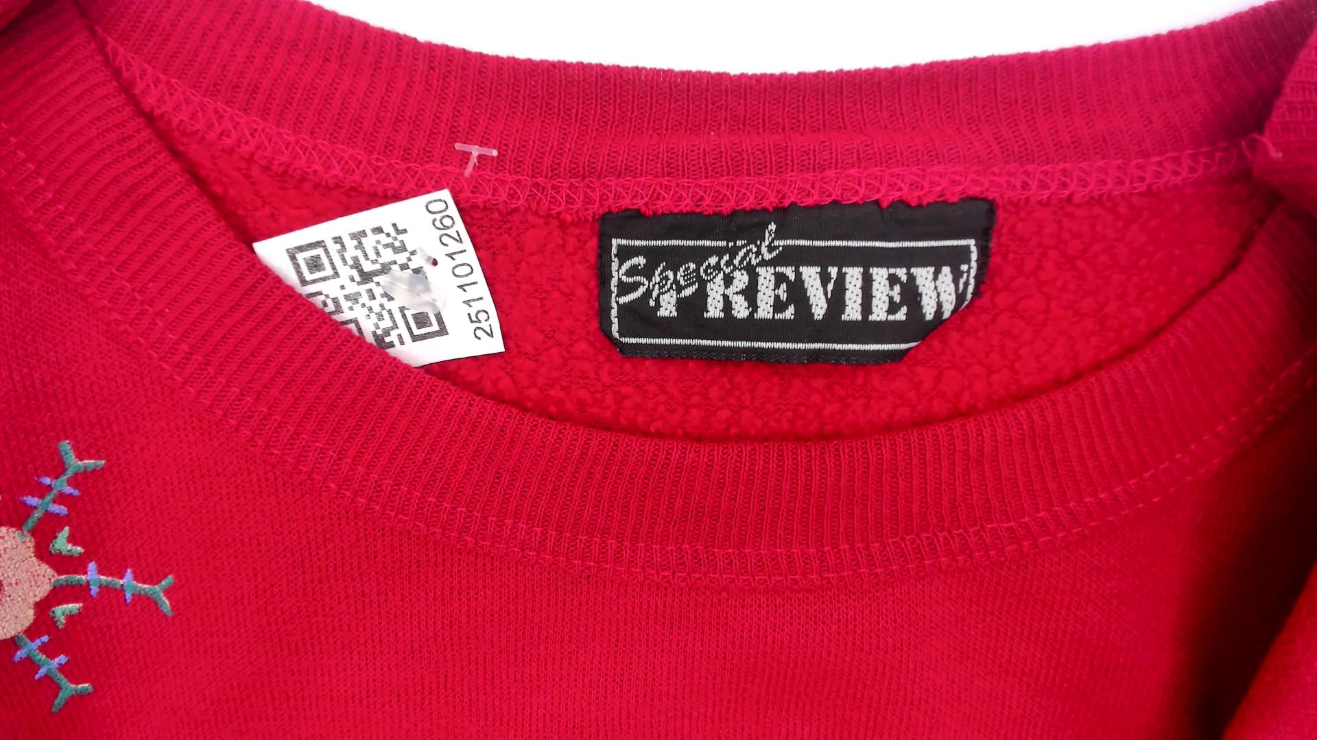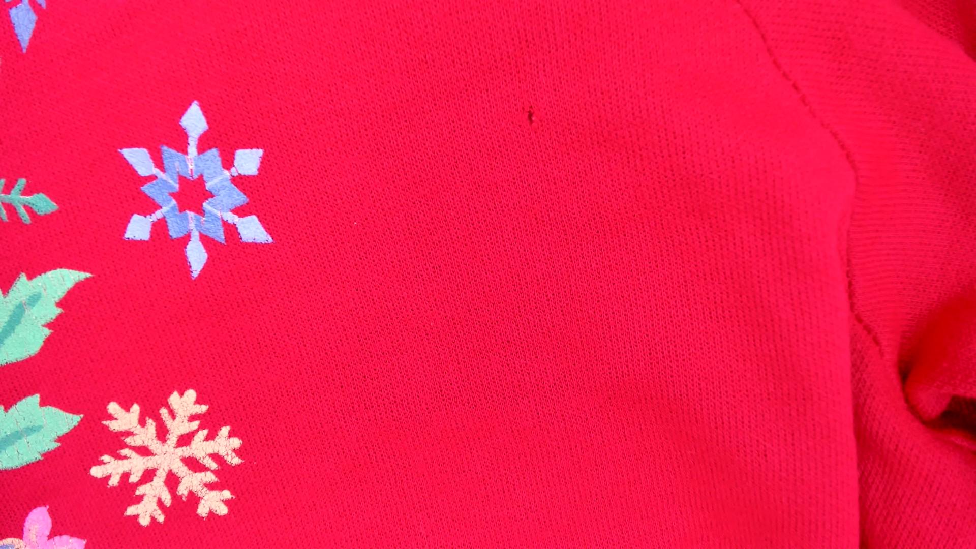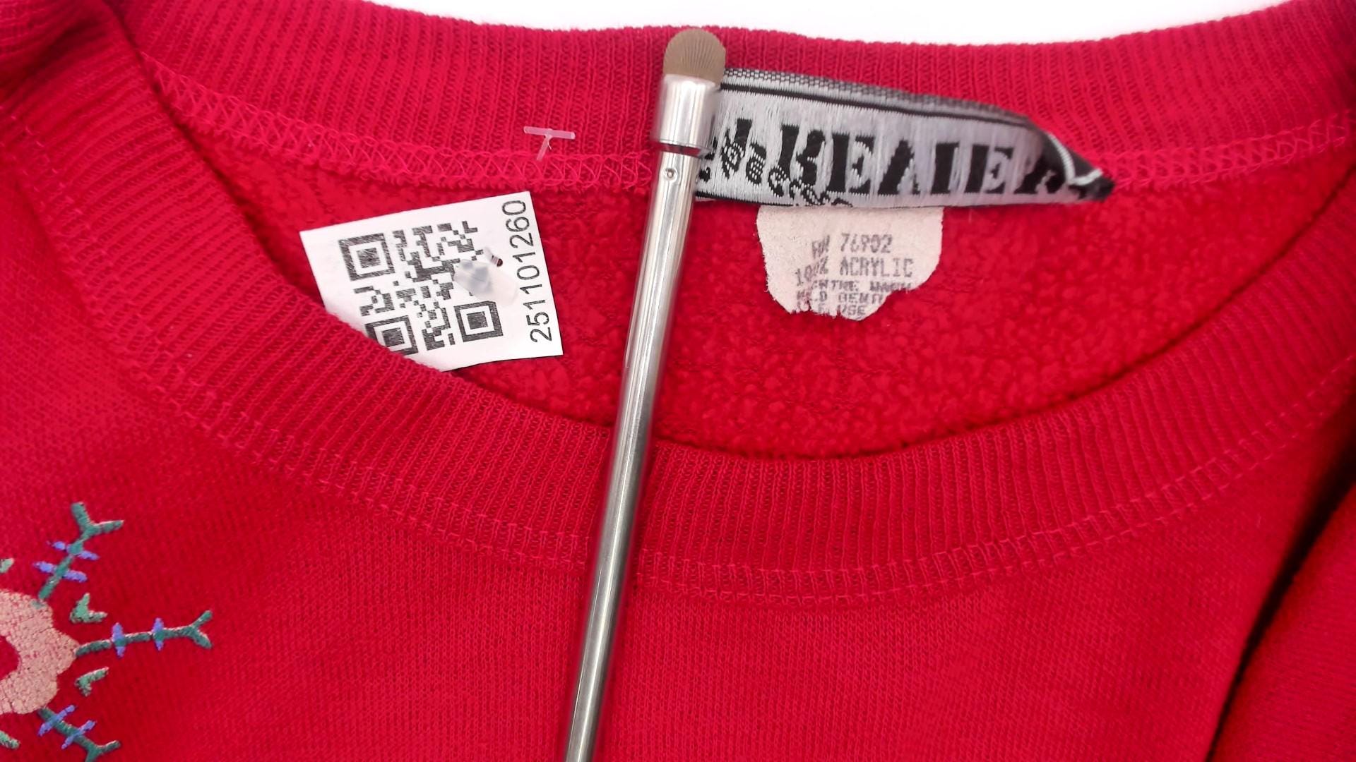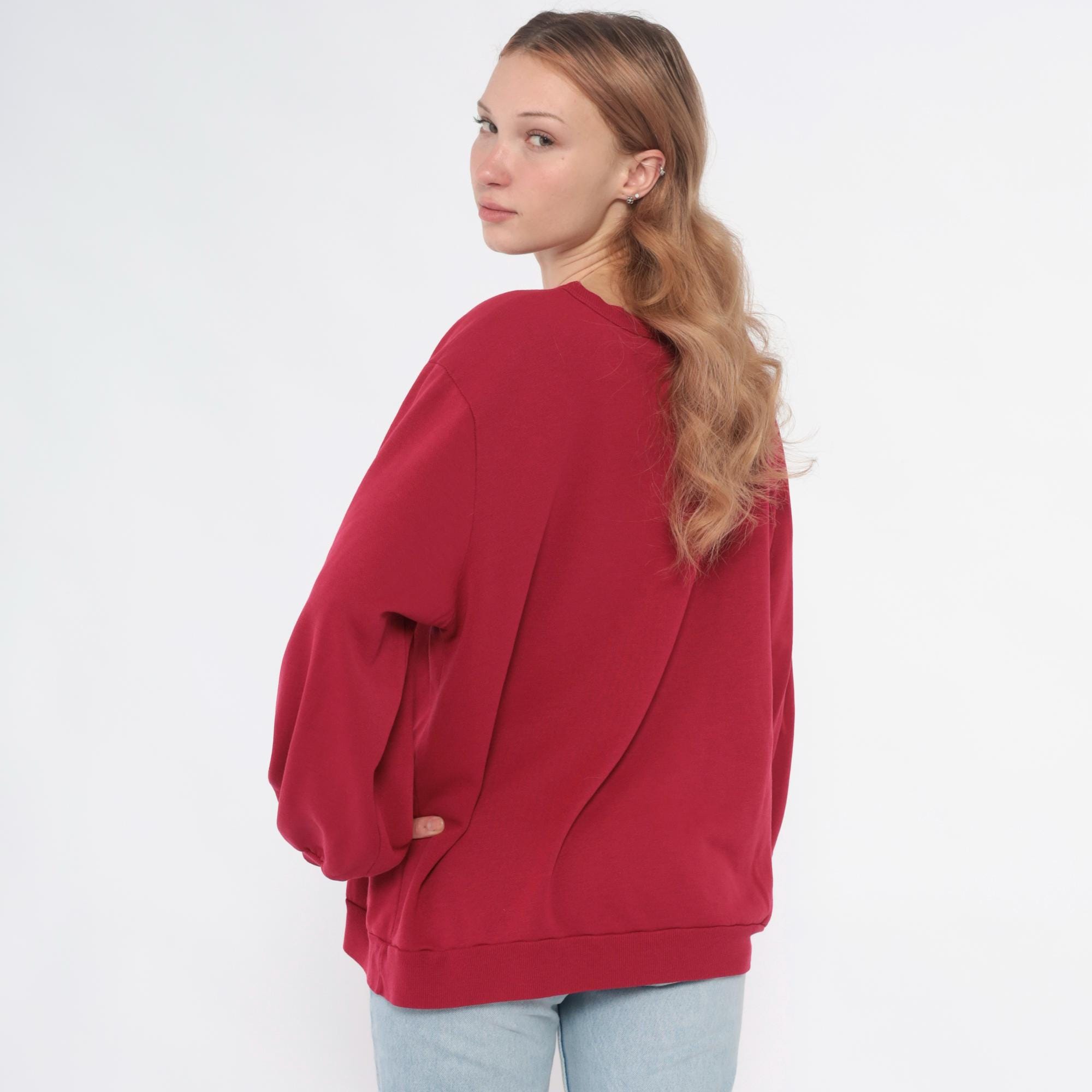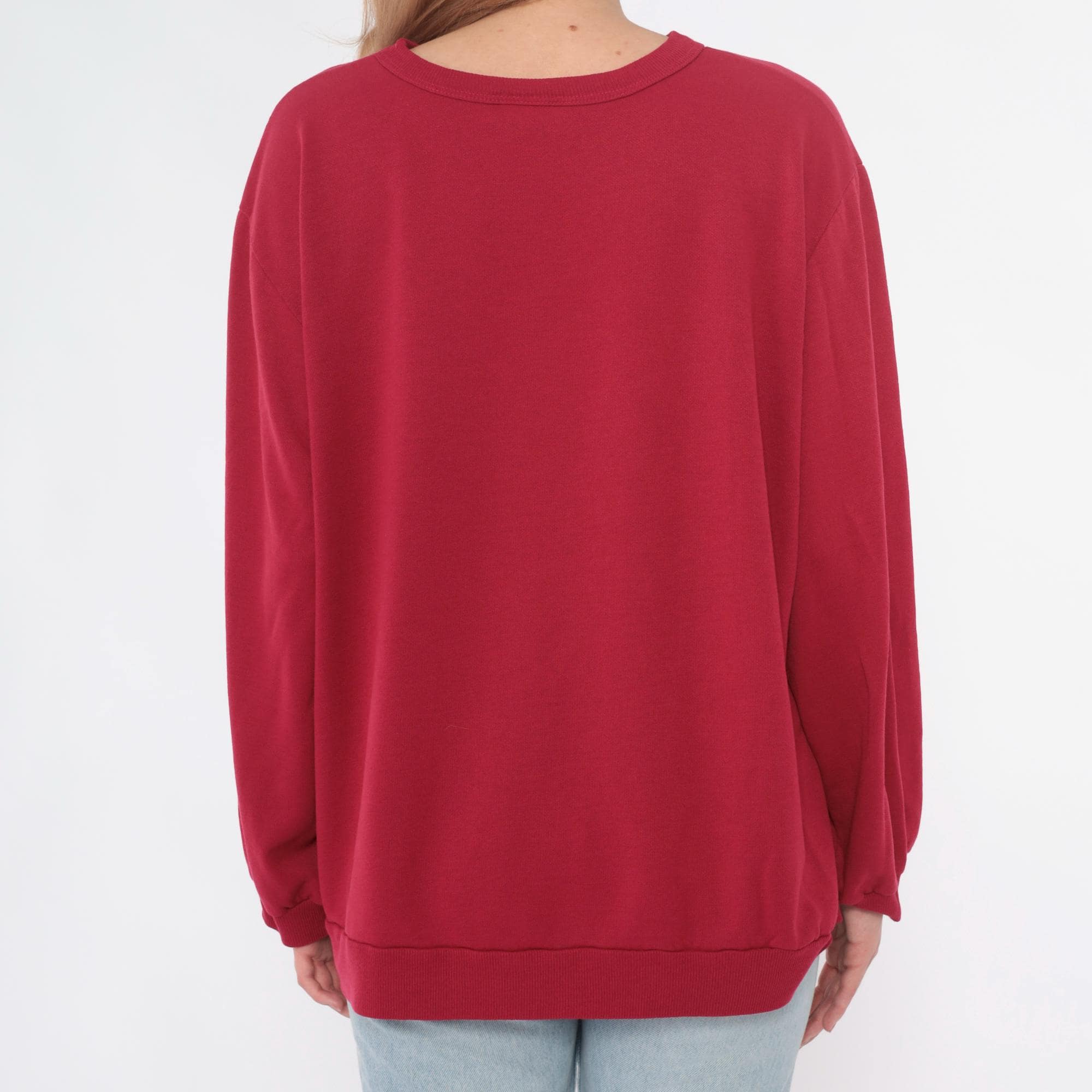 90s hot pink sweatshirt with embroidered floral and snowflake design across the back. Pink, blue, and cream flowers arranged in bouquet with blue ribbon bow detail, surrounded by colorful snowflakes in cream, blue, and green. Crew neck, long sleeves with ribbed cuffs and hem.