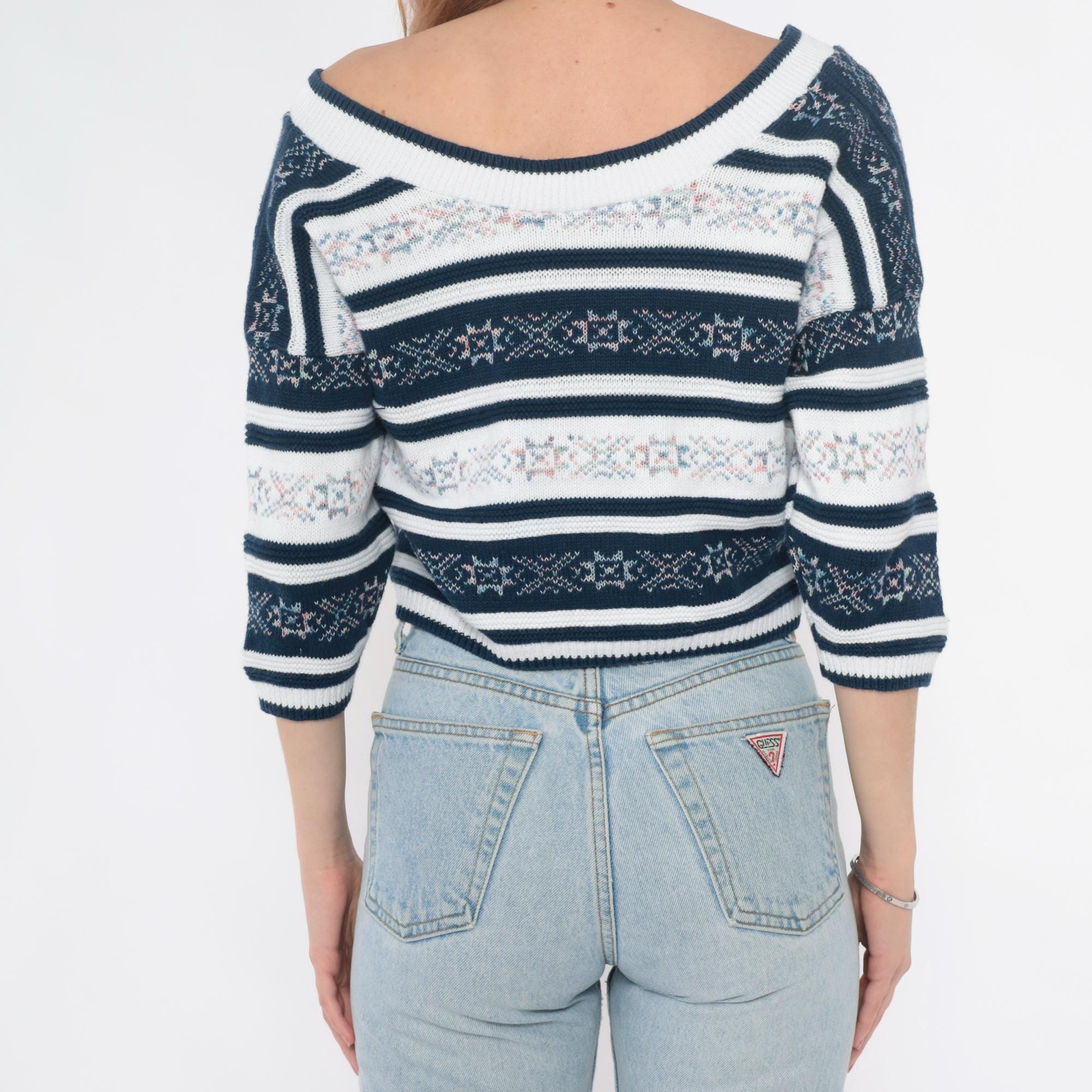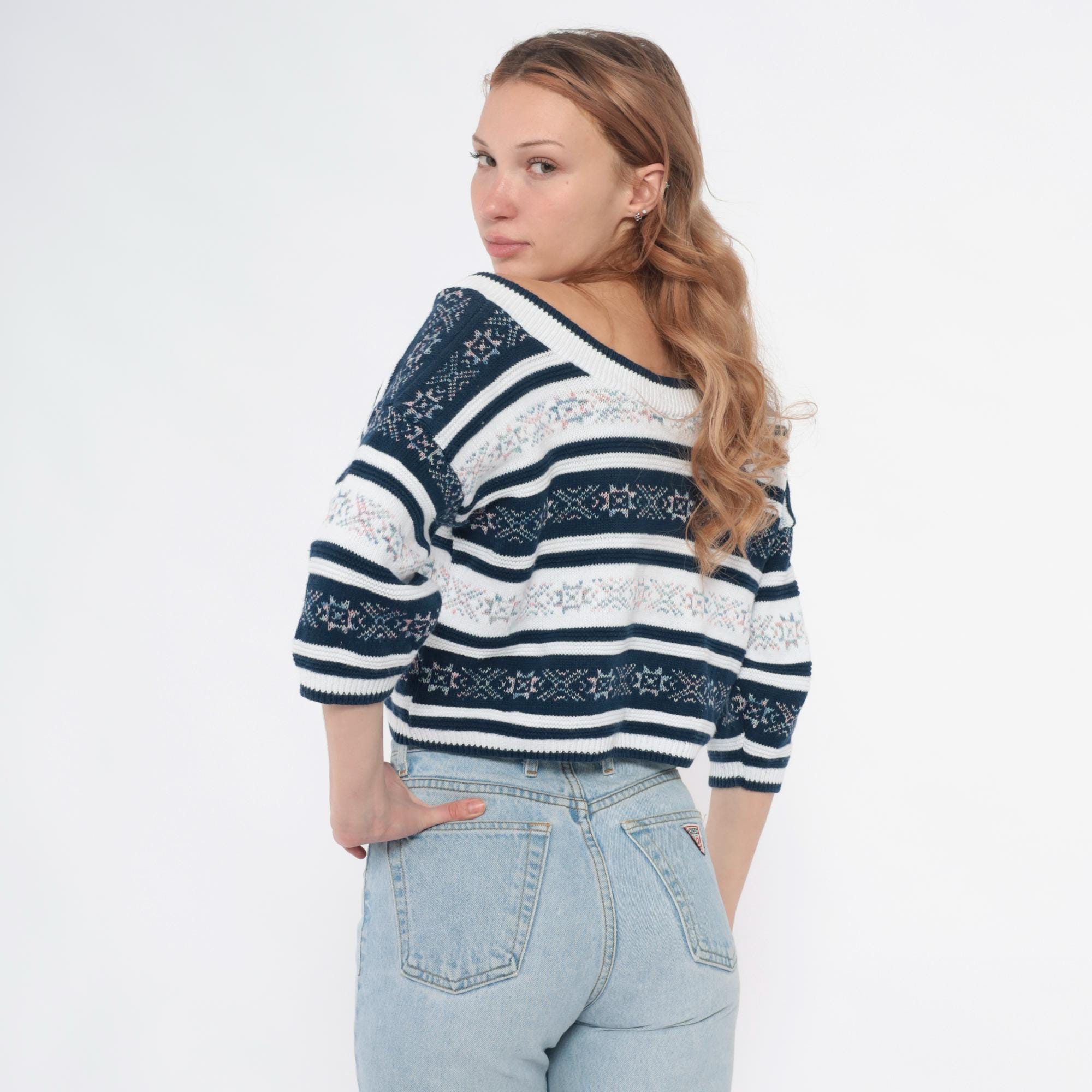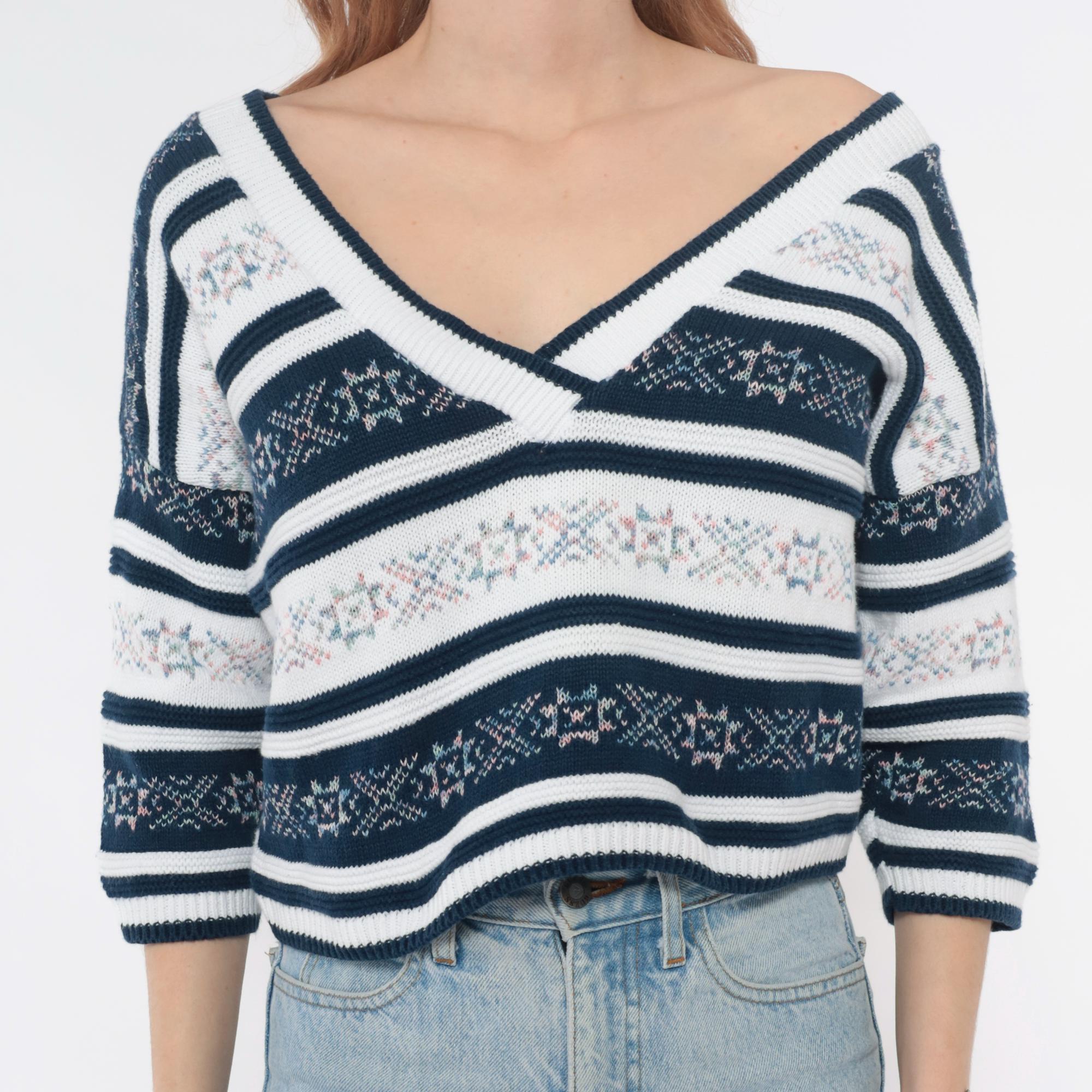 90s navy blue and white striped knit top with floral jacquard pattern bands throughout. V-neck front and back, 3/4 length sleeves. Small floral motifs in pink, blue, and green woven into the striped design.