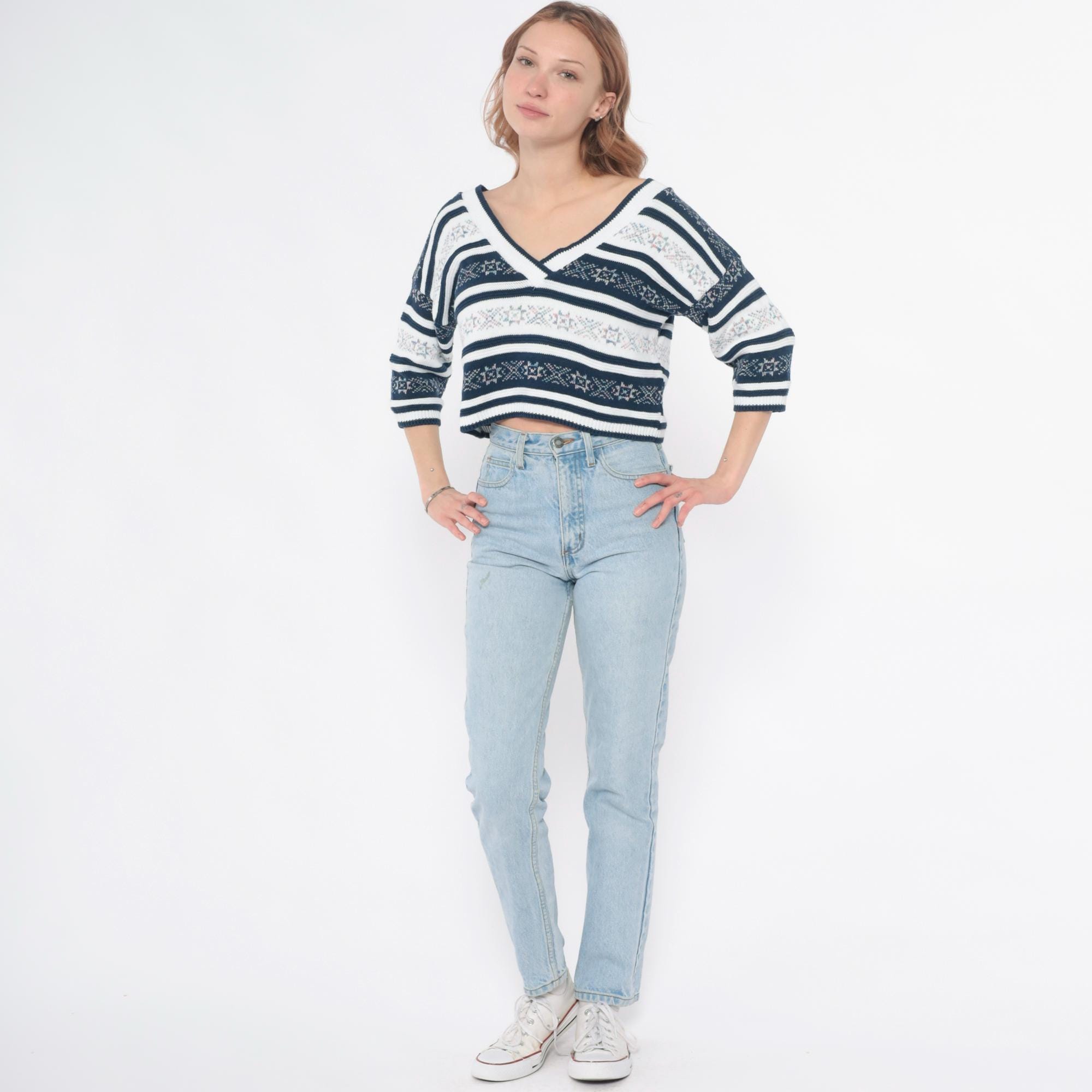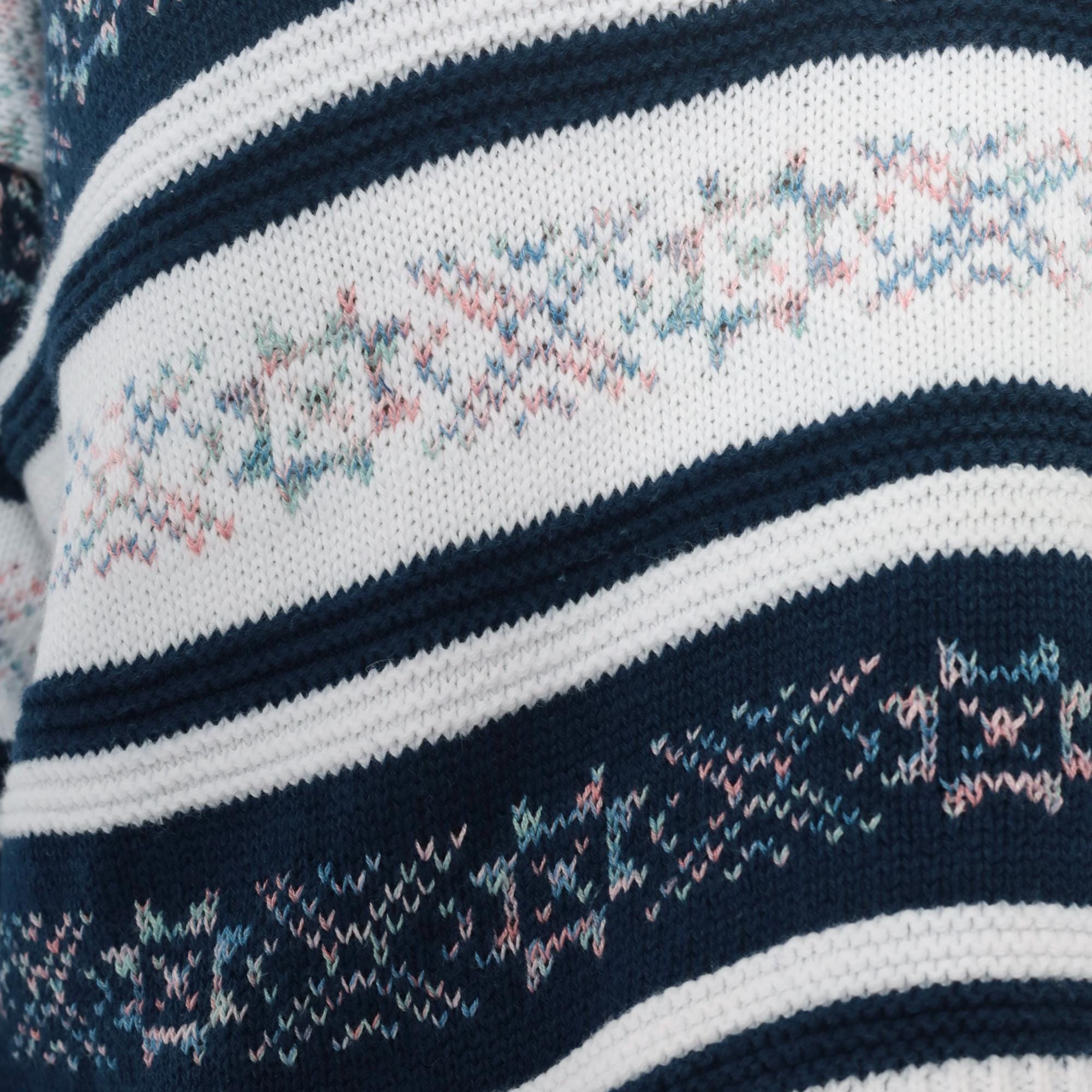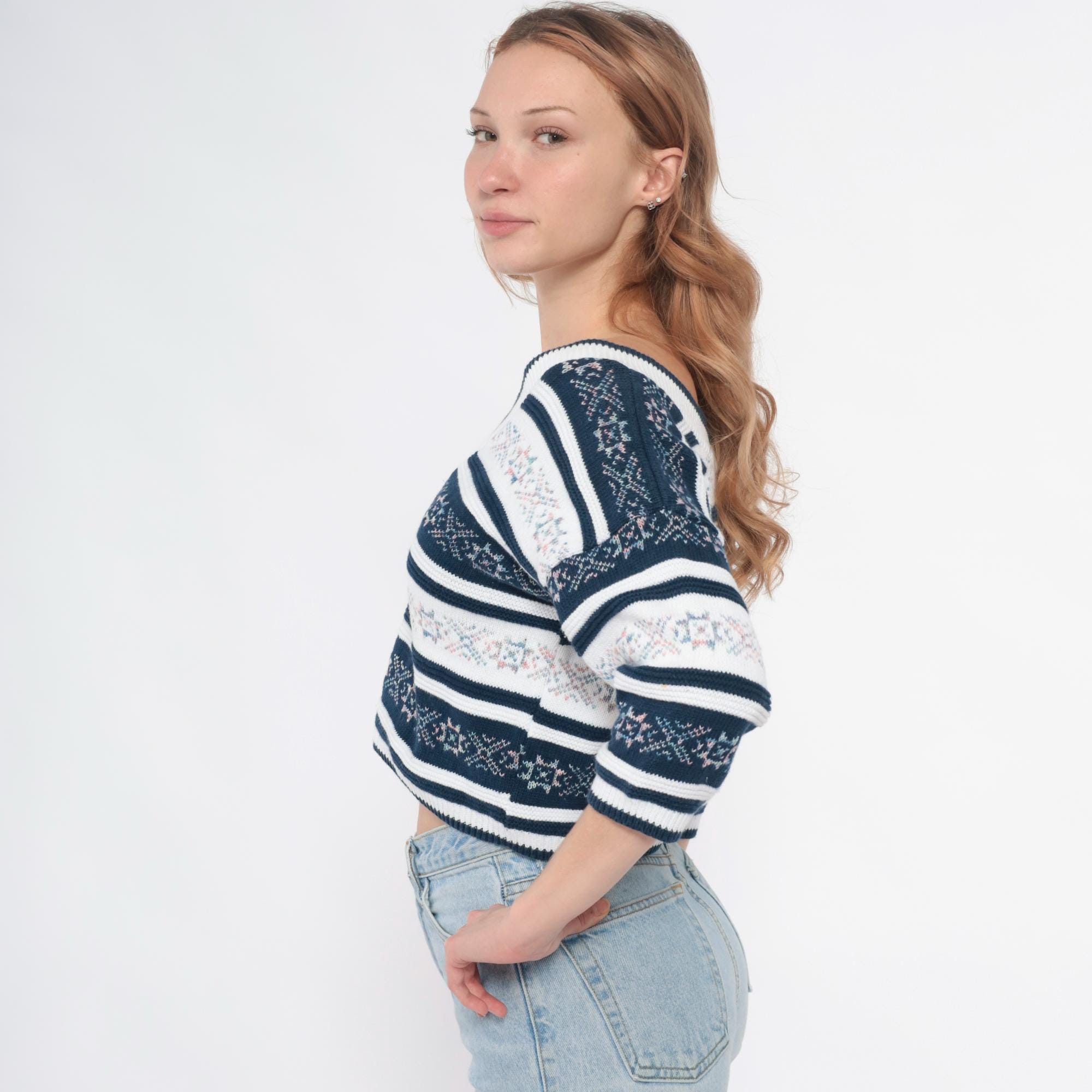 90s navy blue and white striped knit top with floral jacquard pattern bands throughout. V-neck front and back, 3/4 length sleeves. Small floral motifs in pink, blue, and green woven into the striped design.