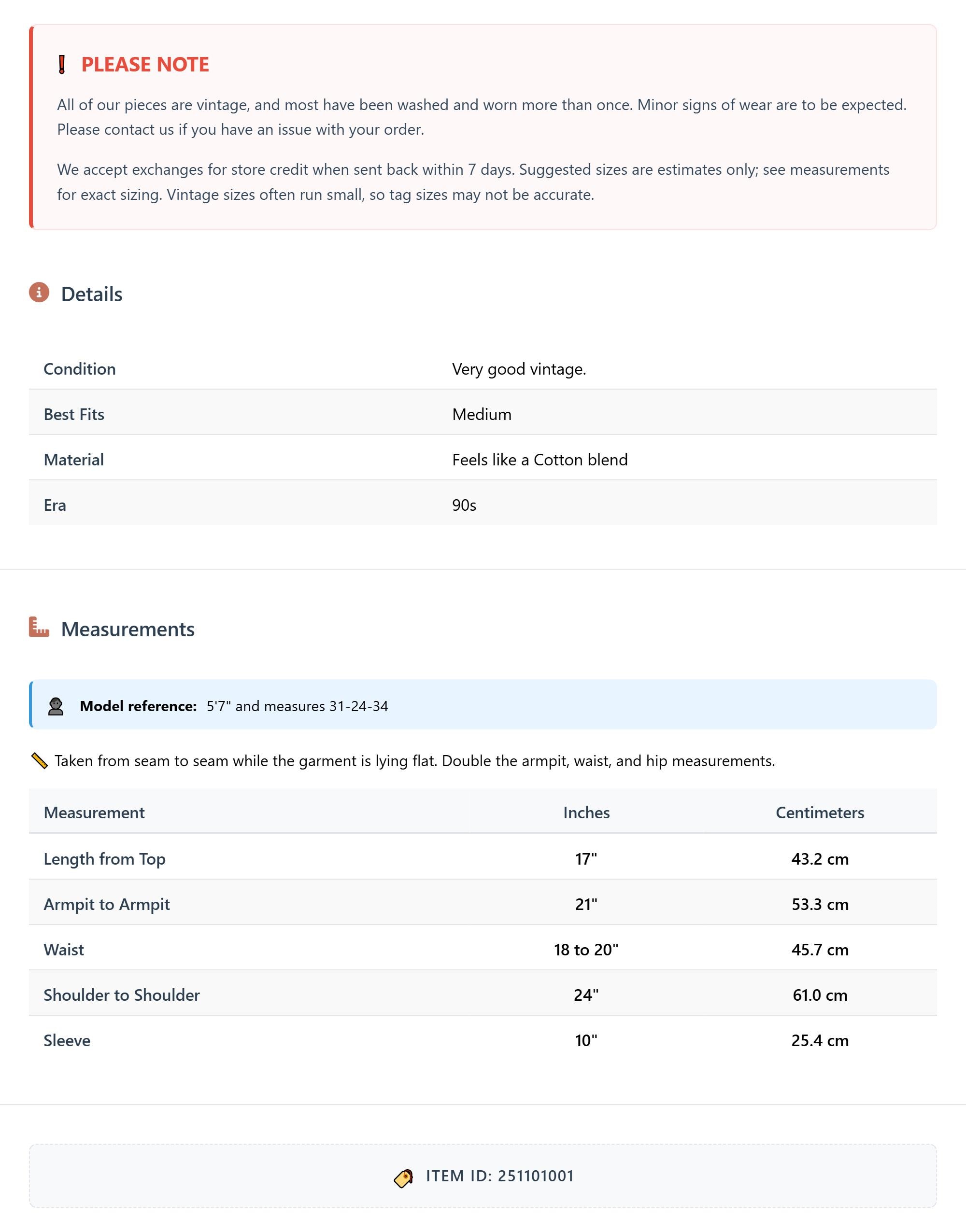 All of our pieces are vintage, and most have been washed and worn more than once. Minor signs of wear are to be expected. Please contact us if you have an issue with your order. We accept exchanges for store credit when sent back within 7 days.