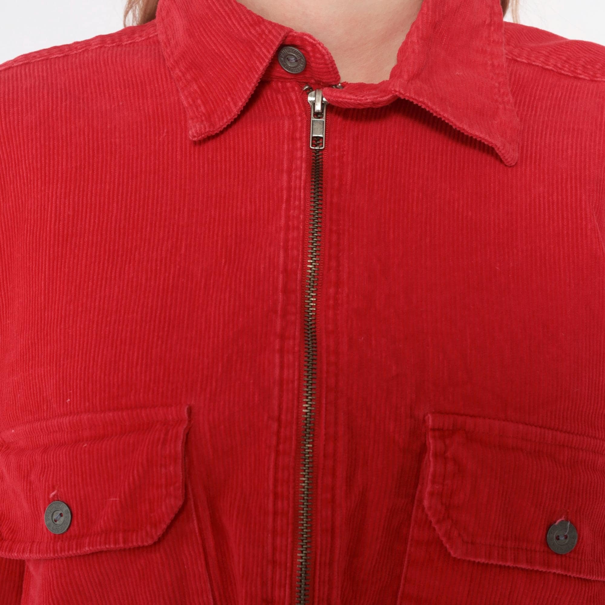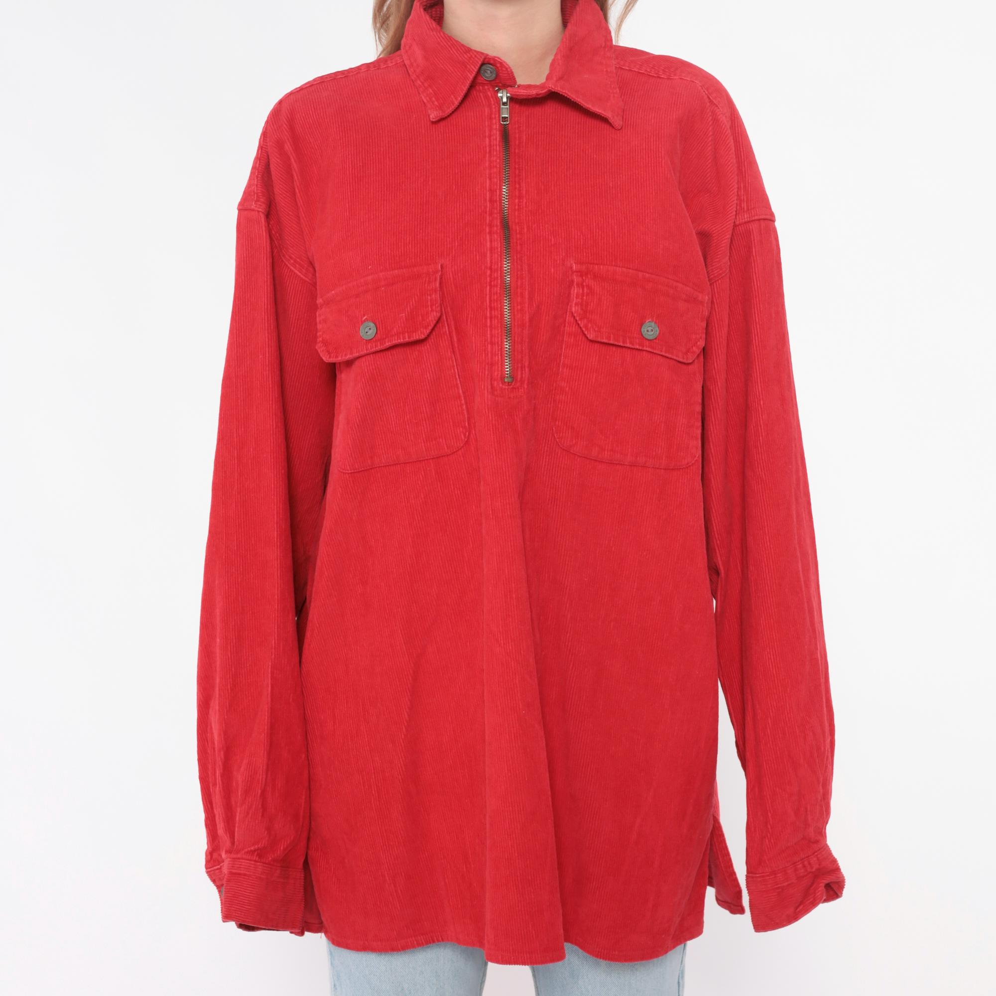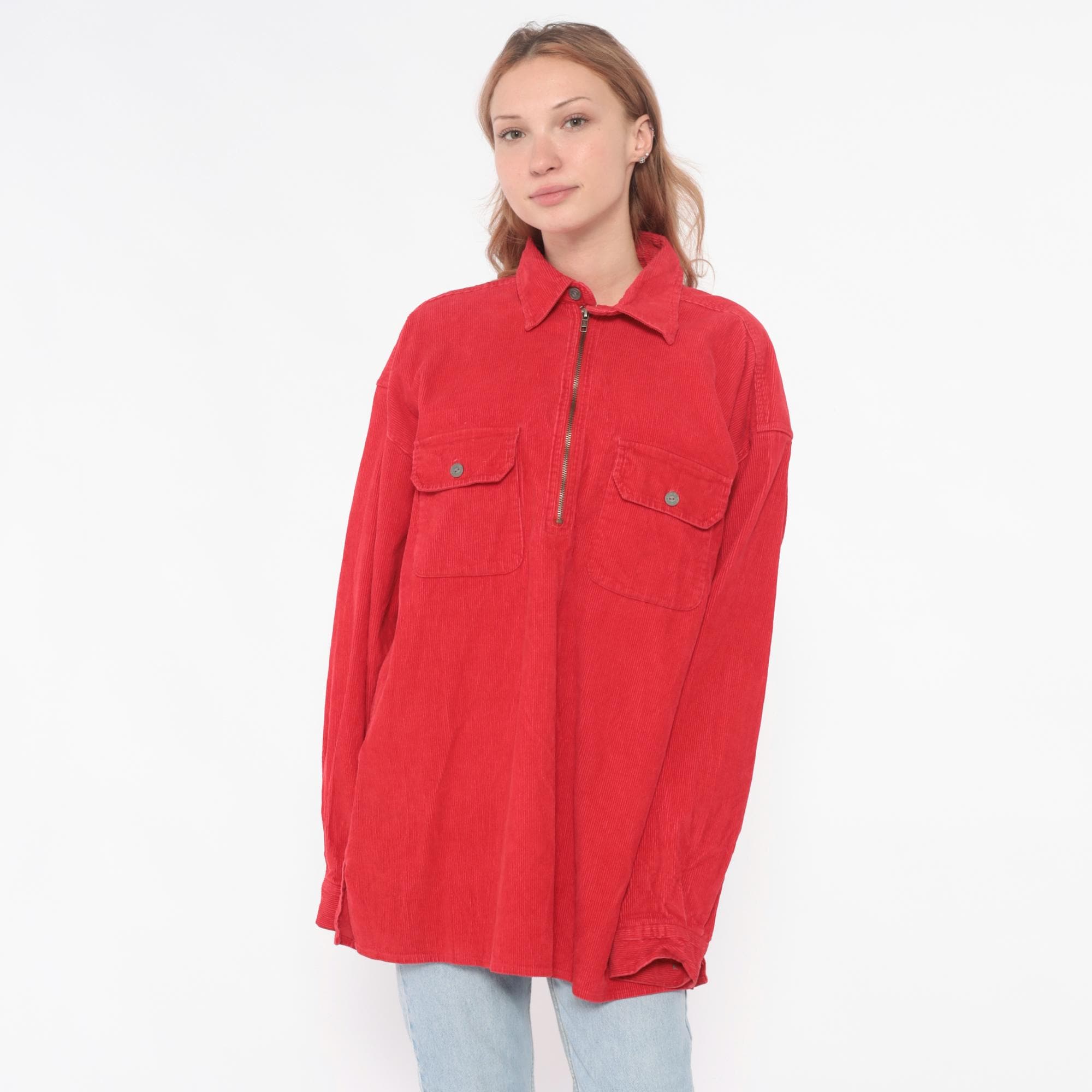 90s coral red corduroy half-zip shirt from Marlboro with pointed collar and partial front zipper closure. Two button-flap chest pockets, long sleeves with button cuffs, boxy silhouette.