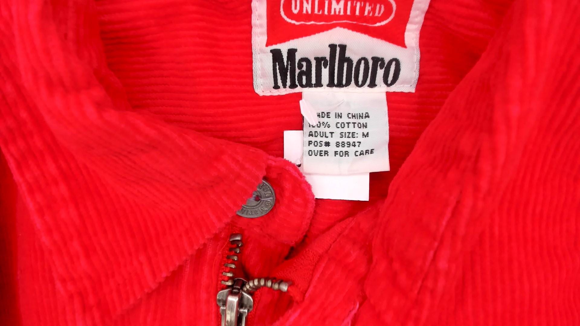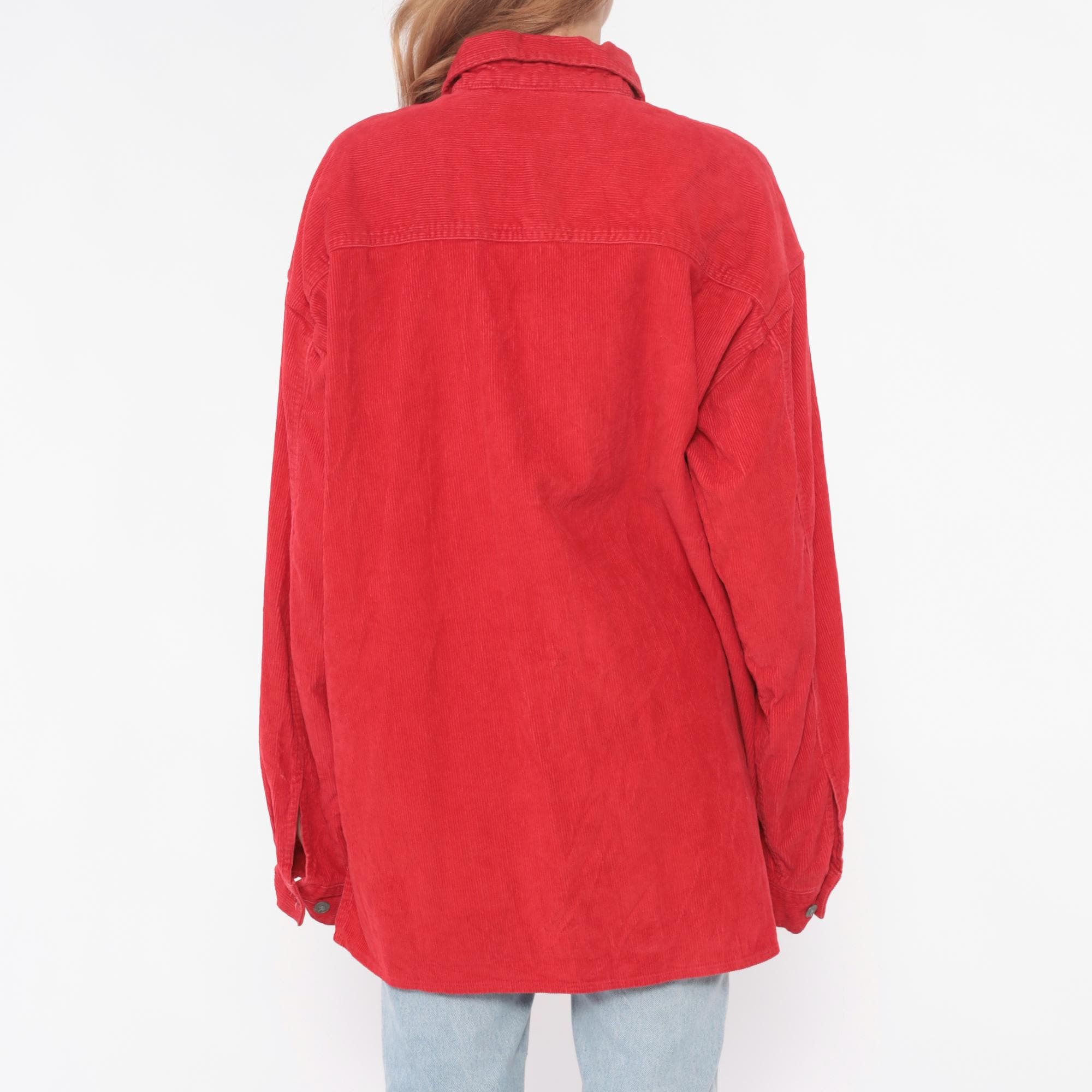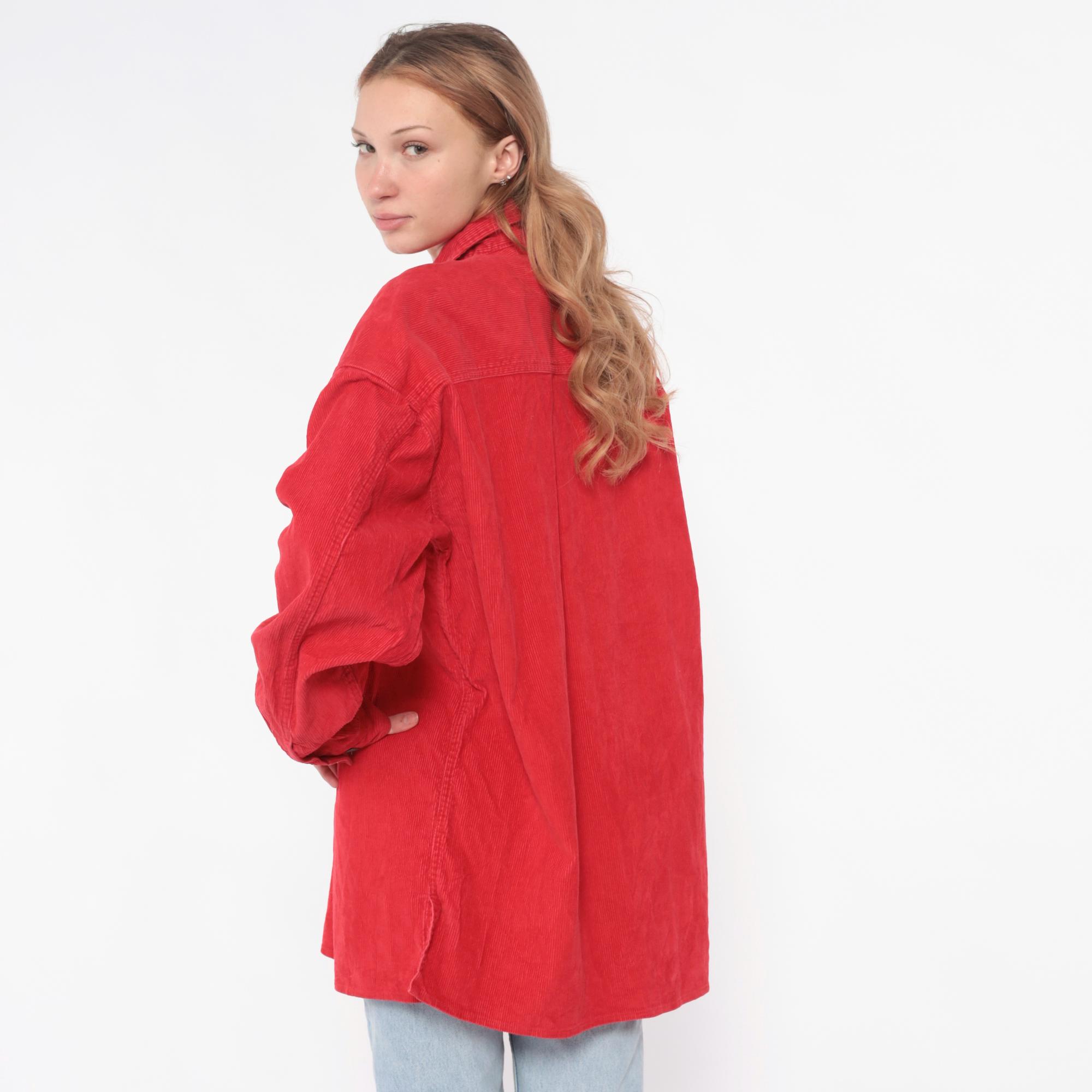 90s coral red corduroy half-zip shirt from Marlboro with pointed collar and partial front zipper closure. Two button-flap chest pockets, long sleeves with button cuffs, boxy silhouette.