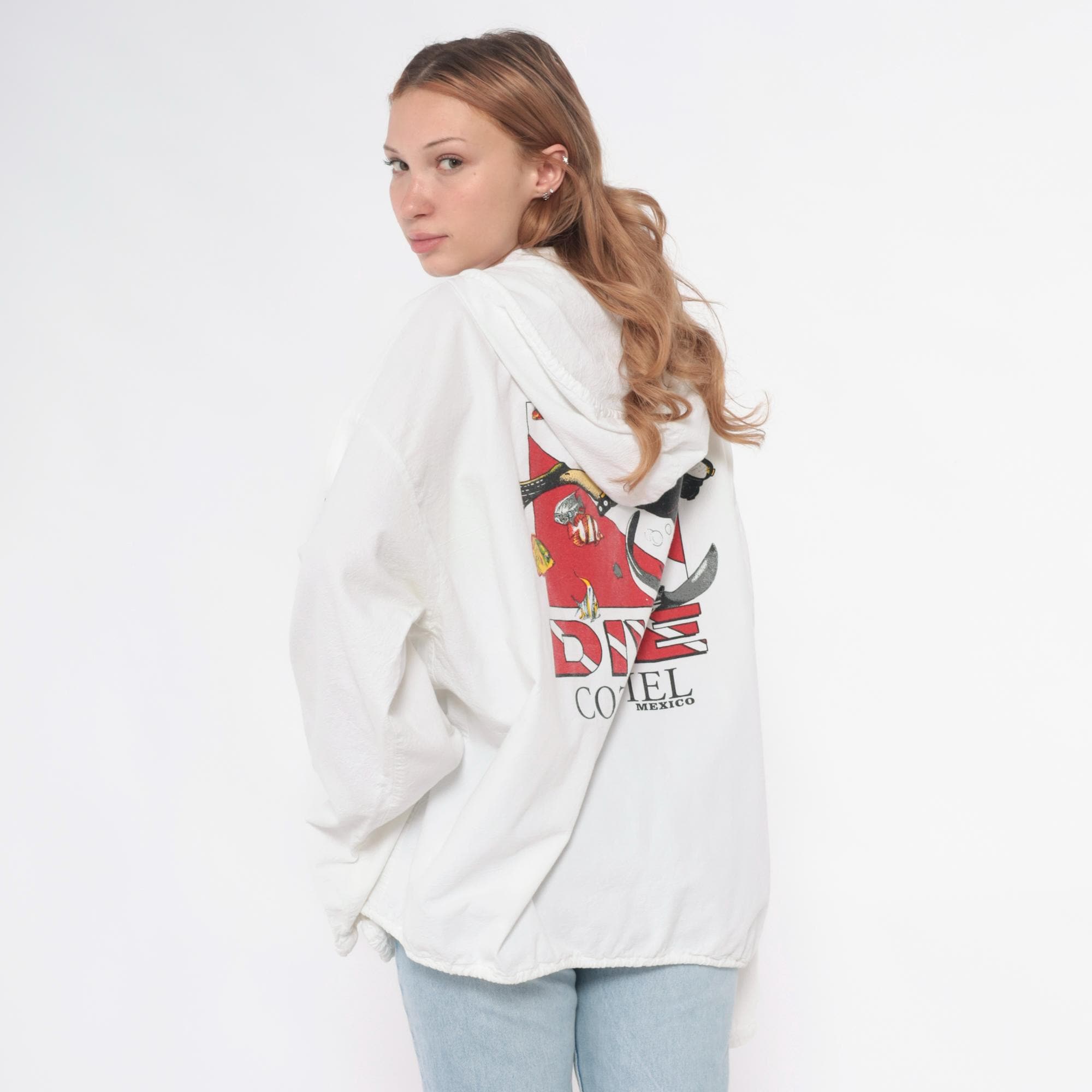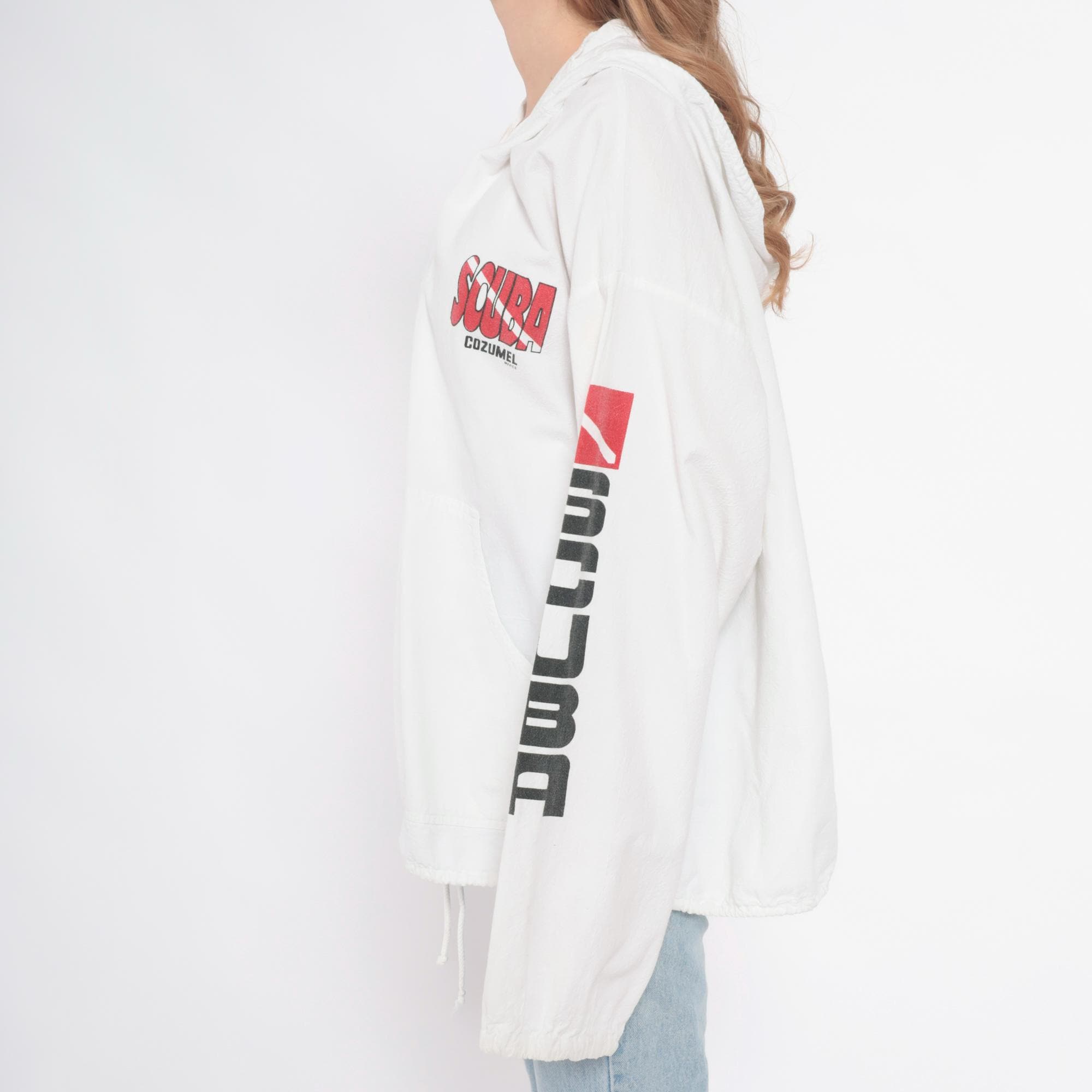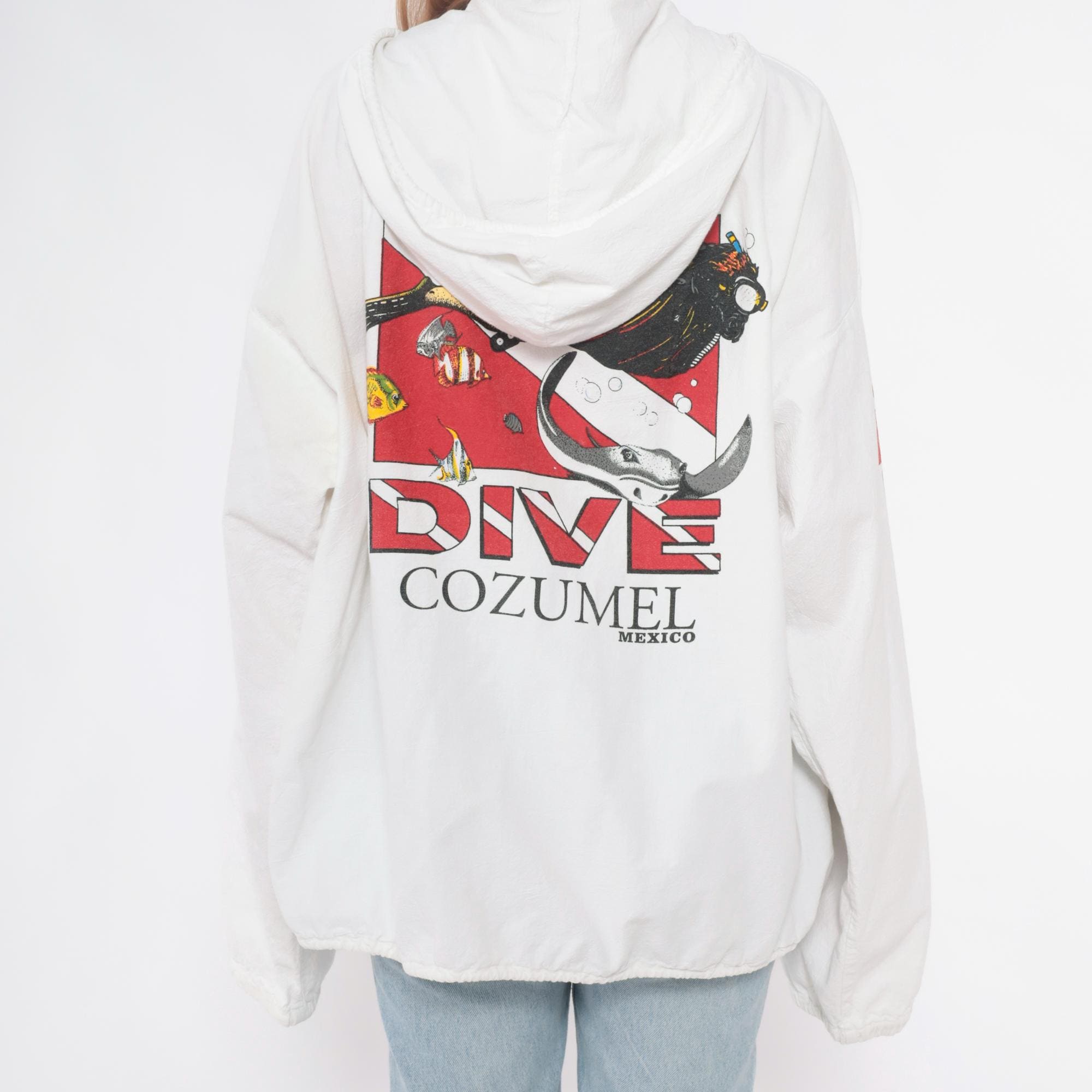 90s white zip-up hooded windbreaker jacket with scuba diving graphics from Cozumel, Mexico. Back features "DIVE COZUMEL MEXICO" text with illustration of diver and manta ray surrounded by tropical fish and dive flag in red, black, and yellow. "SCUBA" text runs vertically down both sleeves with dive flag graphics.