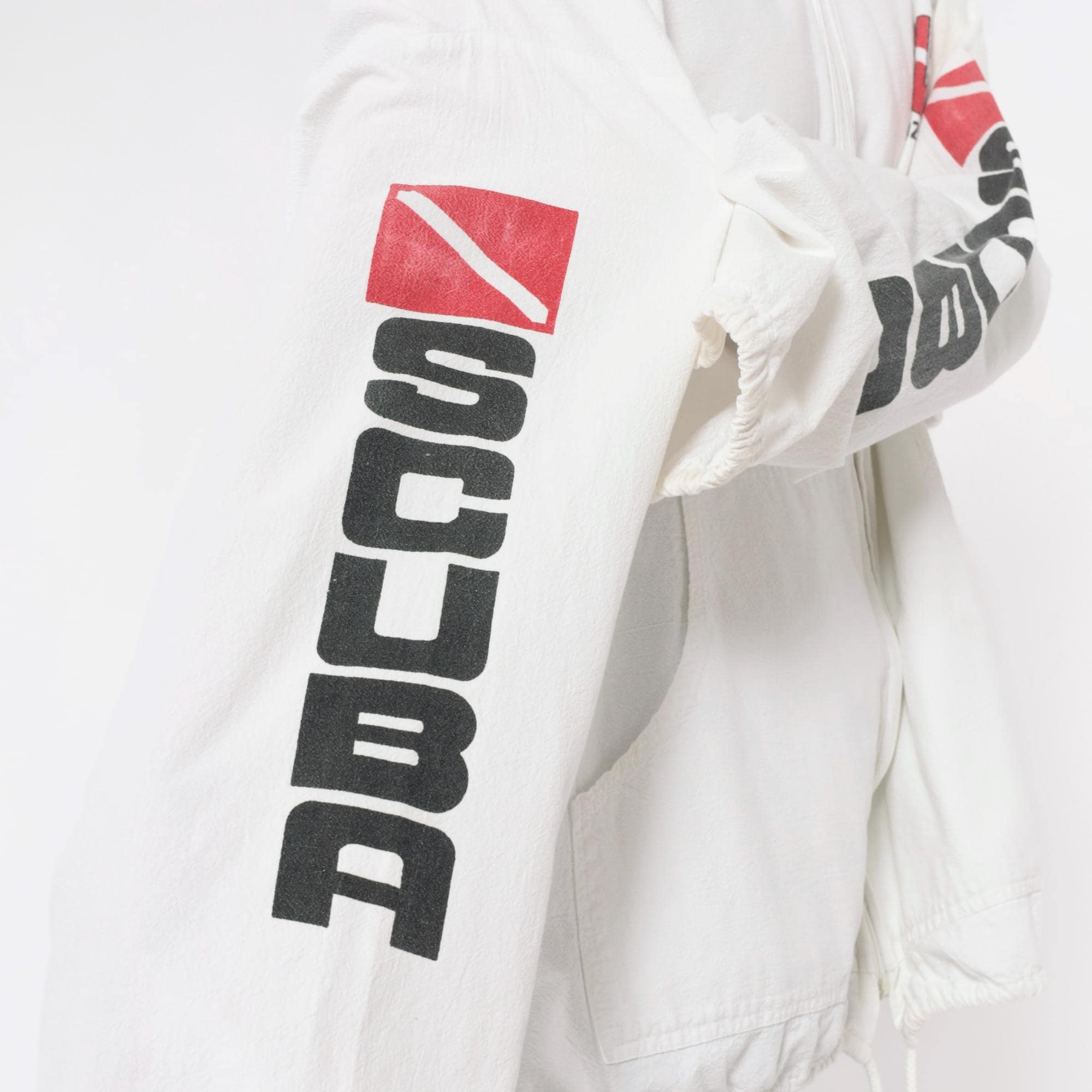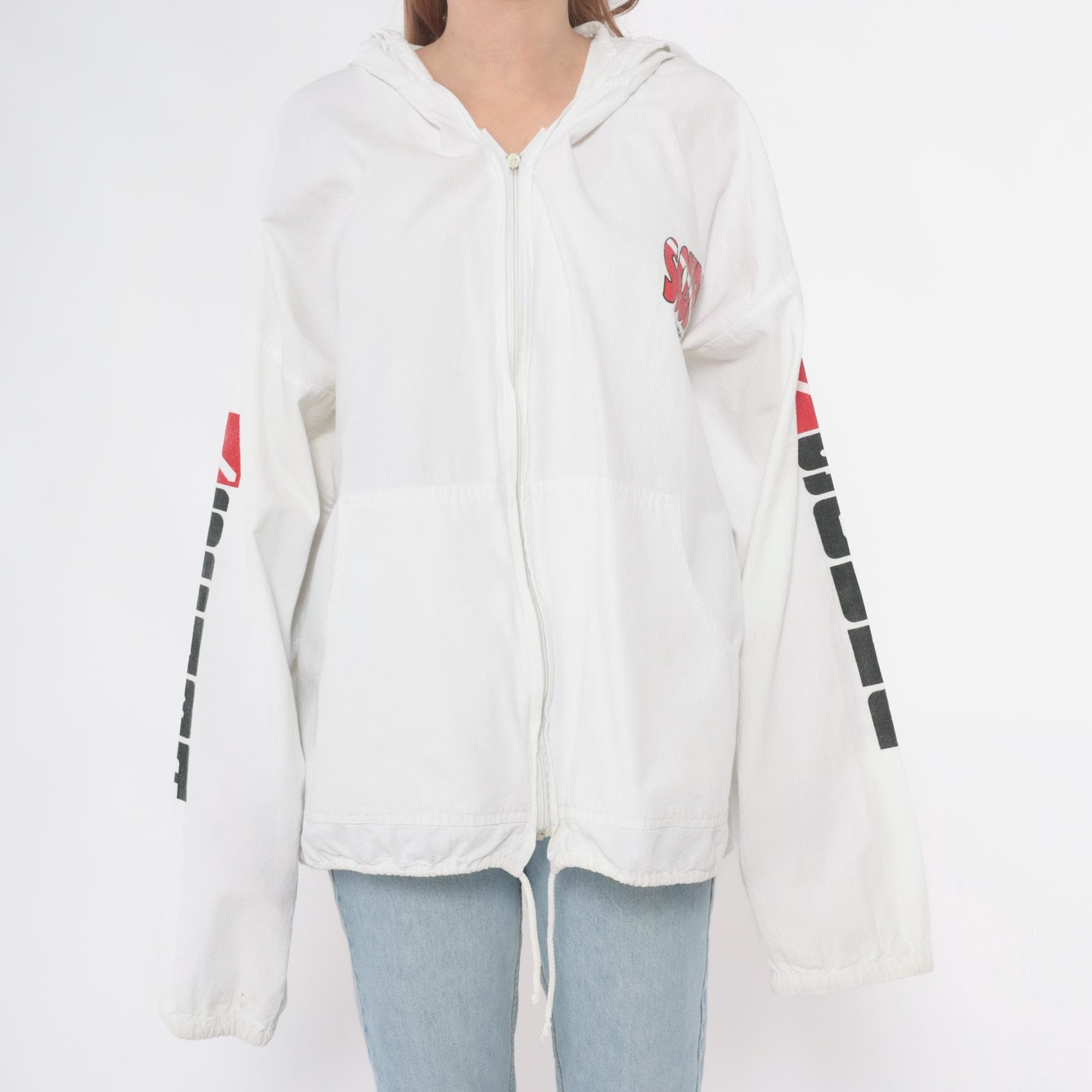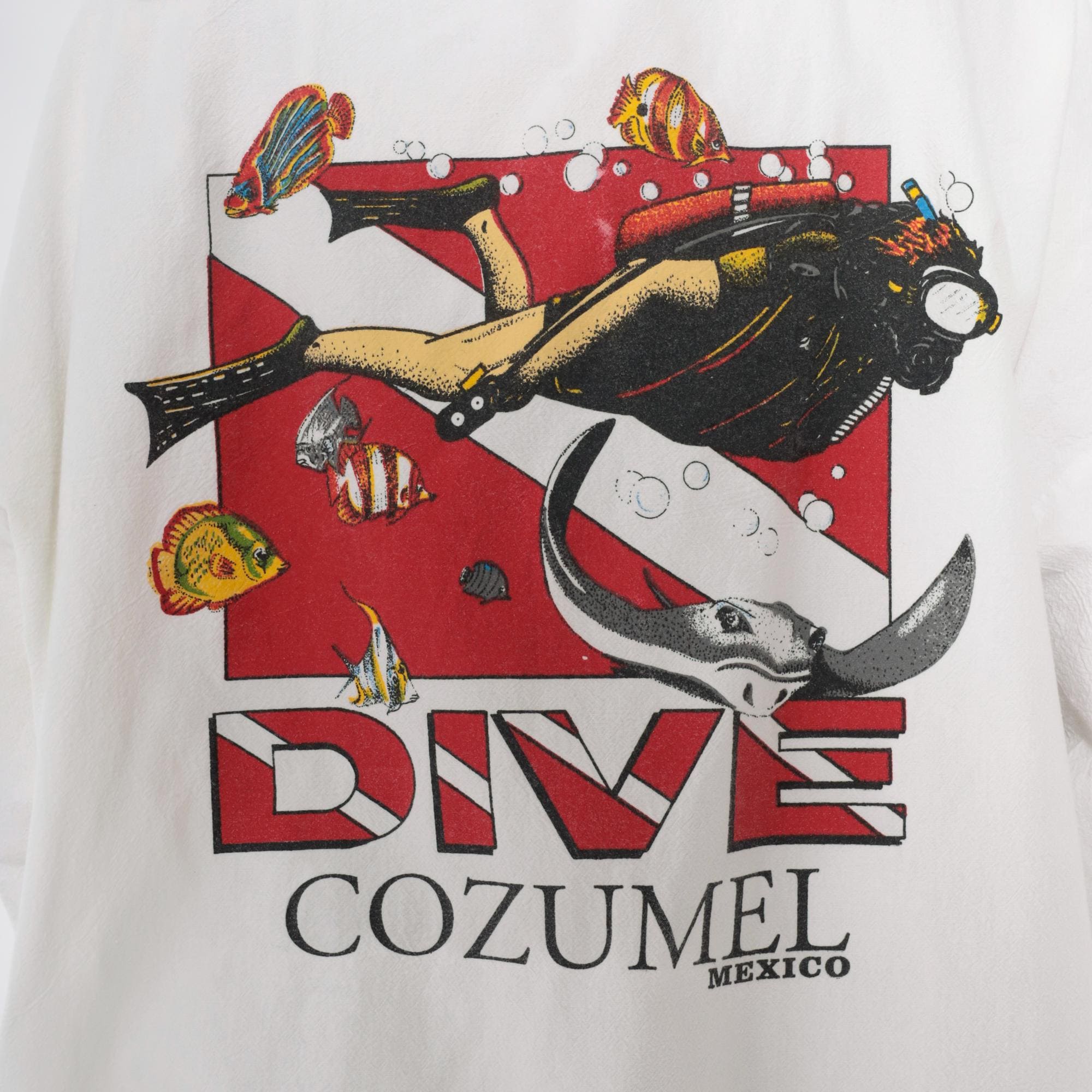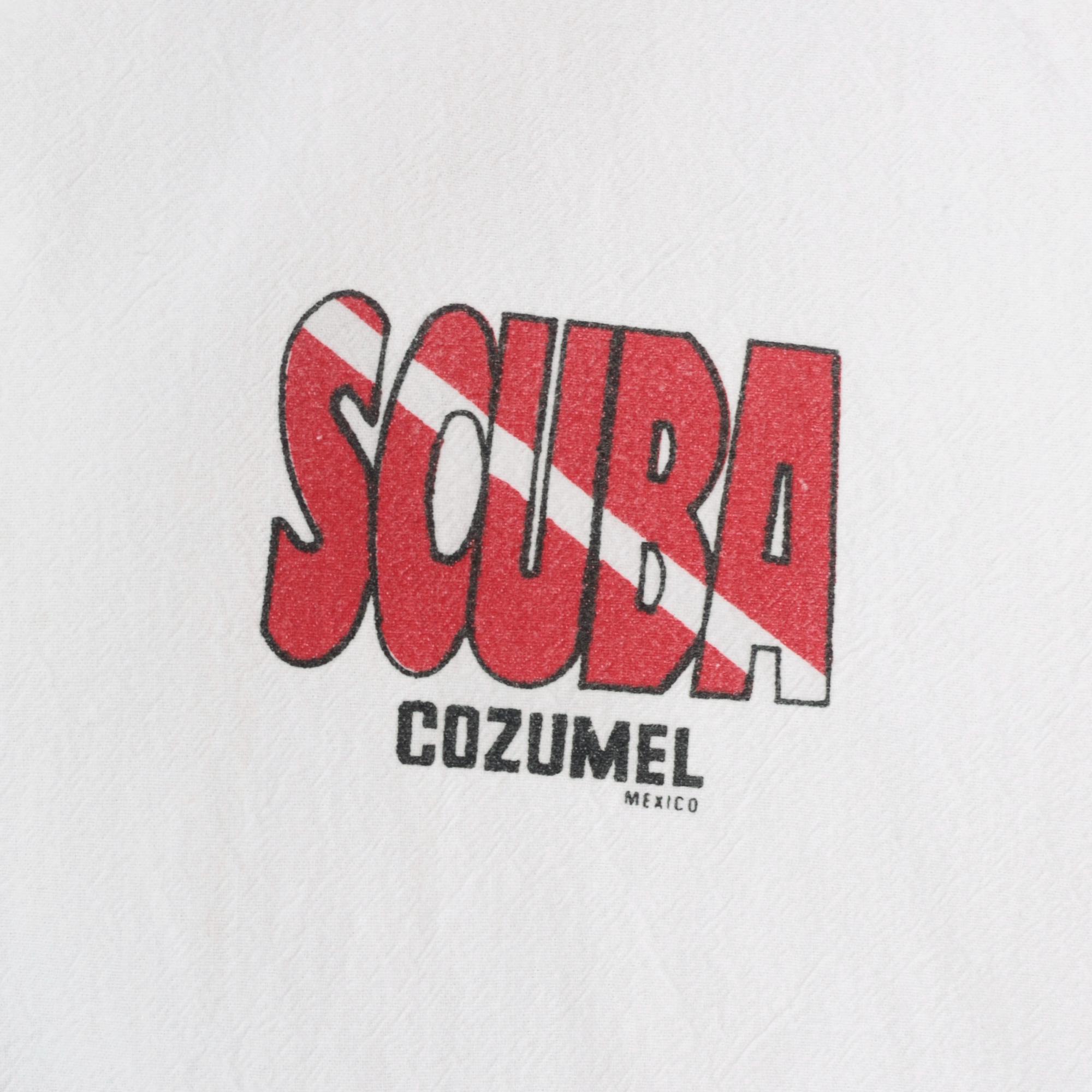 90s white zip-up hooded windbreaker jacket with scuba diving graphics from Cozumel, Mexico. Back features "DIVE COZUMEL MEXICO" text with illustration of diver and manta ray surrounded by tropical fish and dive flag in red, black, and yellow. "SCUBA" text runs vertically down both sleeves with dive flag graphics.