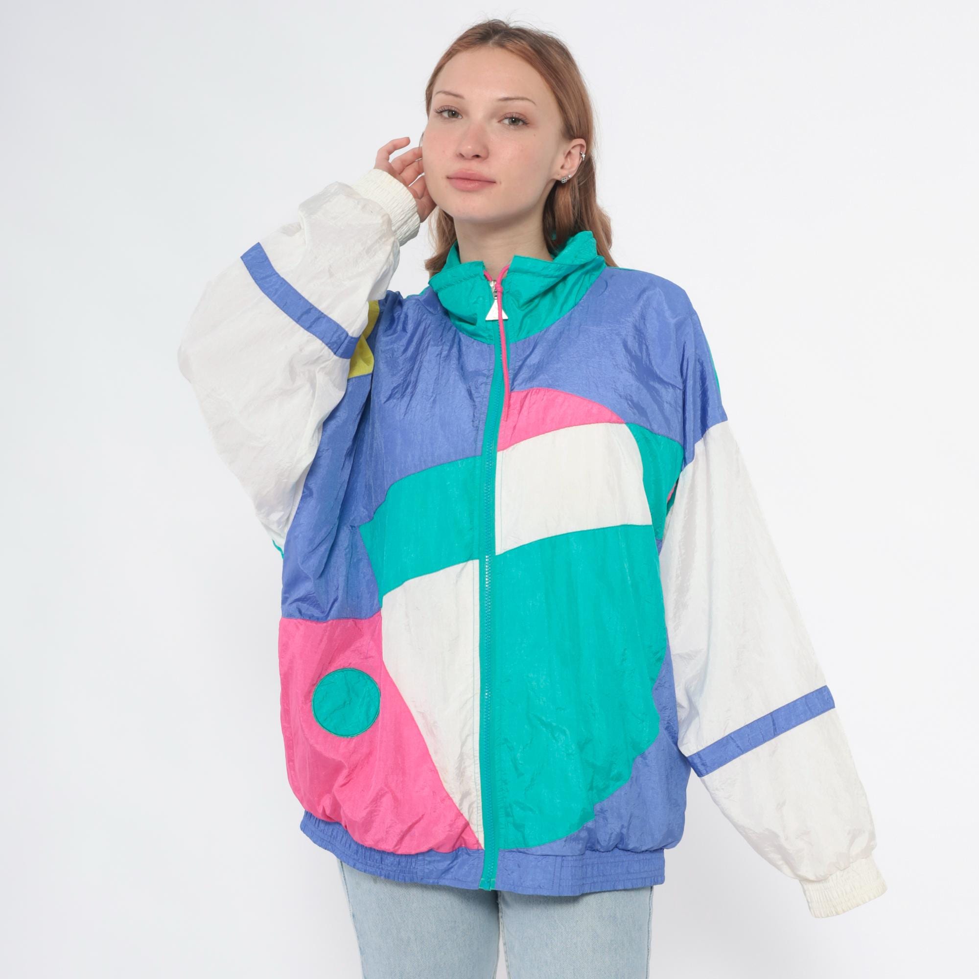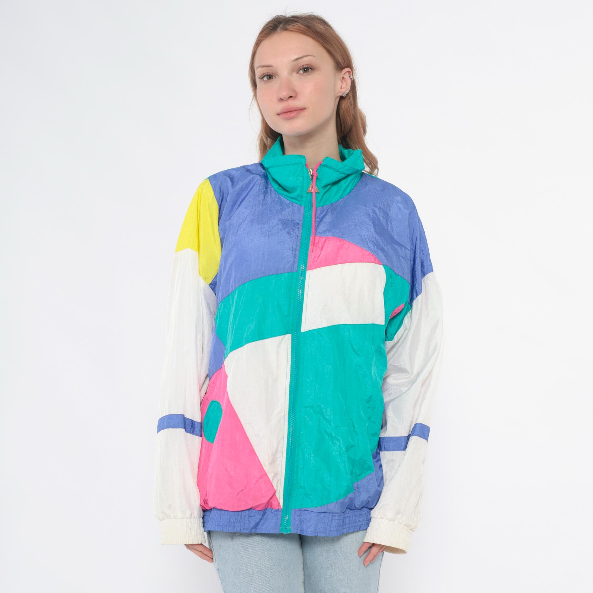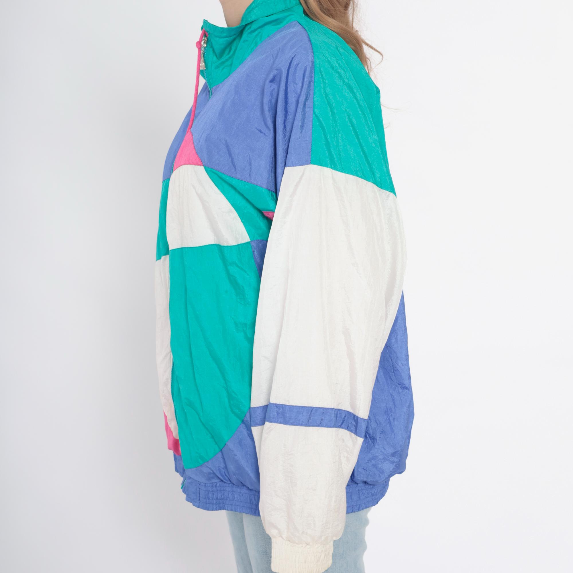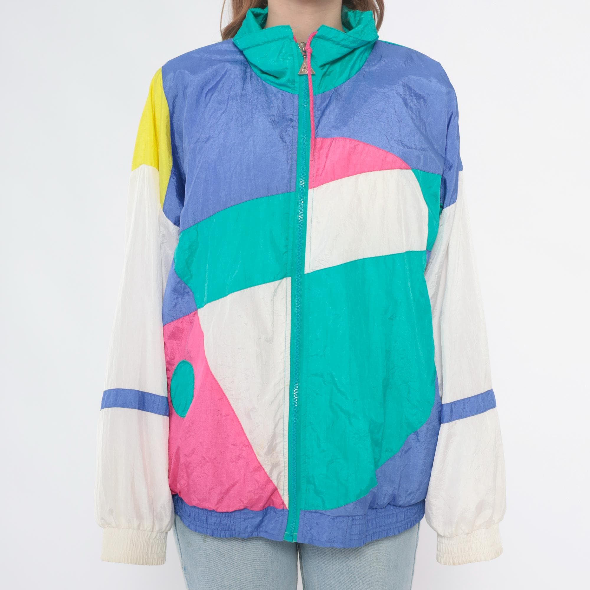 90s colorblock windbreaker jacket from casual isle with geometric abstract pattern in teal, purple, pink, white, and yellow. Full front zip closure with matching teal zipper, funnel neck collar, elastic cuffs and waist hem.