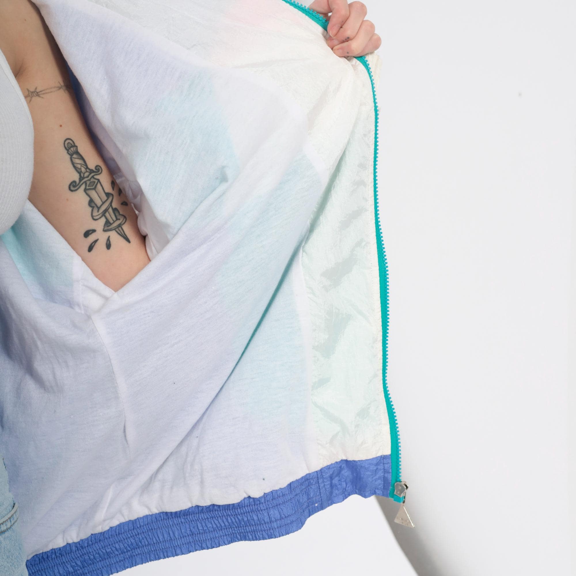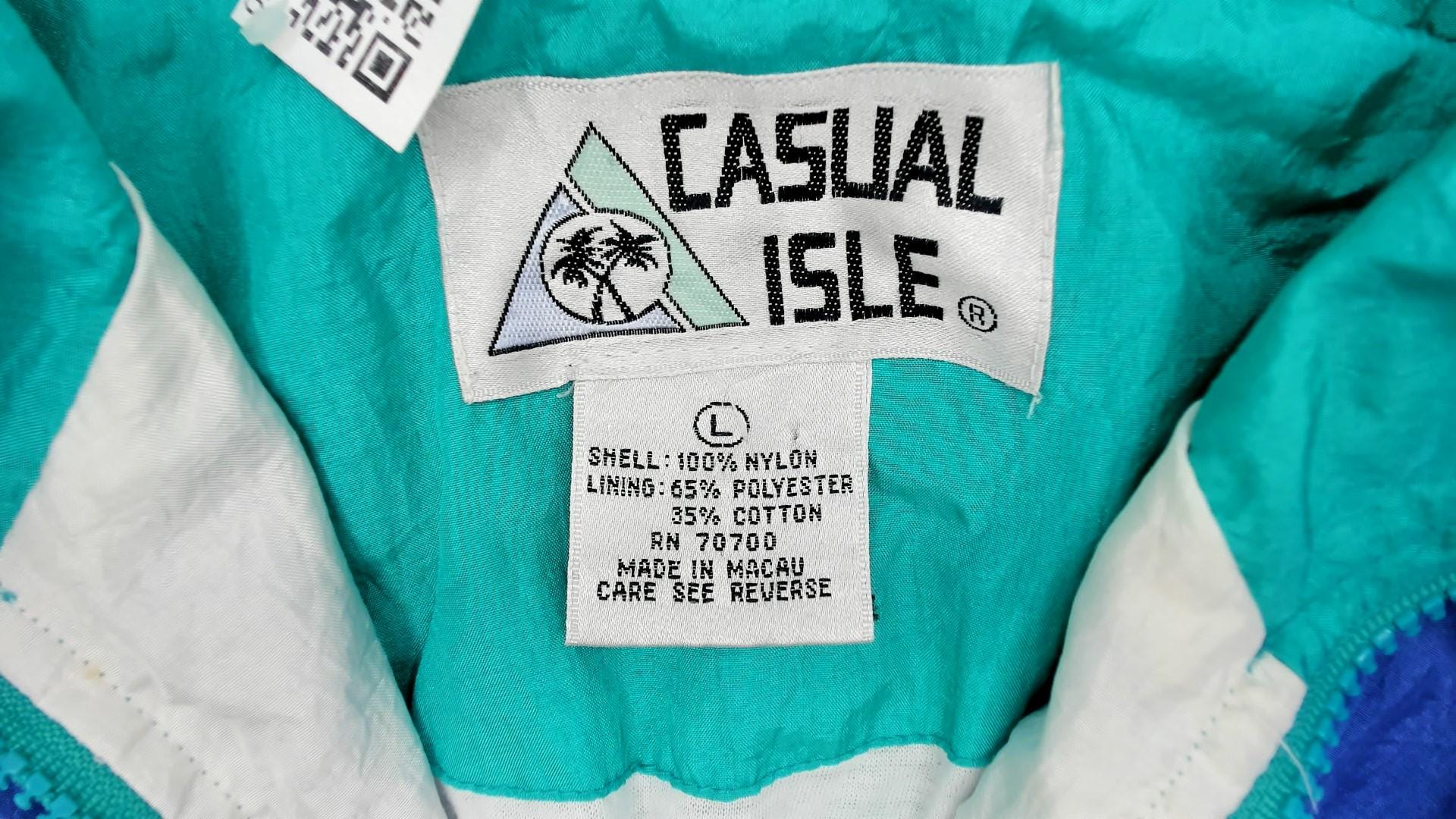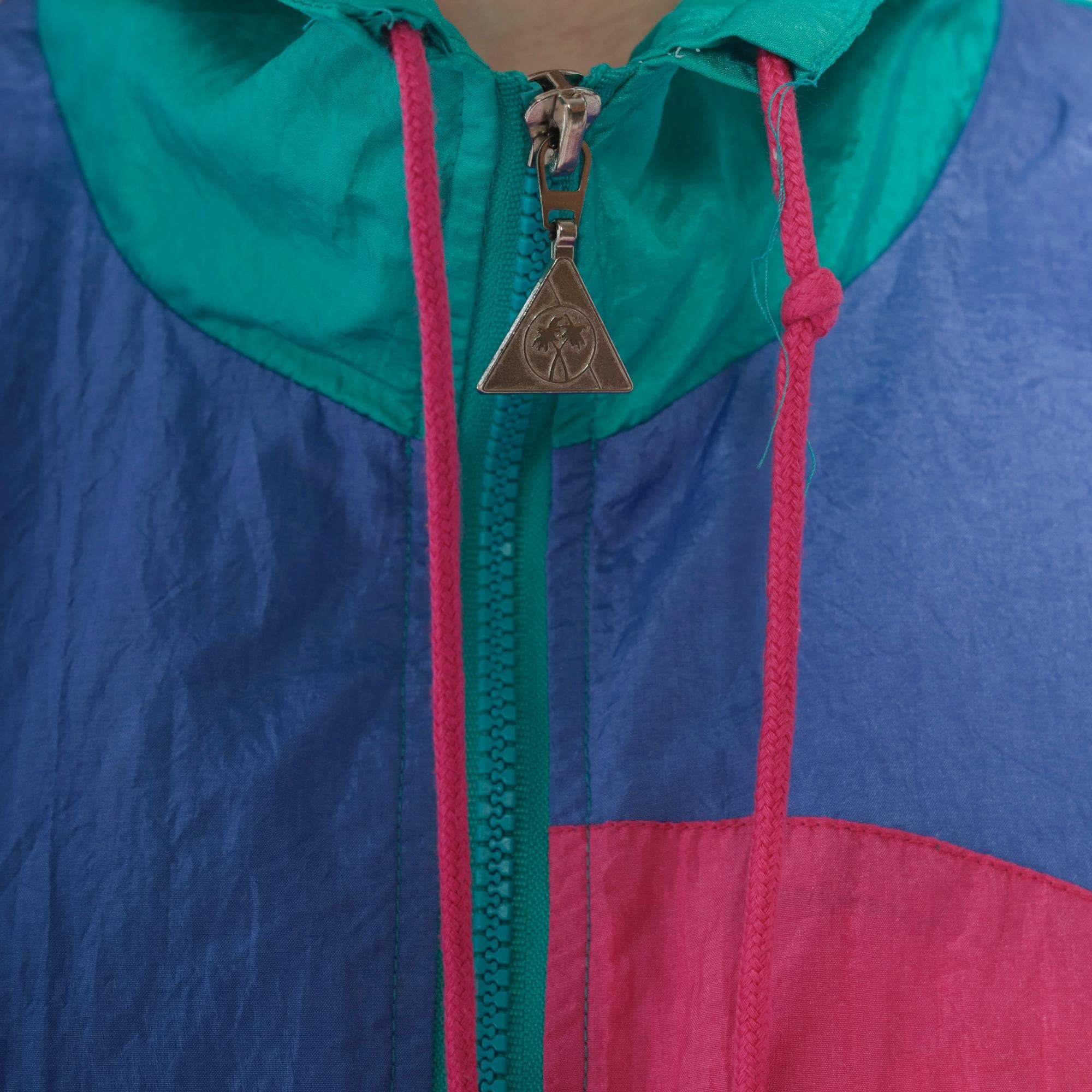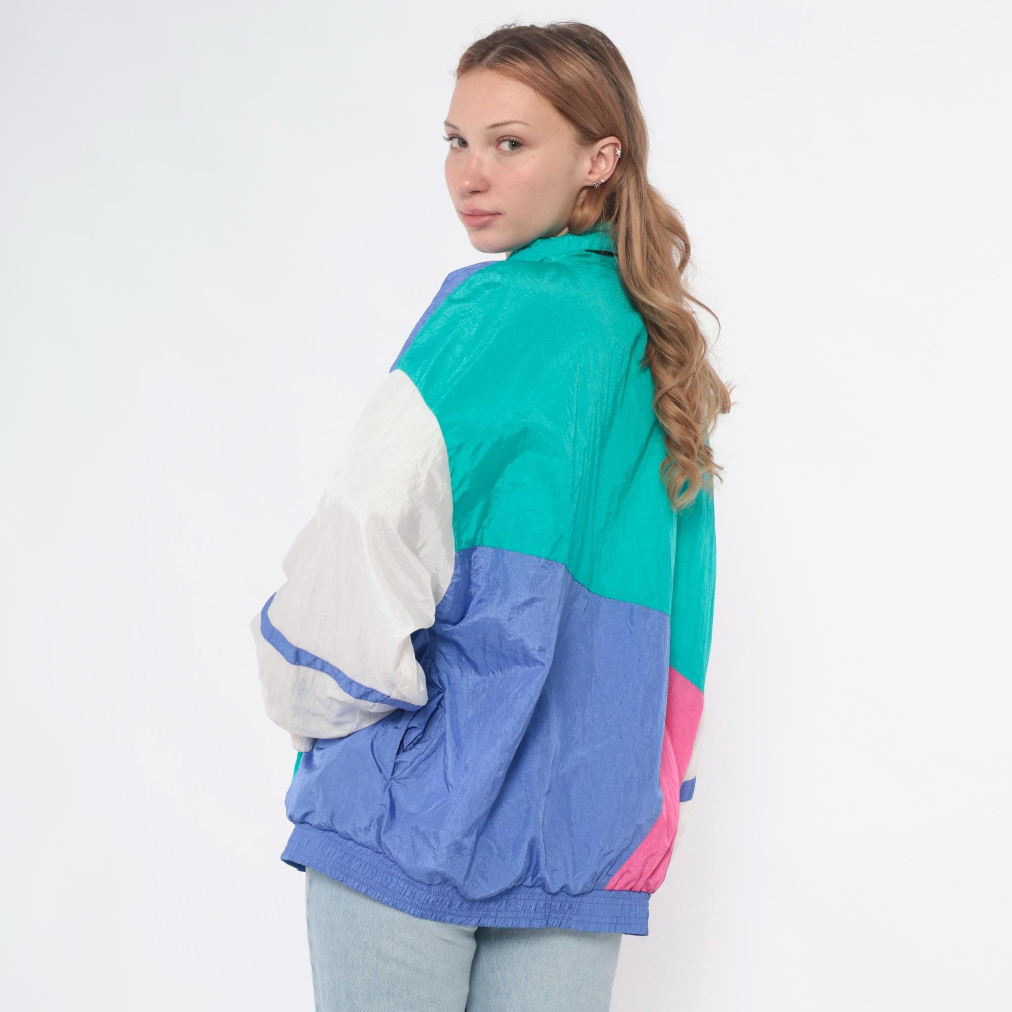 90s colorblock windbreaker jacket from casual isle with geometric abstract pattern in teal, purple, pink, white, and yellow. Full front zip closure with matching teal zipper, funnel neck collar, elastic cuffs and waist hem.