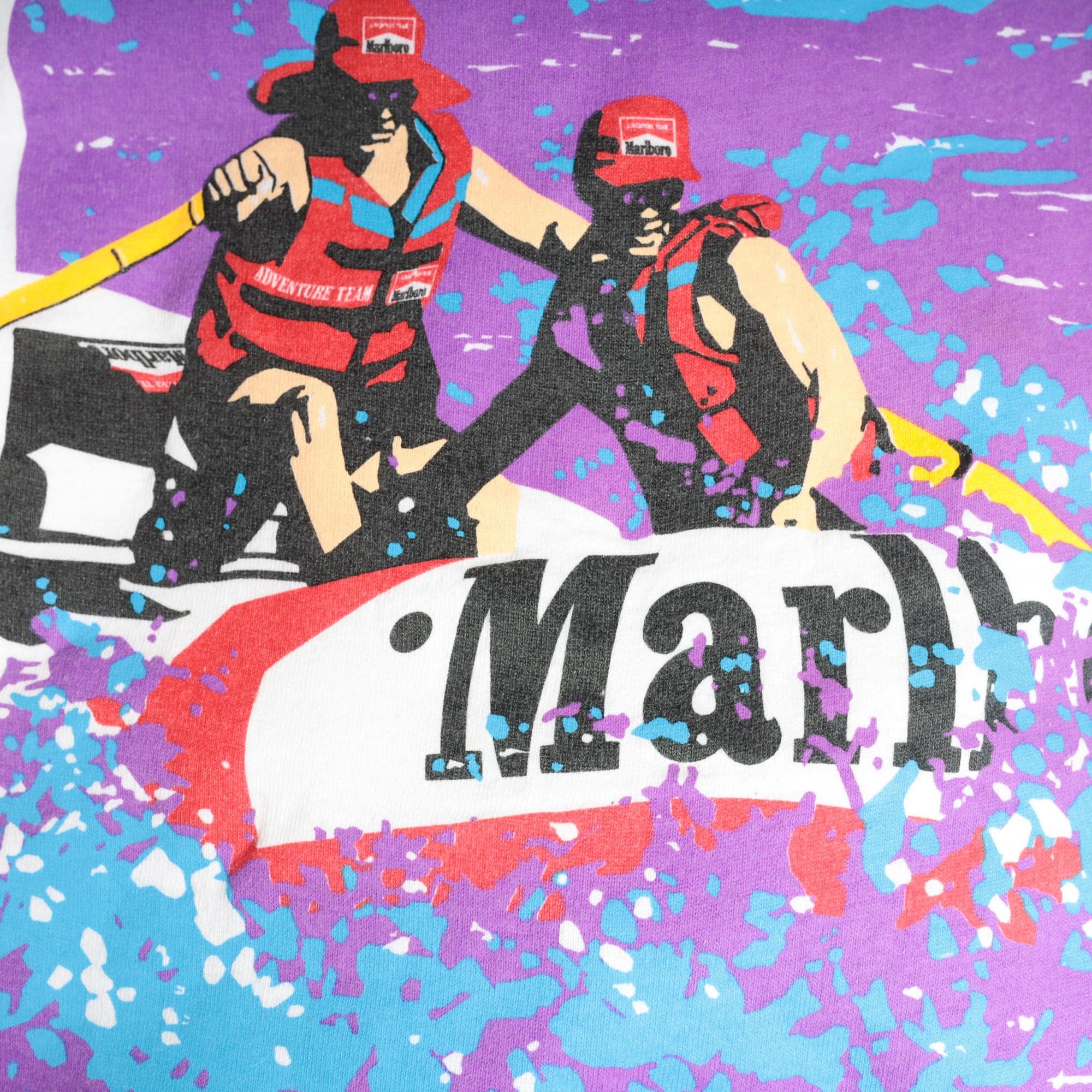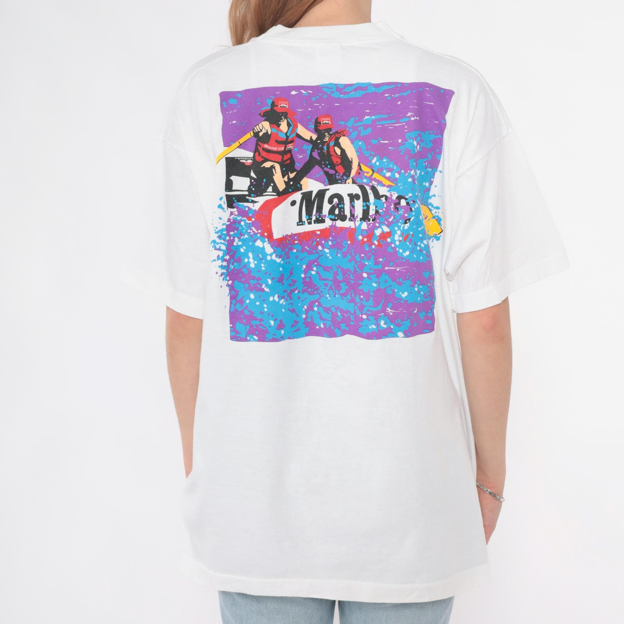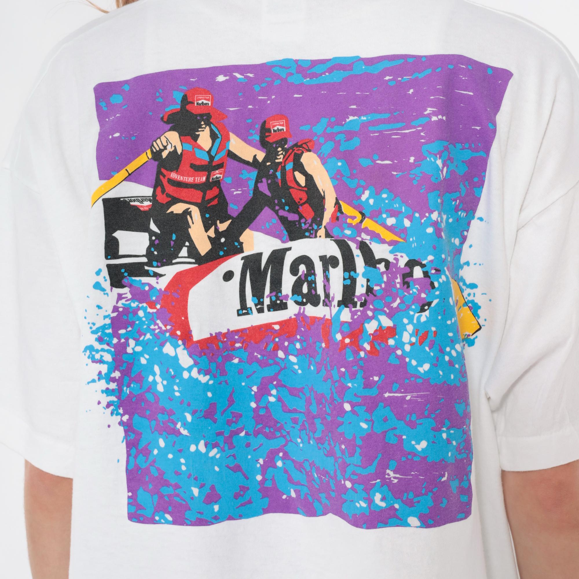 90s white oversized t-shirt from Marlboro Adventure Team with small red and black logo at front chest and large back graphic of two people in red gear paddling a raft through purple and blue water splashes. Crew neck, short sleeves, boxy relaxed fit.