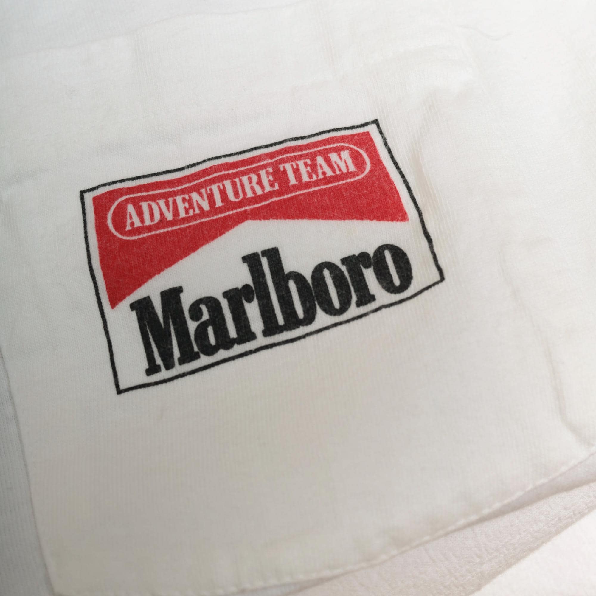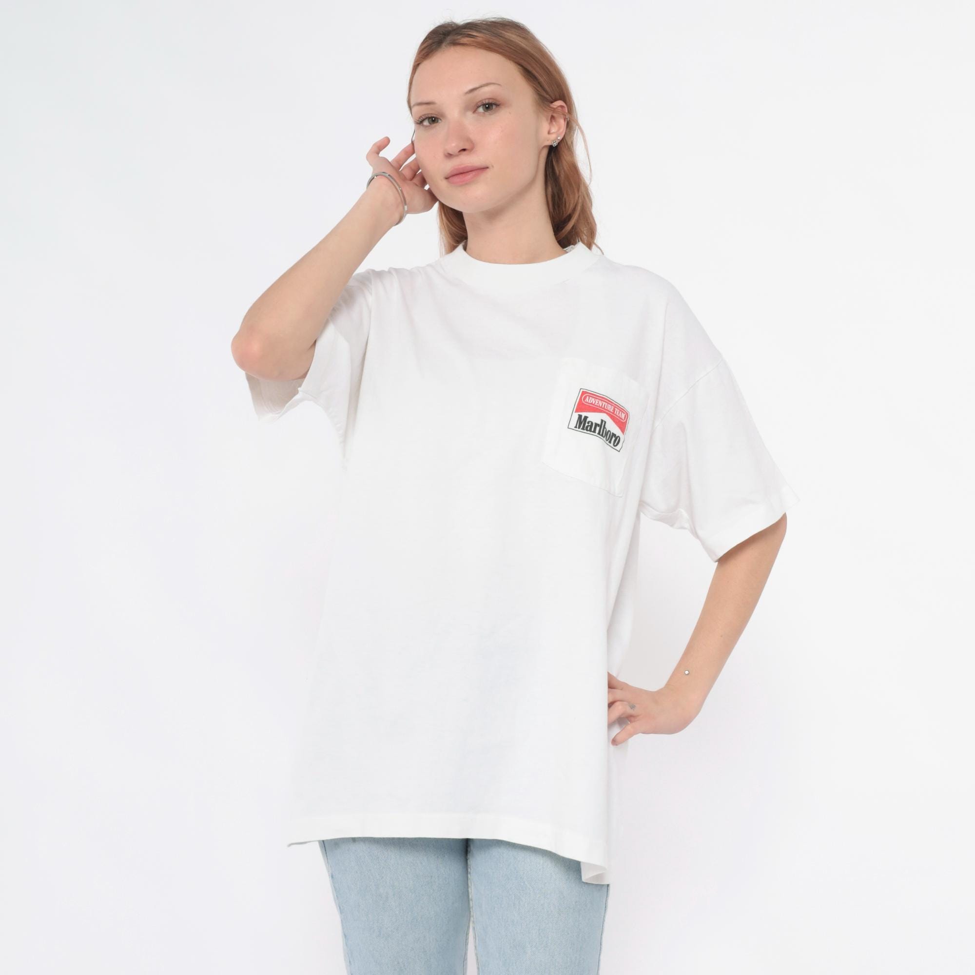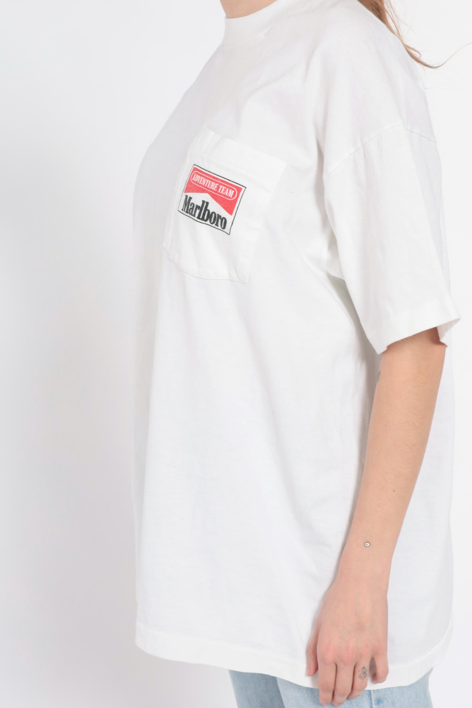 90s white oversized t-shirt from Marlboro Adventure Team with small red and black logo at front chest and large back graphic of two people in red gear paddling a raft through purple and blue water splashes. Crew neck, short sleeves, boxy relaxed fit.
