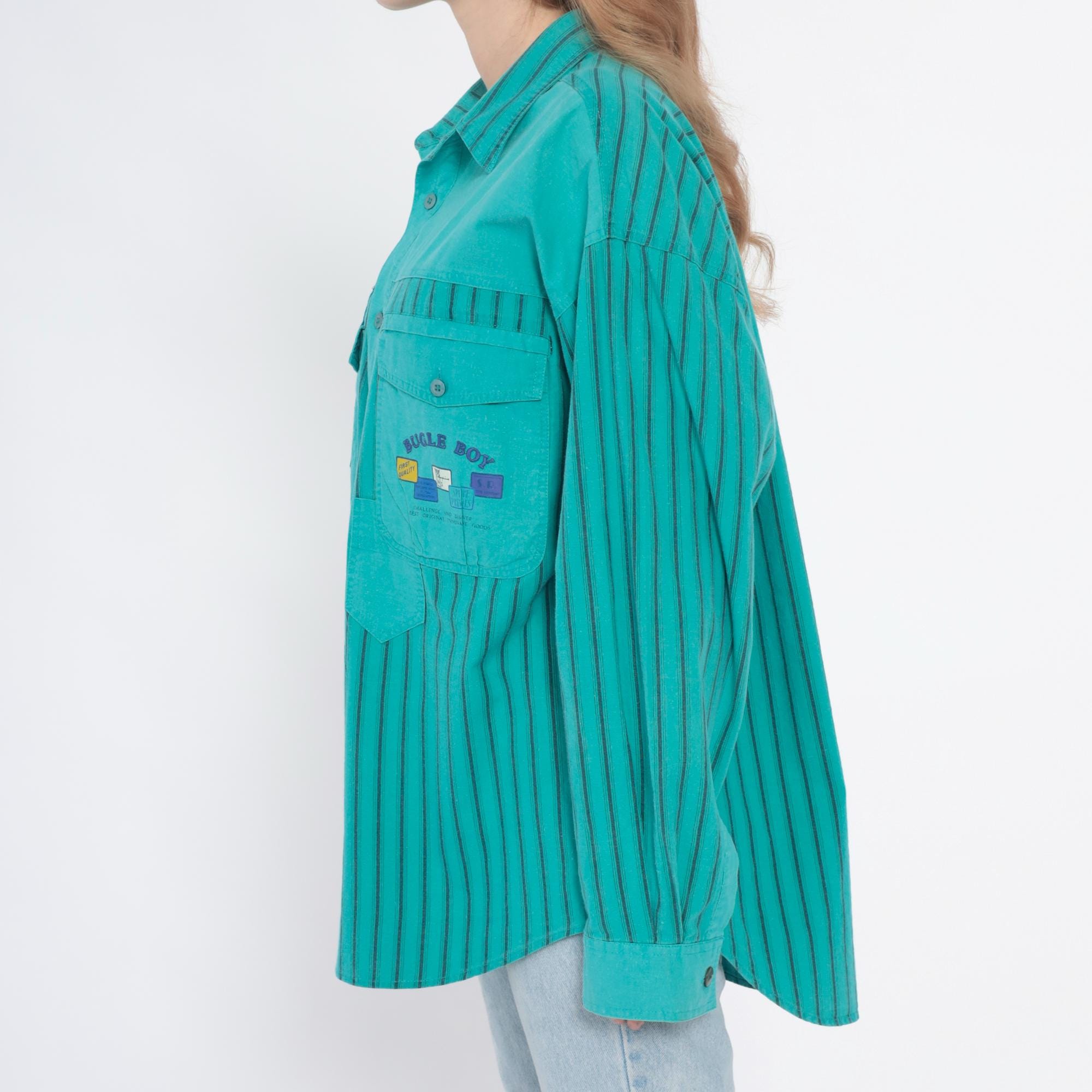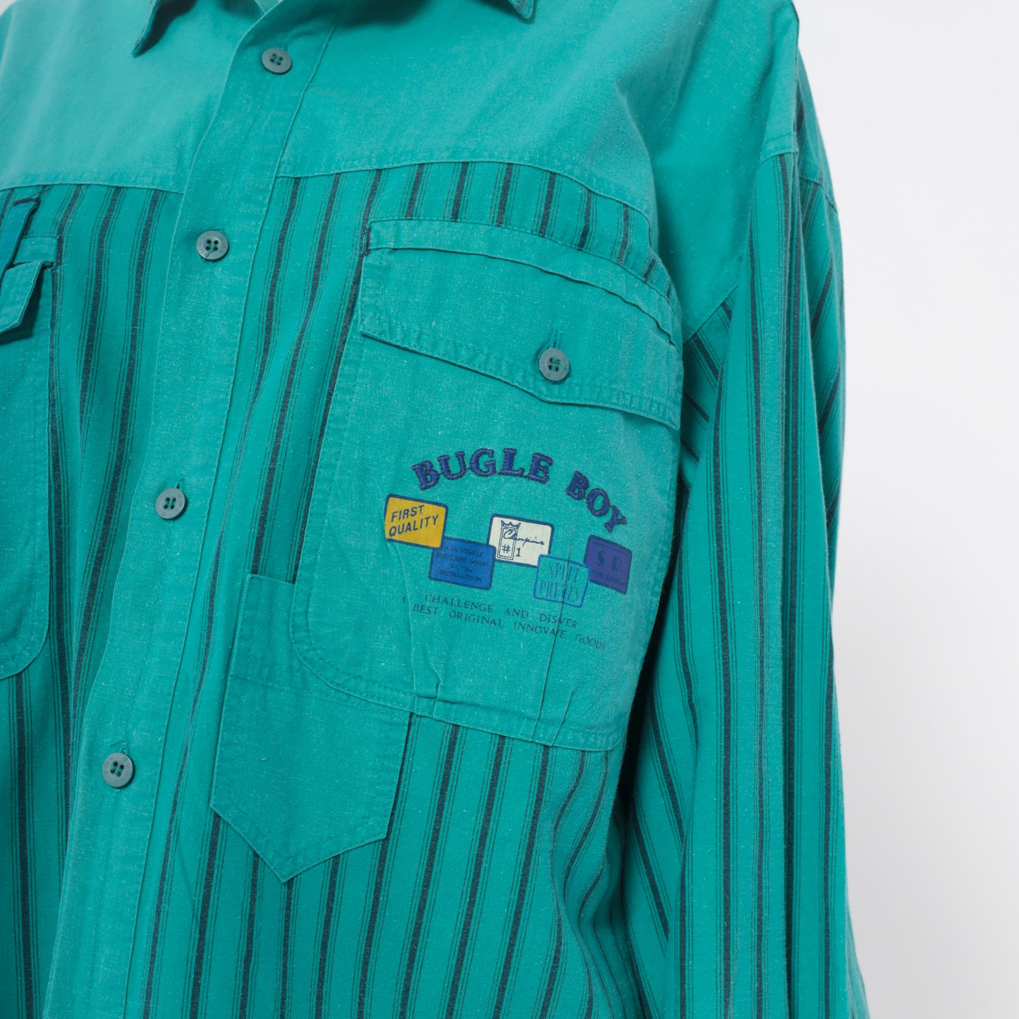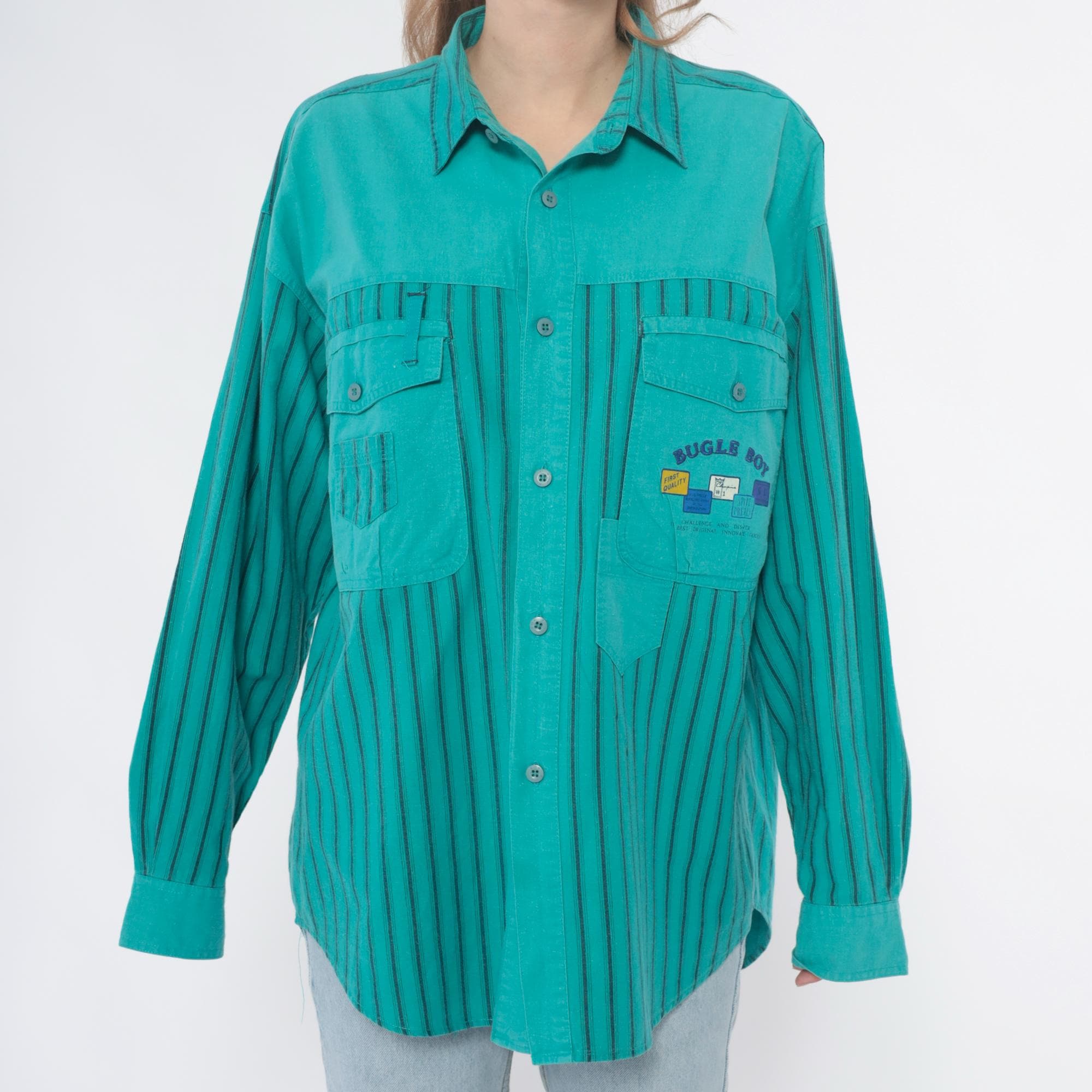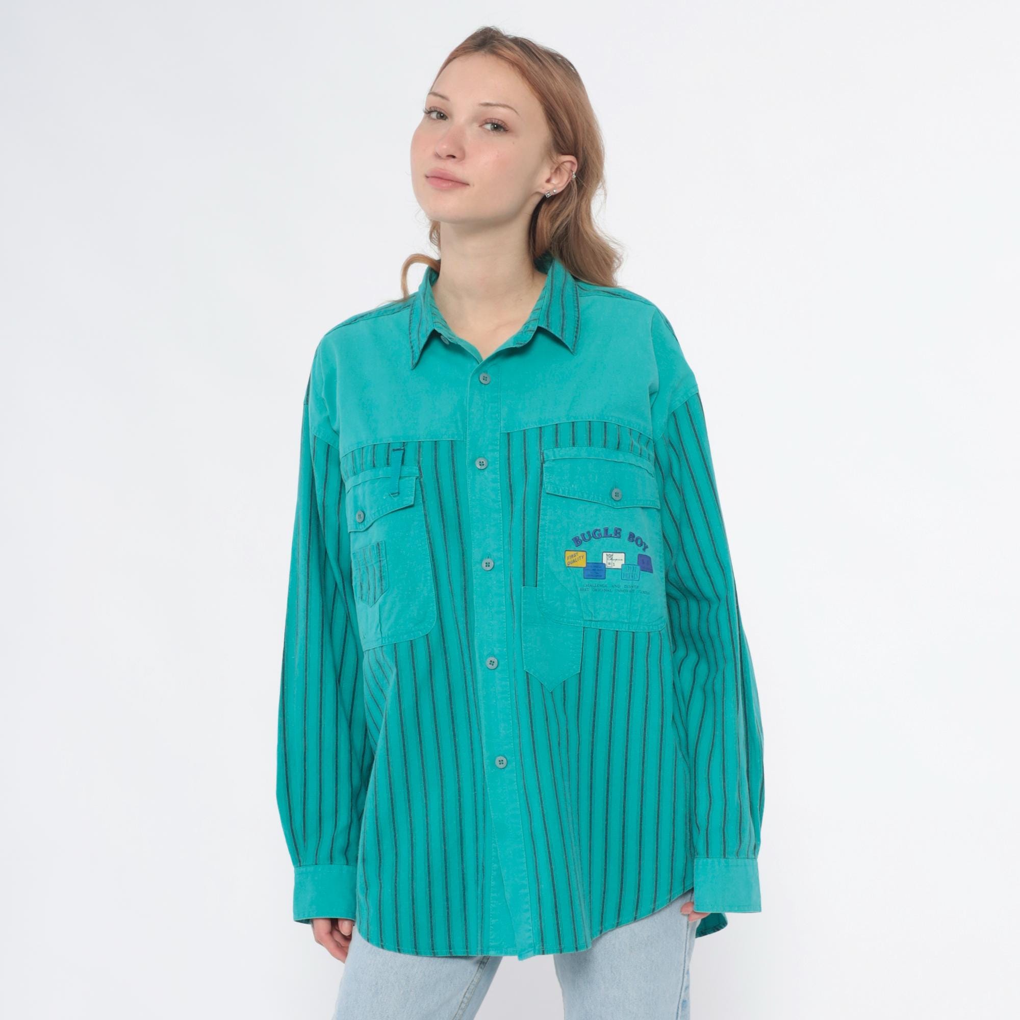 90s turquoise button-up shirt from Bugle Boy with color-blocked design, solid upper chest and yoke with two button-flap chest pockets, vertical striped pattern across sleeves and lower body in turquoise and dark teal. Long sleeves, point collar, full button front closure.