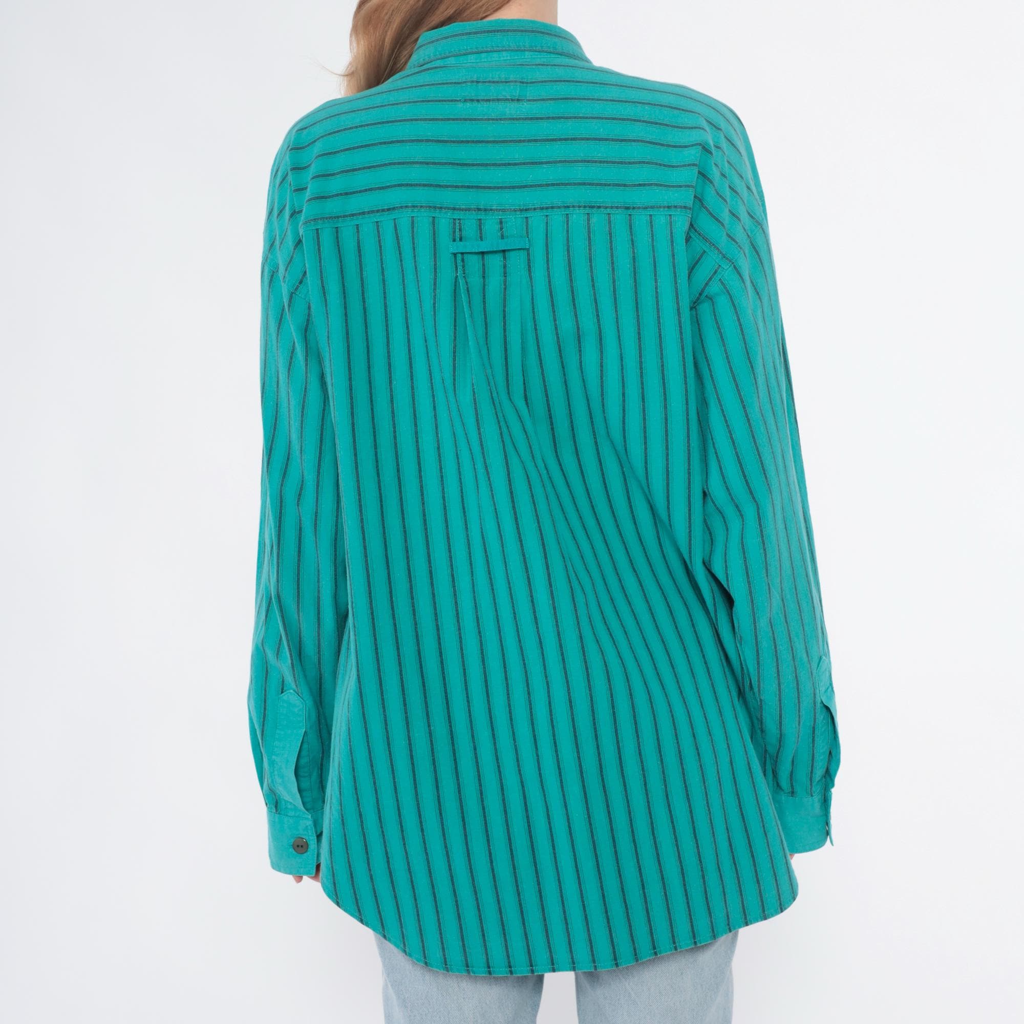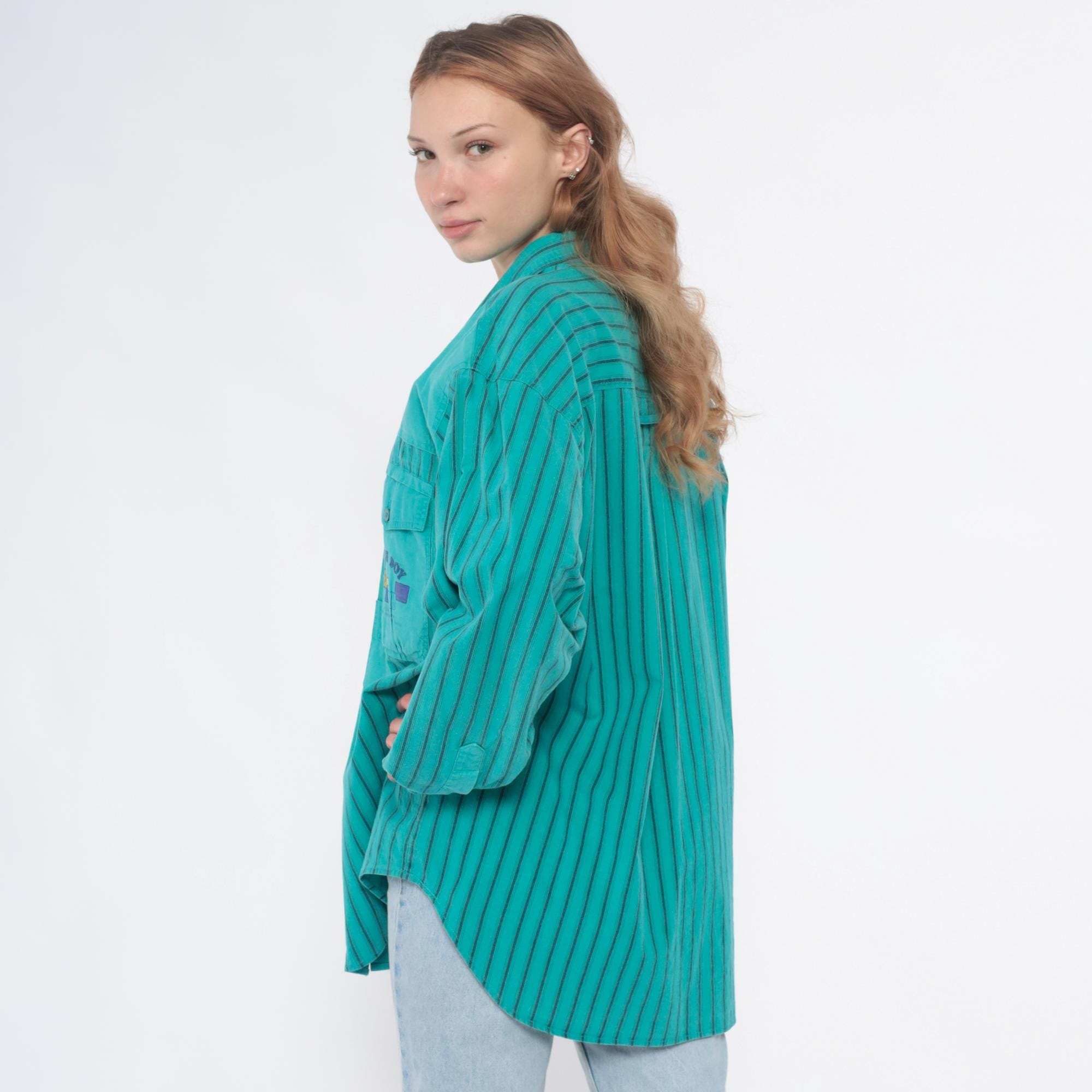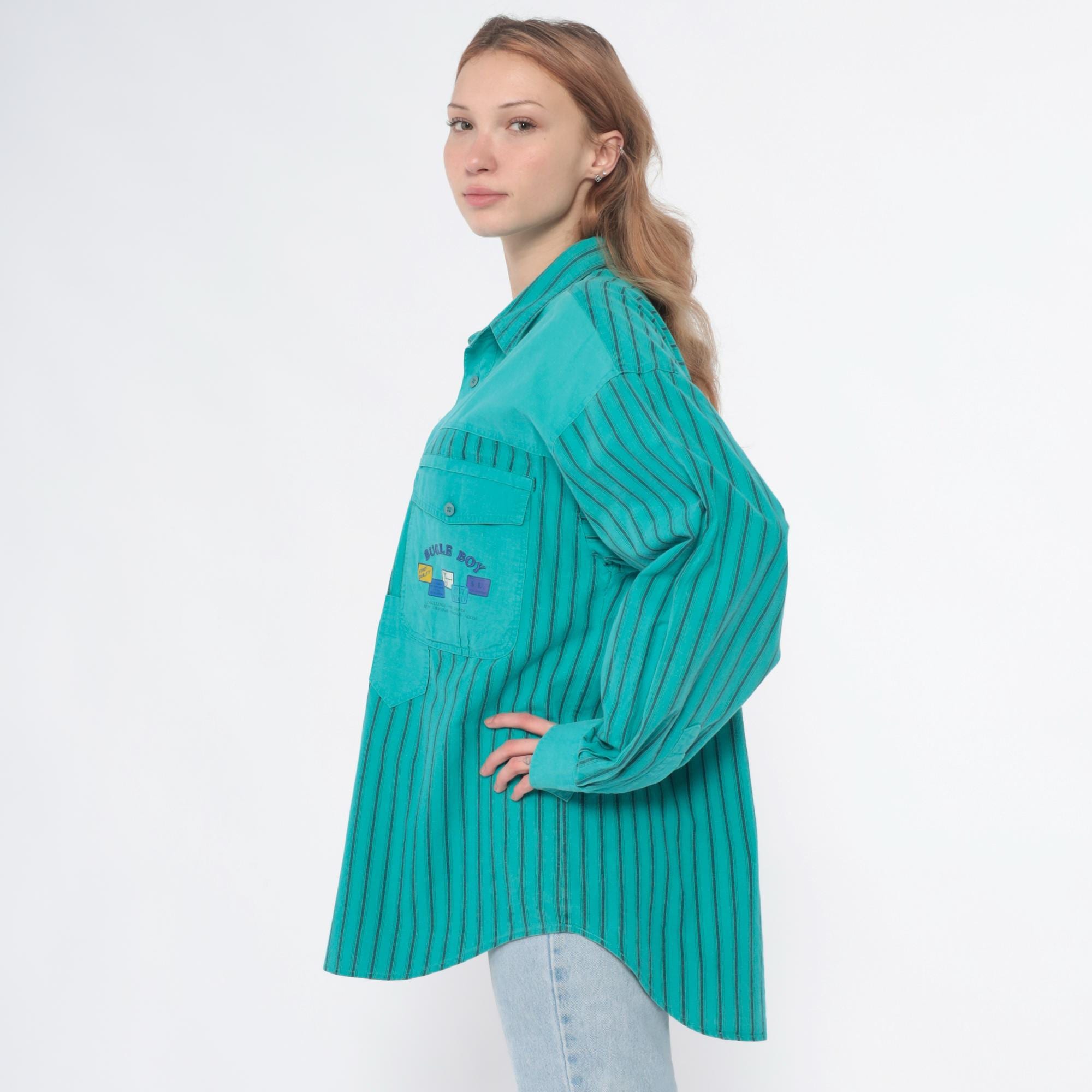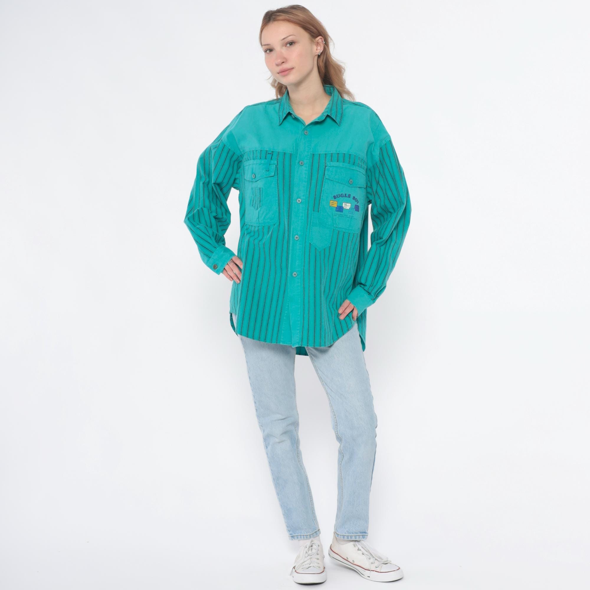 90s turquoise button-up shirt from Bugle Boy with color-blocked design, solid upper chest and yoke with two button-flap chest pockets, vertical striped pattern across sleeves and lower body in turquoise and dark teal. Long sleeves, point collar, full button front closure.