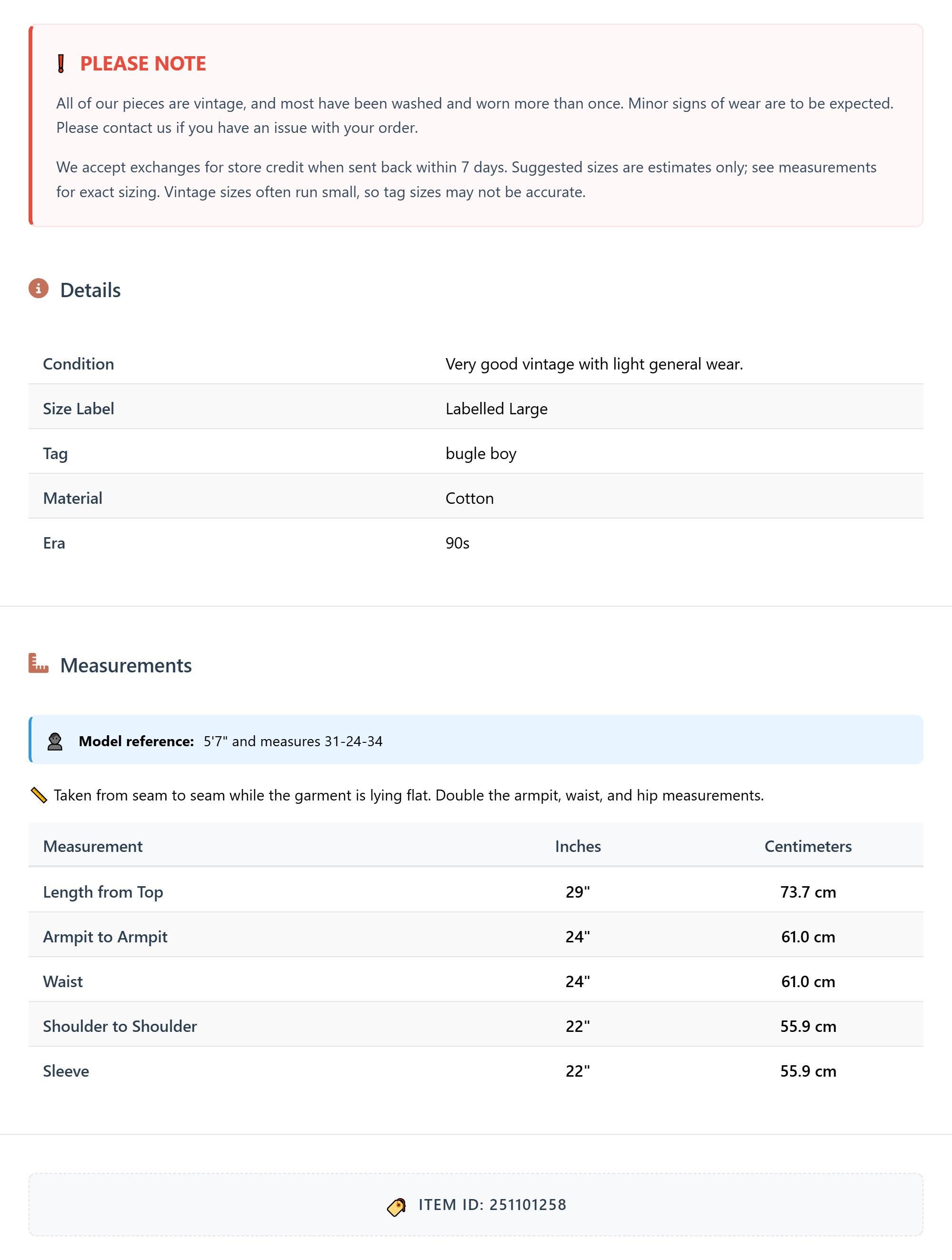 All of our pieces are vintage, and most have been washed and worn more than once. Minor signs of wear are to be expected. Please contact us if you have an issue with your order. We accept exchanges for store credit when sent back within 7 days.