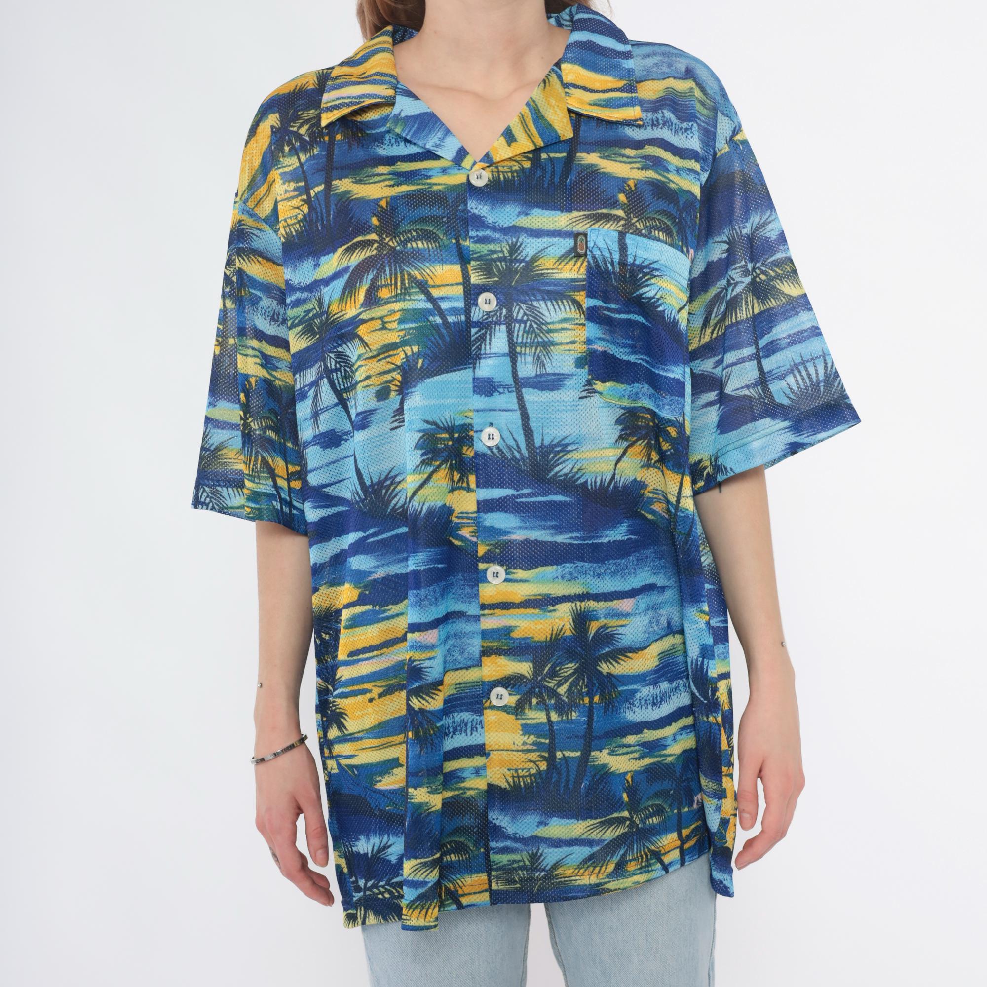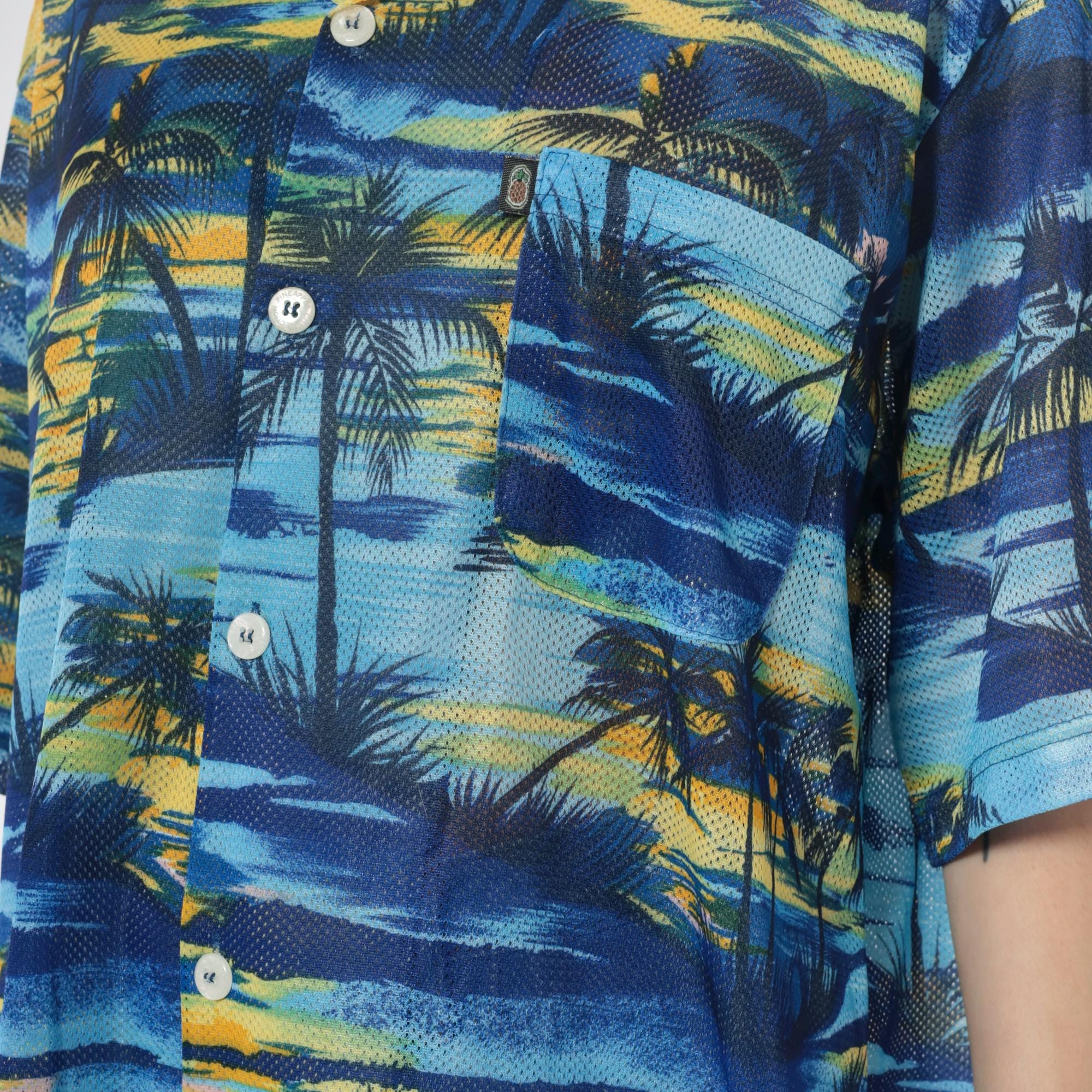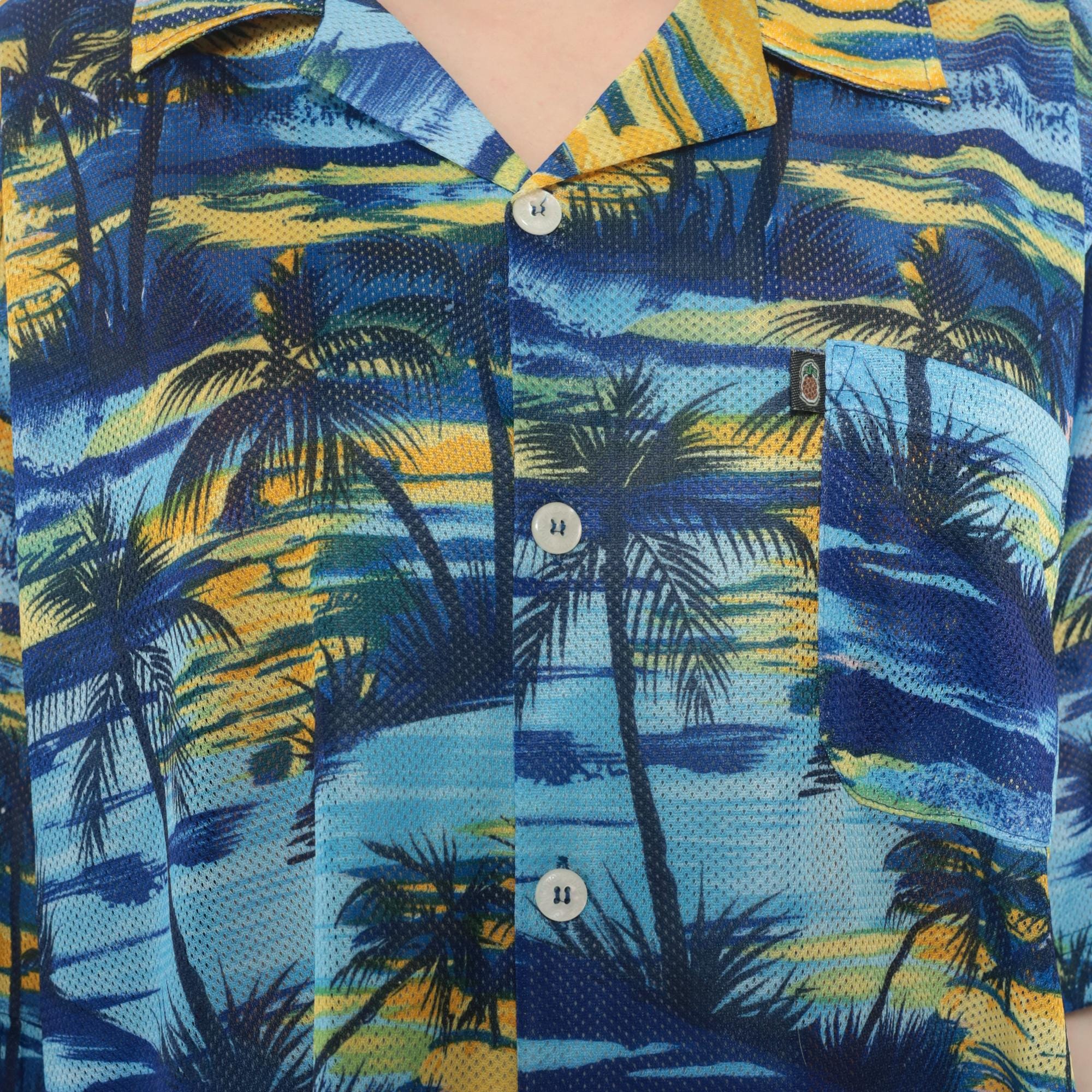 Y2K blue and yellow tropical print shirt from pineapple connection with palm tree silhouettes across the fabric. Hawaiian style with camp collar, button front closure, chest pocket with brand logo tab.