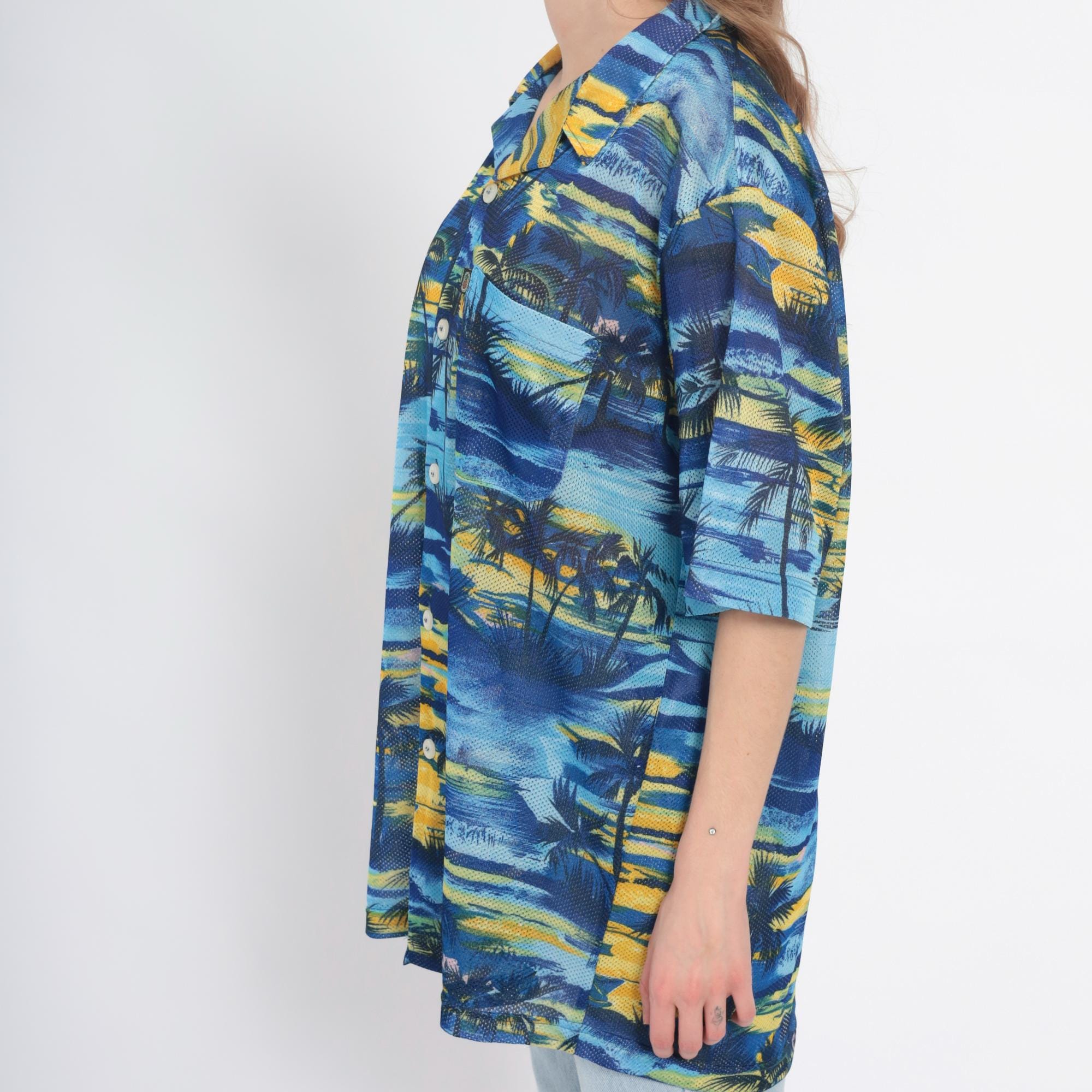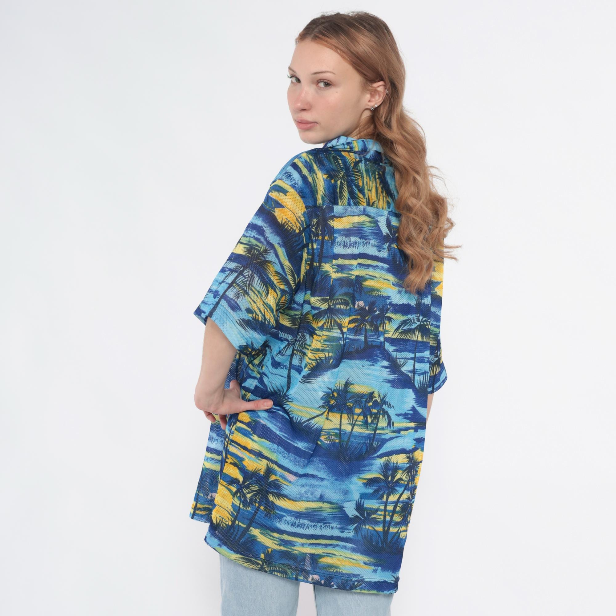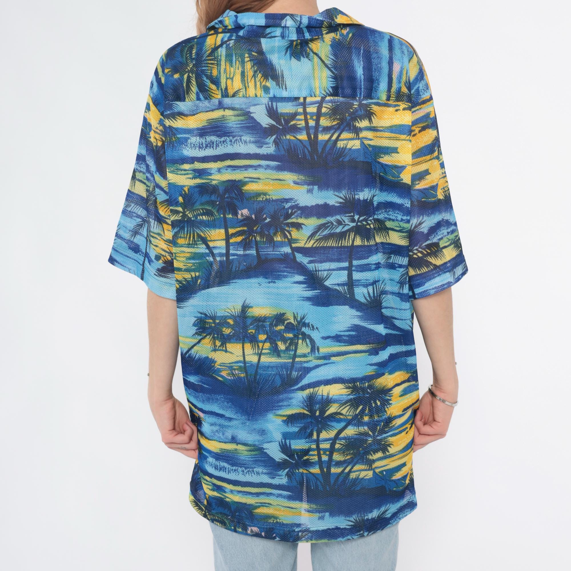 Y2K blue and yellow tropical print shirt from pineapple connection with palm tree silhouettes across the fabric. Hawaiian style with camp collar, button front closure, chest pocket with brand logo tab.