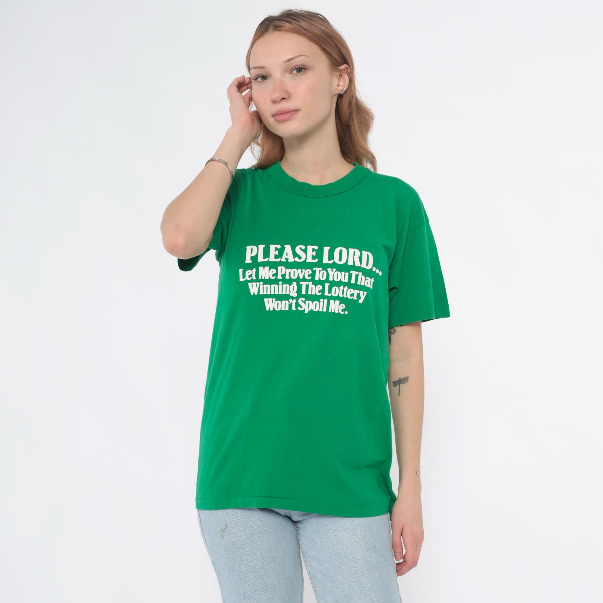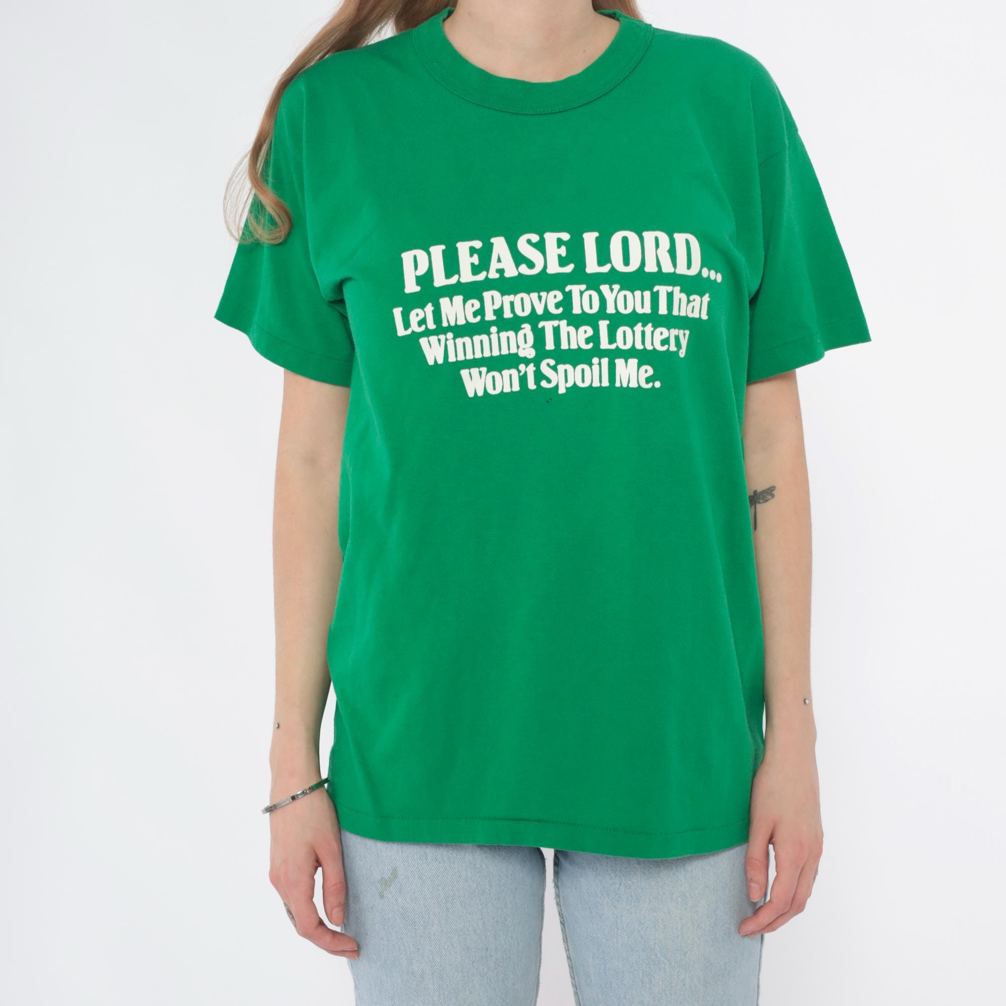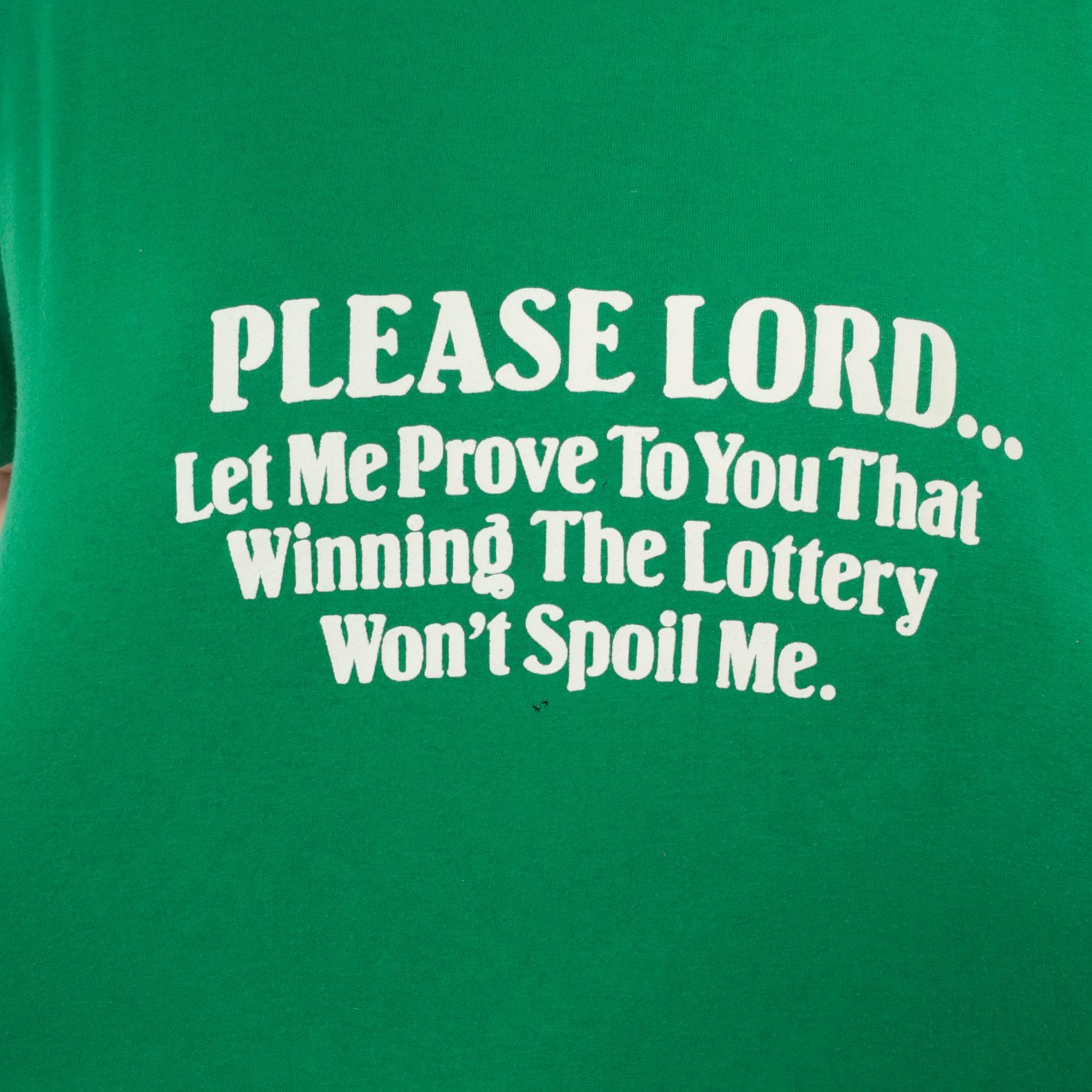 80s kelly green graphic tee with white printed text reading "PLEASE LORD... Let Me Prove To You That Winning The Lottery Won't Spoil Me." Crew neckline, short sleeves with standard ribbed trim.