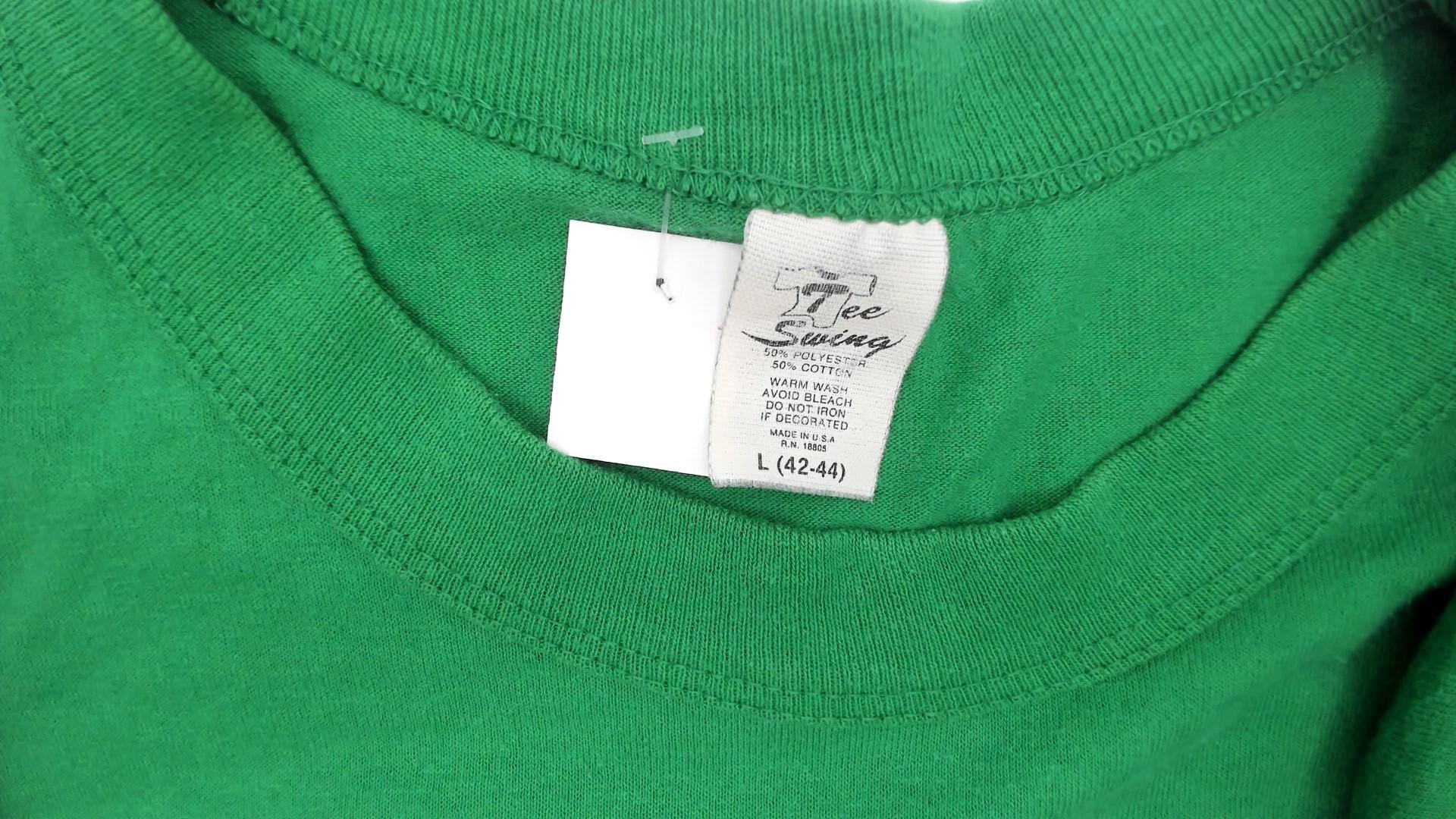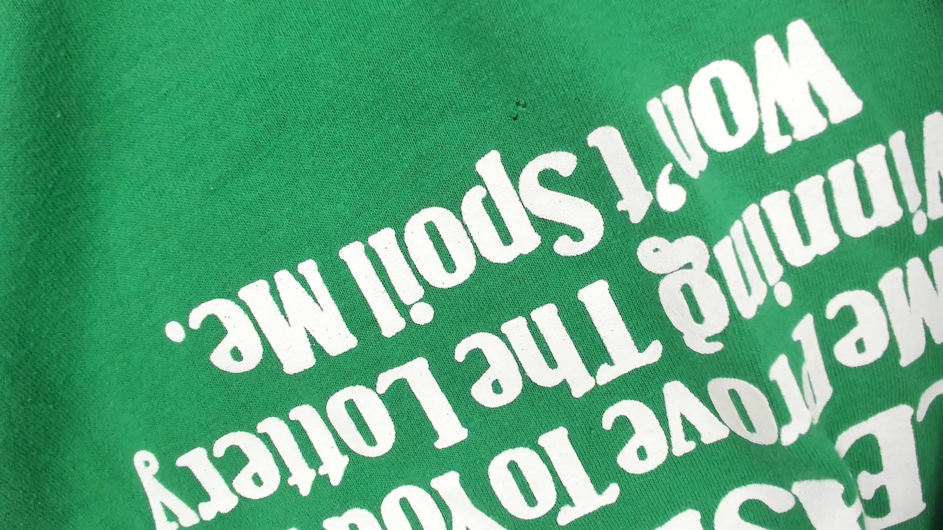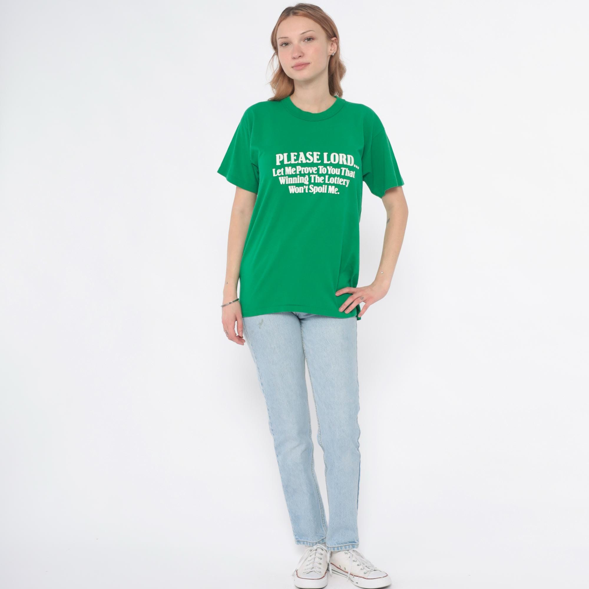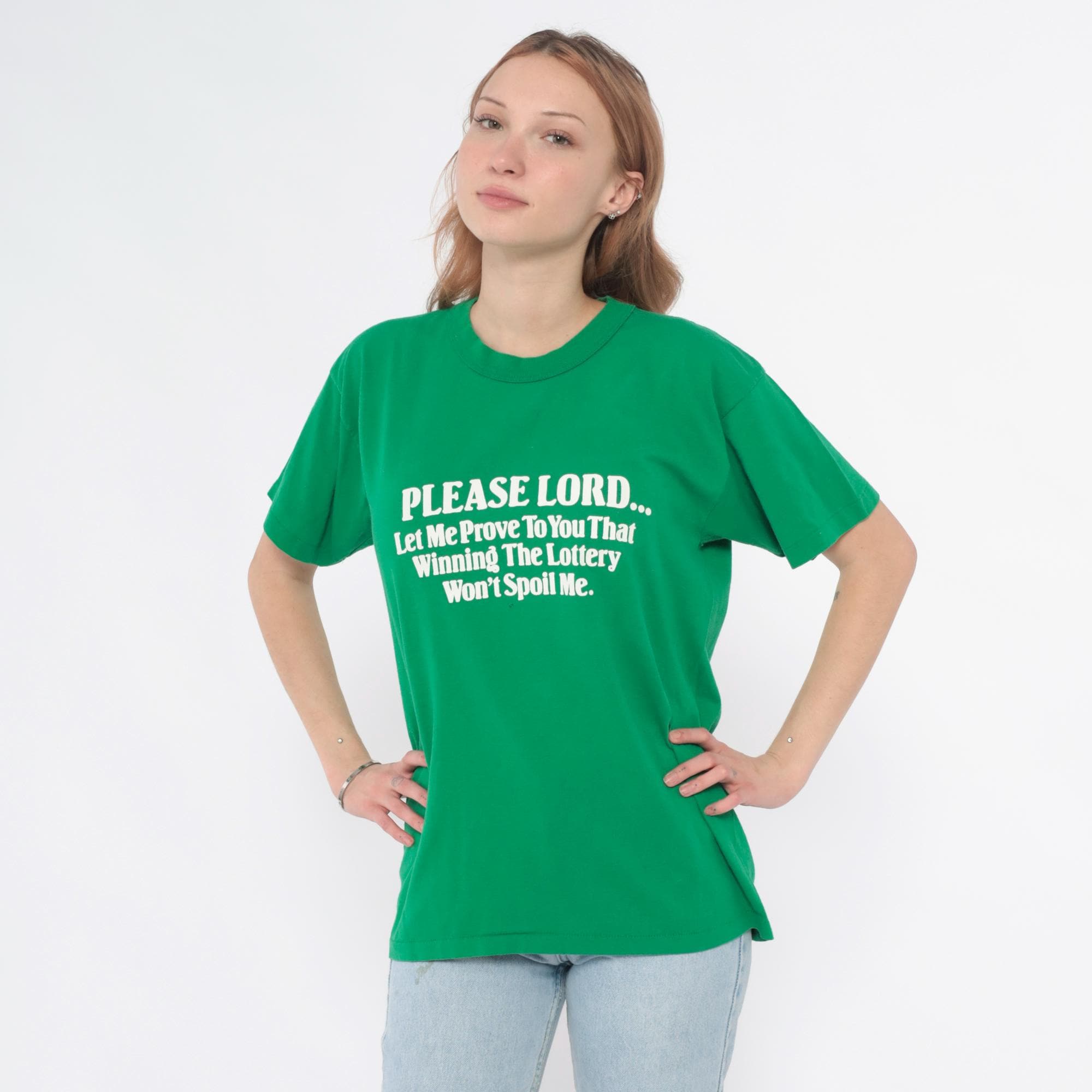 80s kelly green graphic tee with white printed text reading "PLEASE LORD... Let Me Prove To You That Winning The Lottery Won't Spoil Me." Crew neckline, short sleeves with standard ribbed trim.