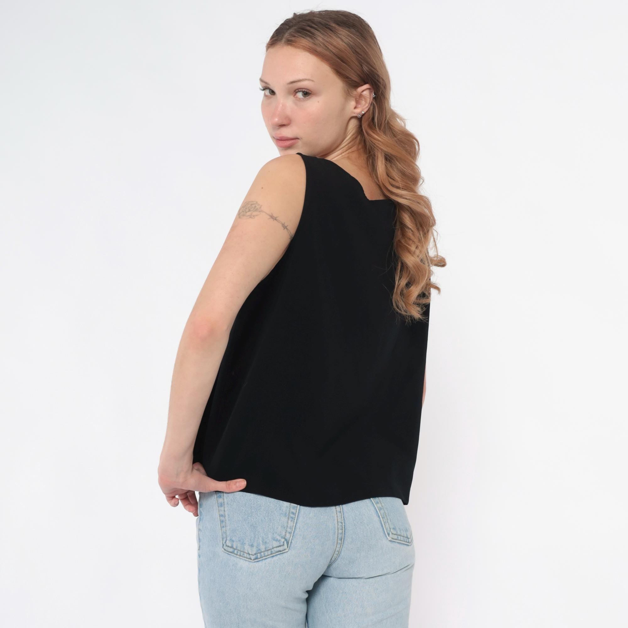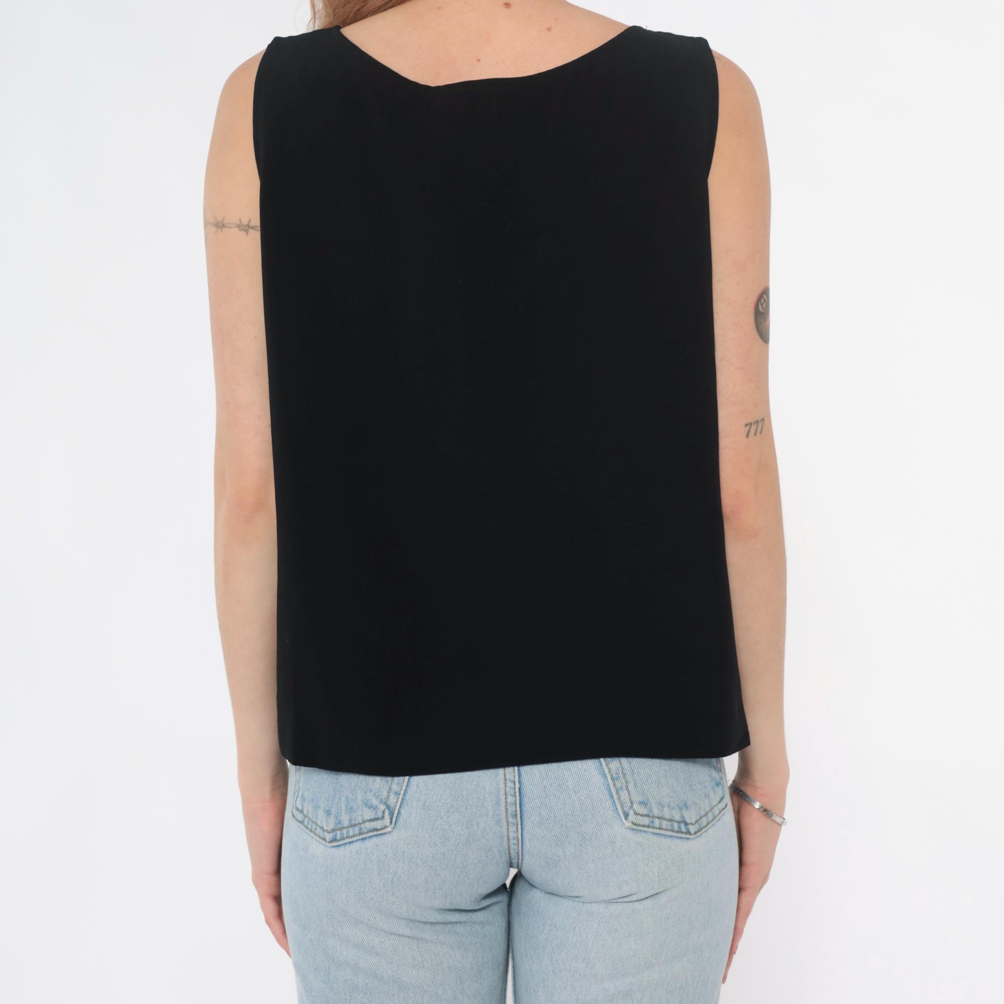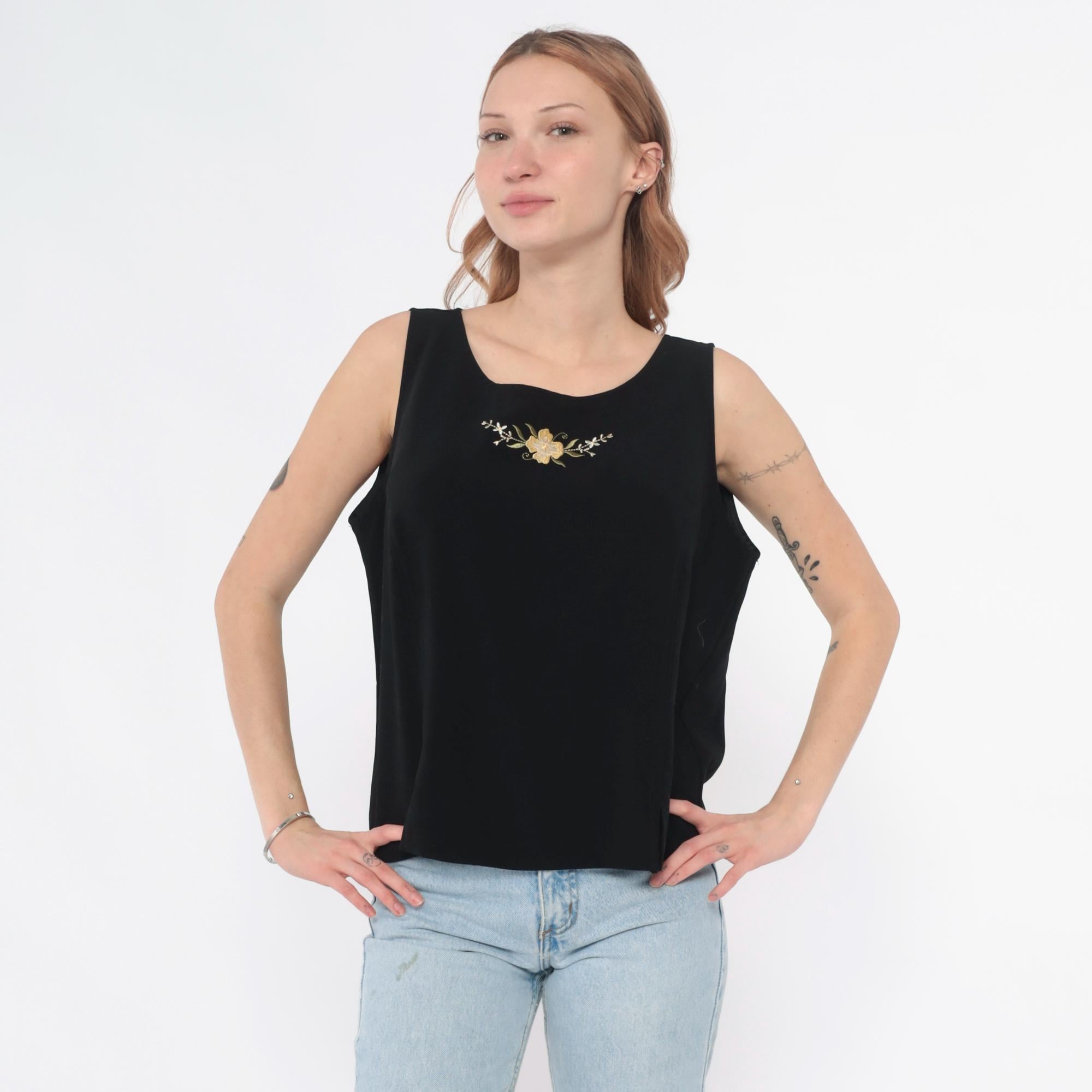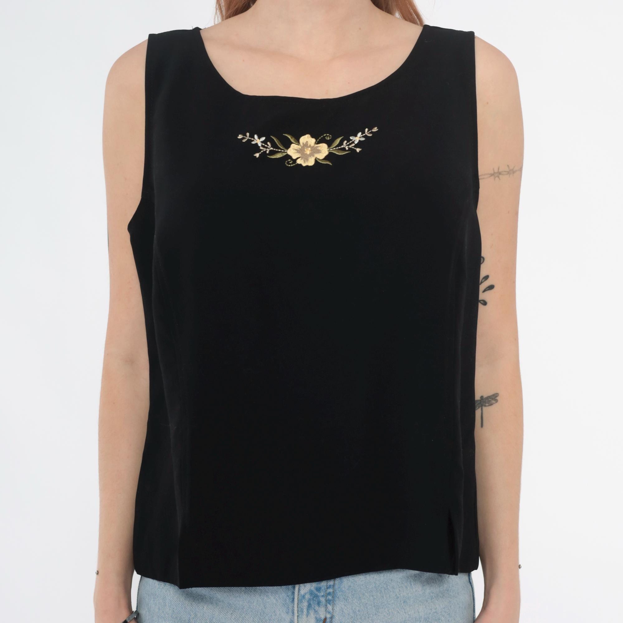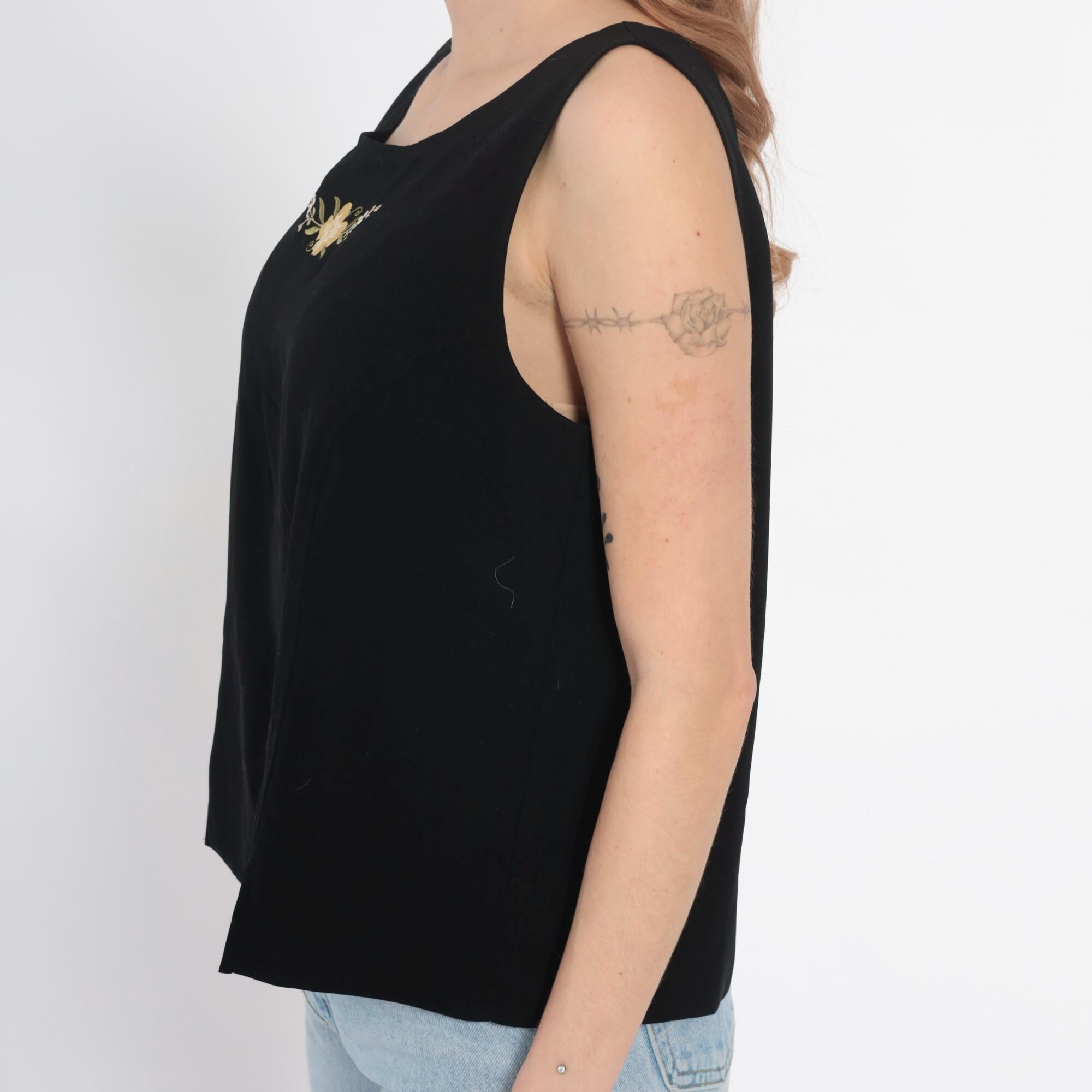 90s black sleeveless tank top from peter popovitch with gold floral embroidery centered on the chest. Central flower with vine and leaf details extending outward in metallic gold thread.