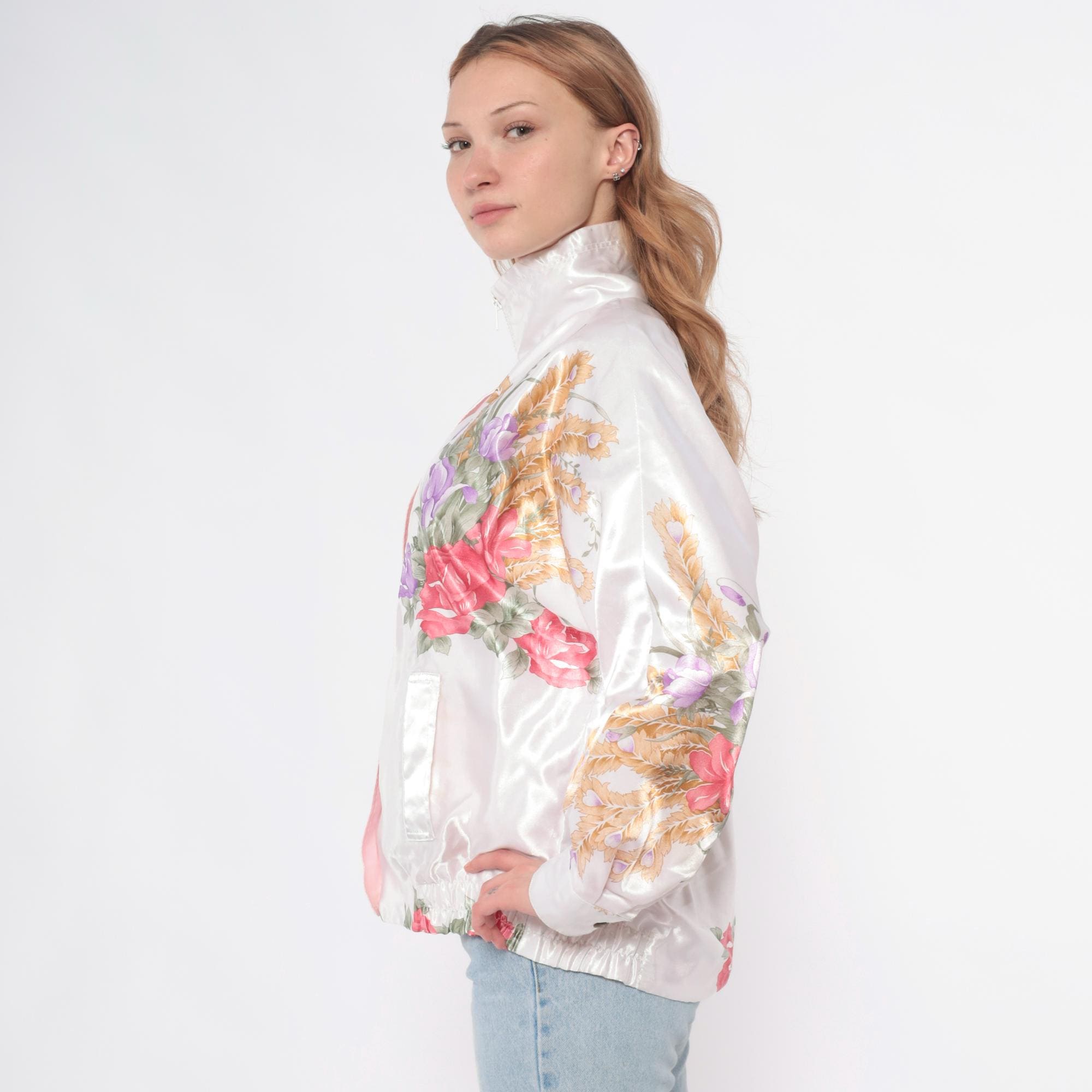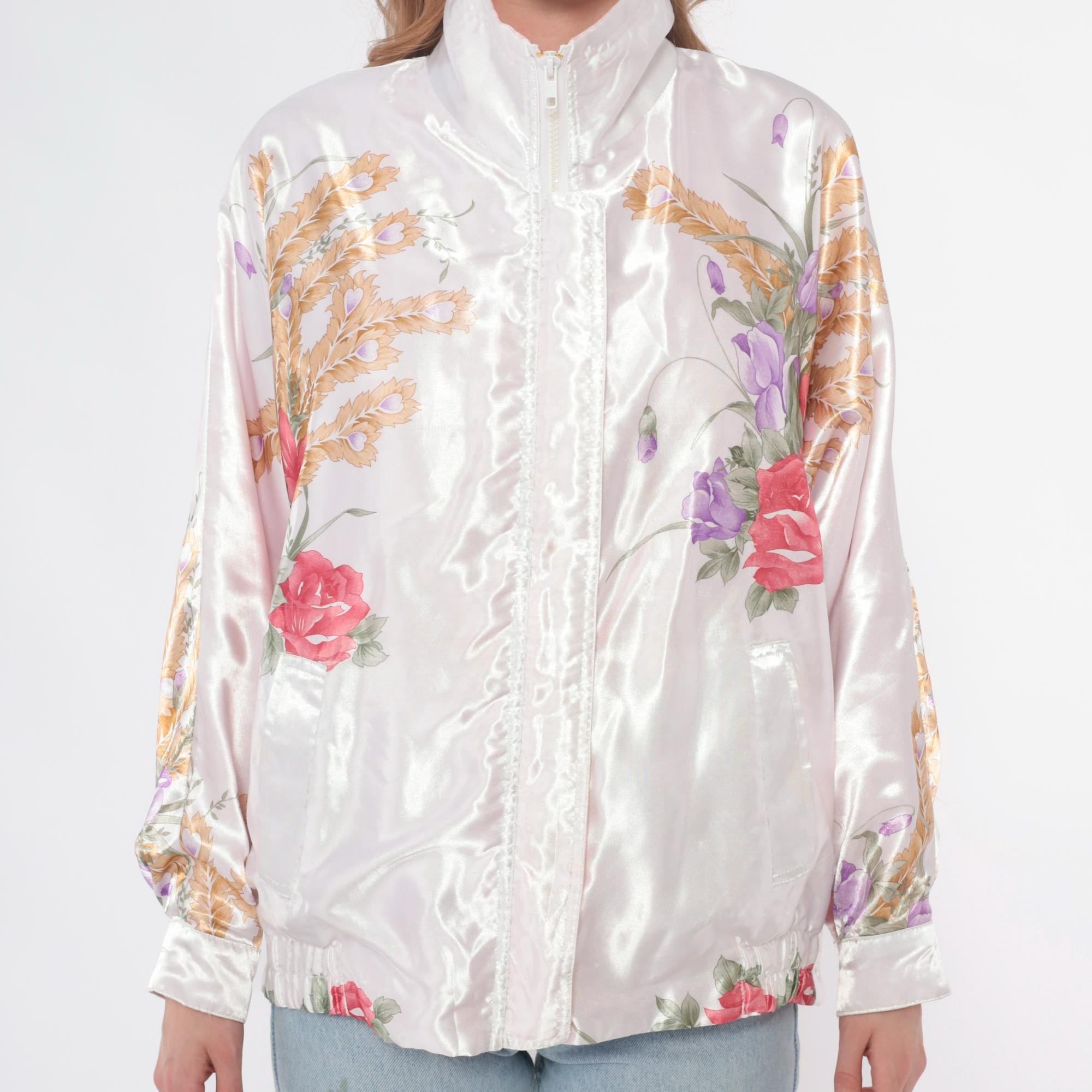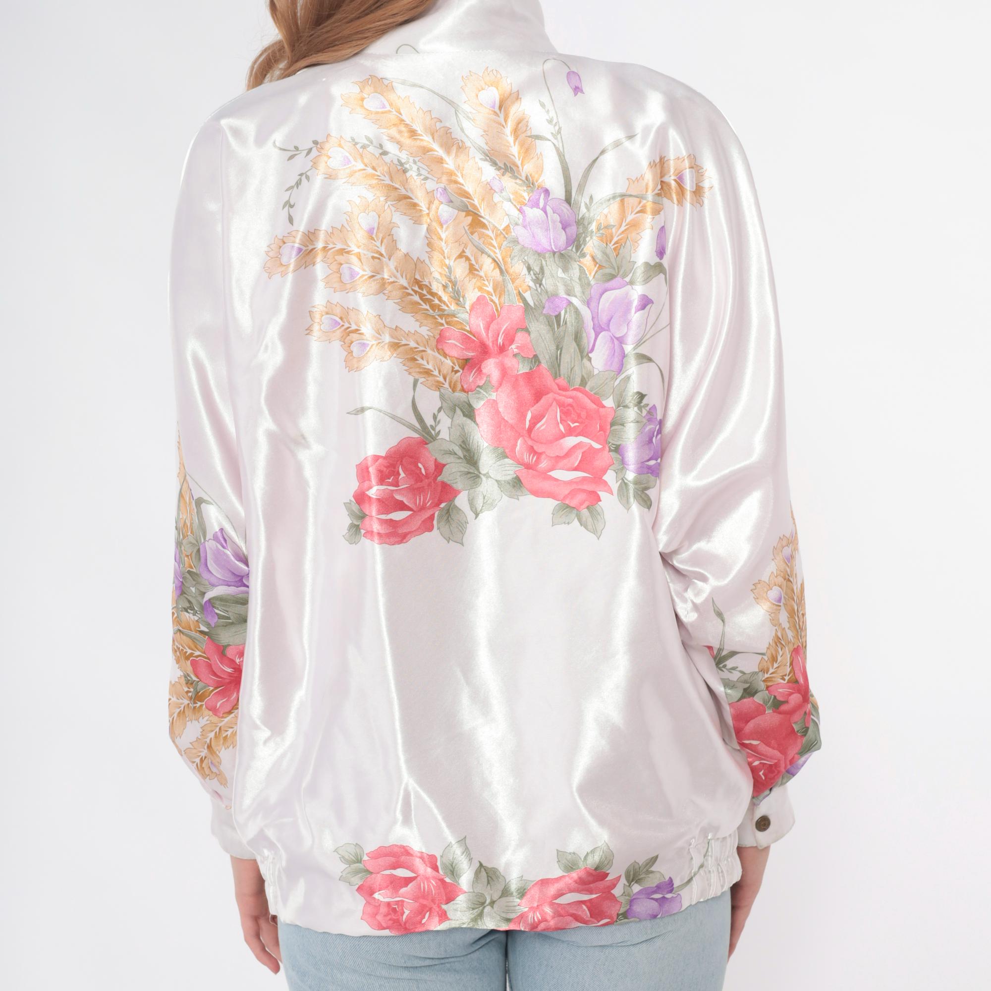 90s white satin bomber jacket with pink roses, purple flowers, and golden wheat print across the fabric. Zip front closure, stand collar, long sleeves with elastic cuffs. Elastic waistband, two front pockets.