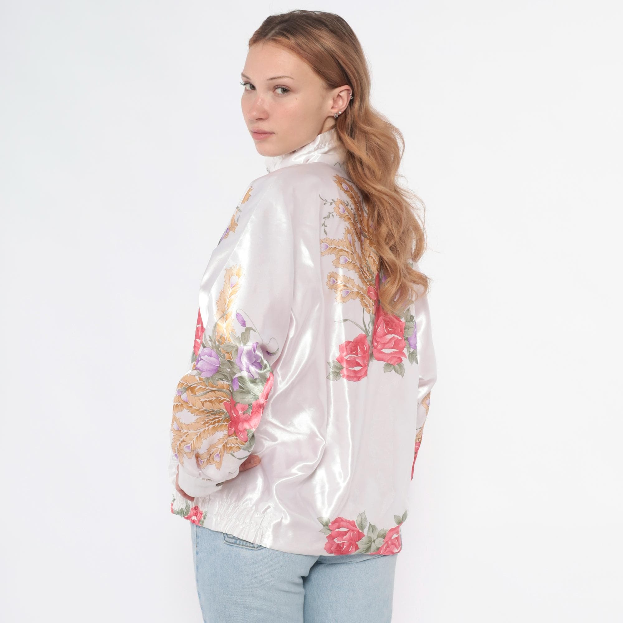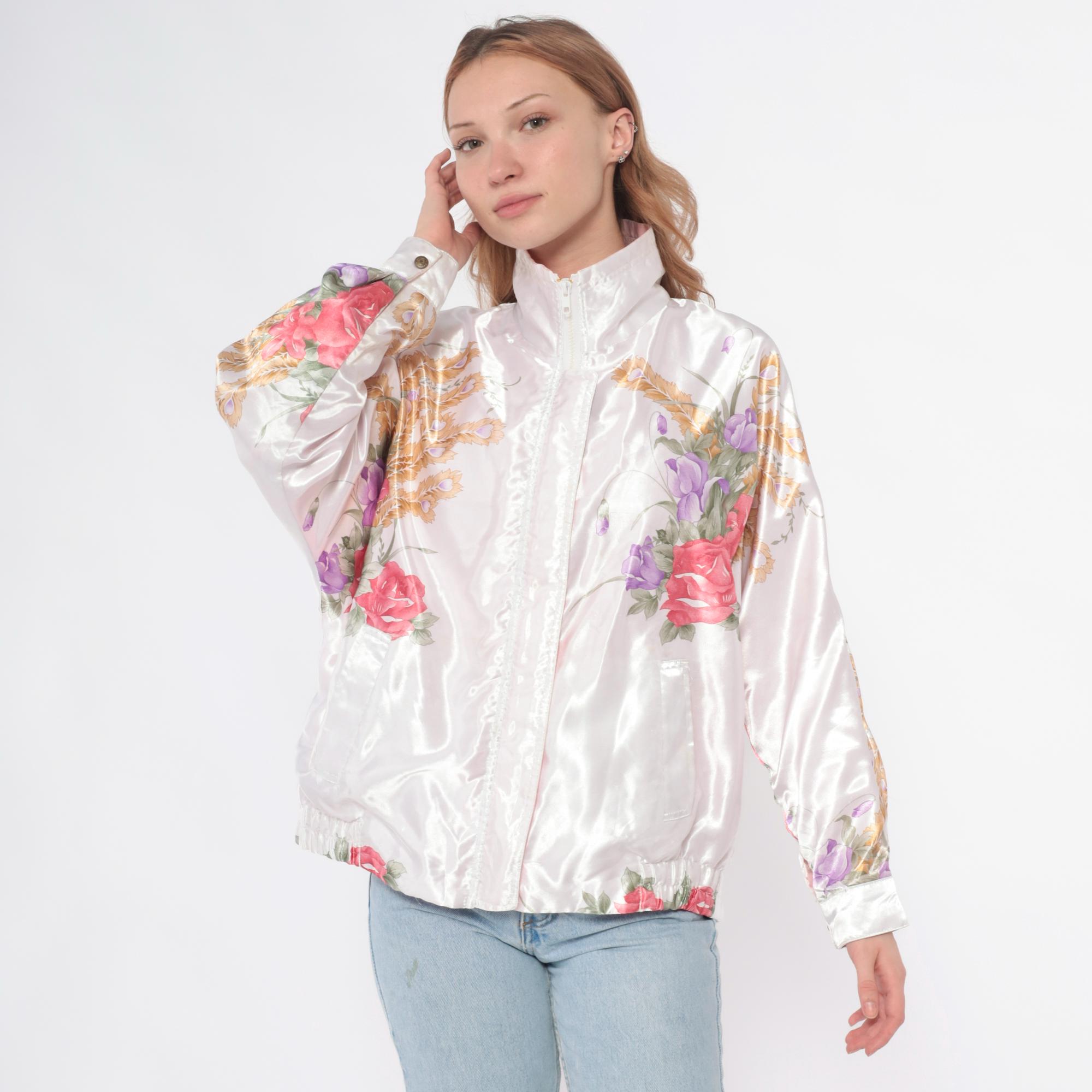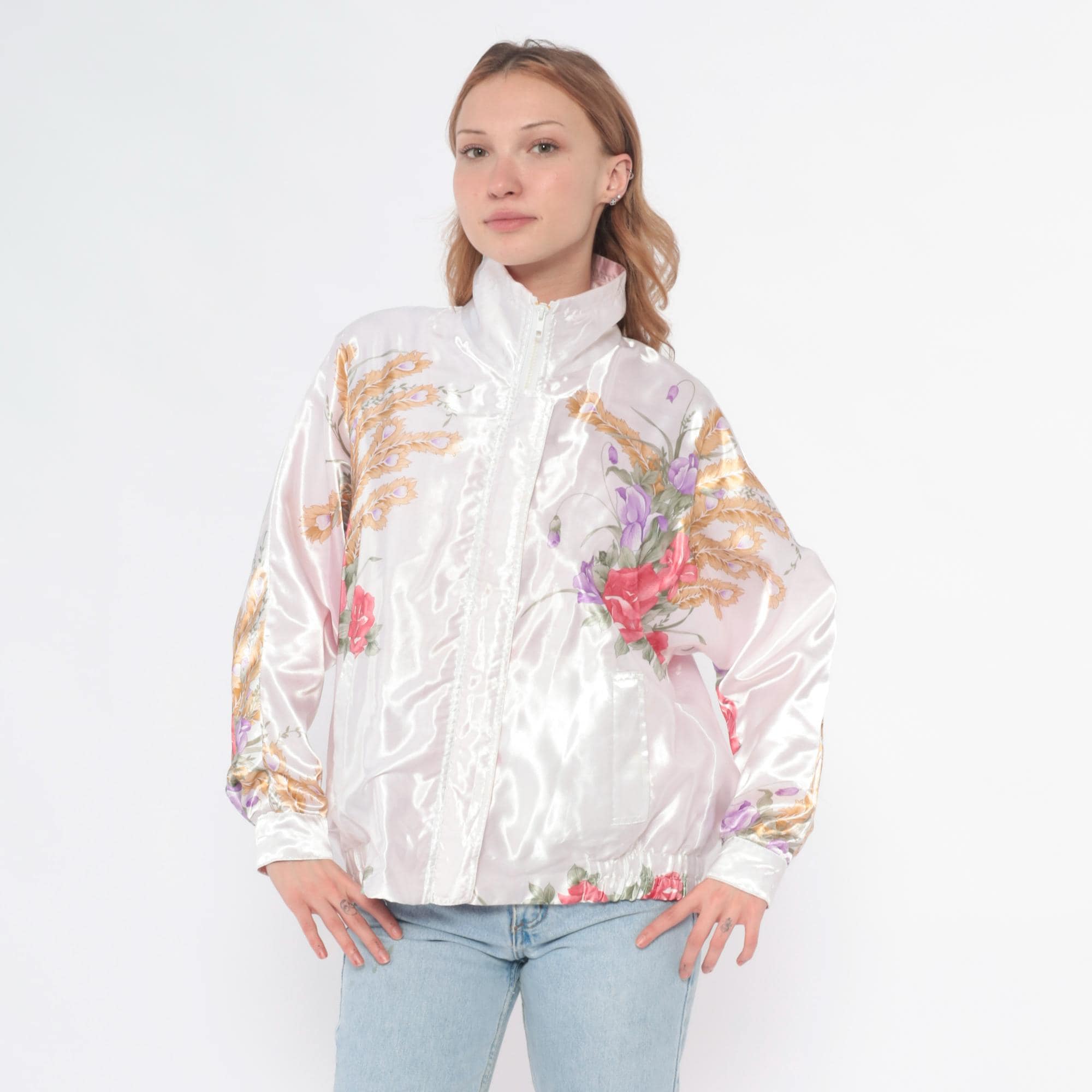 90s white satin bomber jacket with pink roses, purple flowers, and golden wheat print across the fabric. Zip front closure, stand collar, long sleeves with elastic cuffs. Elastic waistband, two front pockets.