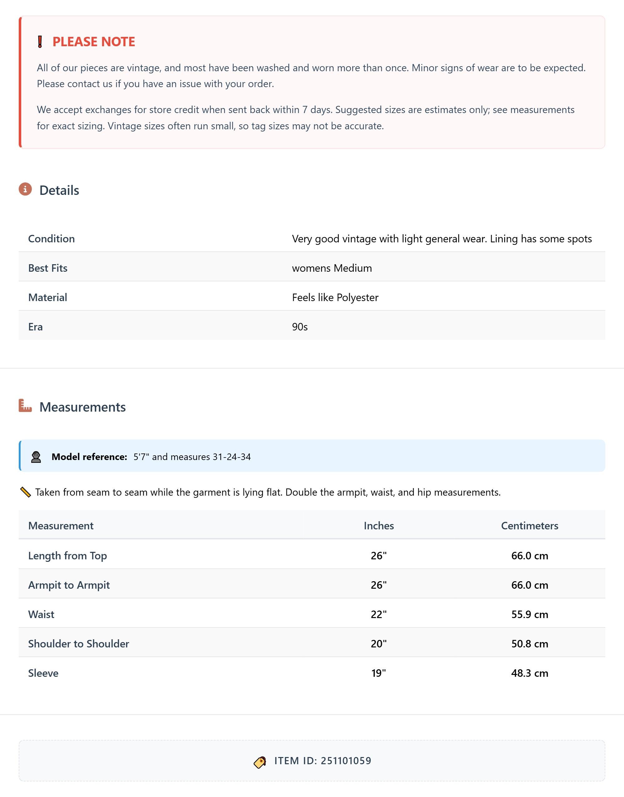 All of our pieces are vintage, and most have been washed and worn more than once. Minor signs of wear are to be expected. Please contact us if you have an issue with your order. We accept exchanges for store credit when sent back within 7 days.