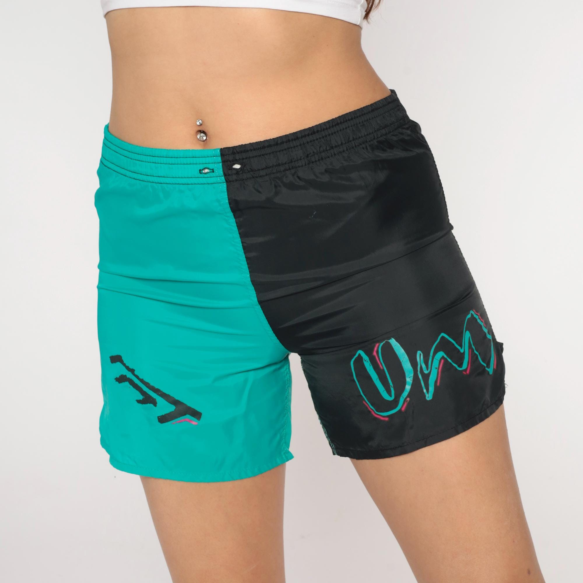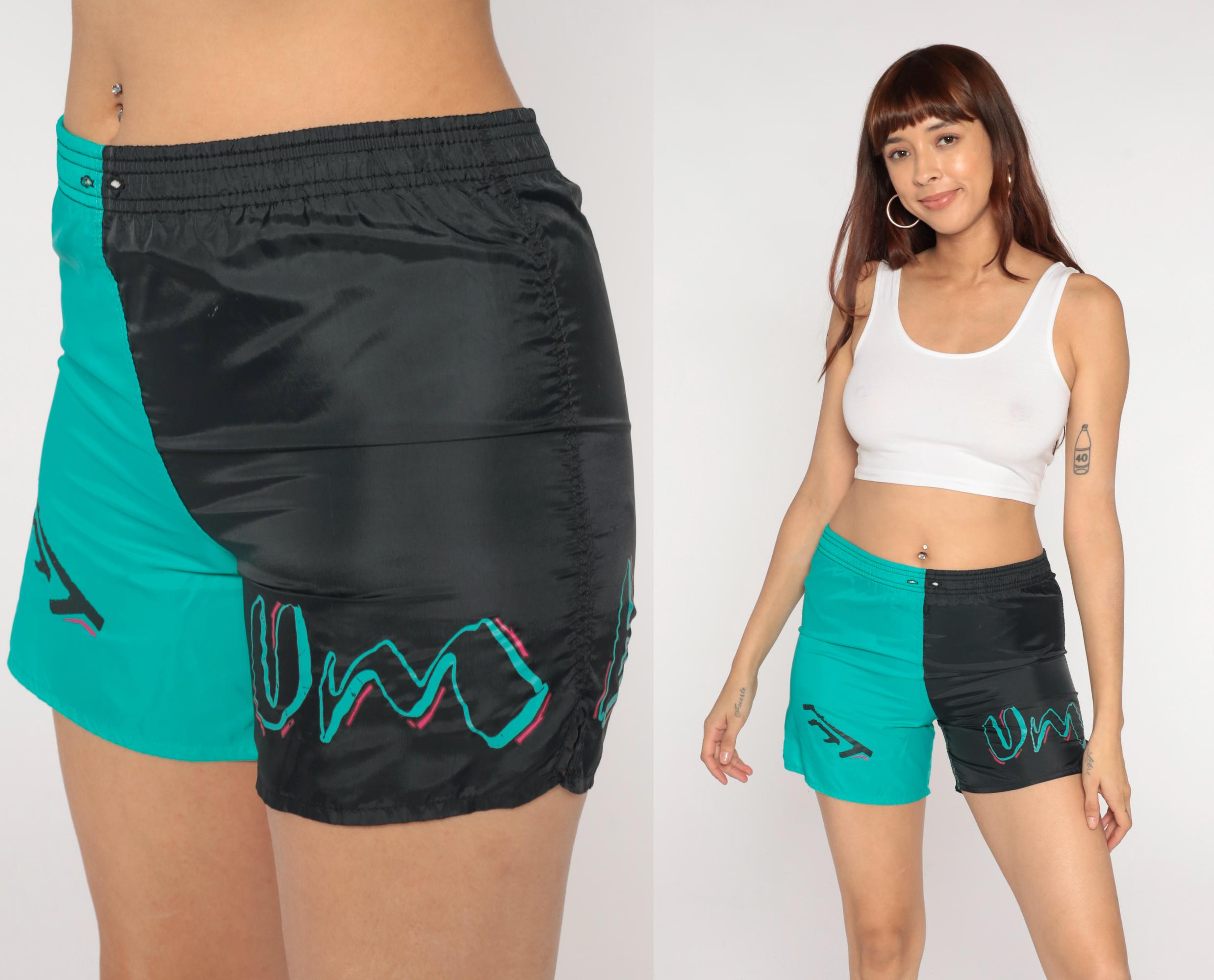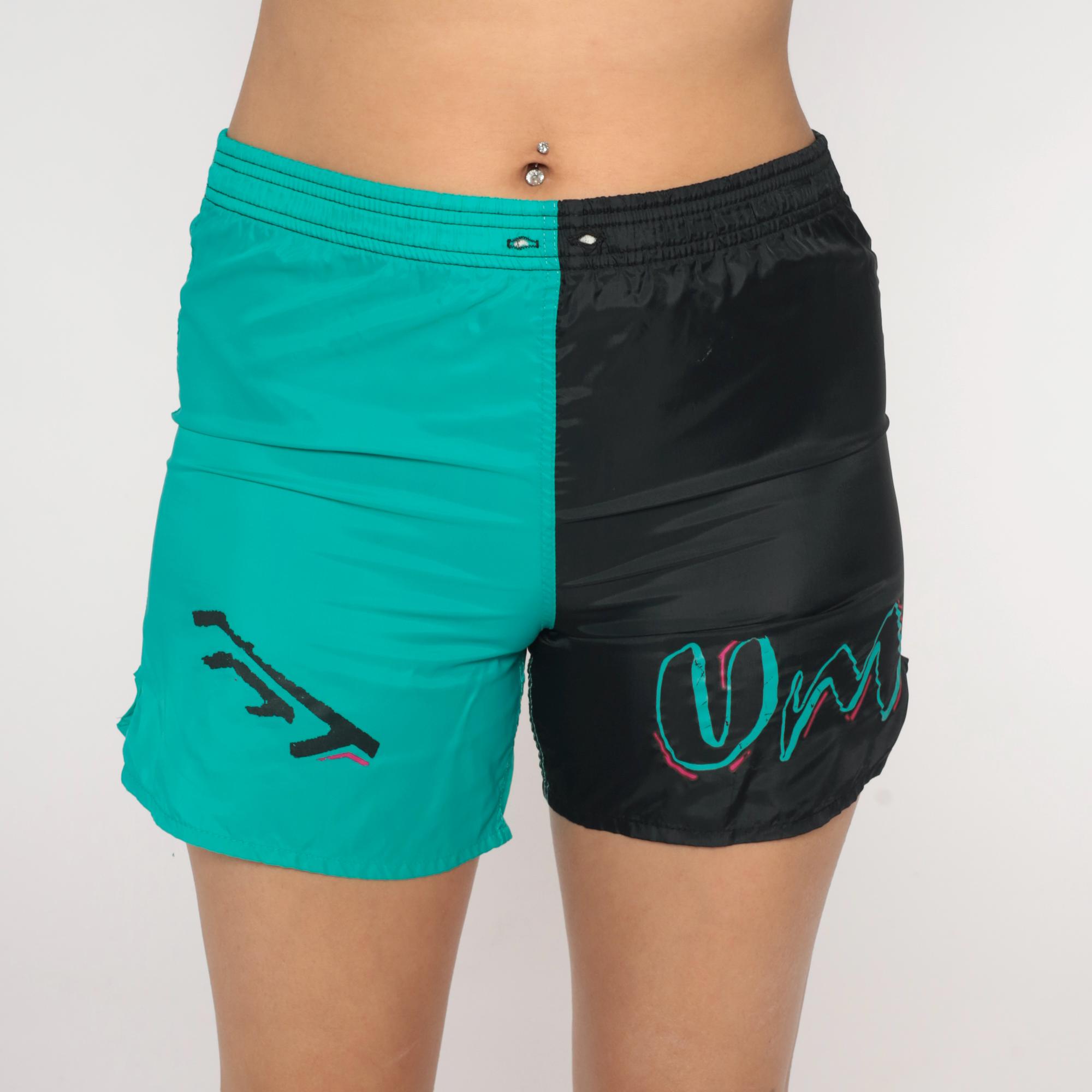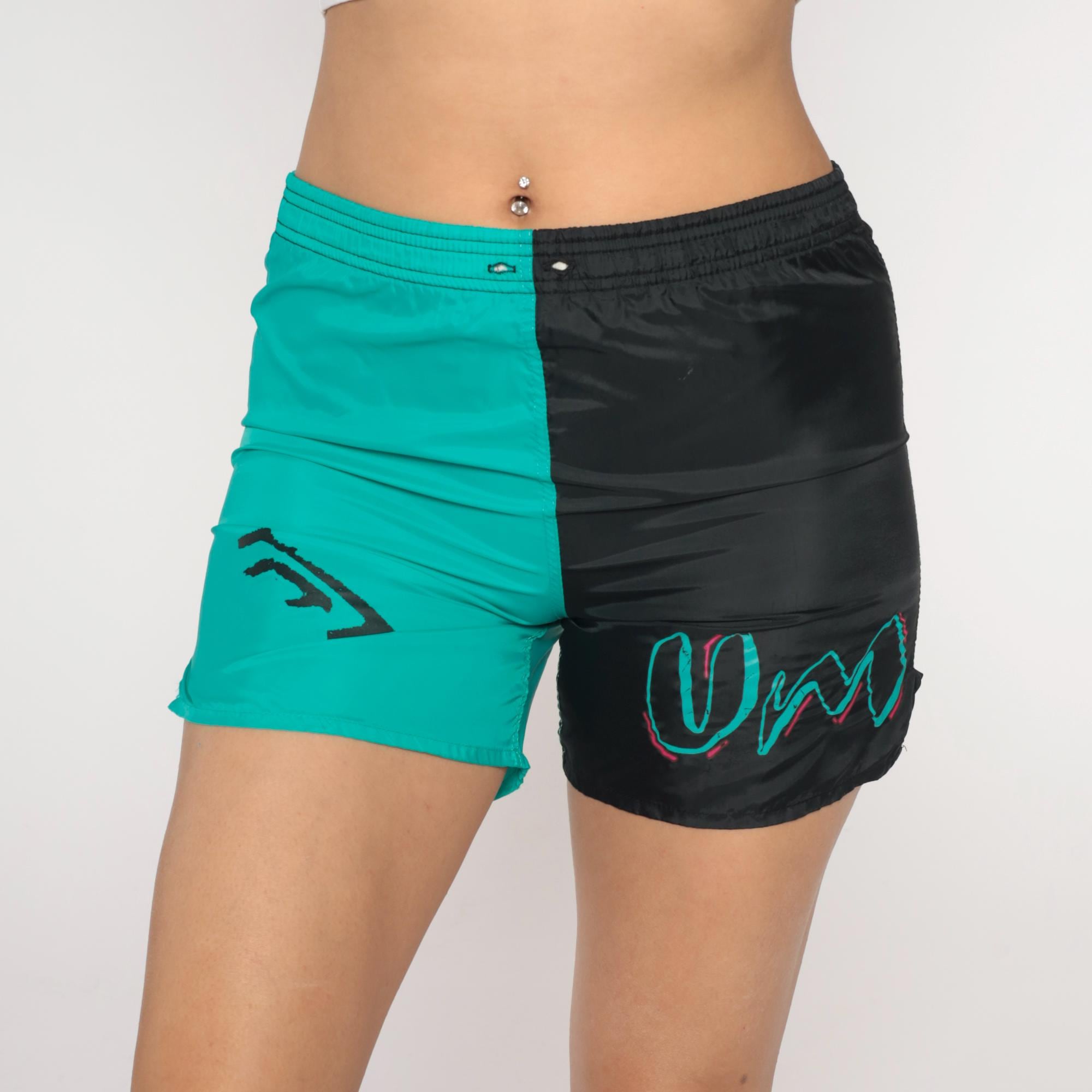 90s split-color athletic shorts from Umbro with teal and black halves. Elastic waistband with drawstring closure, Umbro logo graphic on teal leg and script text on black leg.