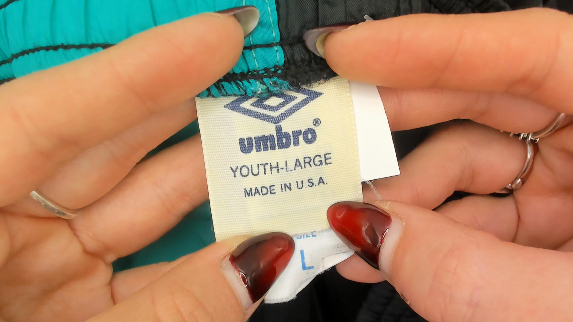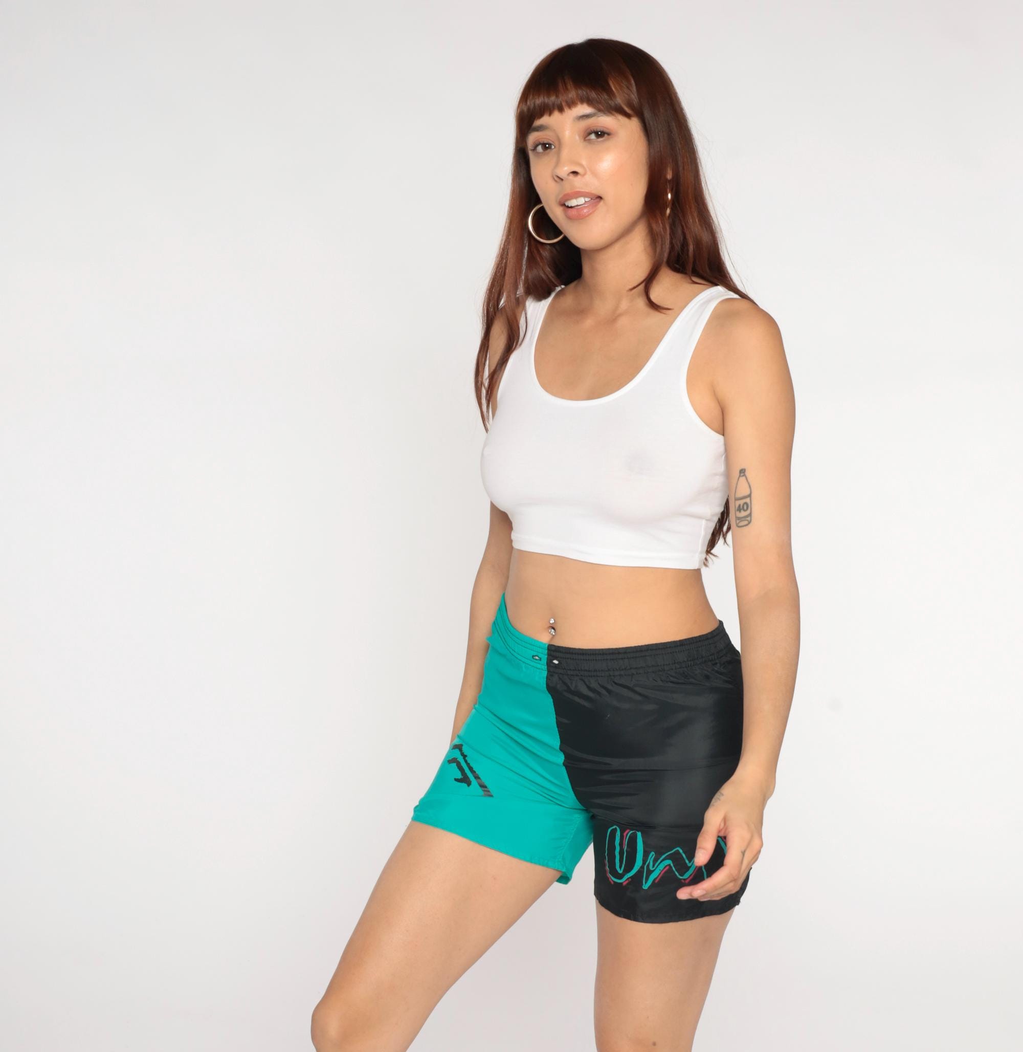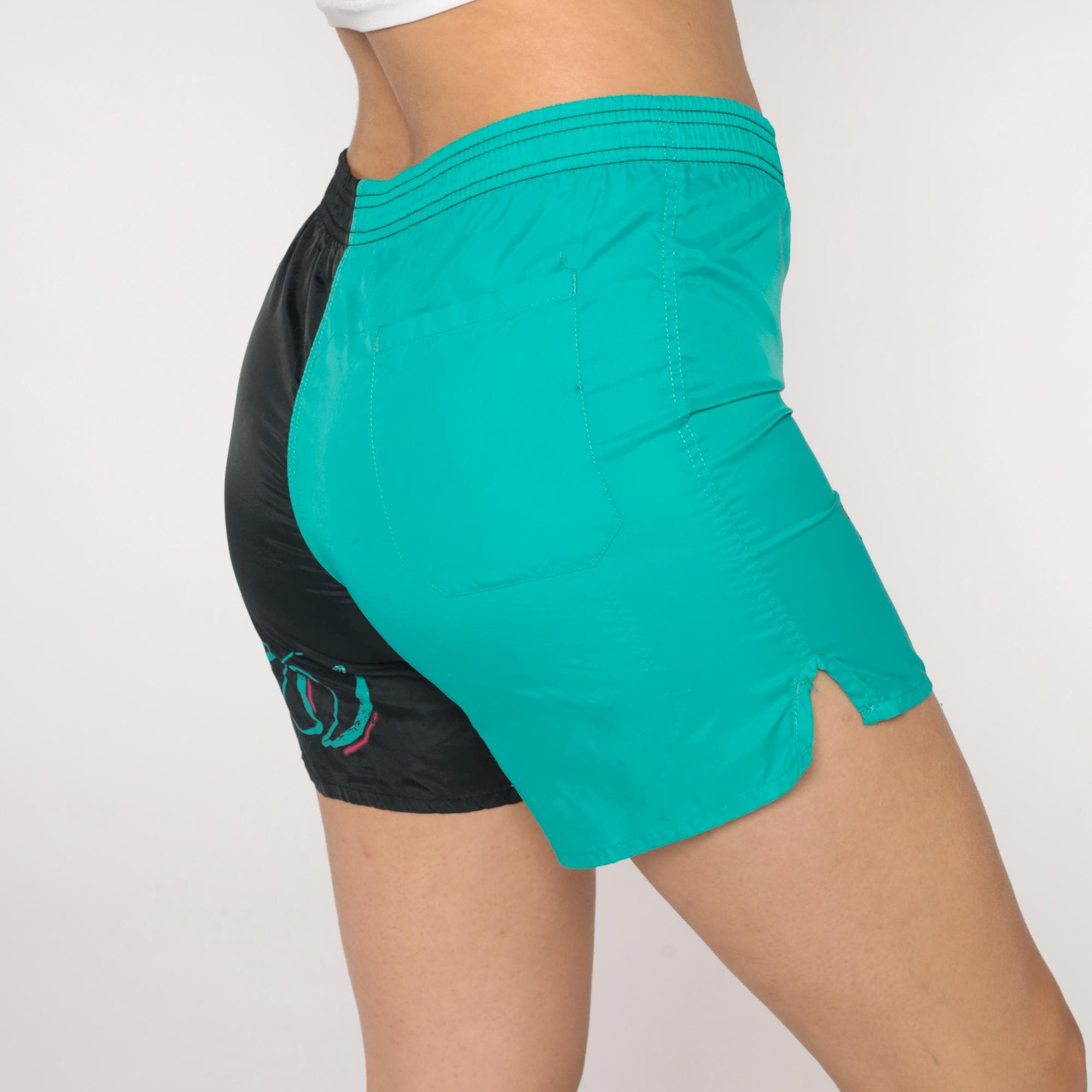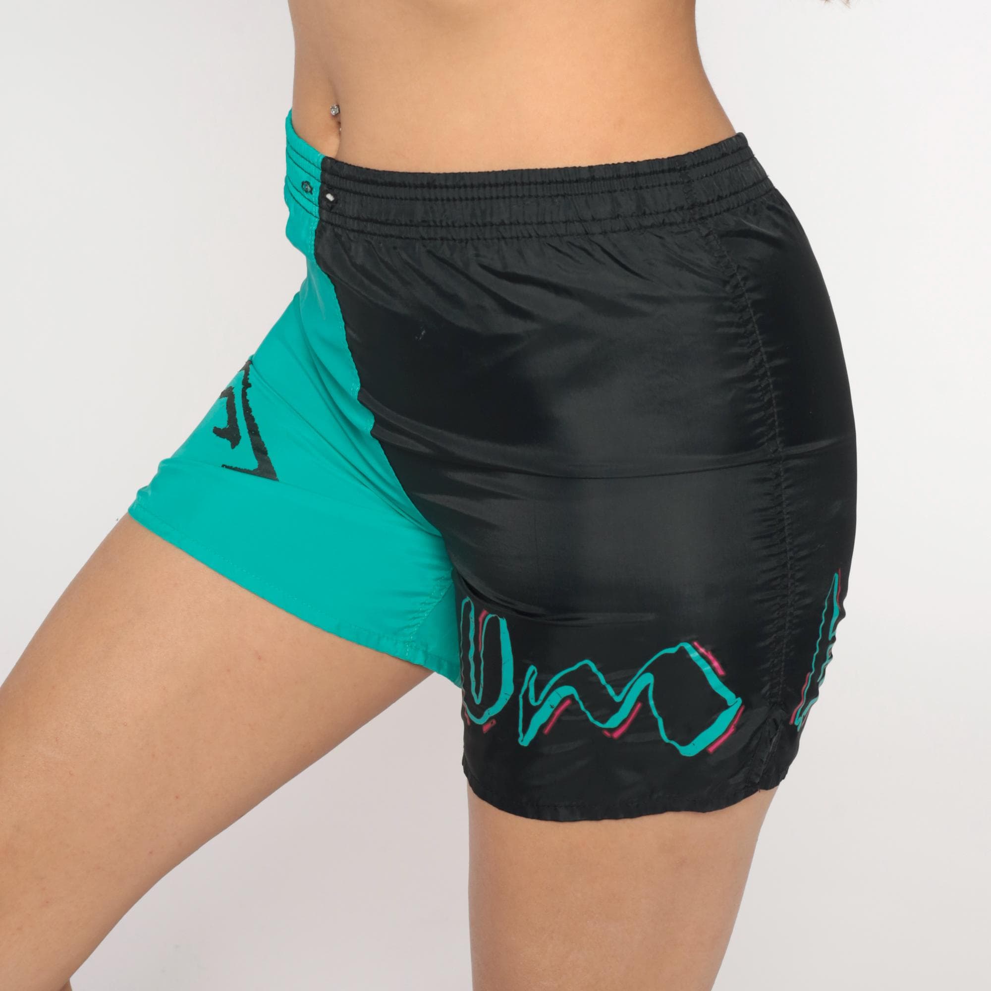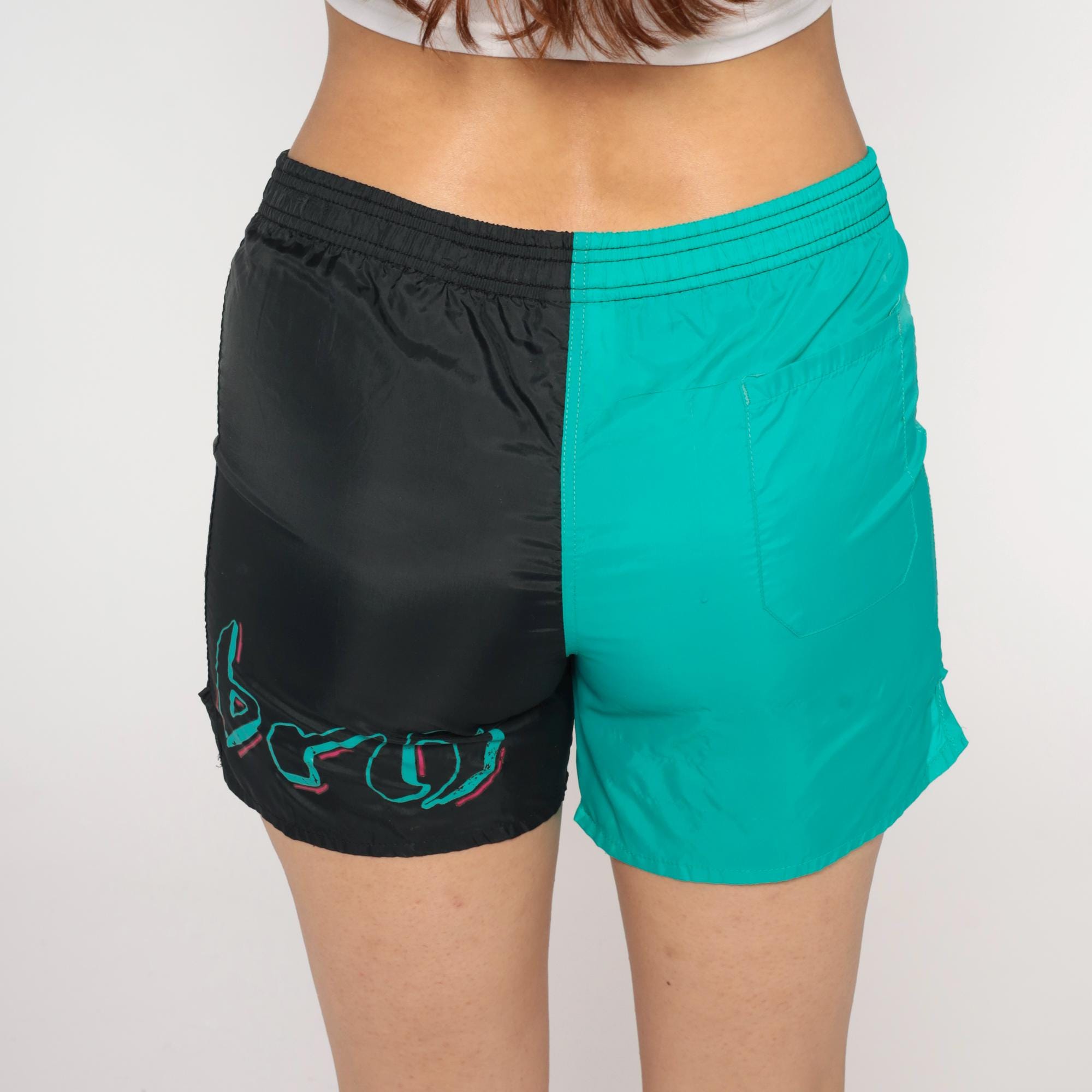 90s split-color athletic shorts from Umbro with teal and black halves. Elastic waistband with drawstring closure, Umbro logo graphic on teal leg and script text on black leg.