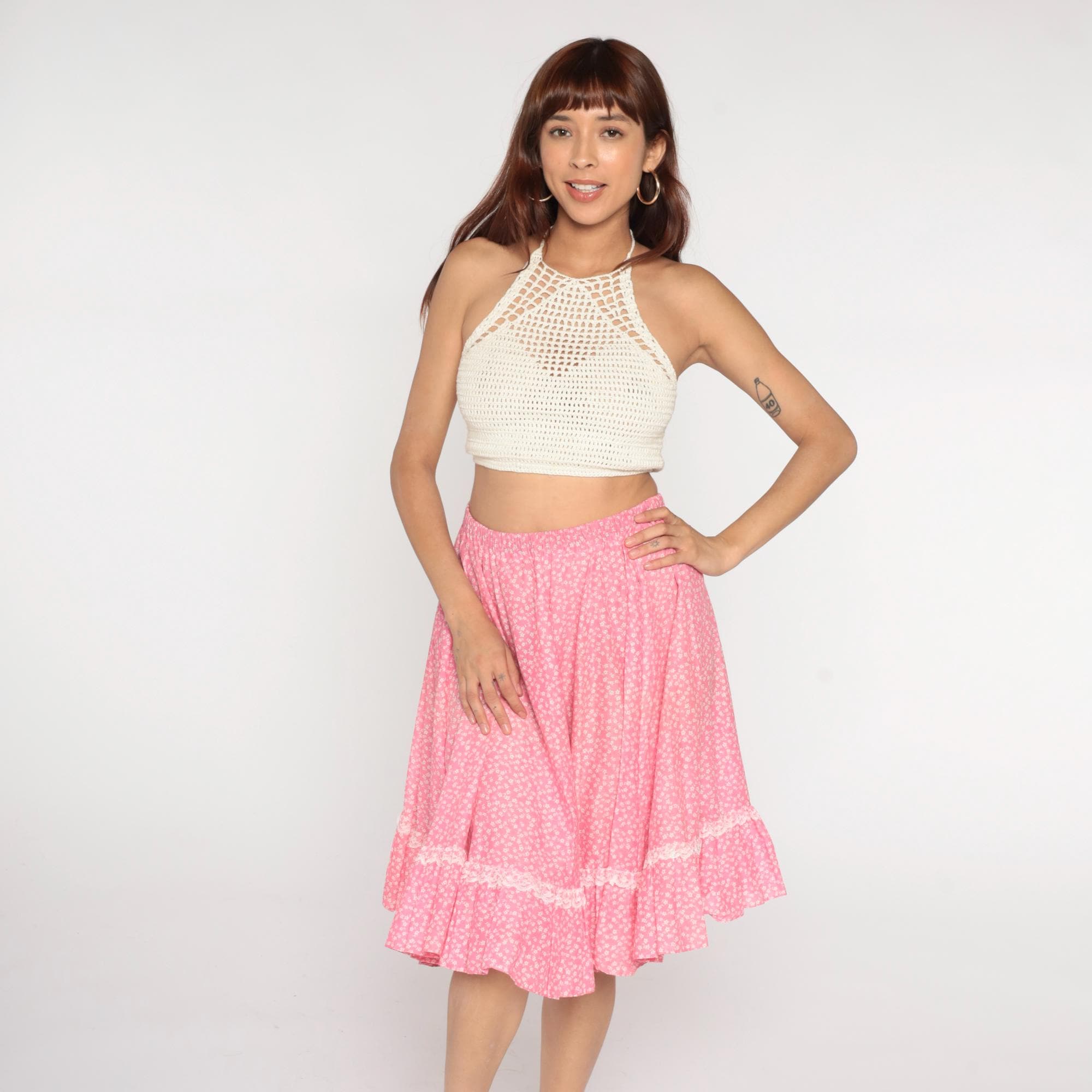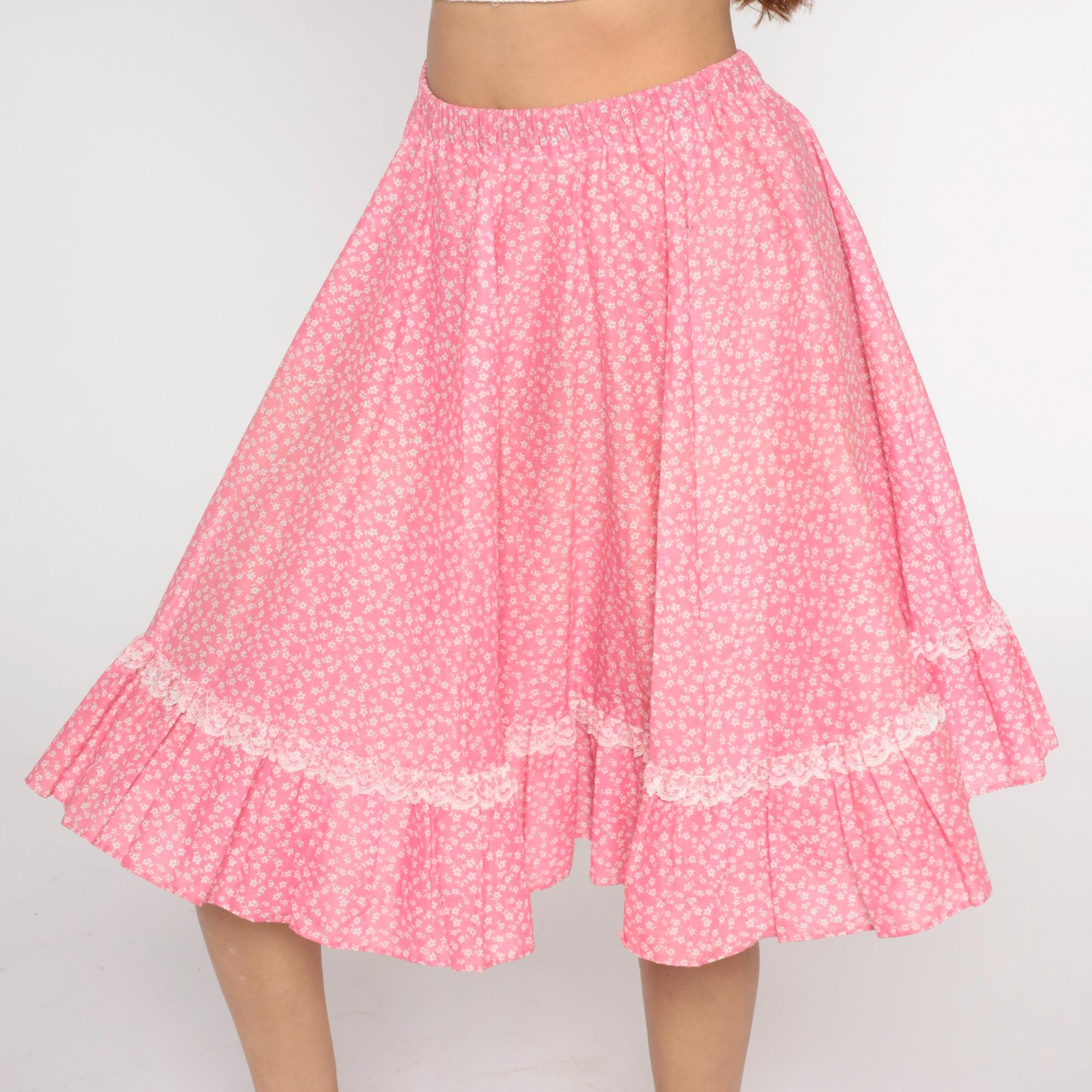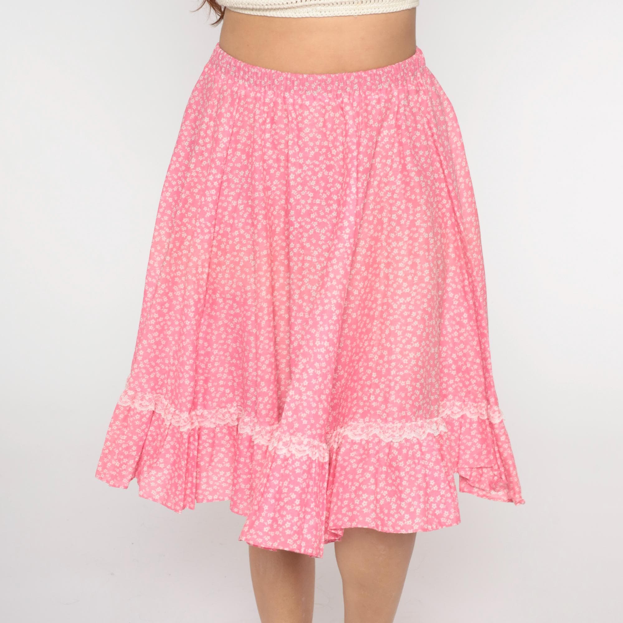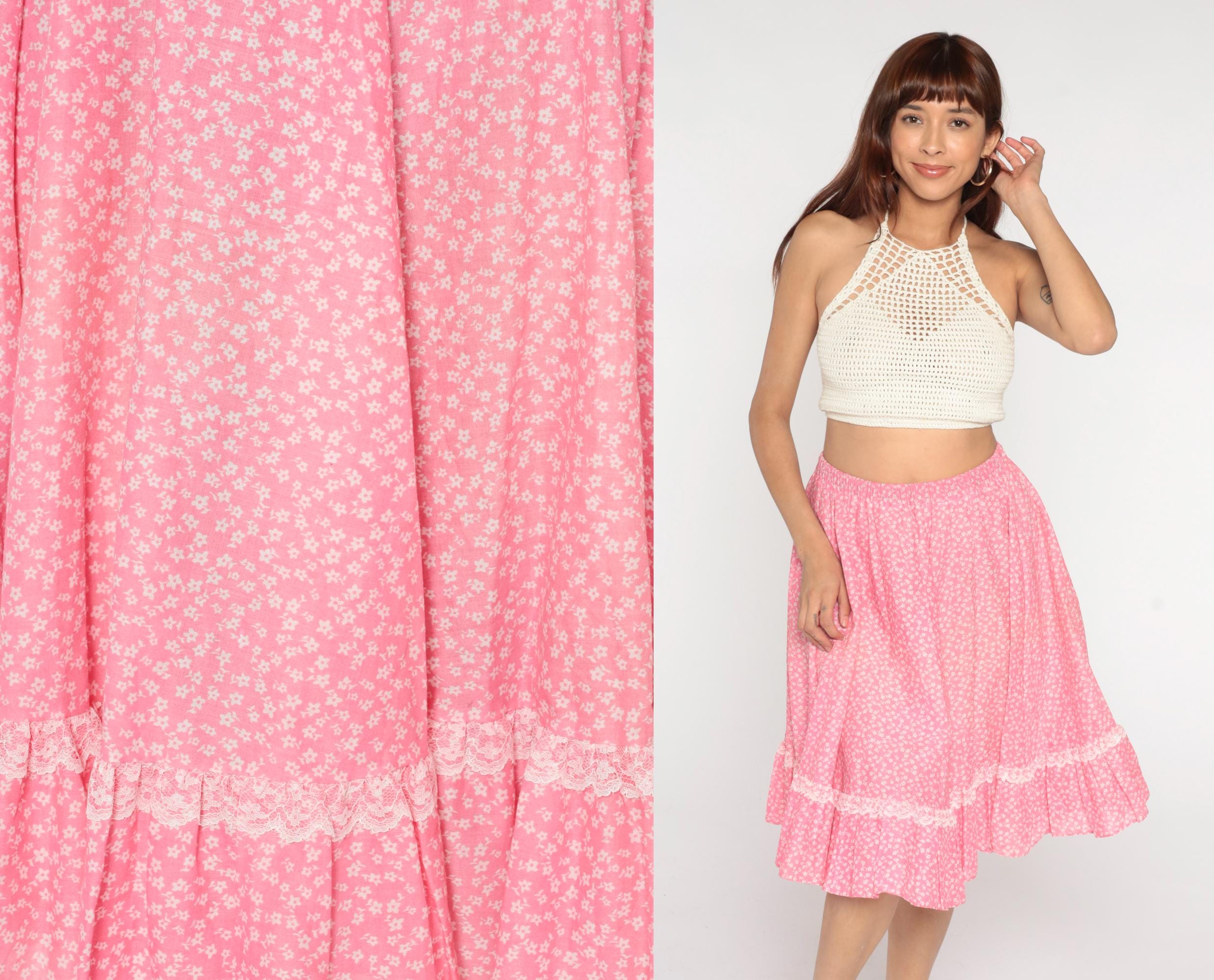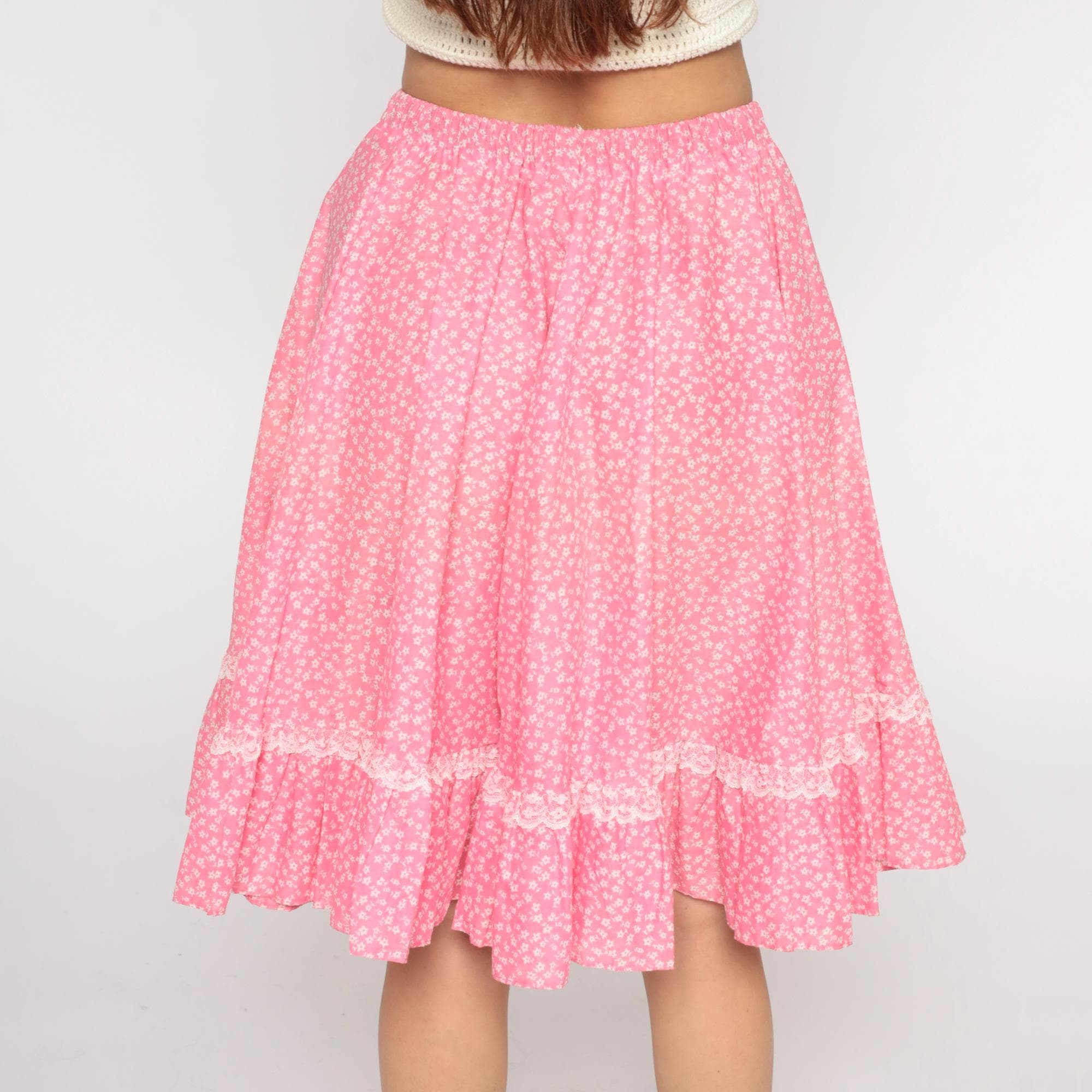80s pink skirt with white floral print and tiered construction. Elastic waistband, white lace trim between each tier, gathered fullness throughout.